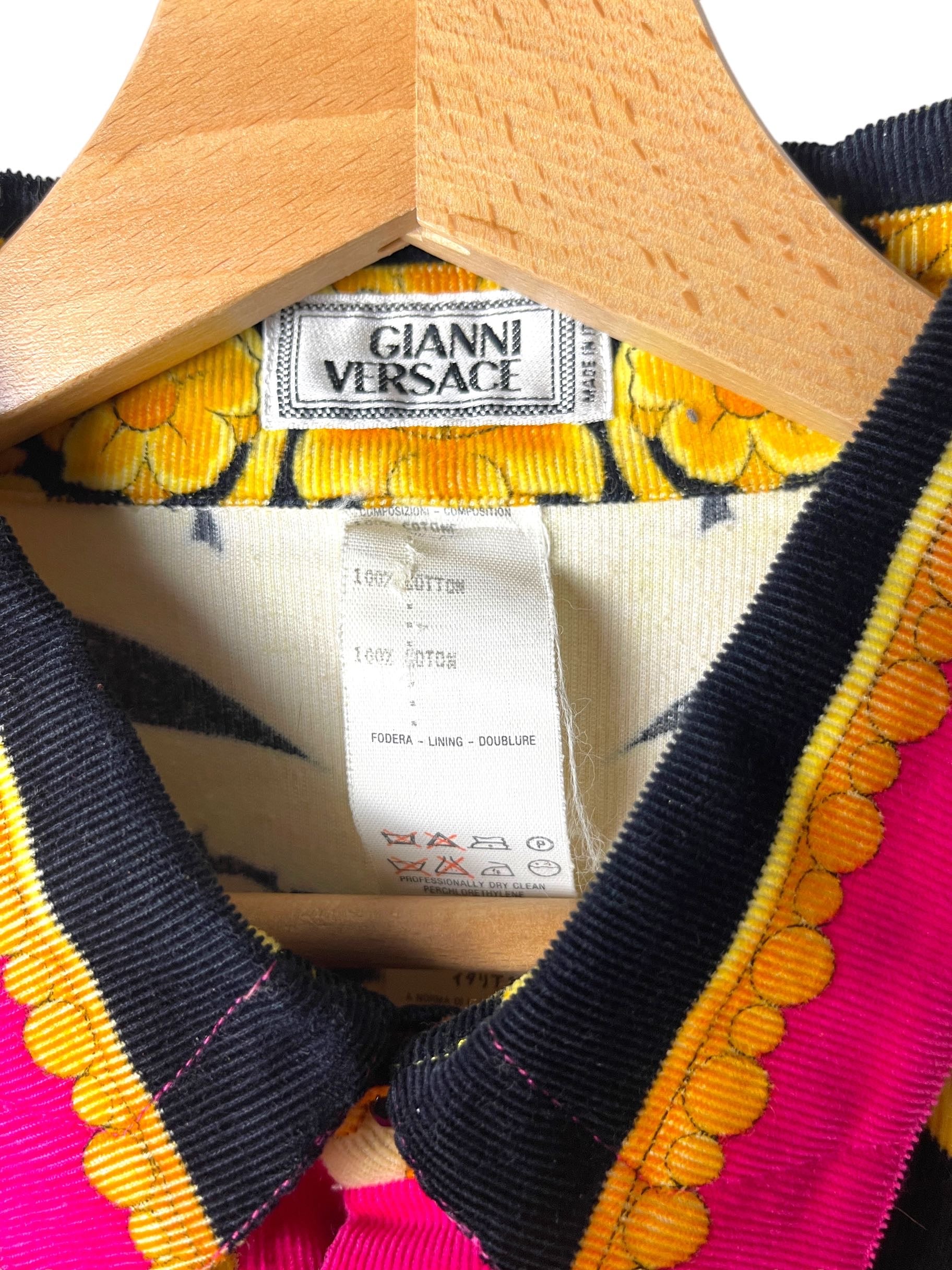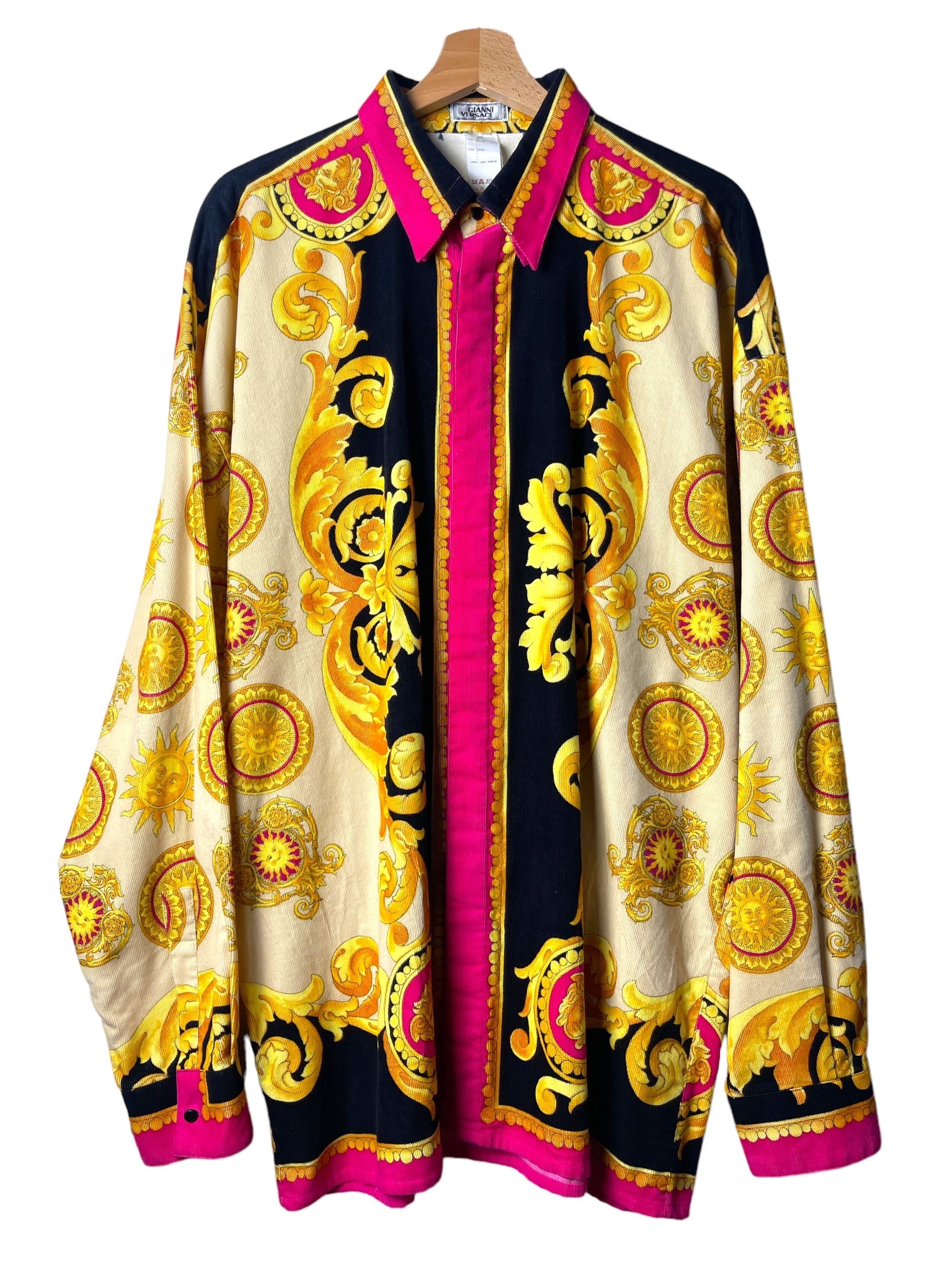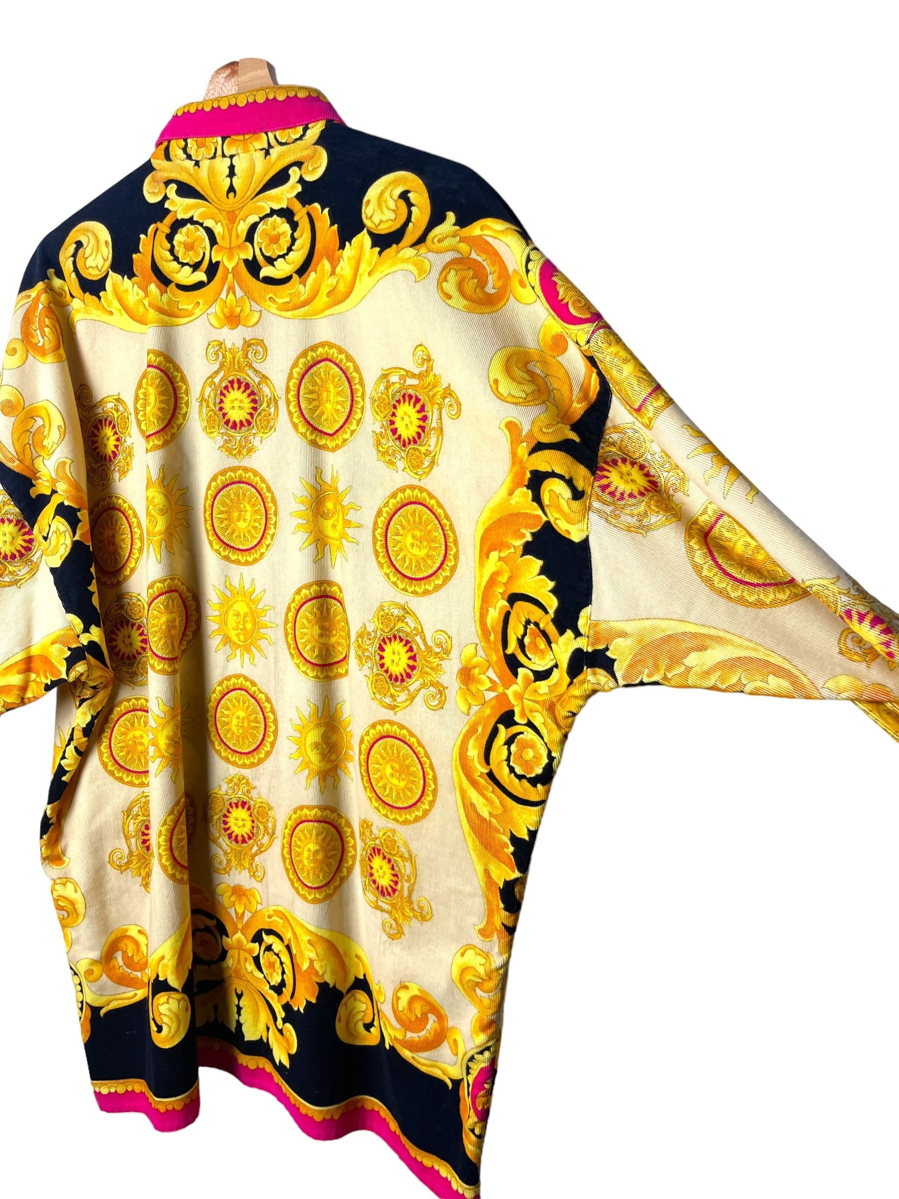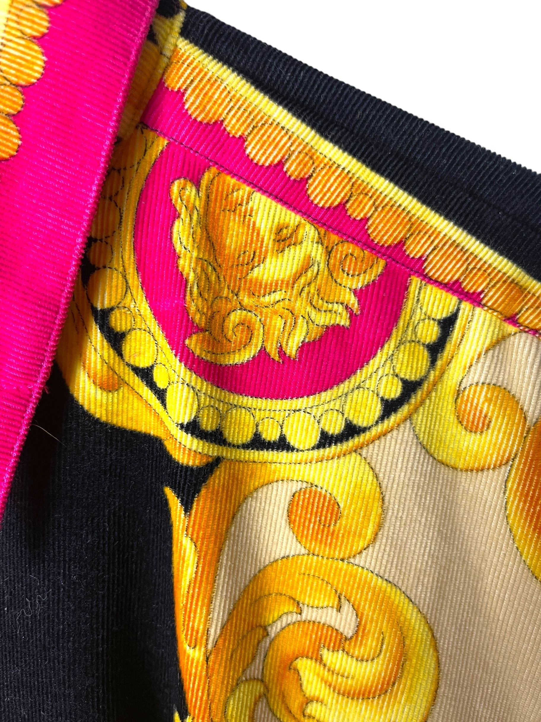 Gianni Versace camicia vintage anni 90s in velluto a costine, con stampa barocca e soli.