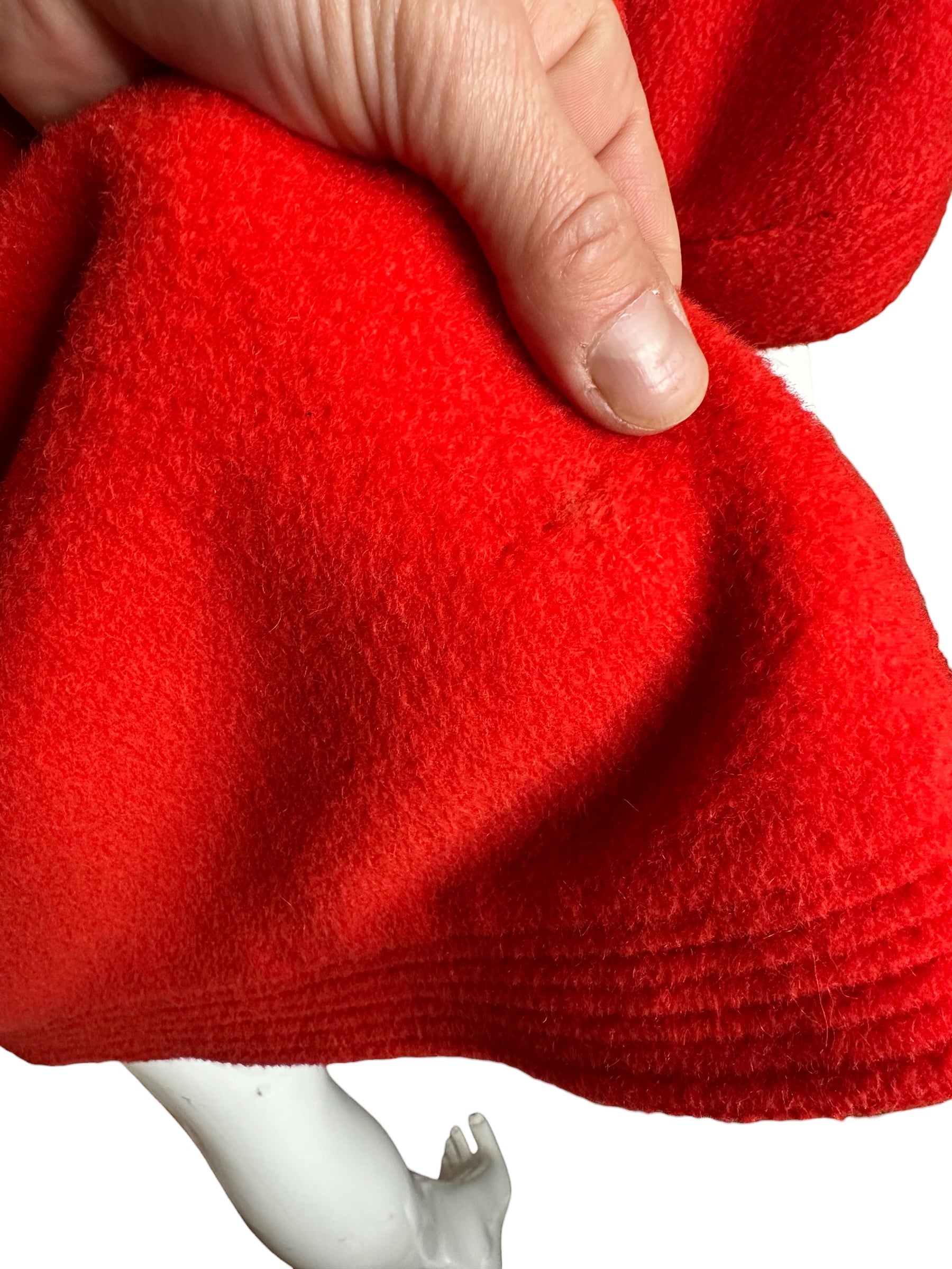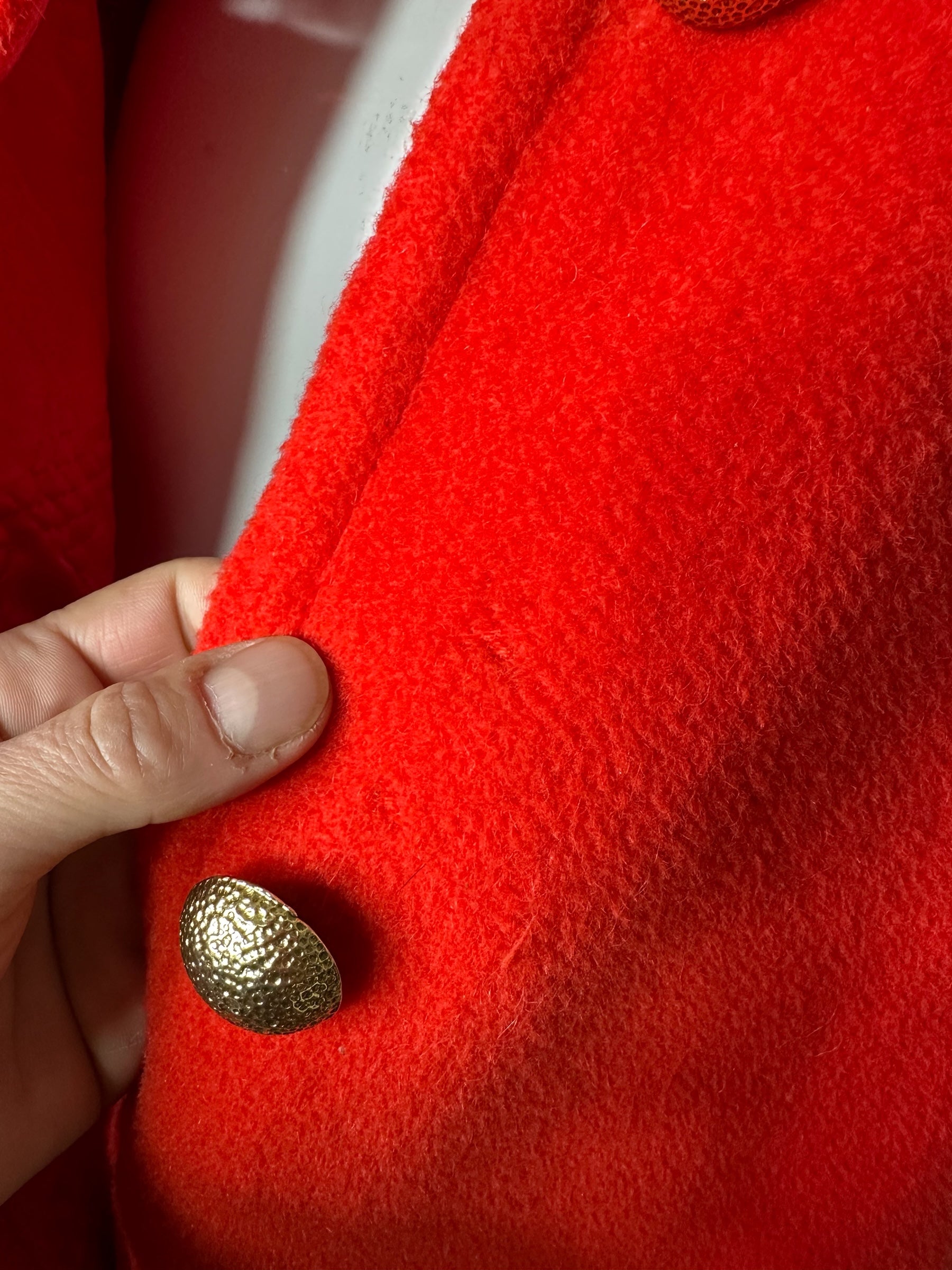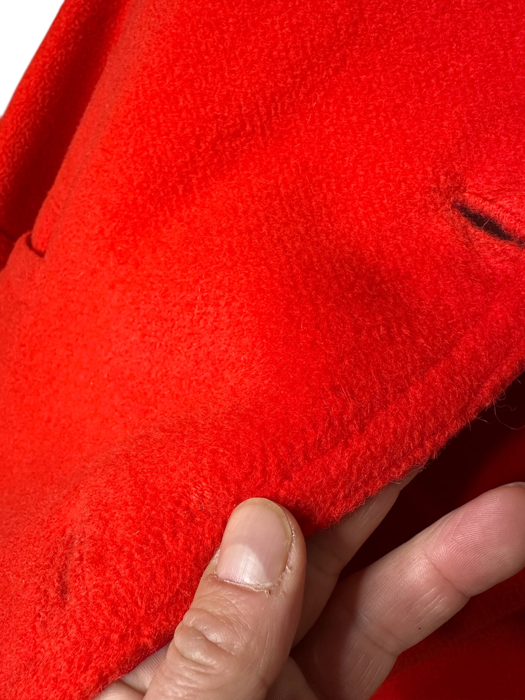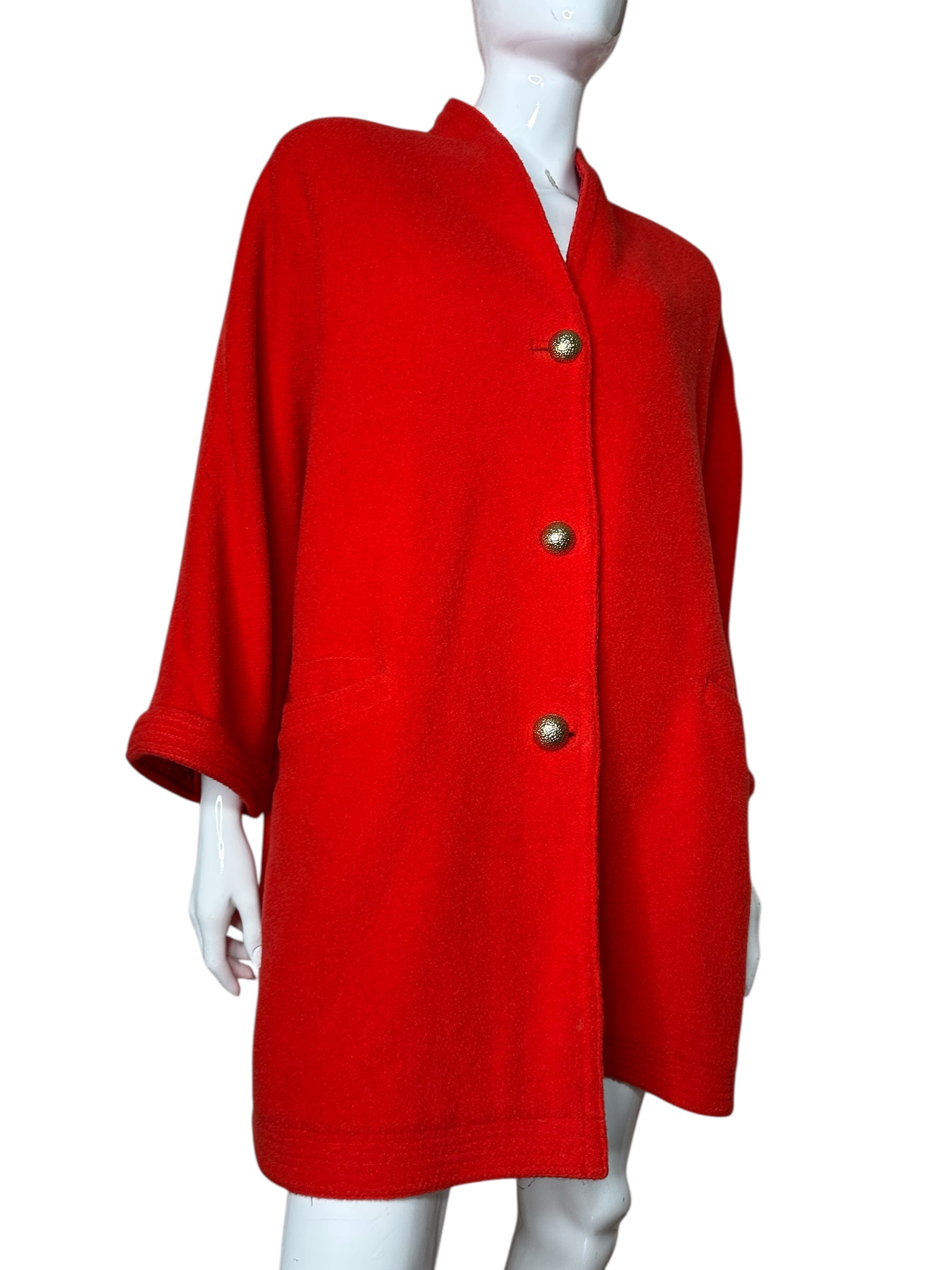 Cappotto vintage firmato Gianni Versace, realizzato in un caldo e pregiato panno rosso acceso, dal carattere deciso e iconico. Il modello presenta una linea ampia e morbida, con vestibilità oversize, pensata per essere indossata anche sopra maglie o capi strutturati.