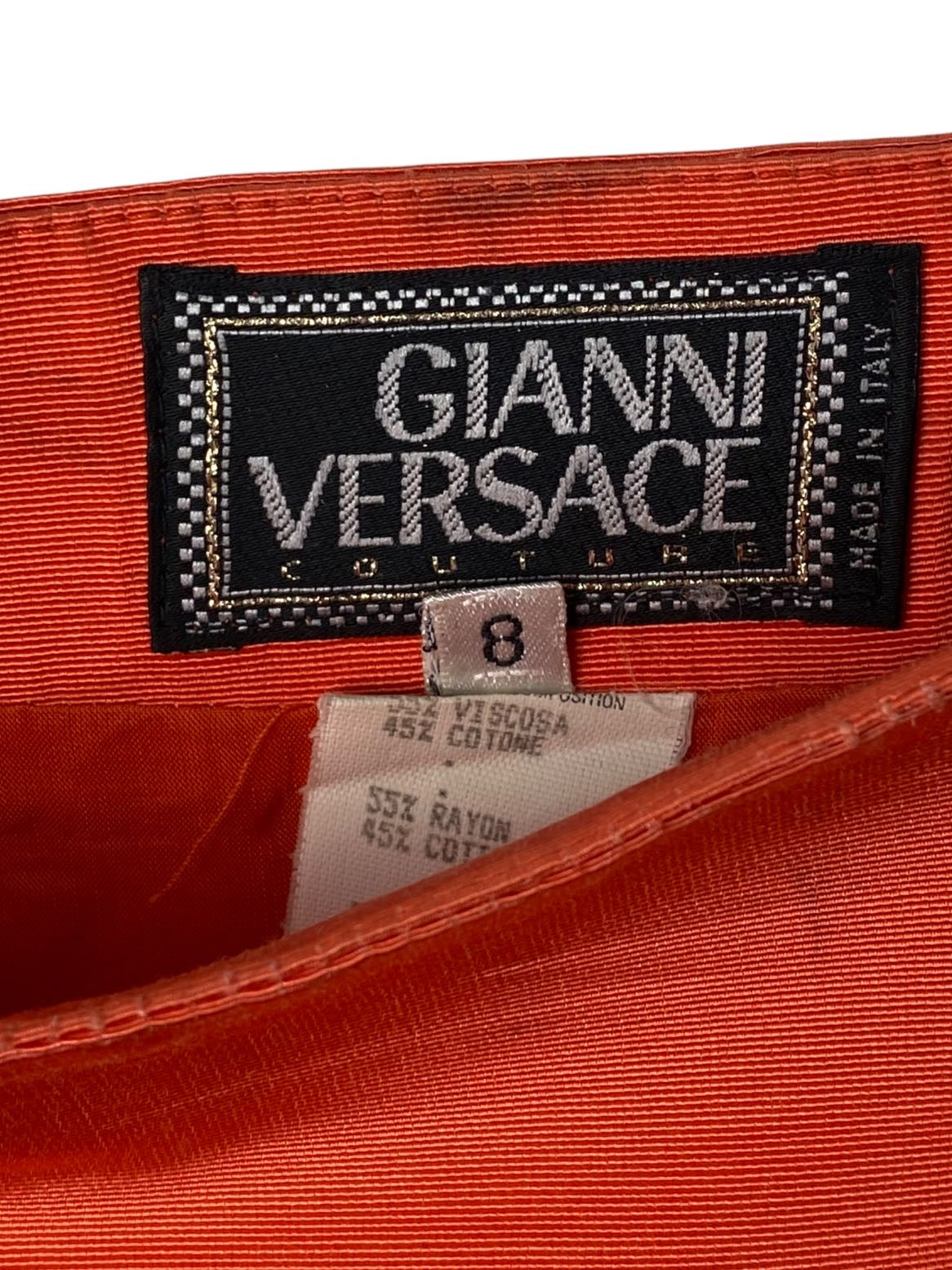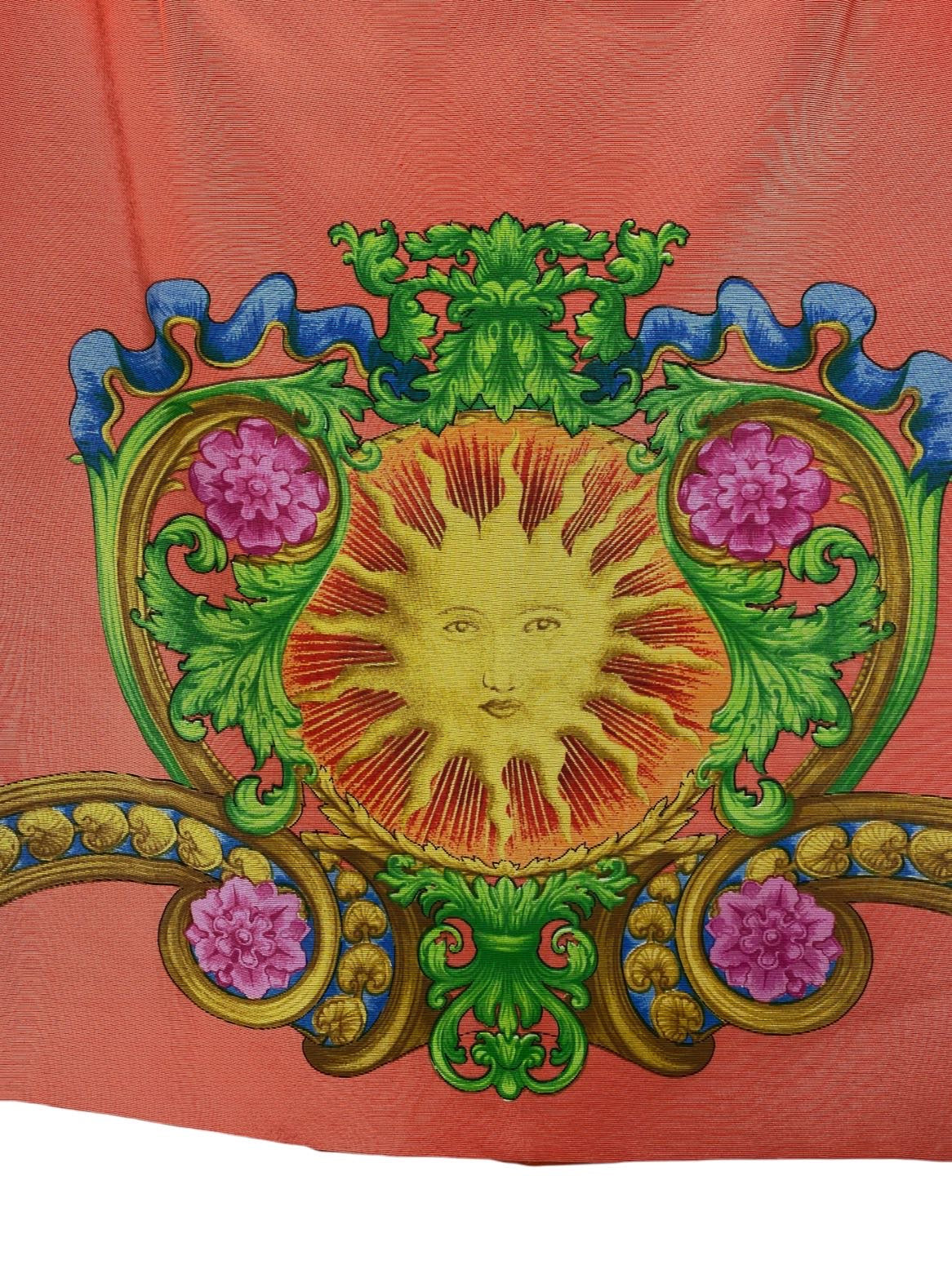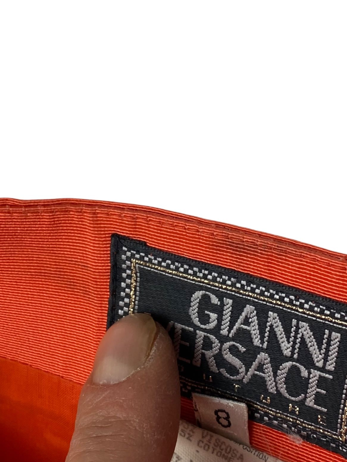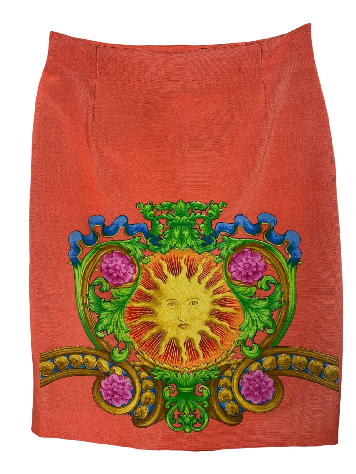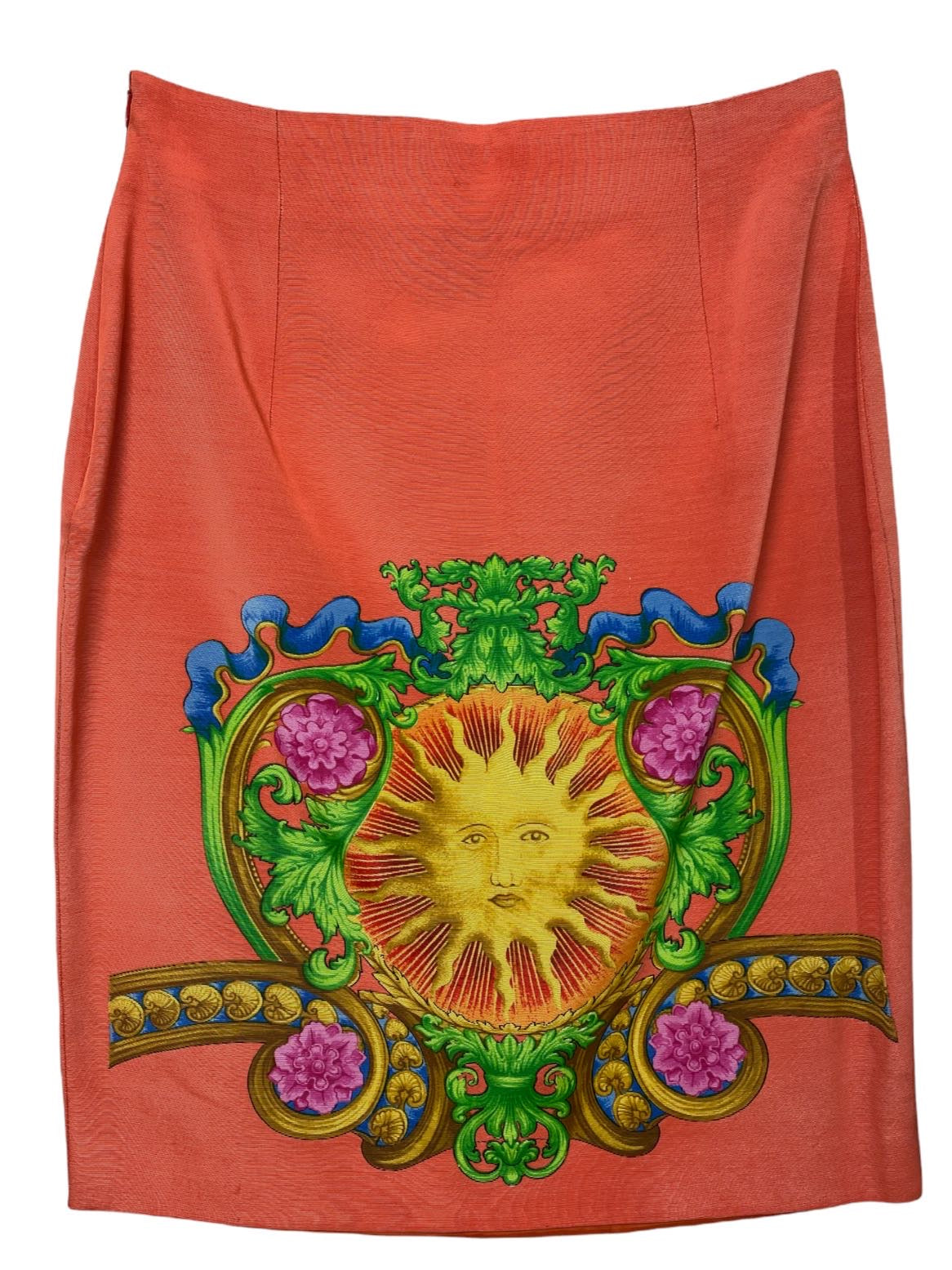 Gianni Versace gonna longuette vintage in viscosa e raso color corallo con stampa iconica”’Miami” anni 90s sul davanti e sul retro. Tg.42 Lieve segno di usura sul giro vita interno.