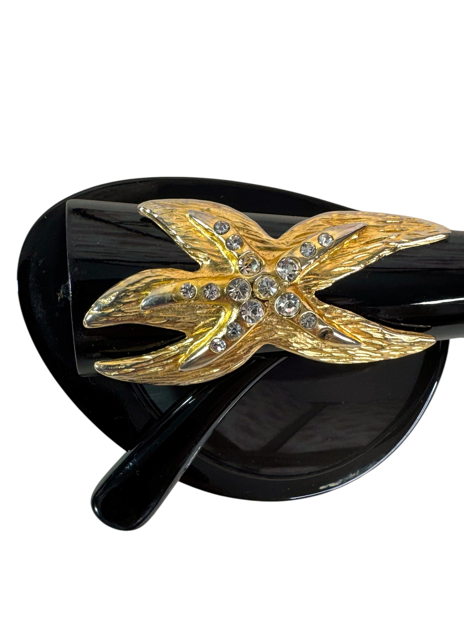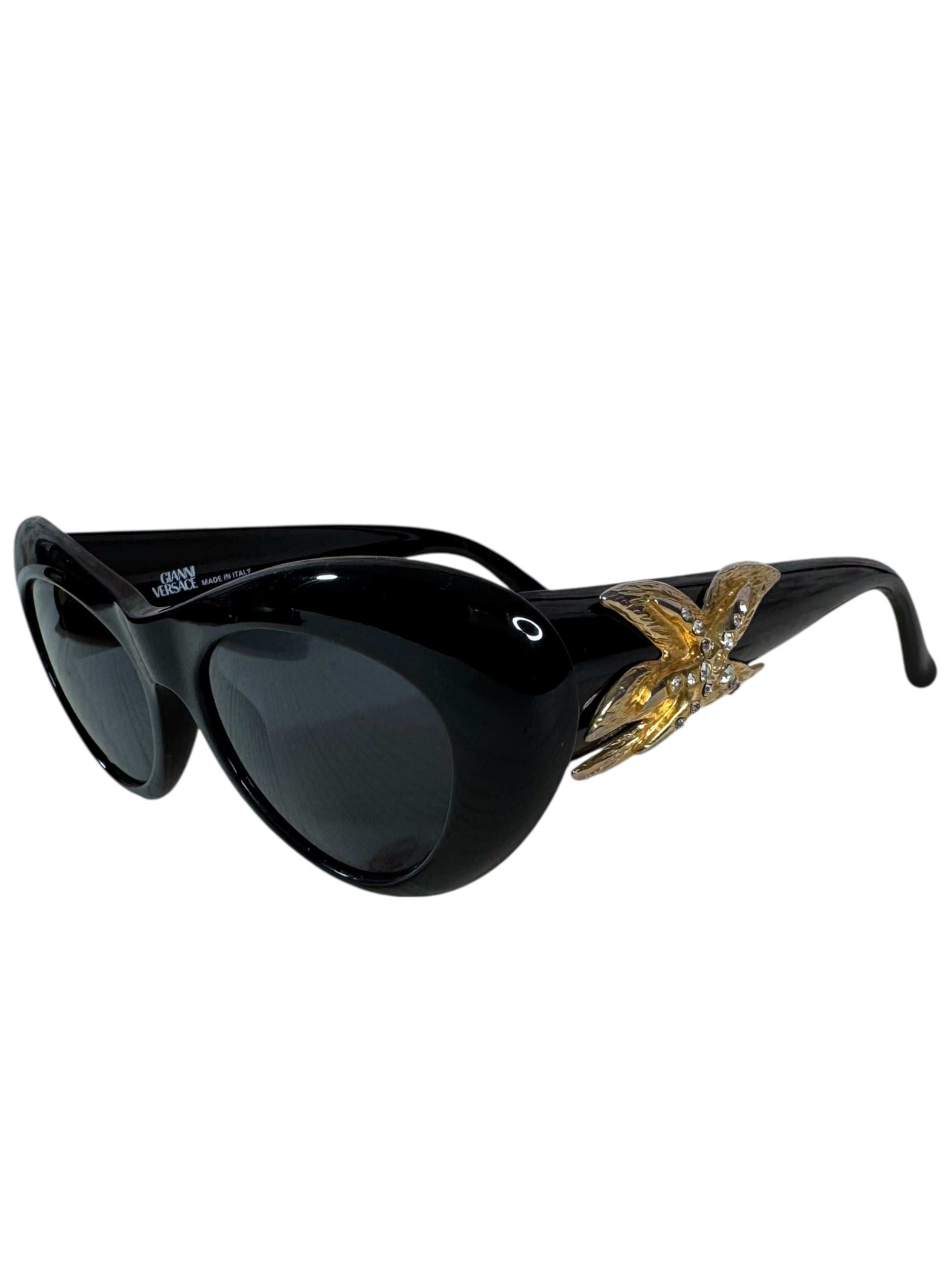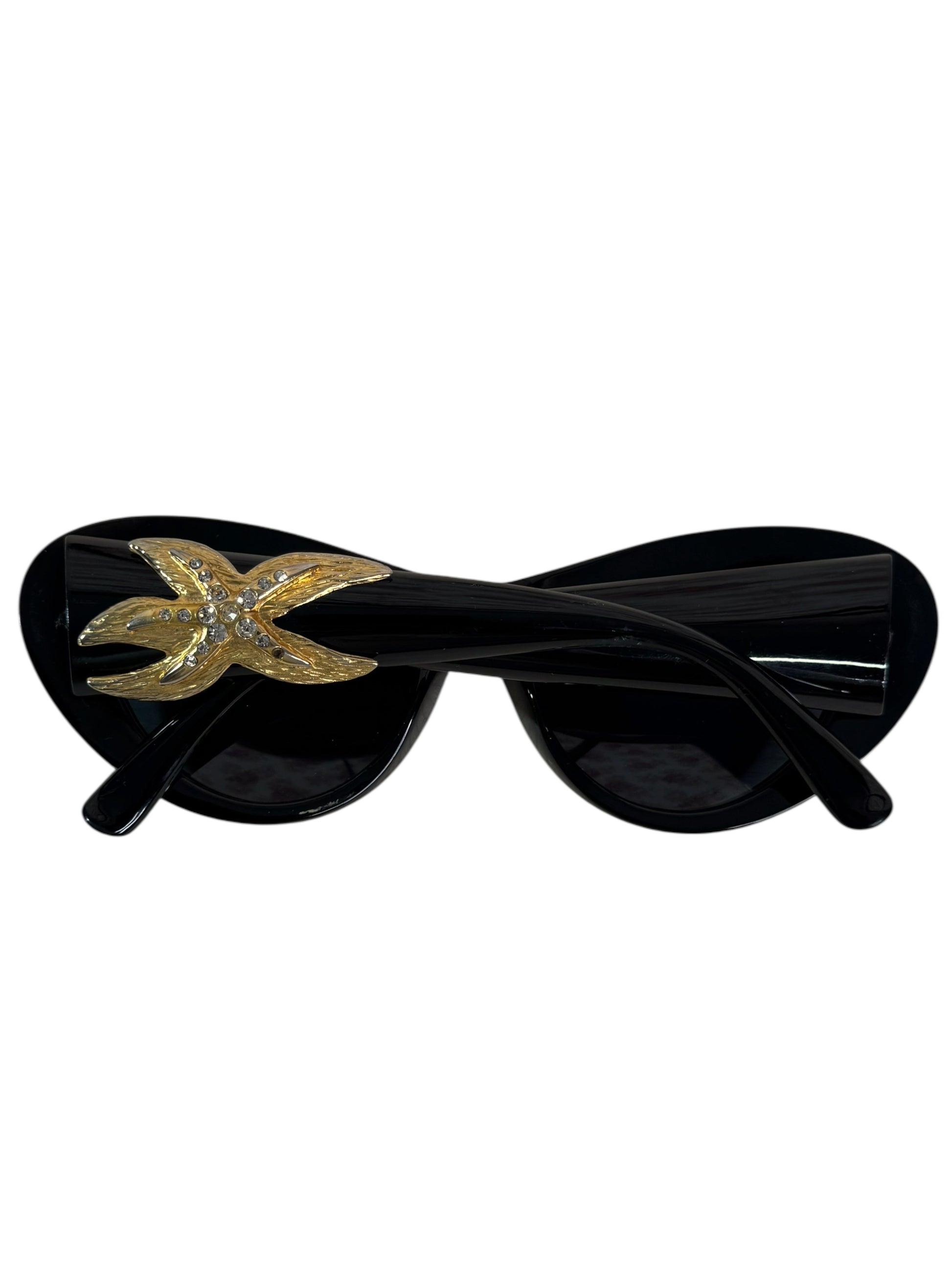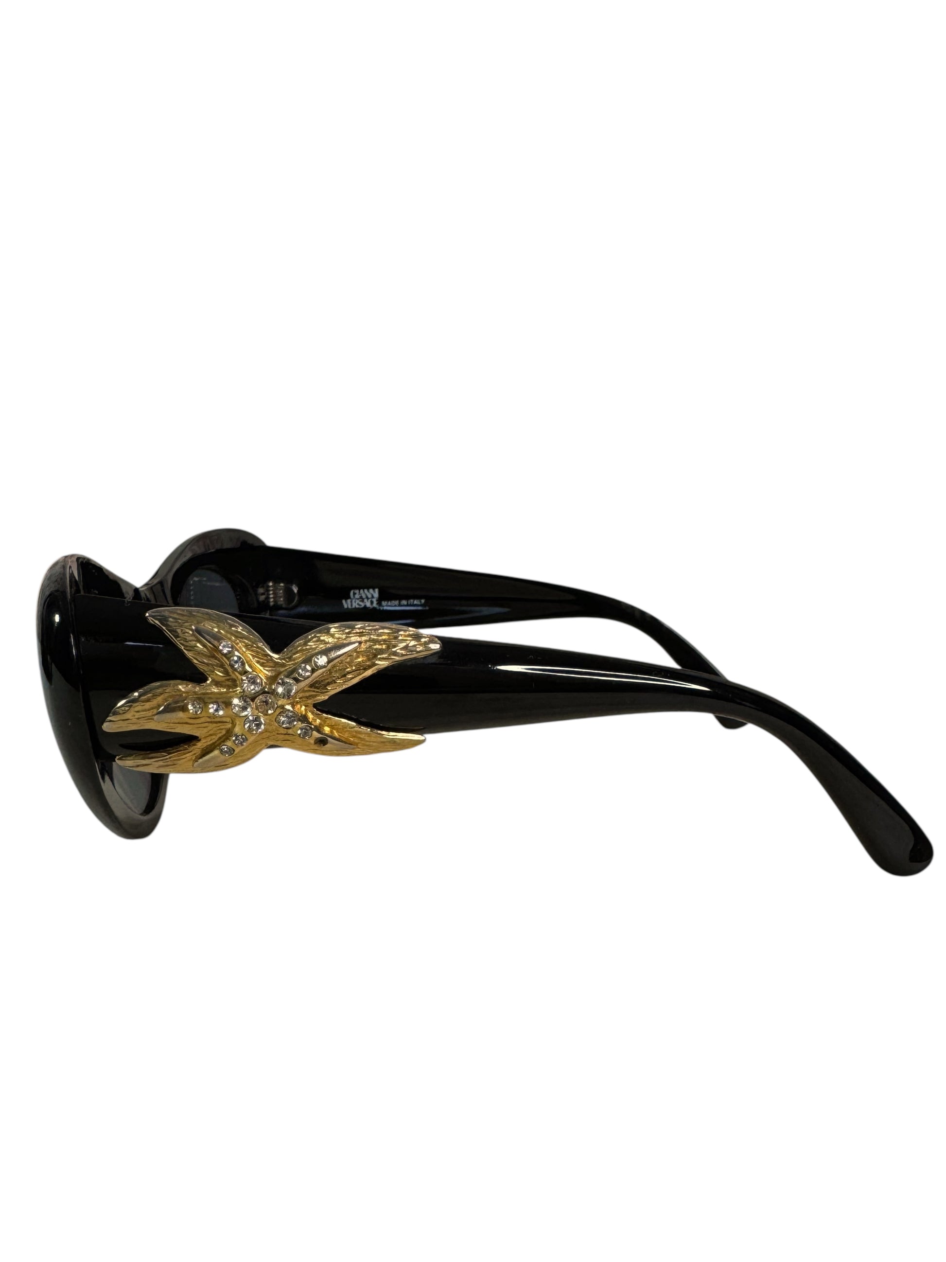 Occhiali da sole vintage anni ‘90 originali Gianni Versace, modello cat-eye oversize in acetato nero lucido con lenti scure. Le aste sono impreziosite da un applicativo a forma di stella marina dorata con cristalli. Realizzati in Italia, sono un accessorio da collezione iconico e raro.