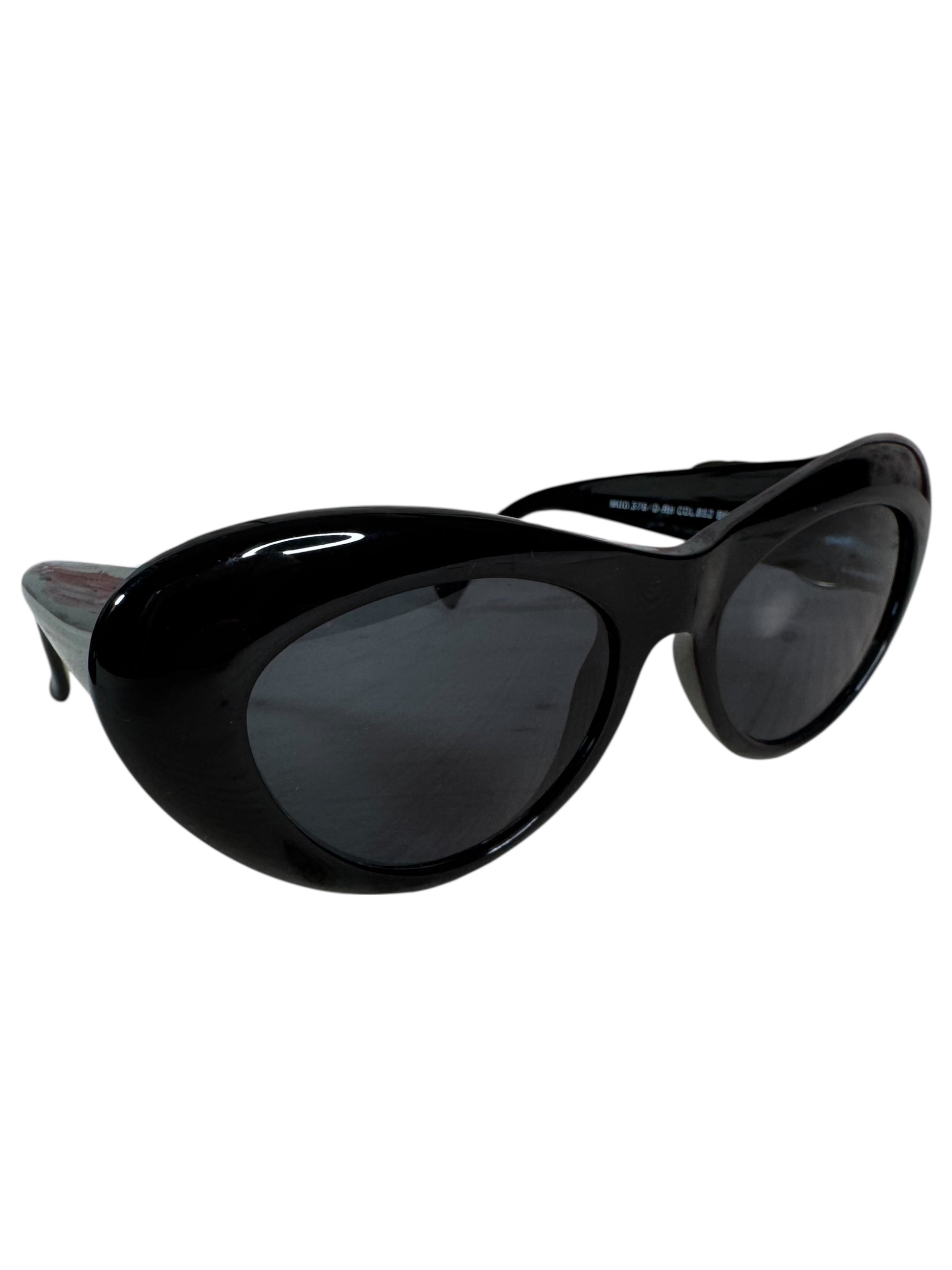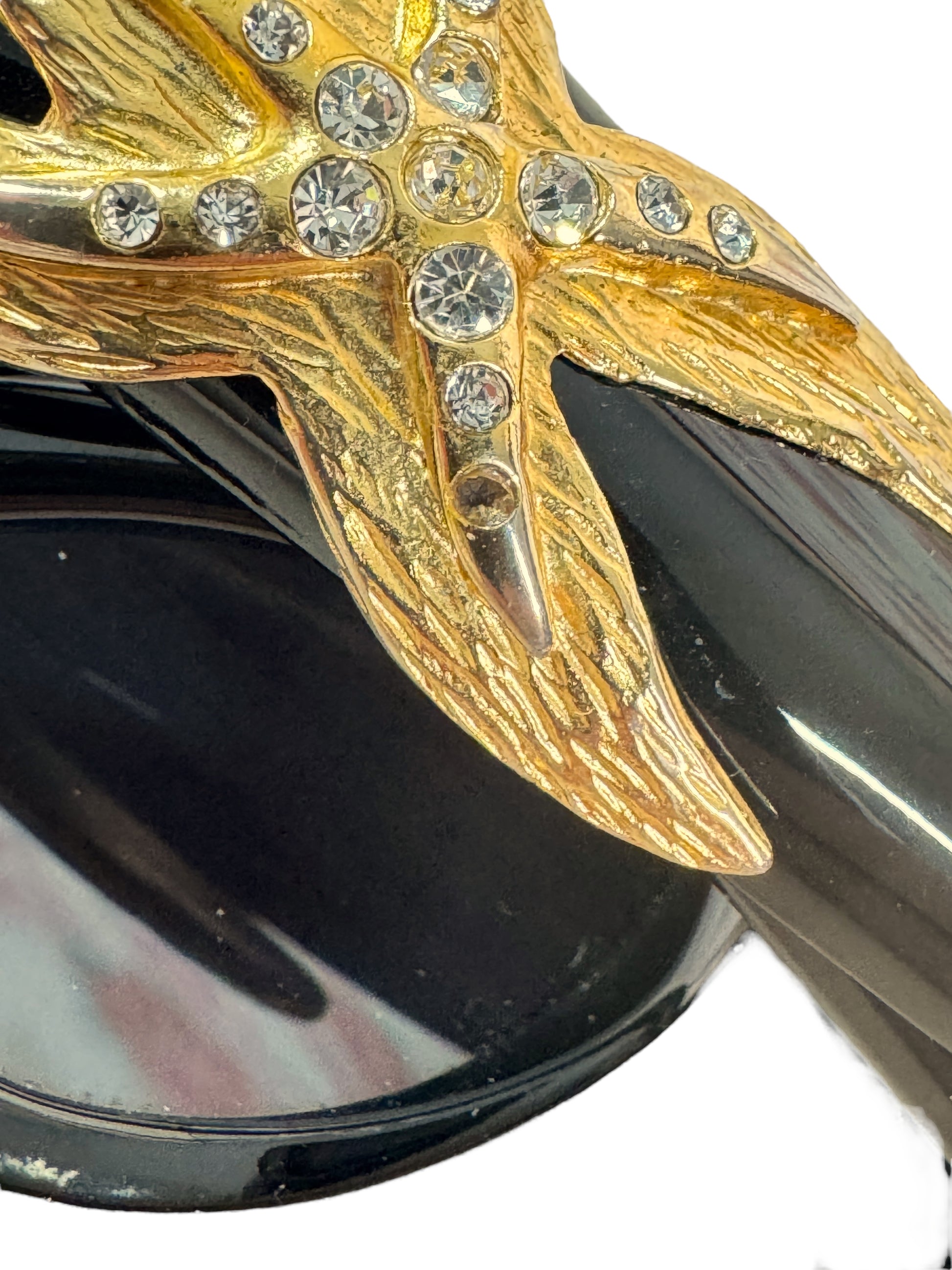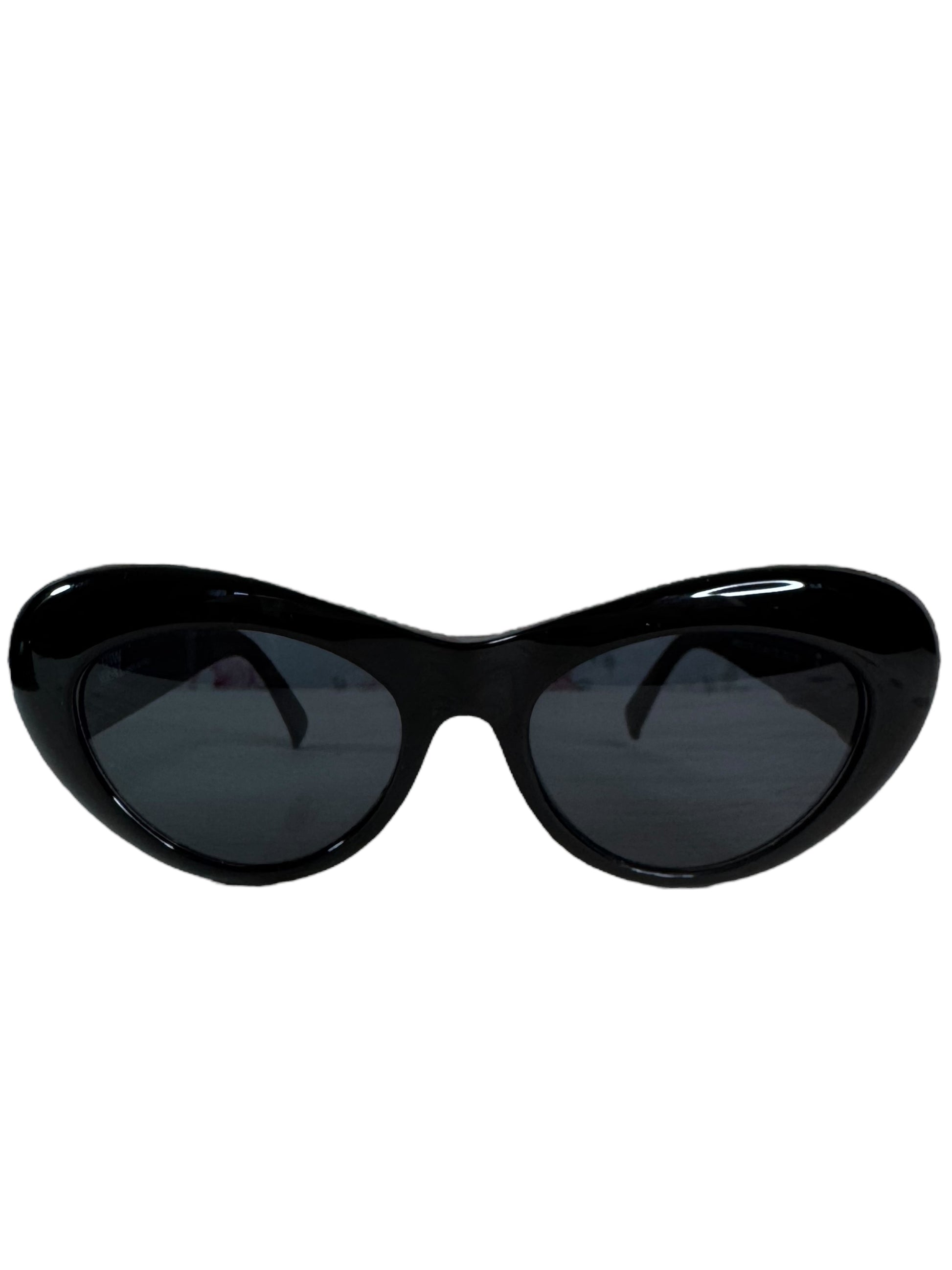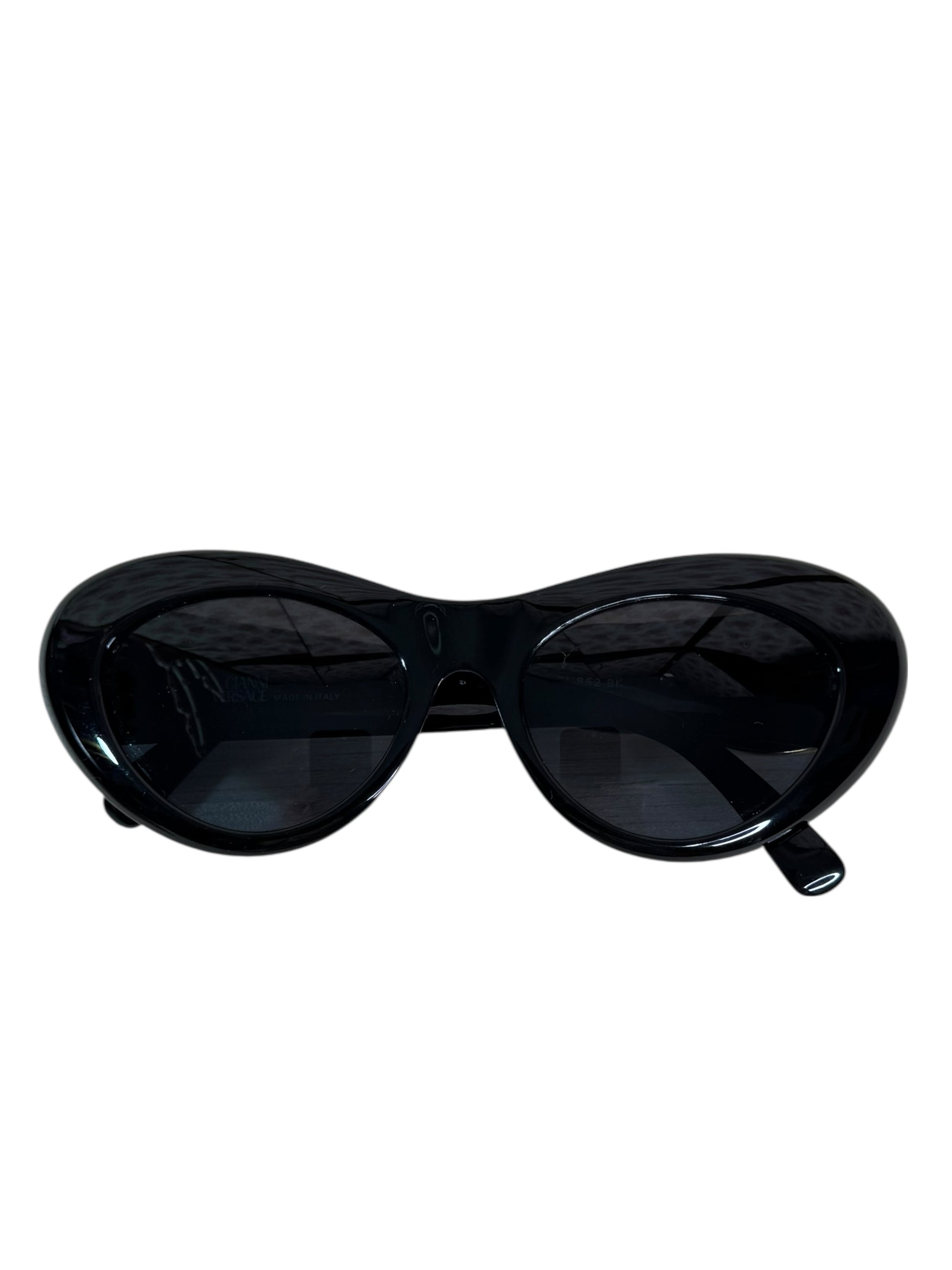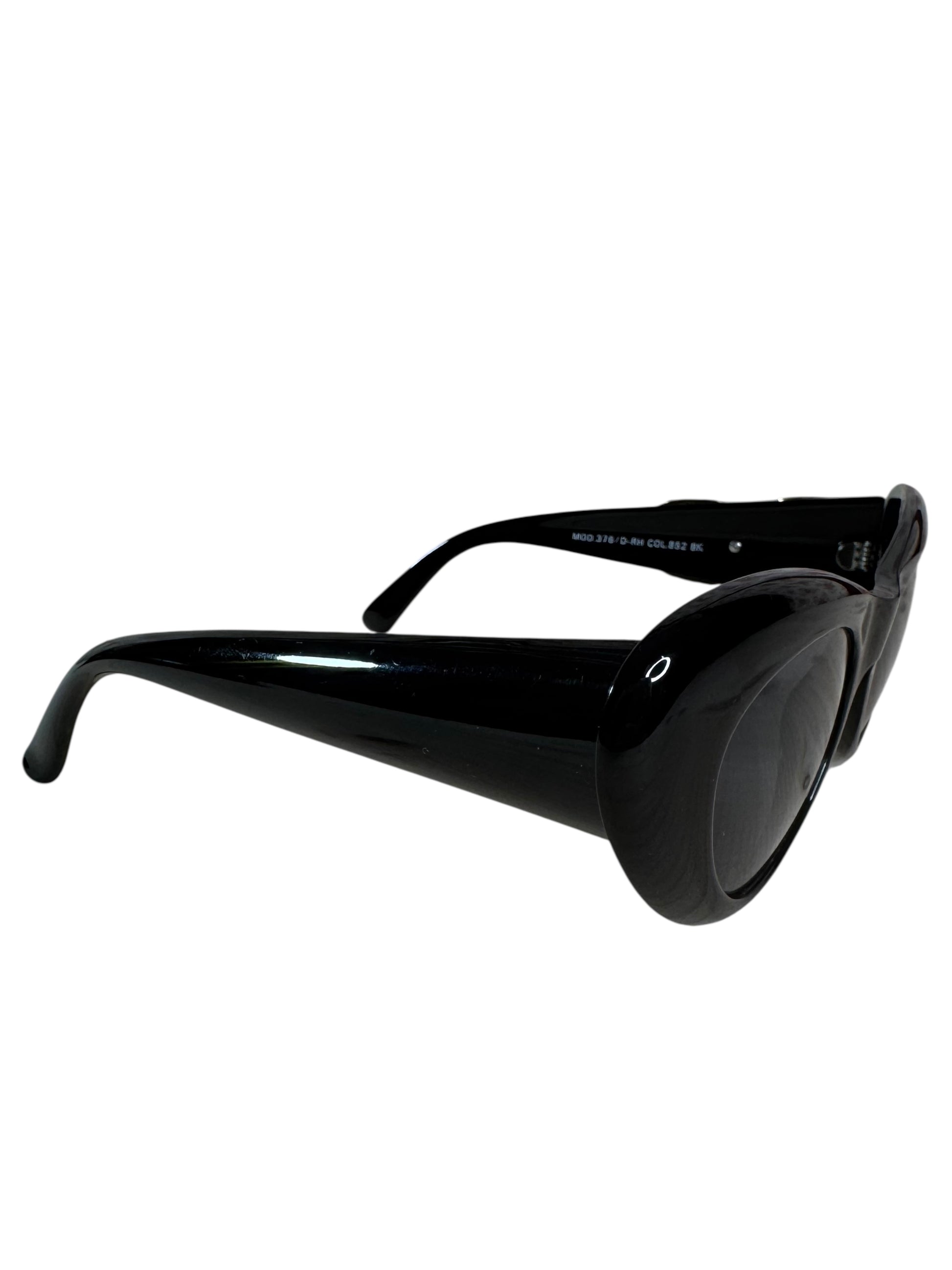 Occhiali da sole vintage anni ‘90 originali Gianni Versace, modello cat-eye oversize in acetato nero lucido con lenti scure. Le aste sono impreziosite da un applicativo a forma di stella marina dorata con cristalli. Realizzati in Italia, sono un accessorio da collezione iconico e raro.