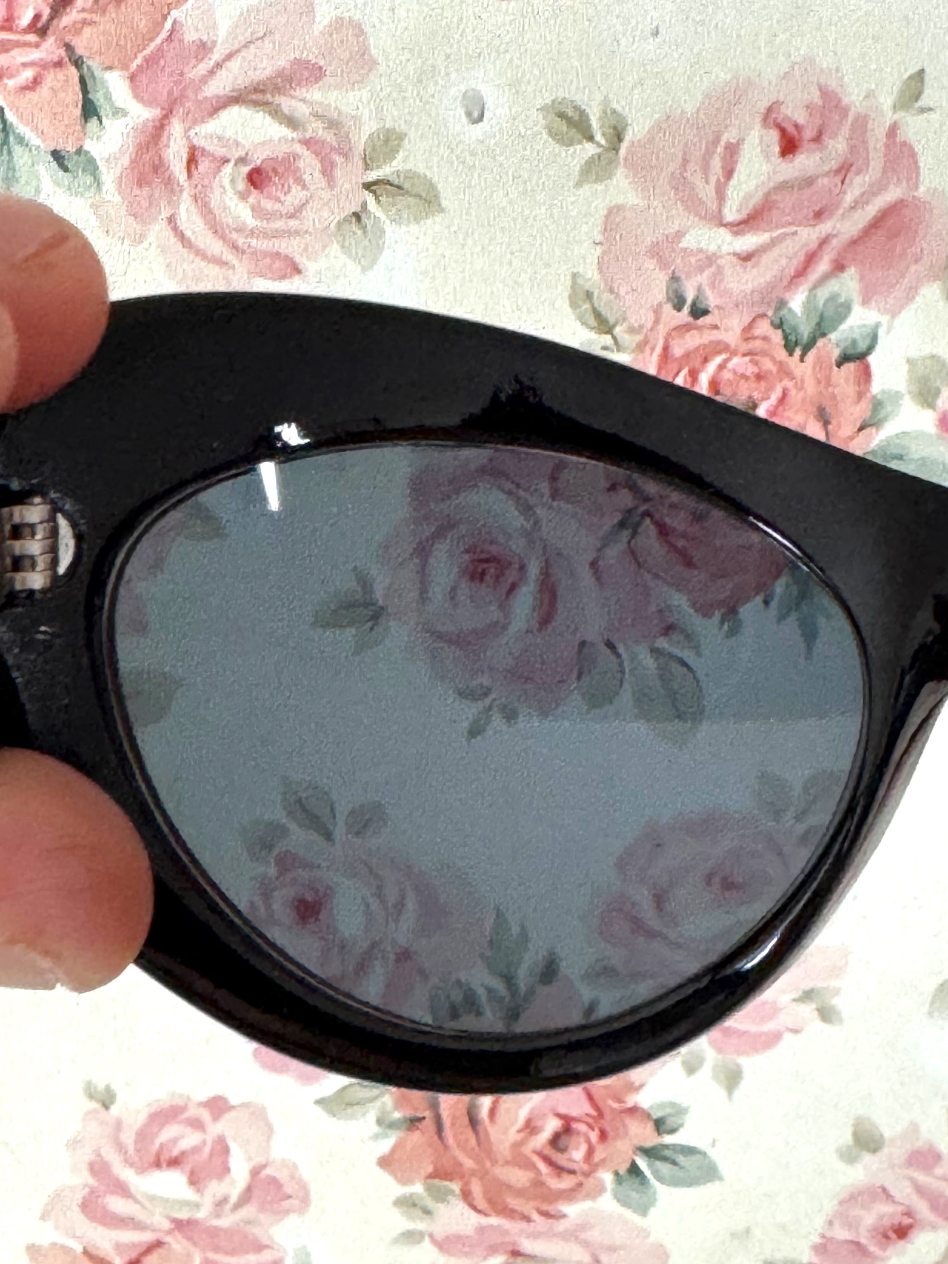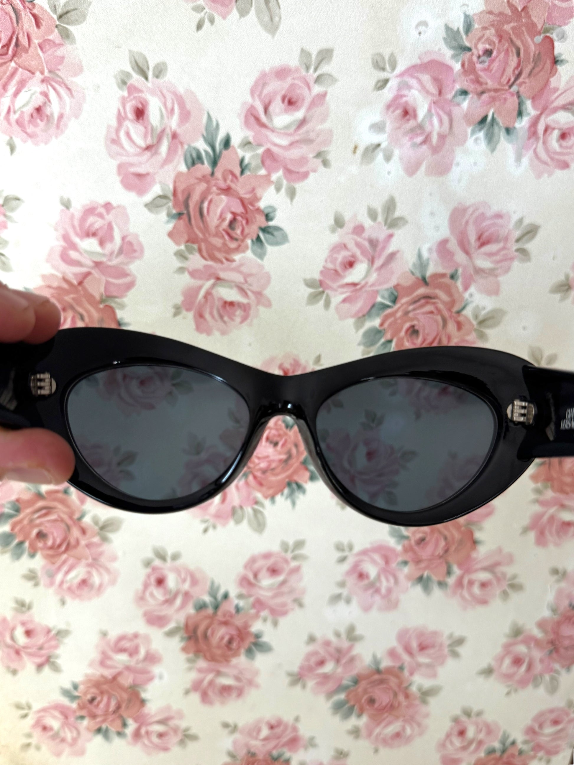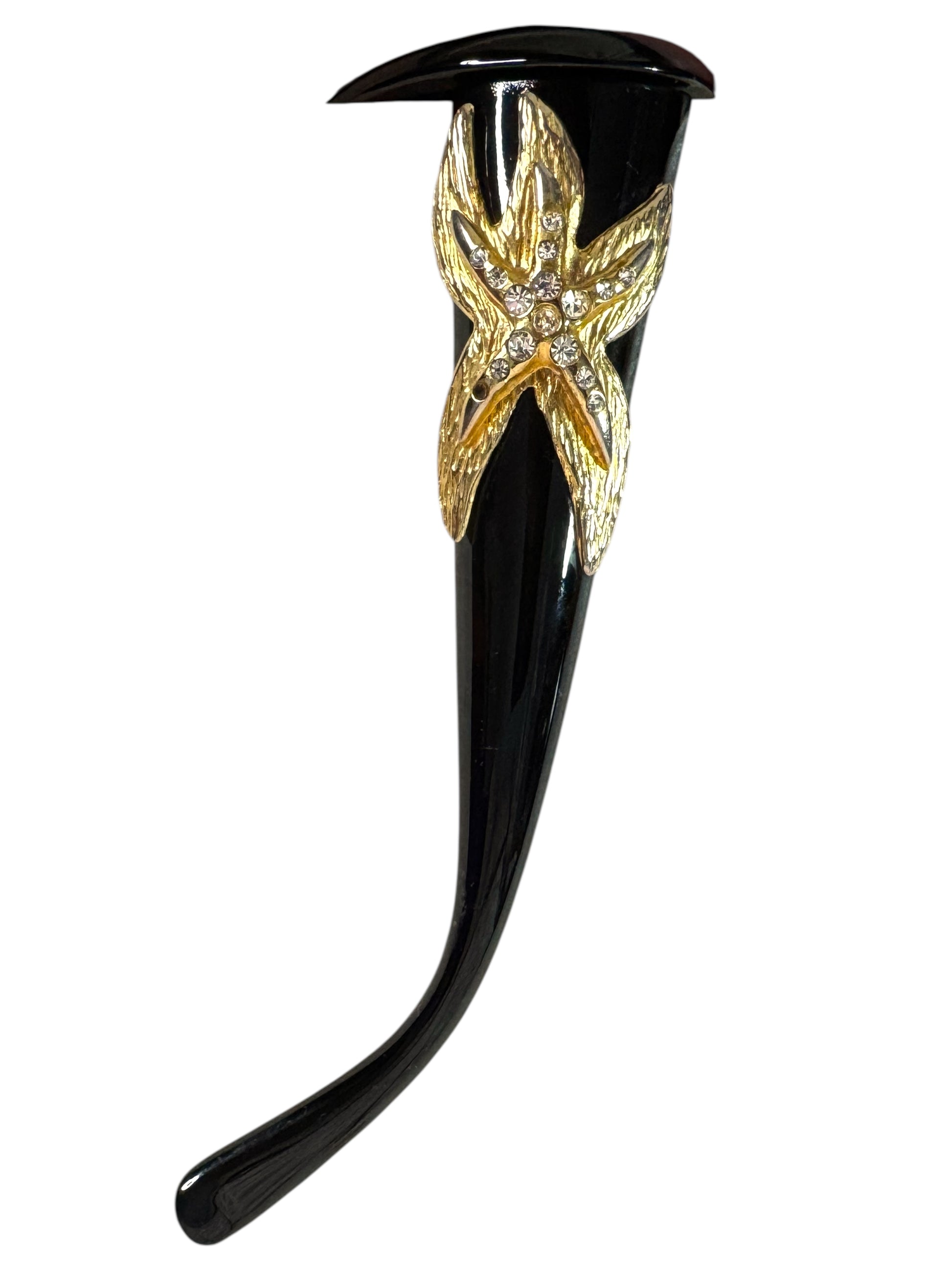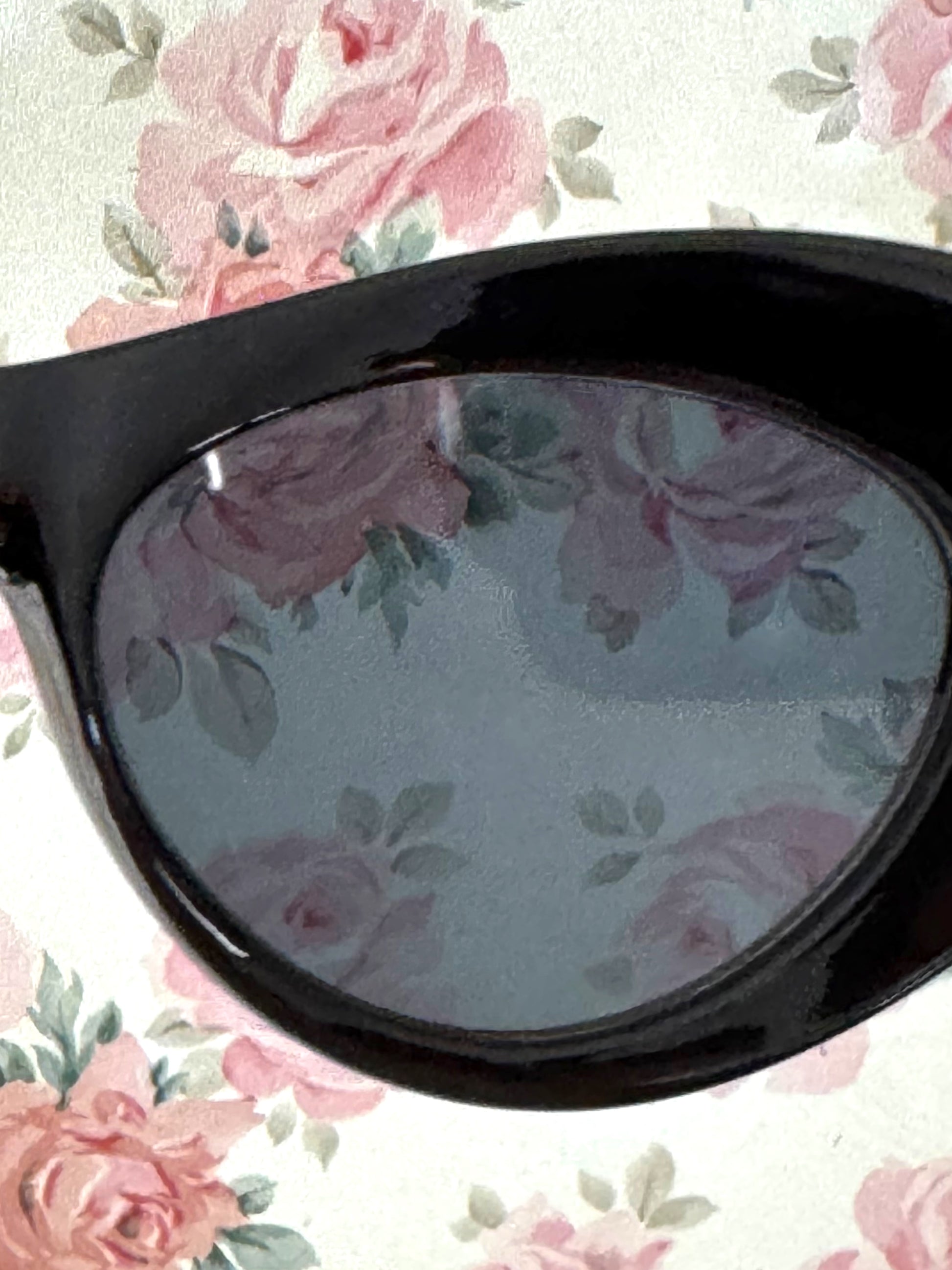 Occhiali da sole vintage anni ‘90 originali Gianni Versace, modello cat-eye oversize in acetato nero lucido con lenti scure. Le aste sono impreziosite da un applicativo a forma di stella marina dorata con cristalli. Realizzati in Italia, sono un accessorio da collezione iconico e raro.