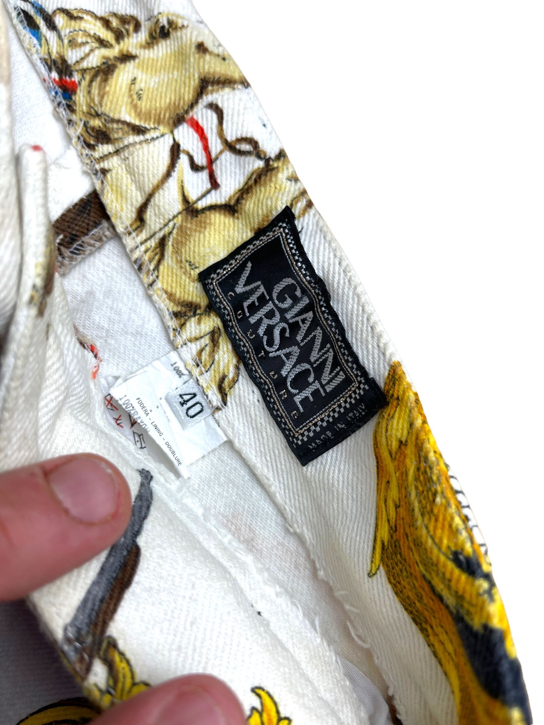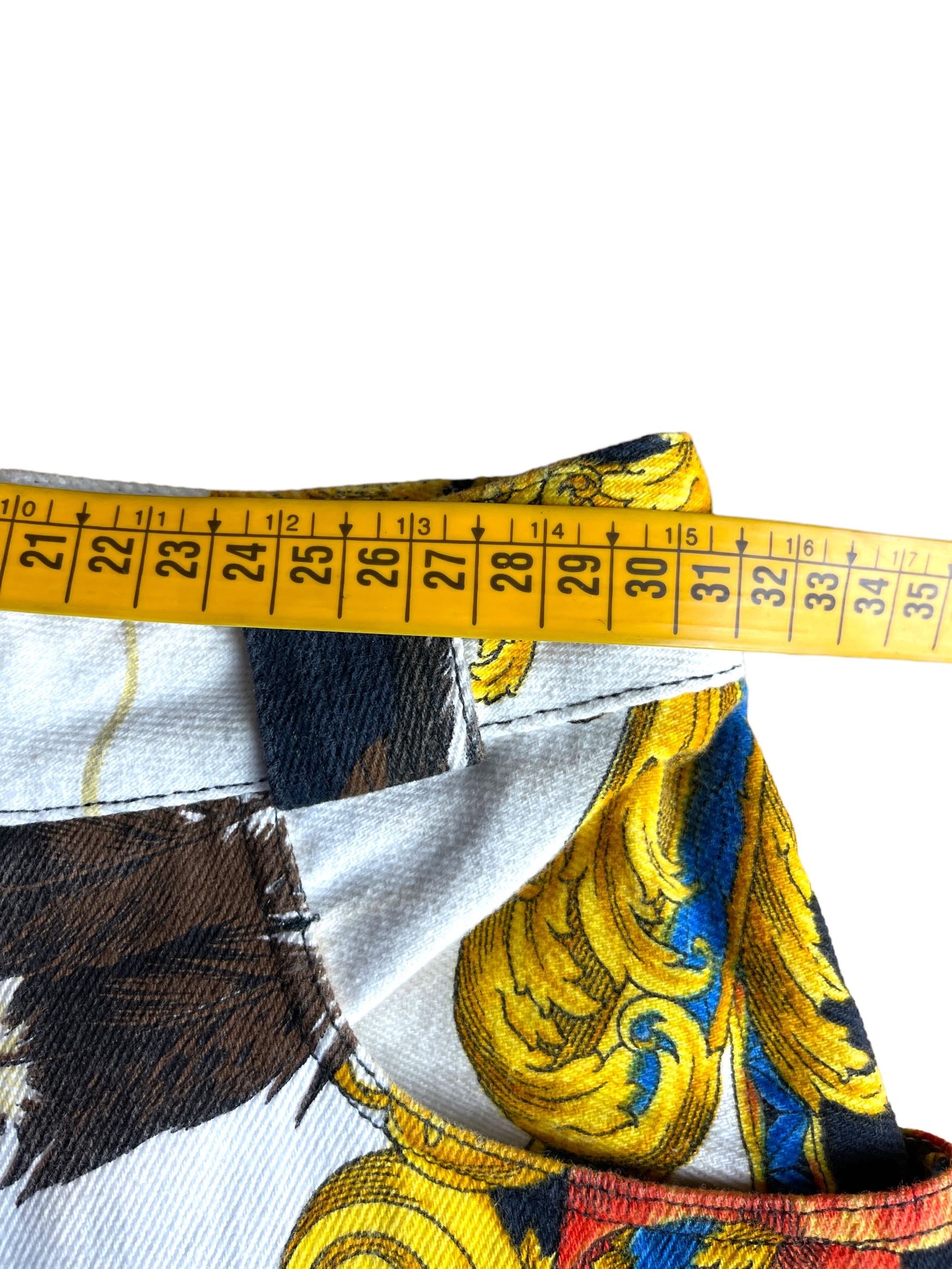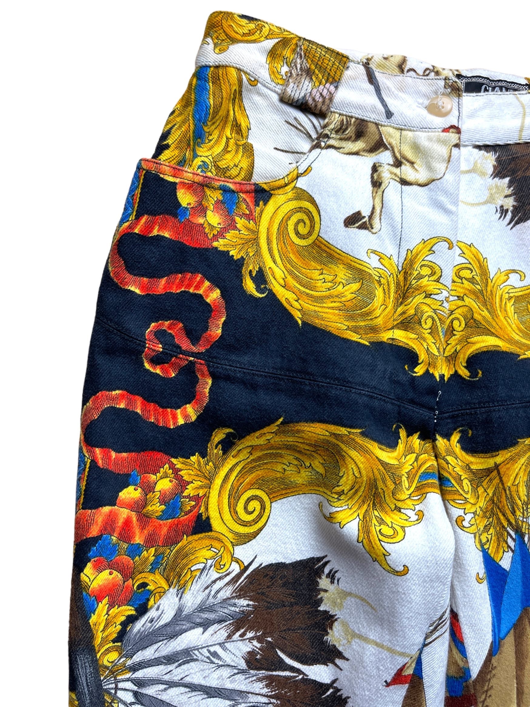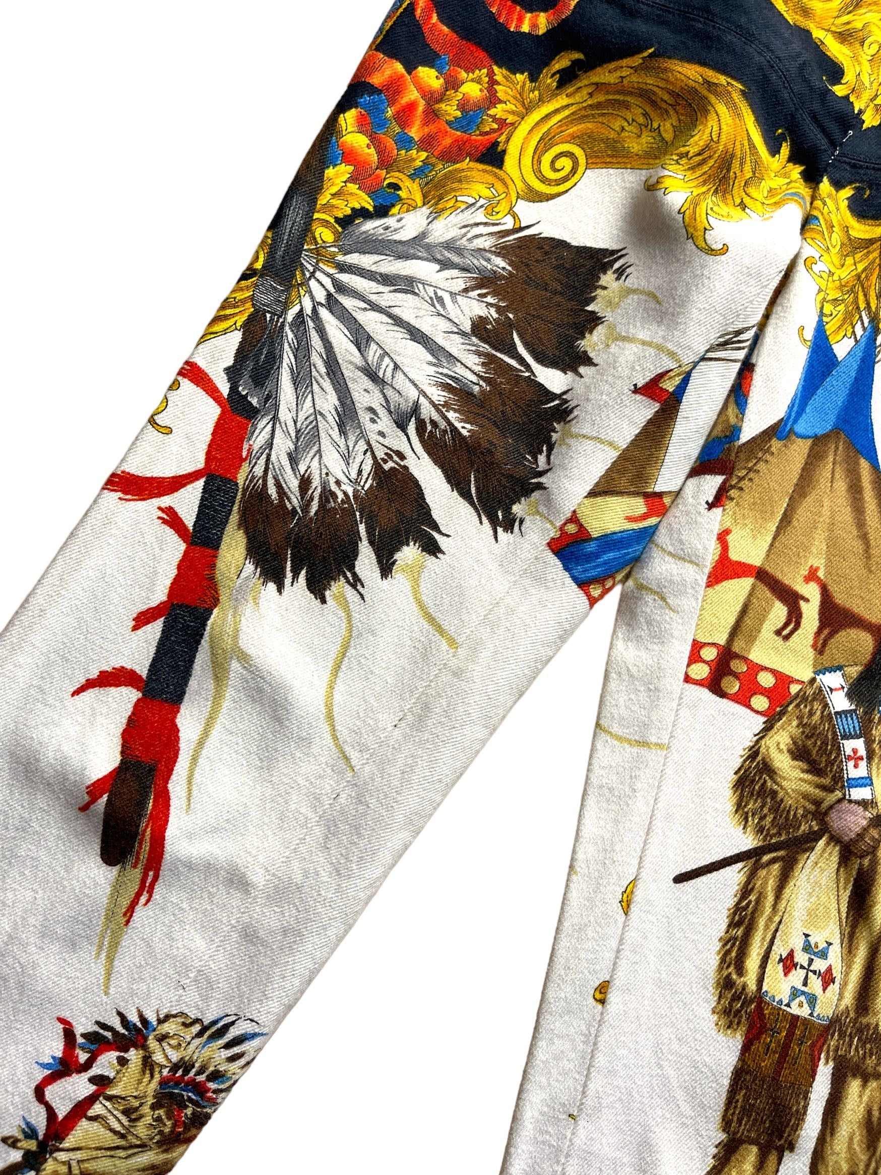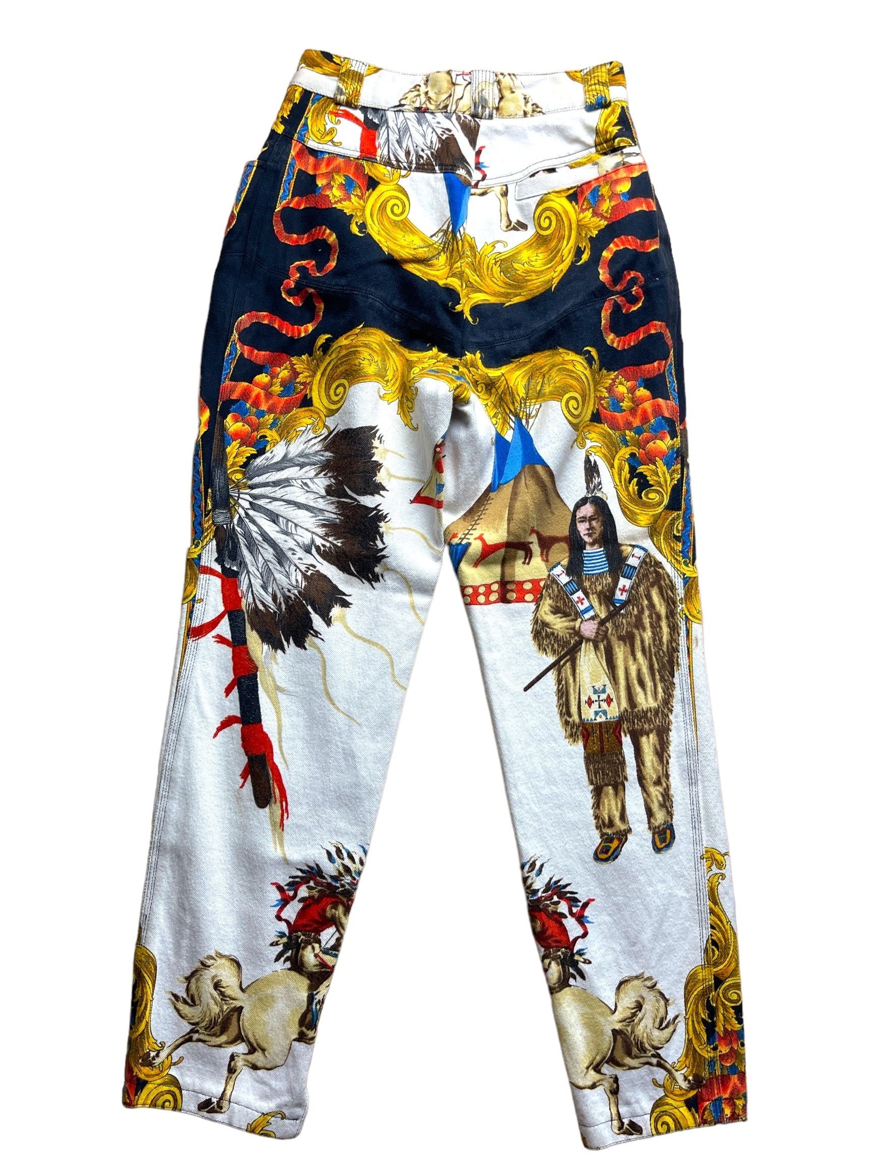 Gianni Versace, pantaloni in cotone con stampa Nativi d’America. Vintage anni 90s. Il bottone è stato sostituito, taglia 40, misura in vita30cm