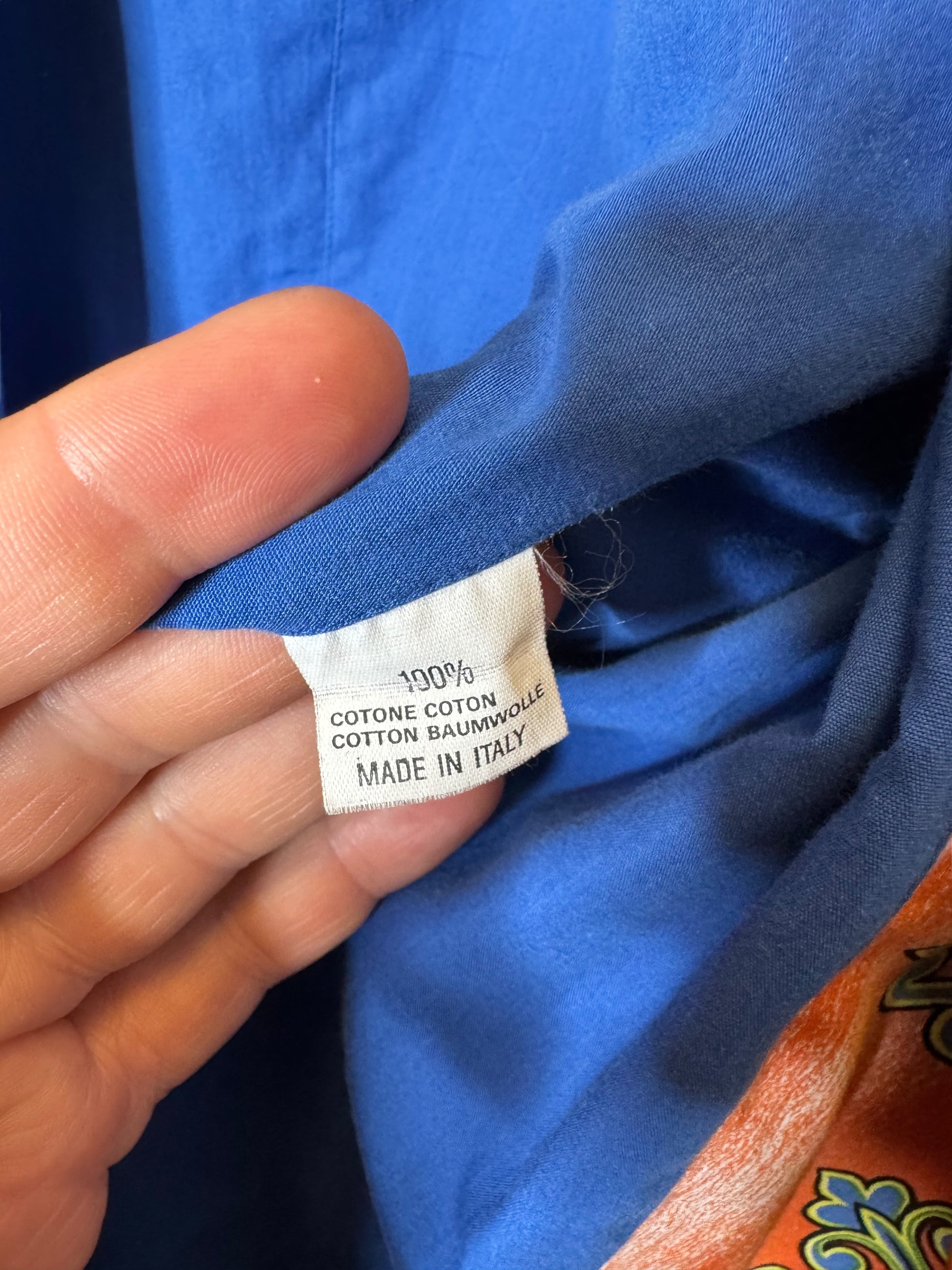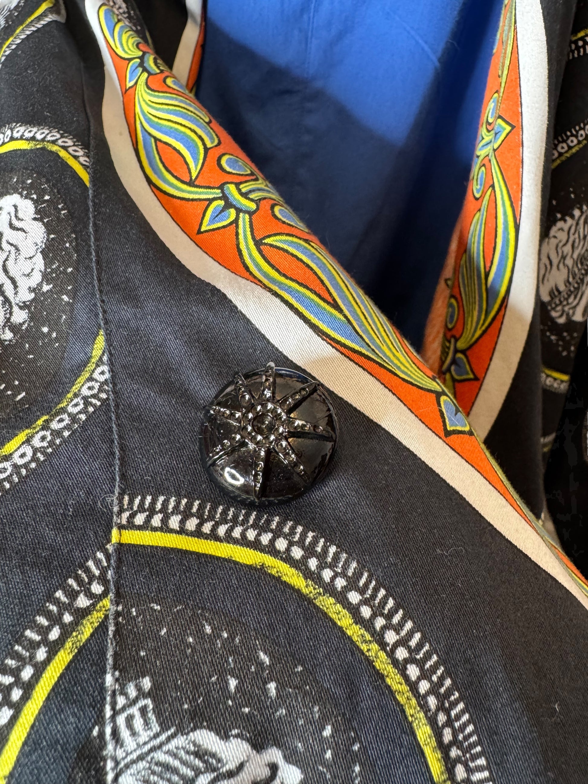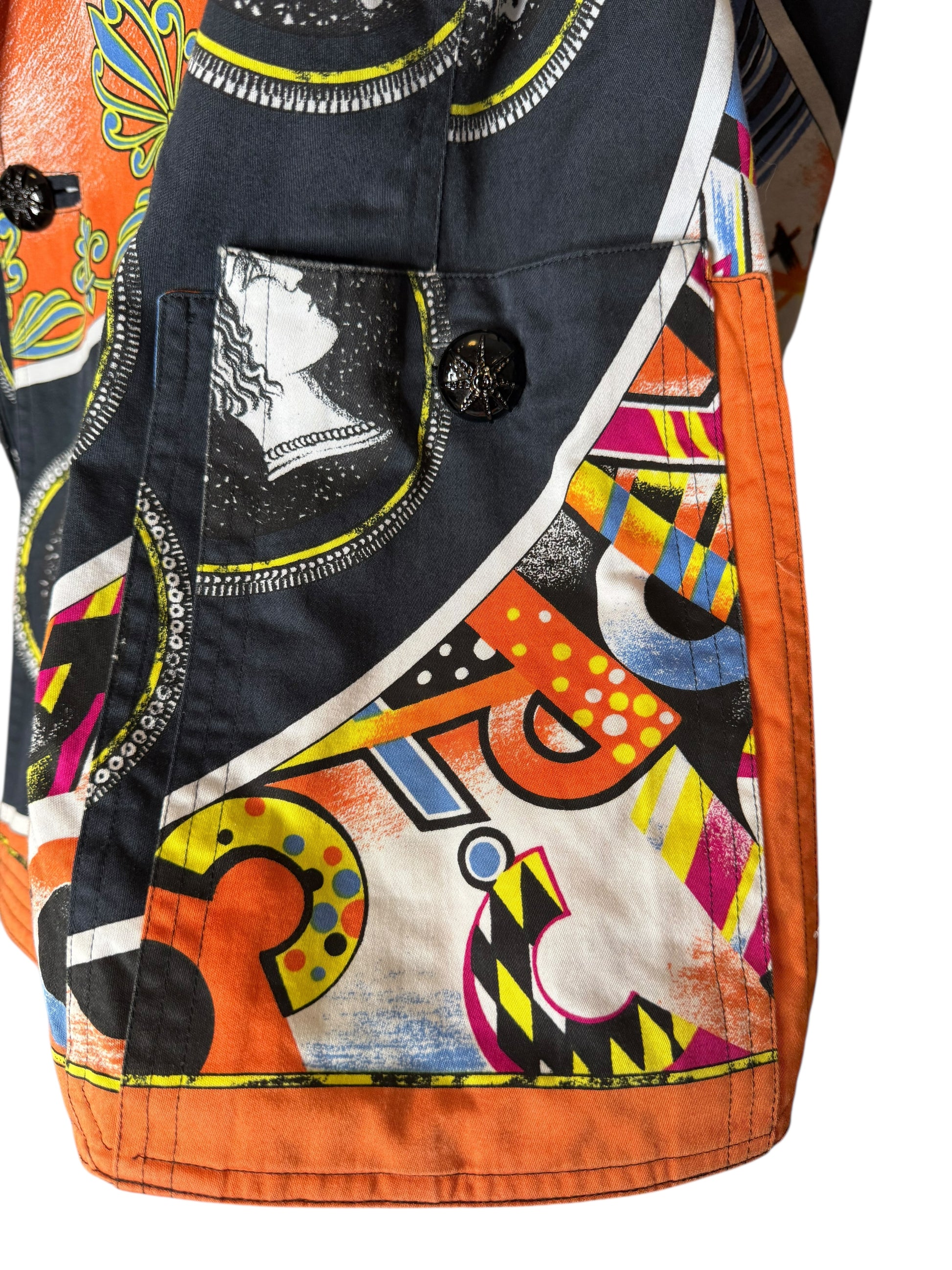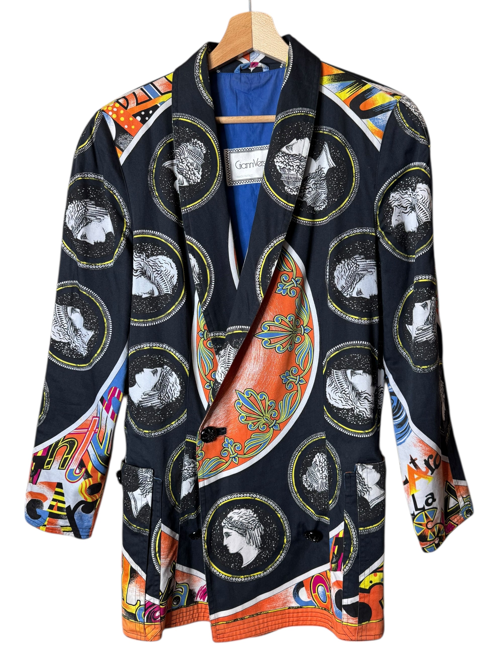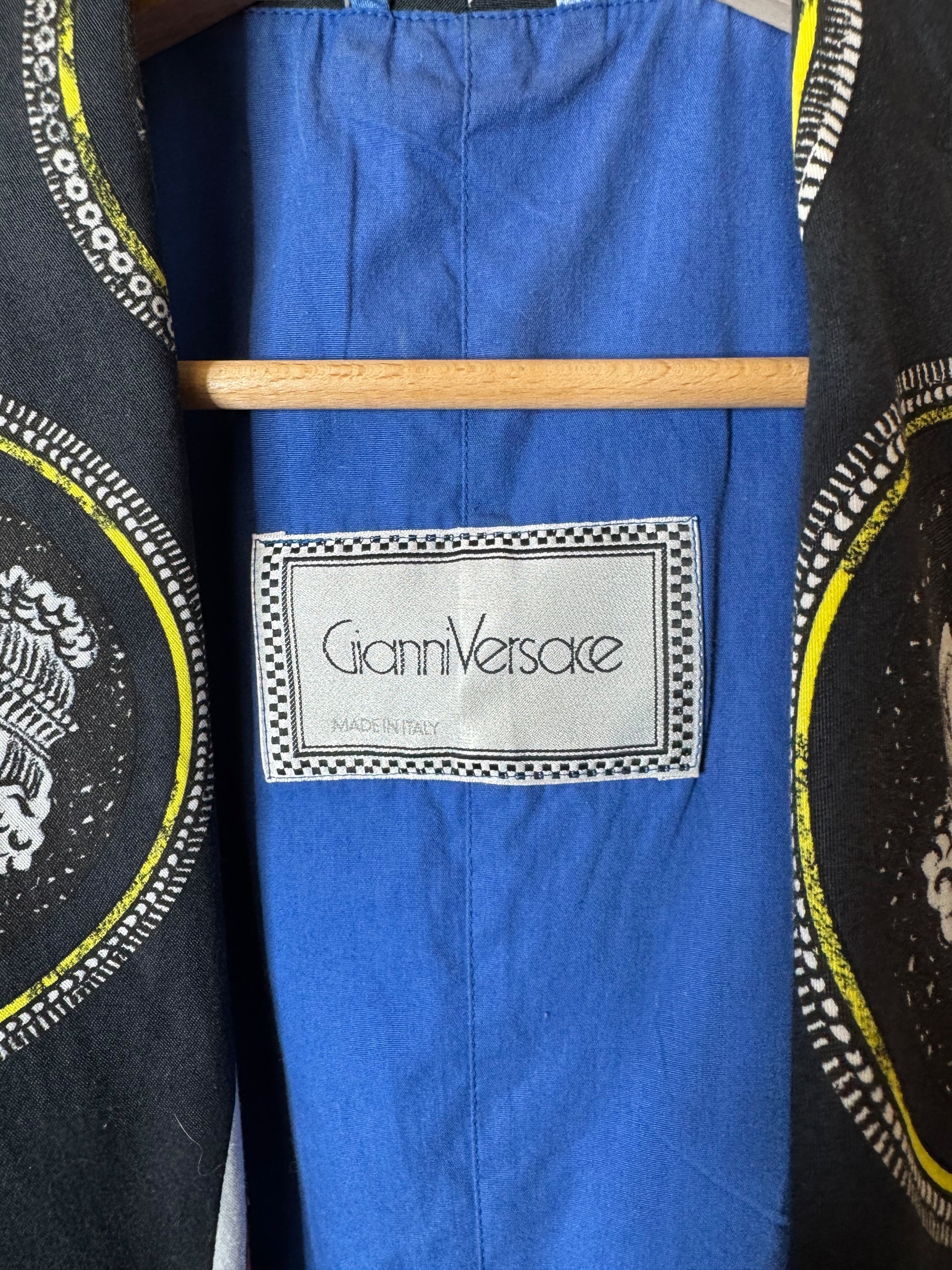 Rarissimo blazer originale Gianni Versace della collezione Primavera/Estate 1991, con stampa “Teatro La Scala” su base nera. Capo iconico da collezione, caratterizzato da motivi classici e grafica colorata su tutta la superficie. Realizzato in 100% cotone, con bottoni gioiello neri e interno foderato in cotone blu. Pezzo d’archivio Made in Italy, appartenente a una delle collezioni più riconoscibili di Gianni Versace.