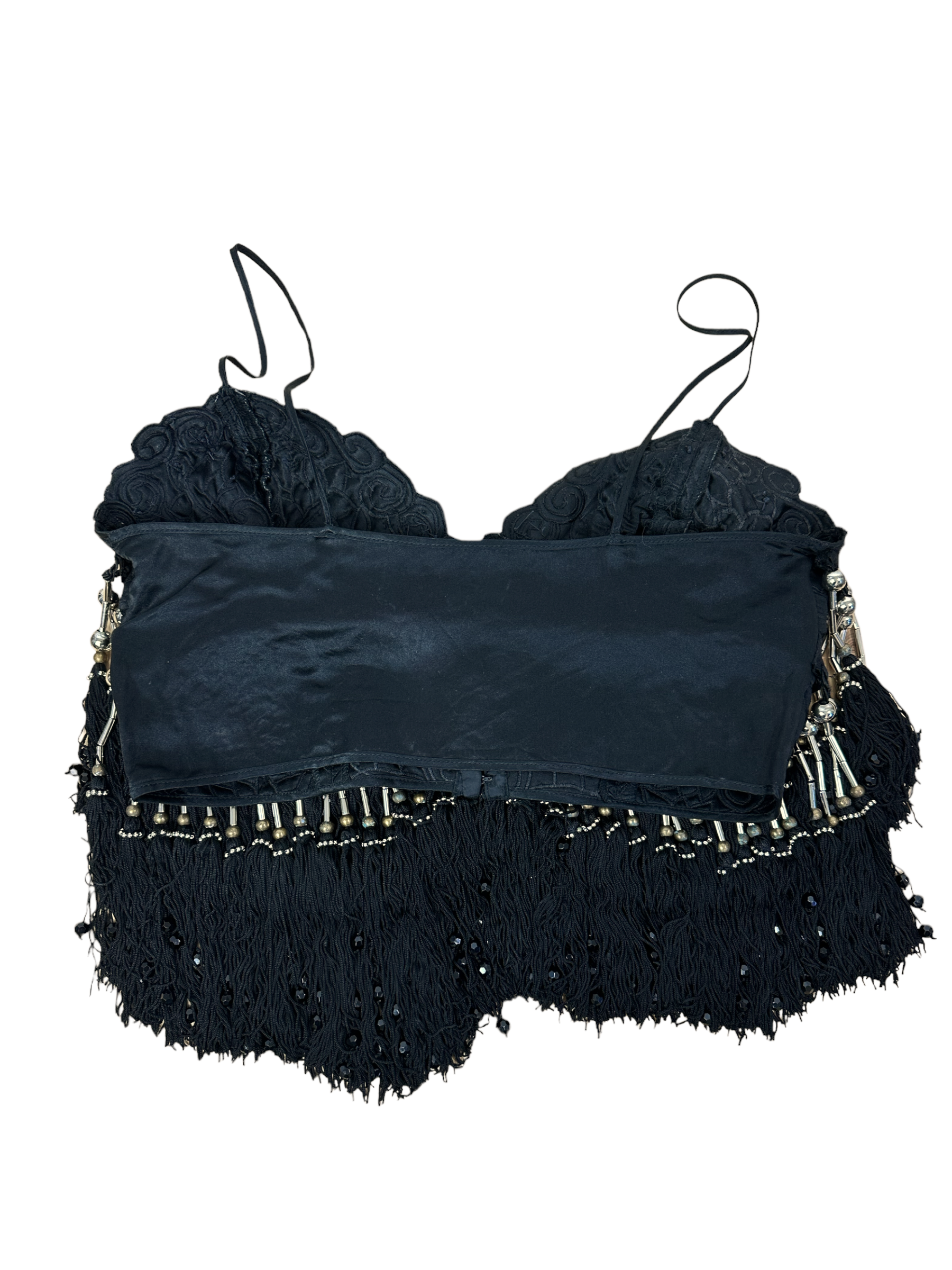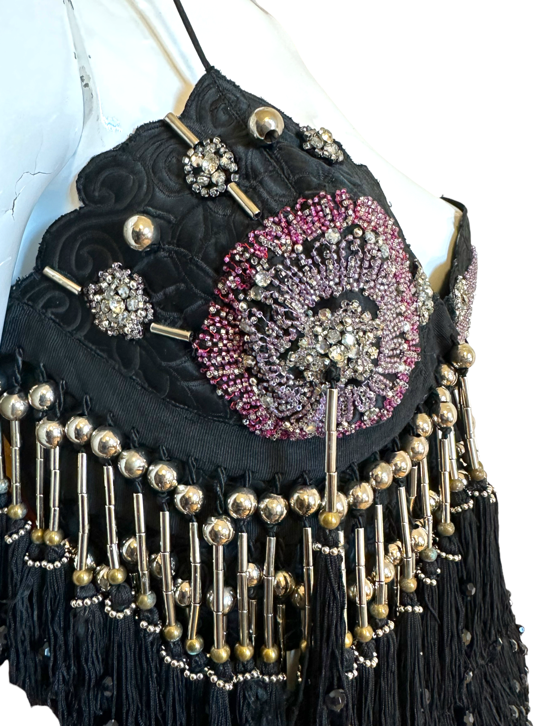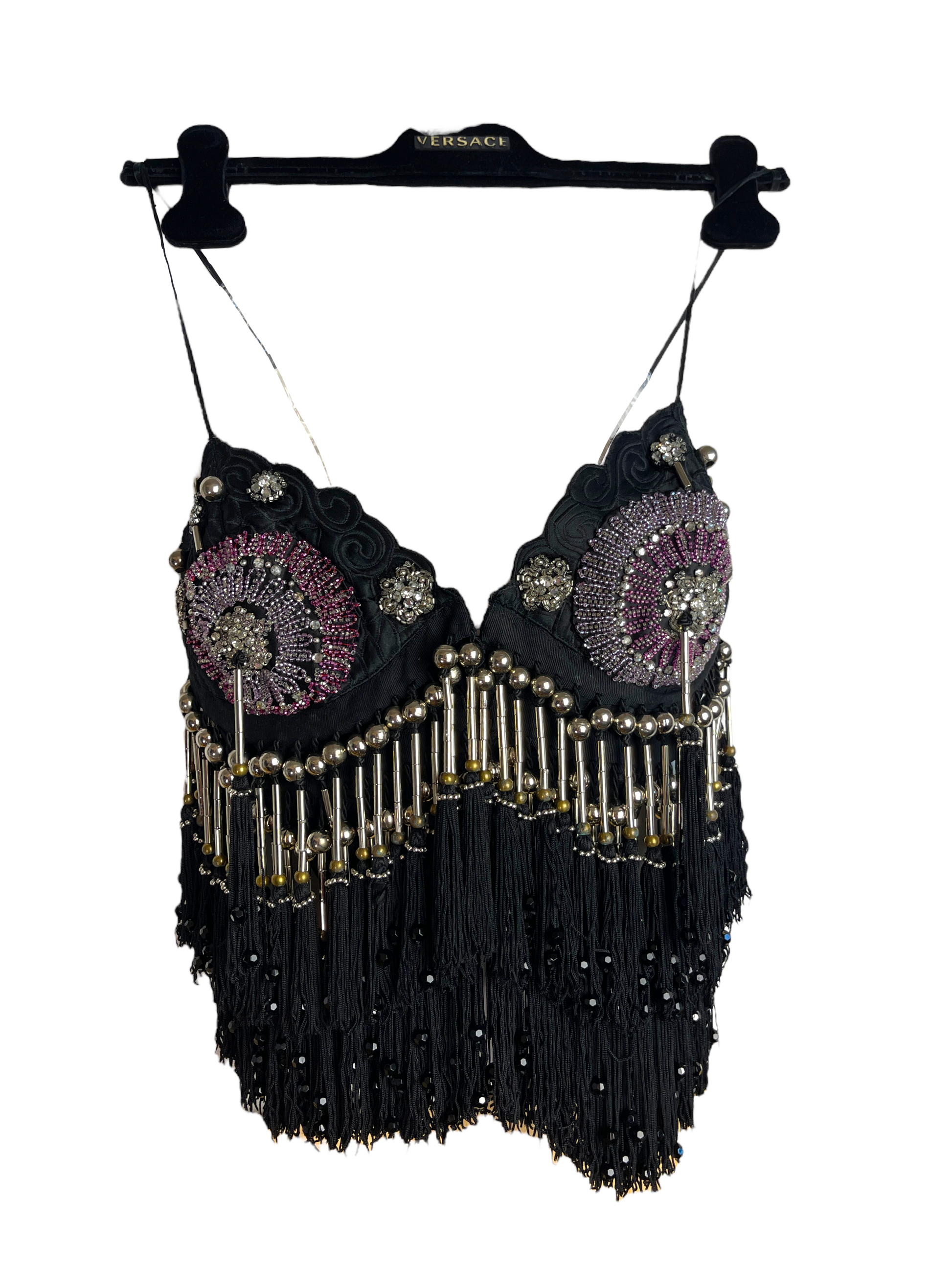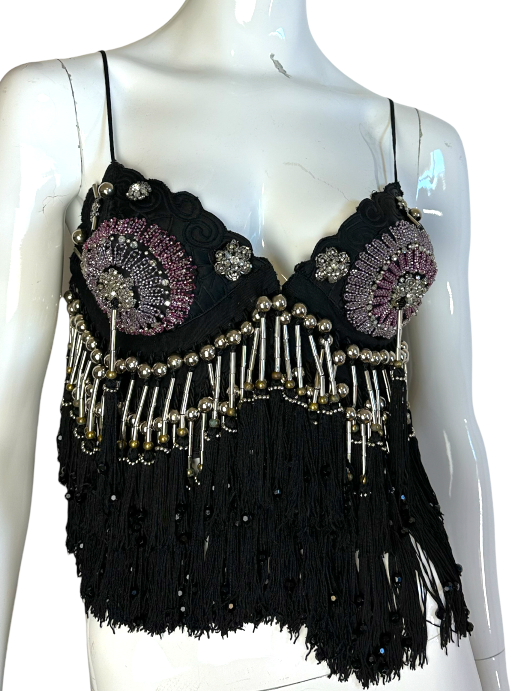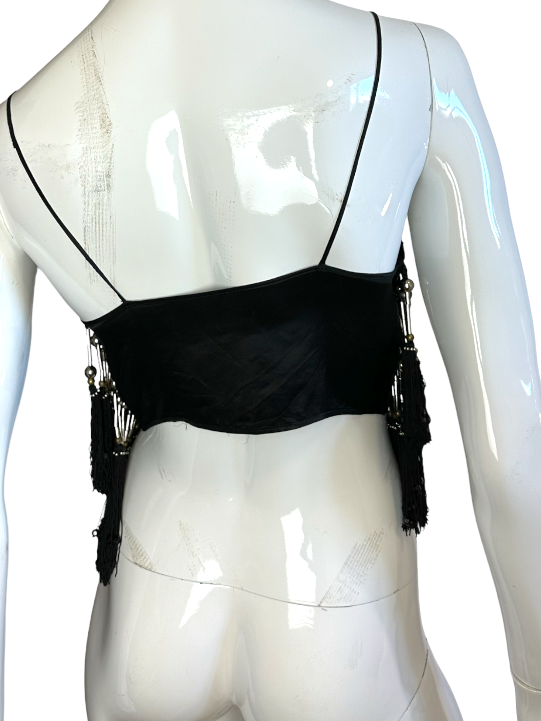 Gianni Versace crystal top. Top vintage in seta nera con lavorazione ricamata tono su tono, ricamo con perline e frange pendenti con inserti in metallo. Chiusura con ganci sul davanti. Potrebbe presentare dei lievi