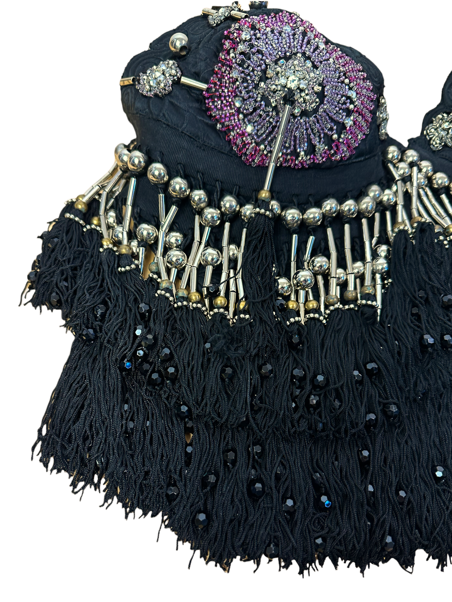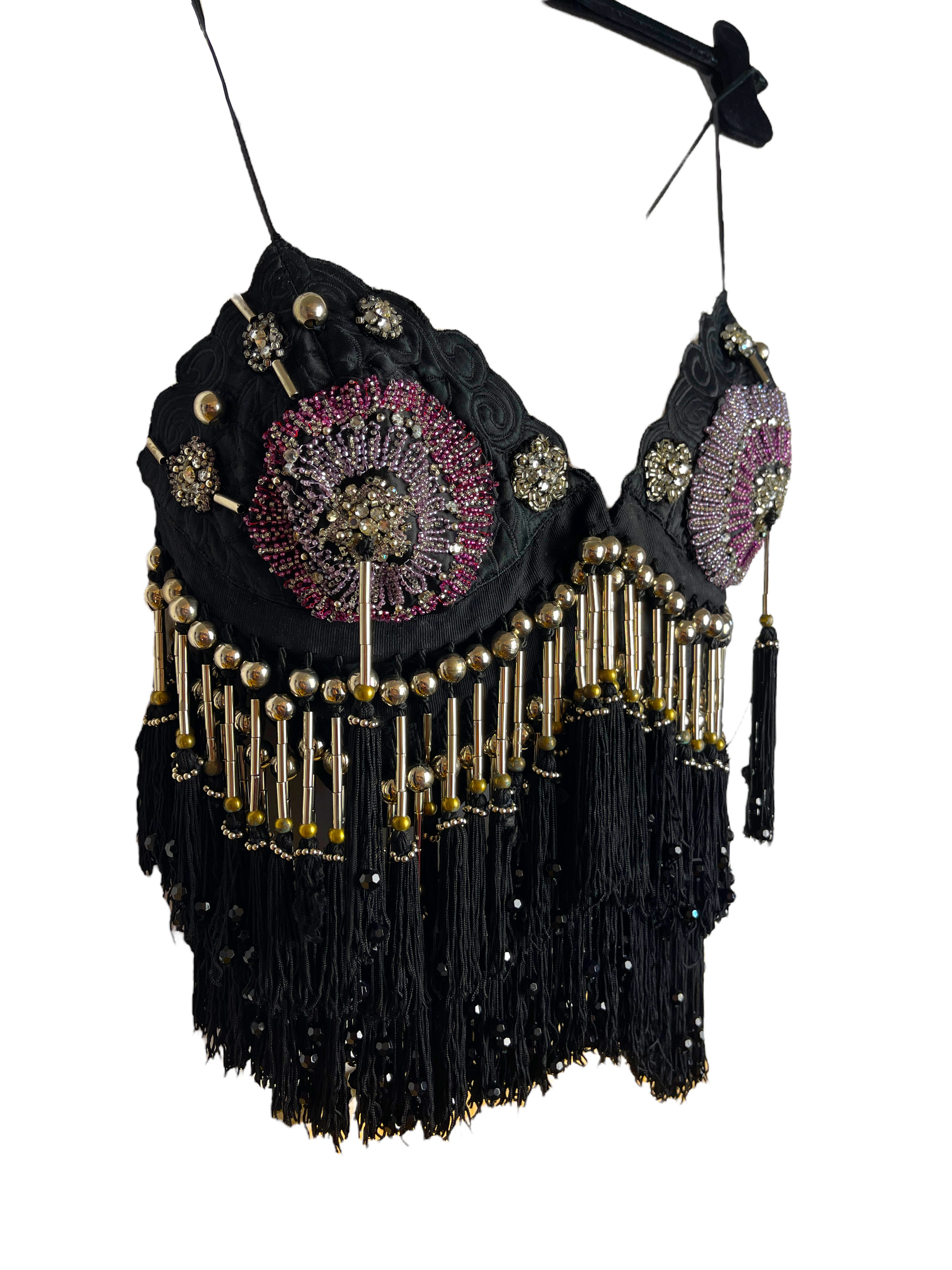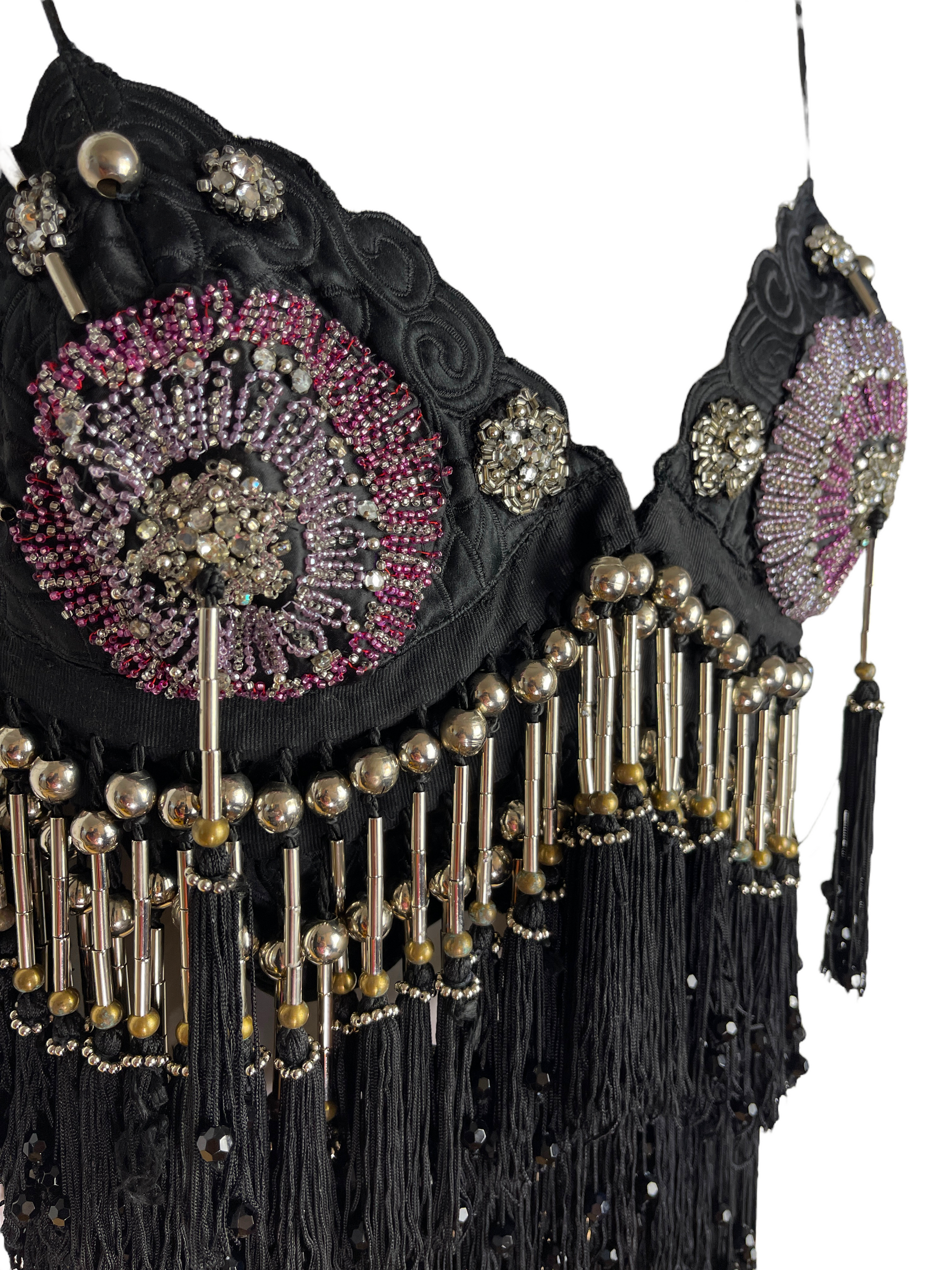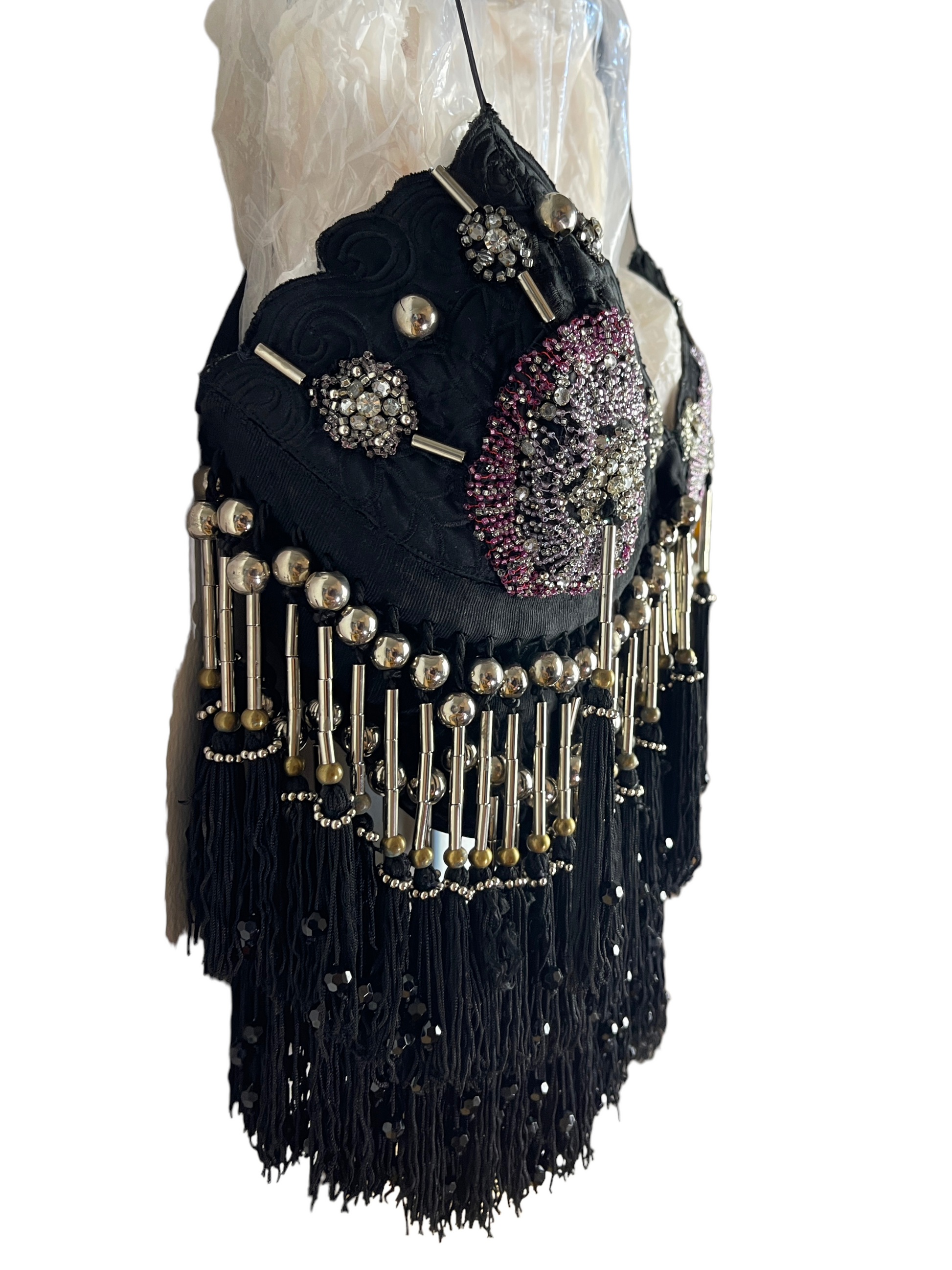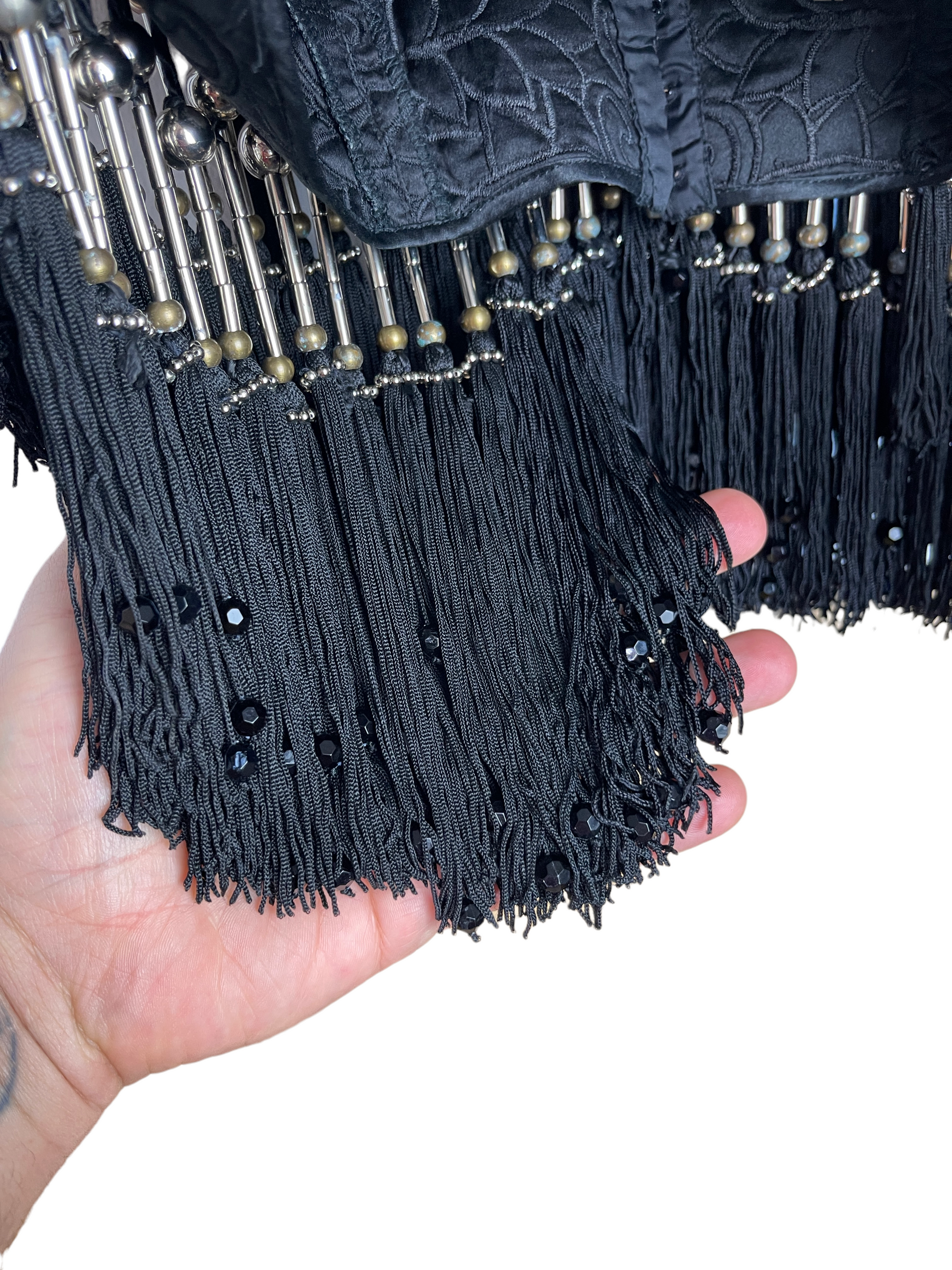 Gianni Versace crystal top. Top vintage in seta nera con lavorazione ricamata tono su tono, ricamo con perline e frange pendenti con inserti in metallo. Chiusura con ganci sul davanti. Potrebbe presentare dei lievi