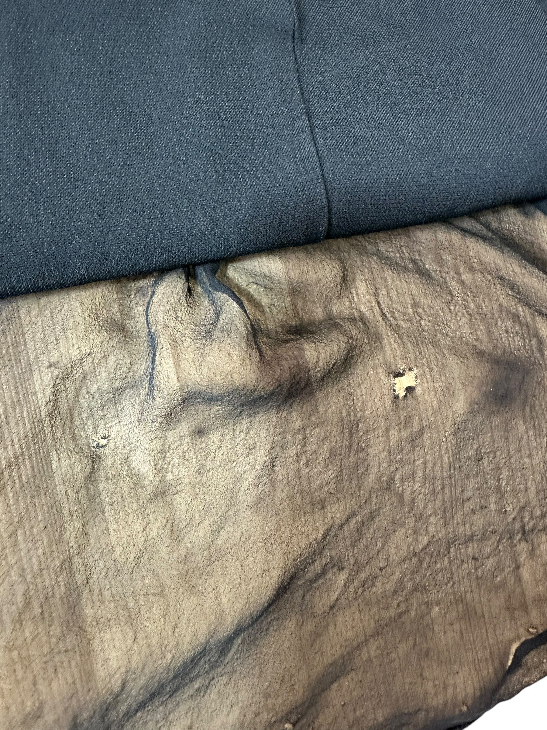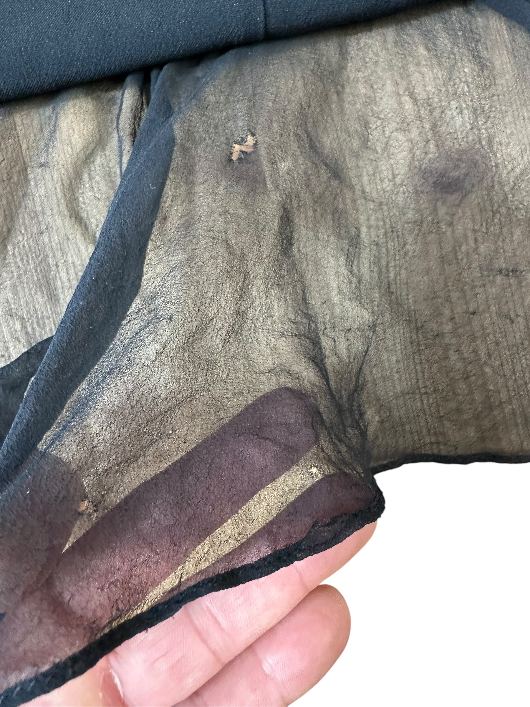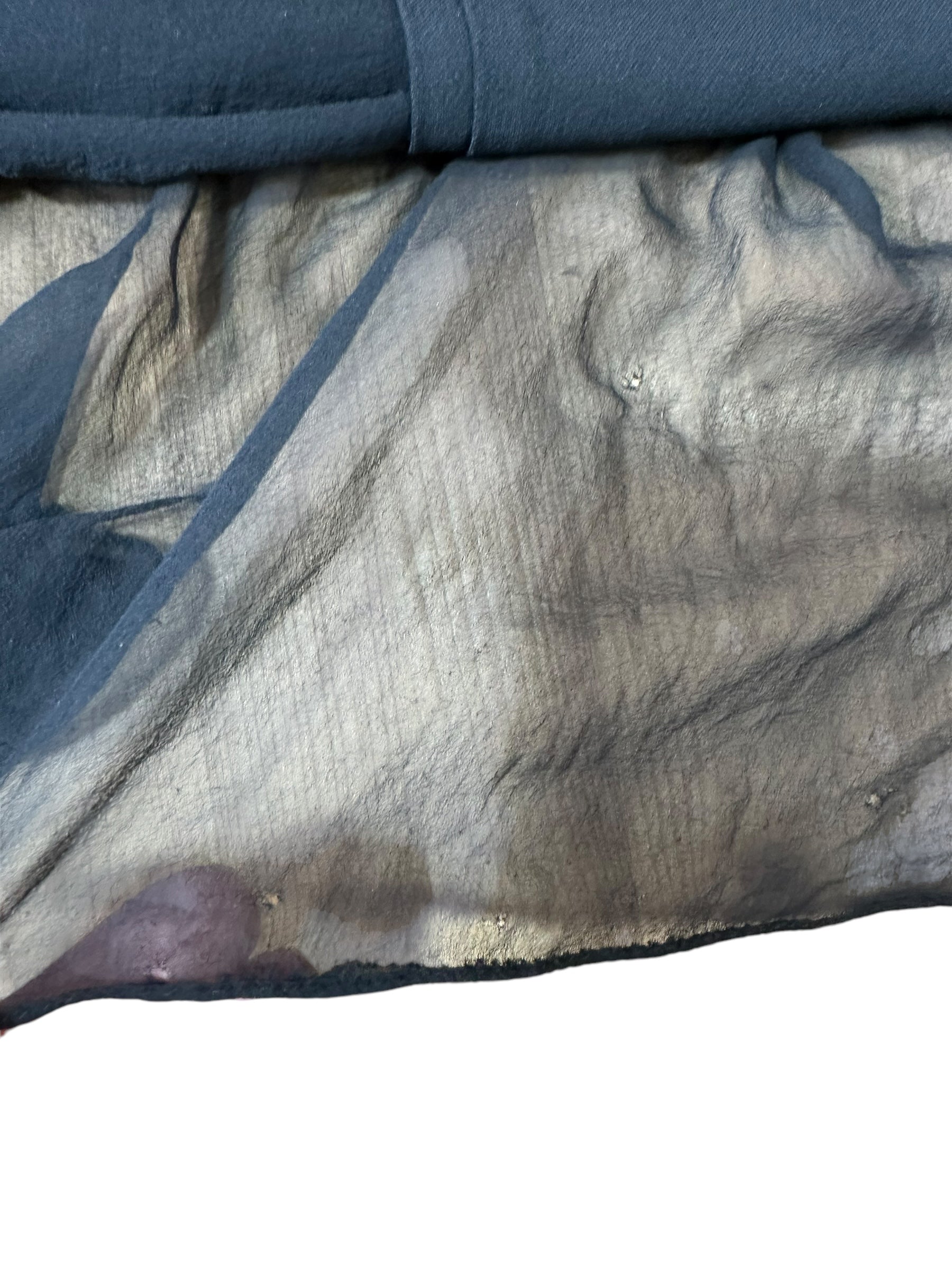 Il capo si sviluppa con un gioco di sovrapposizioni: la parte sottostante è realizzata in tessuto opaco, mentre lo strato superiore in chiffon semitrasparente blu notte conferisce leggerezza e movimento alla silhouette.