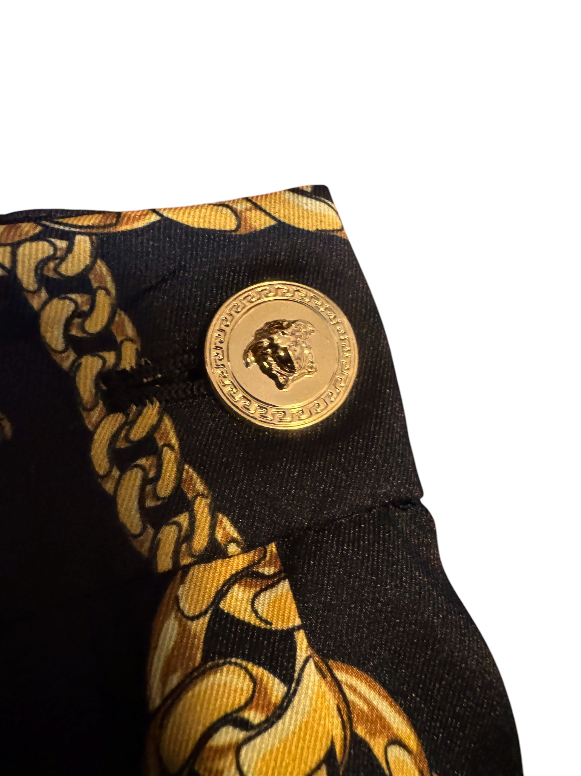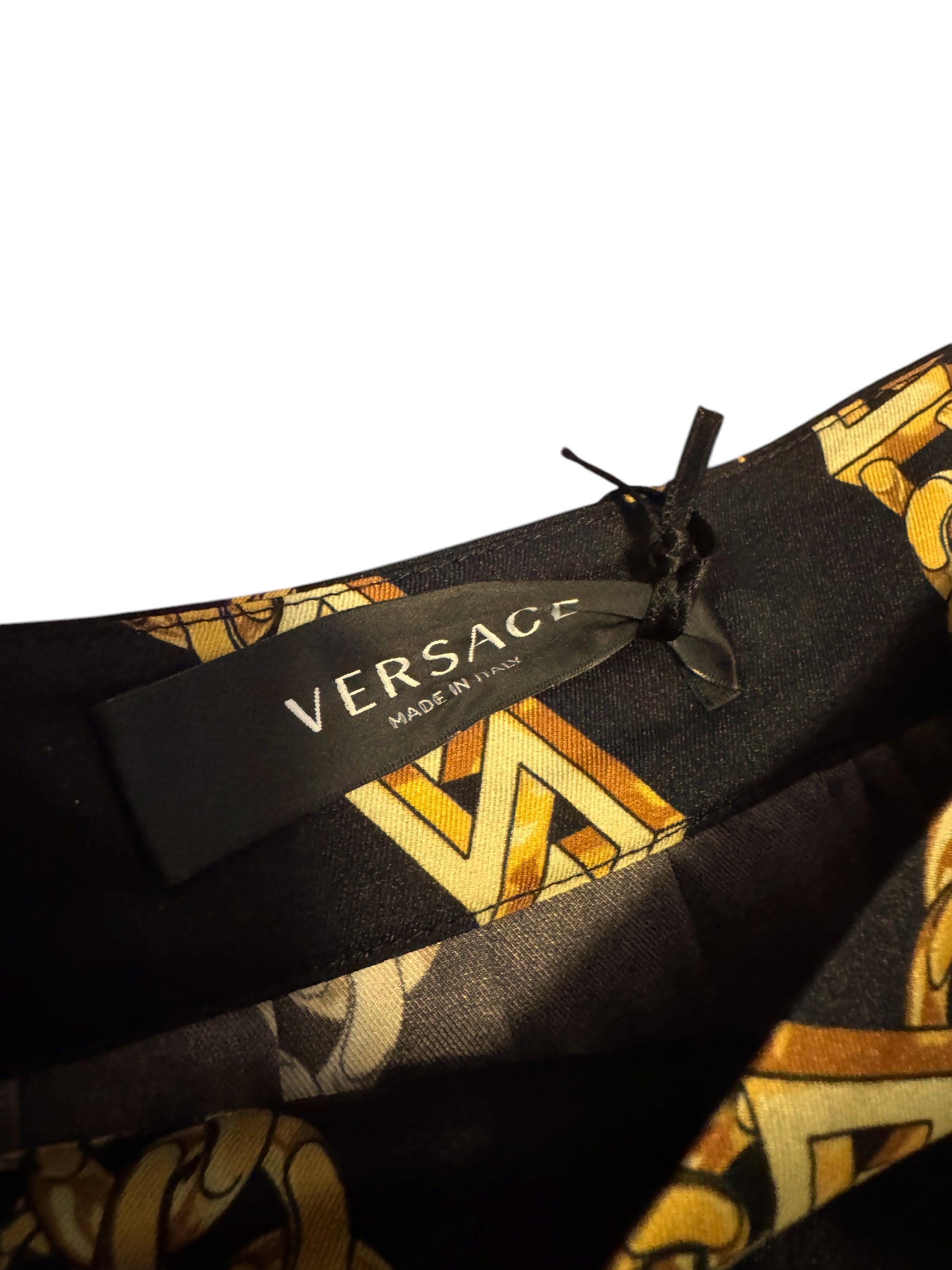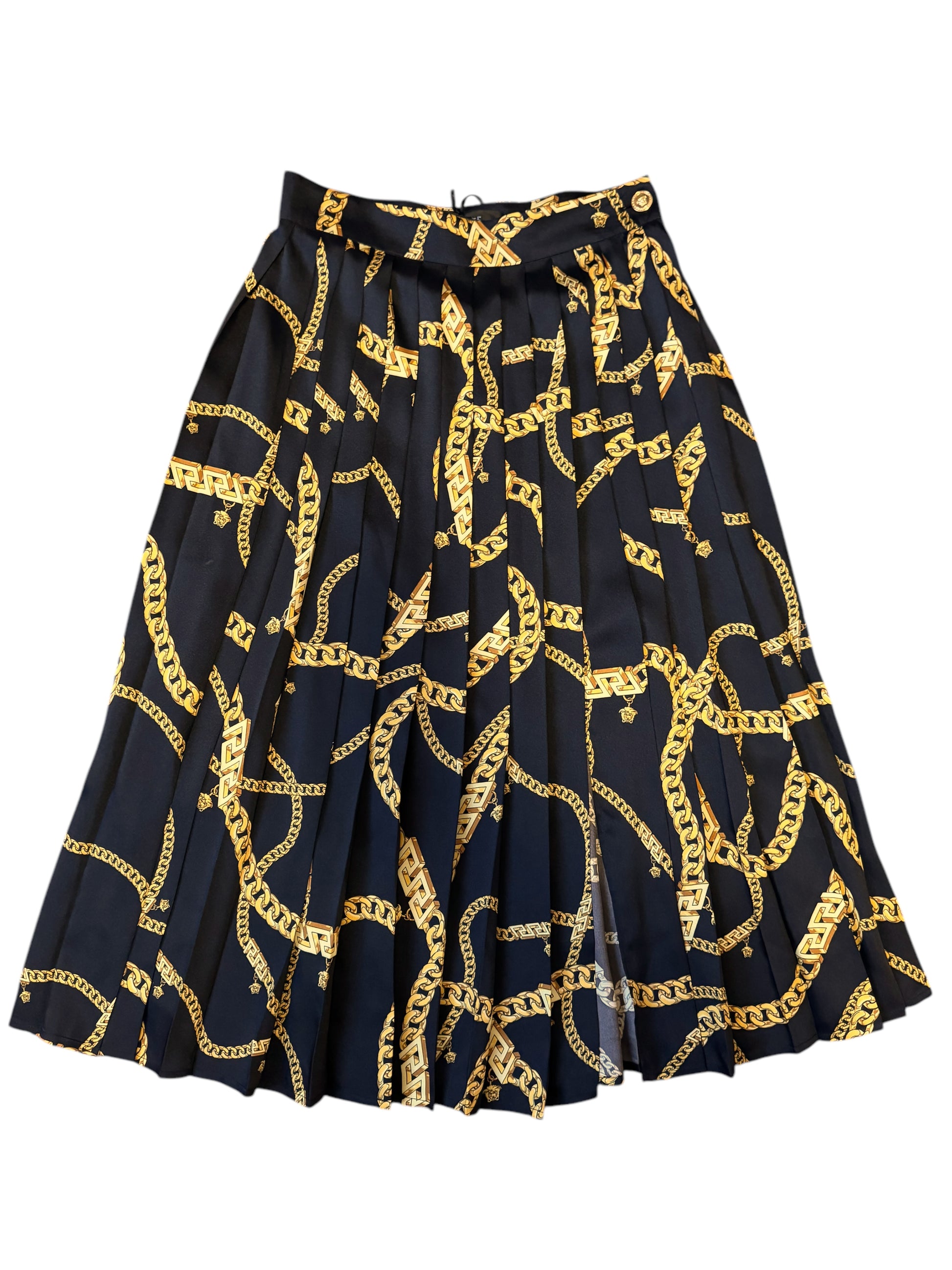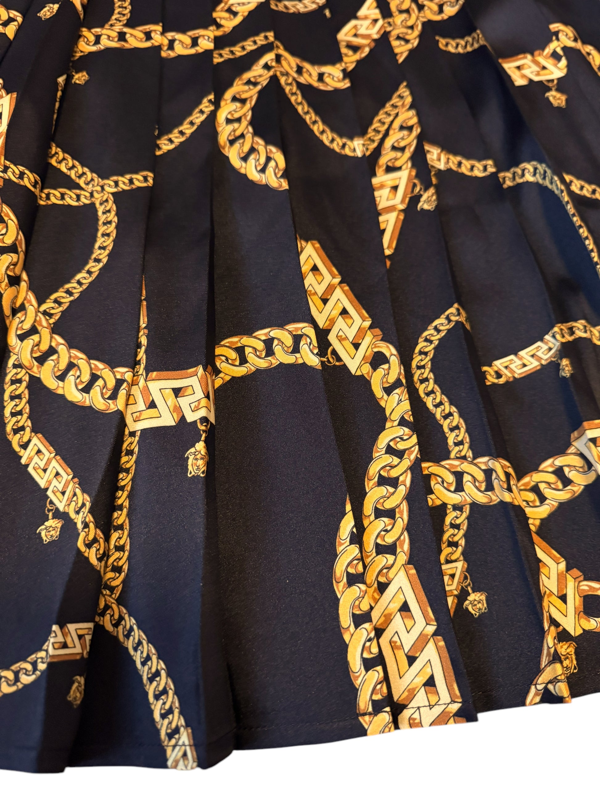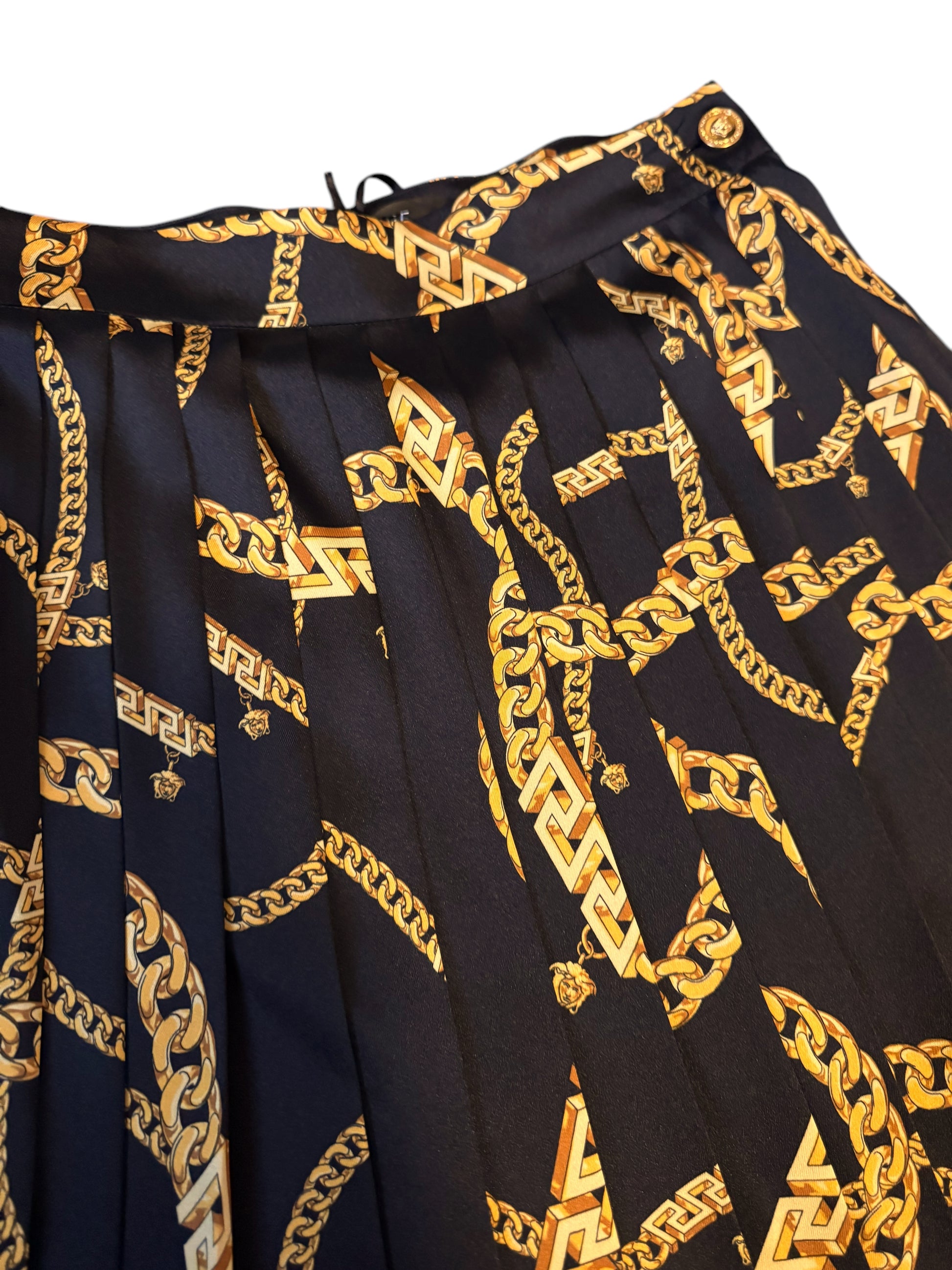 • Gonna a pieghe con stampa a catene dorate, un classico del design Versace.