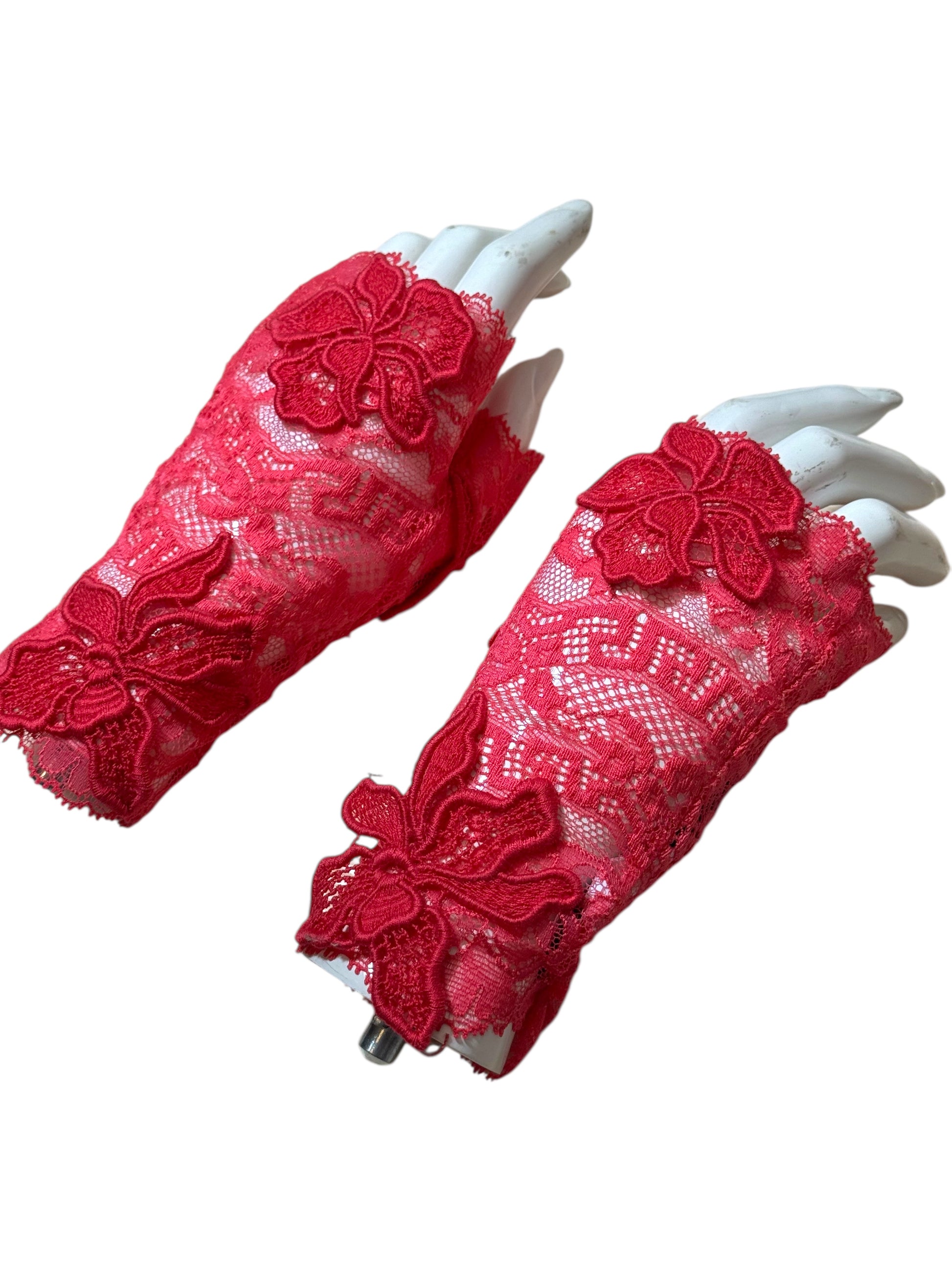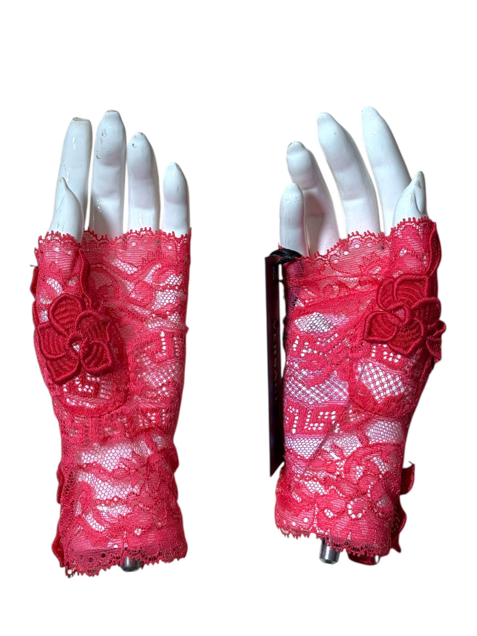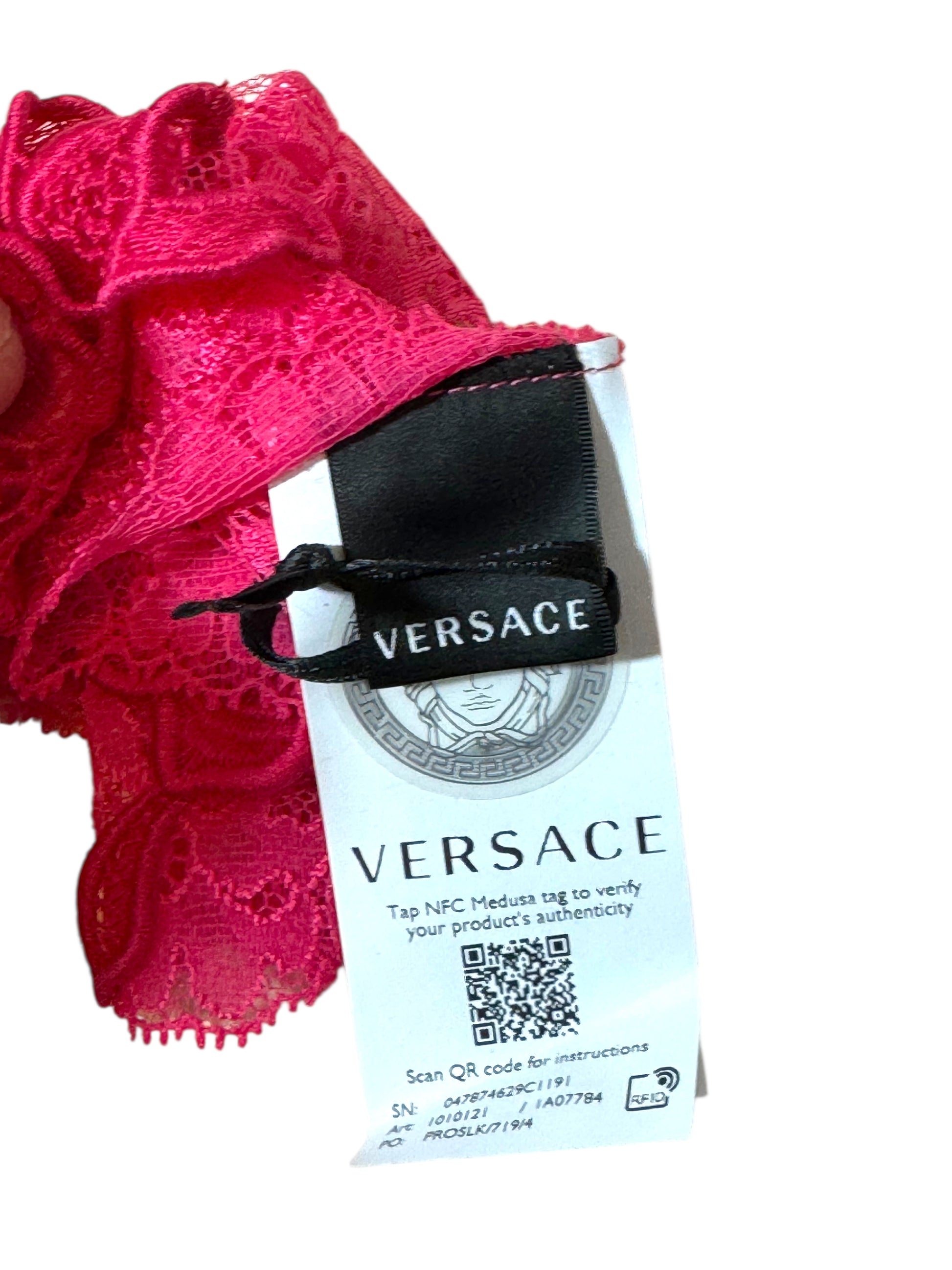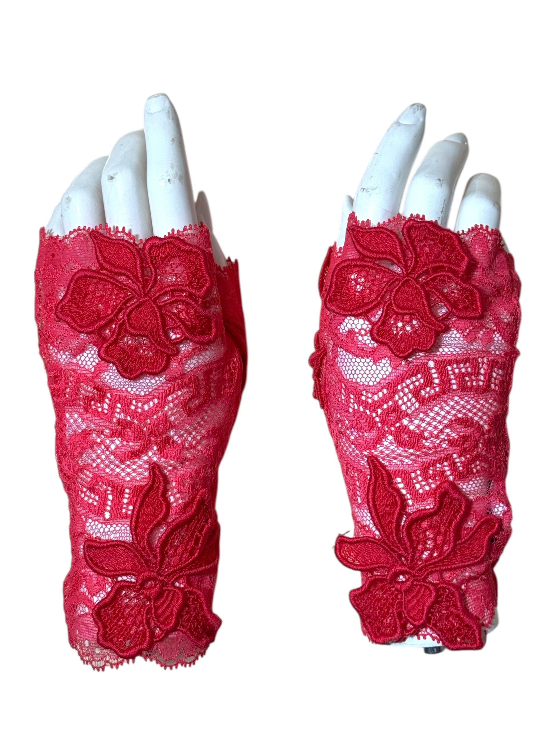 Coppia di eleganti guanti firmati Versace, realizzati in pizzo fucsia con ricamo floreale tono su tono. Modello senza dita, perfetti per look da cerimonia o outfit di forte impatto.