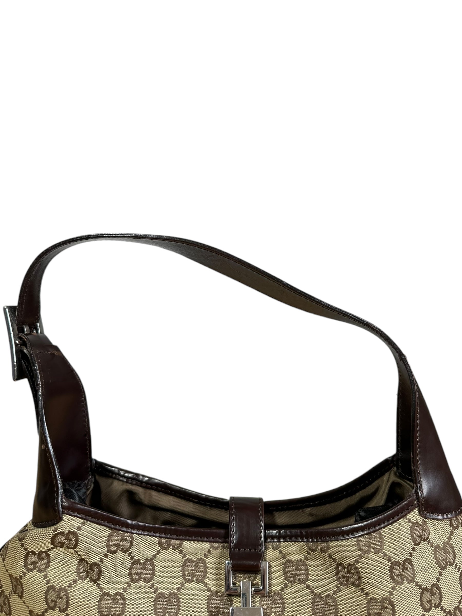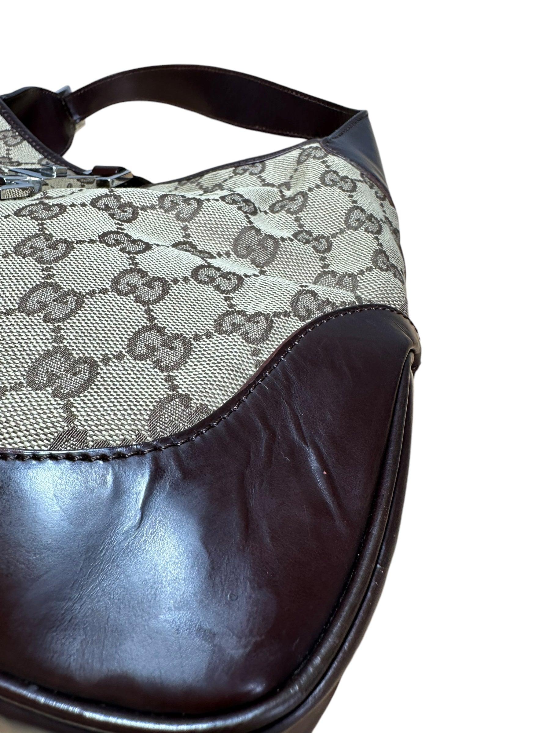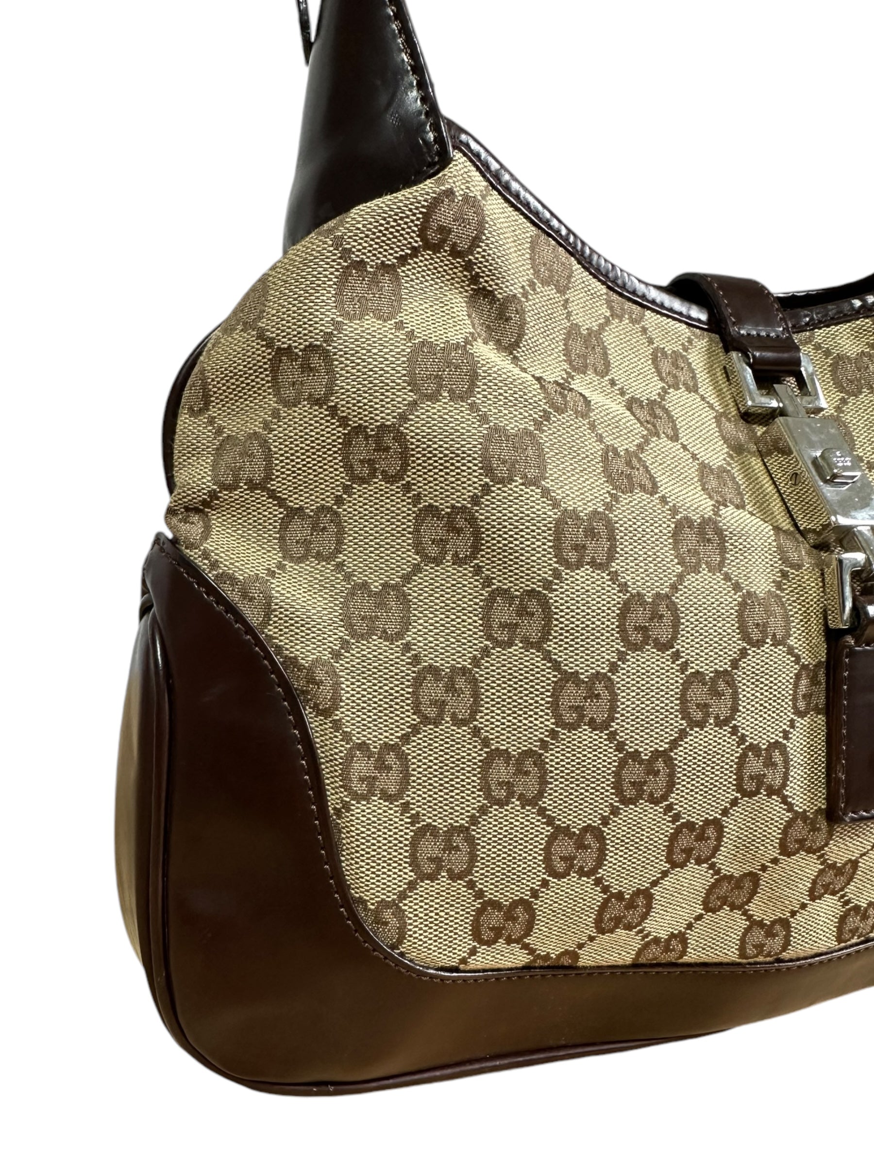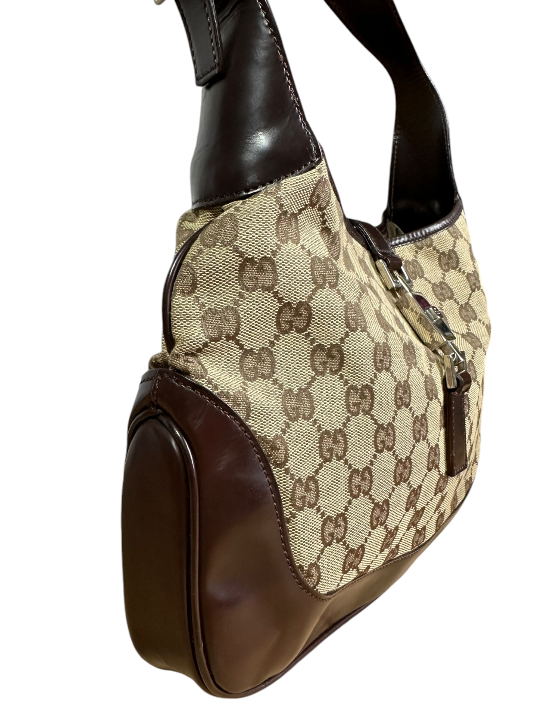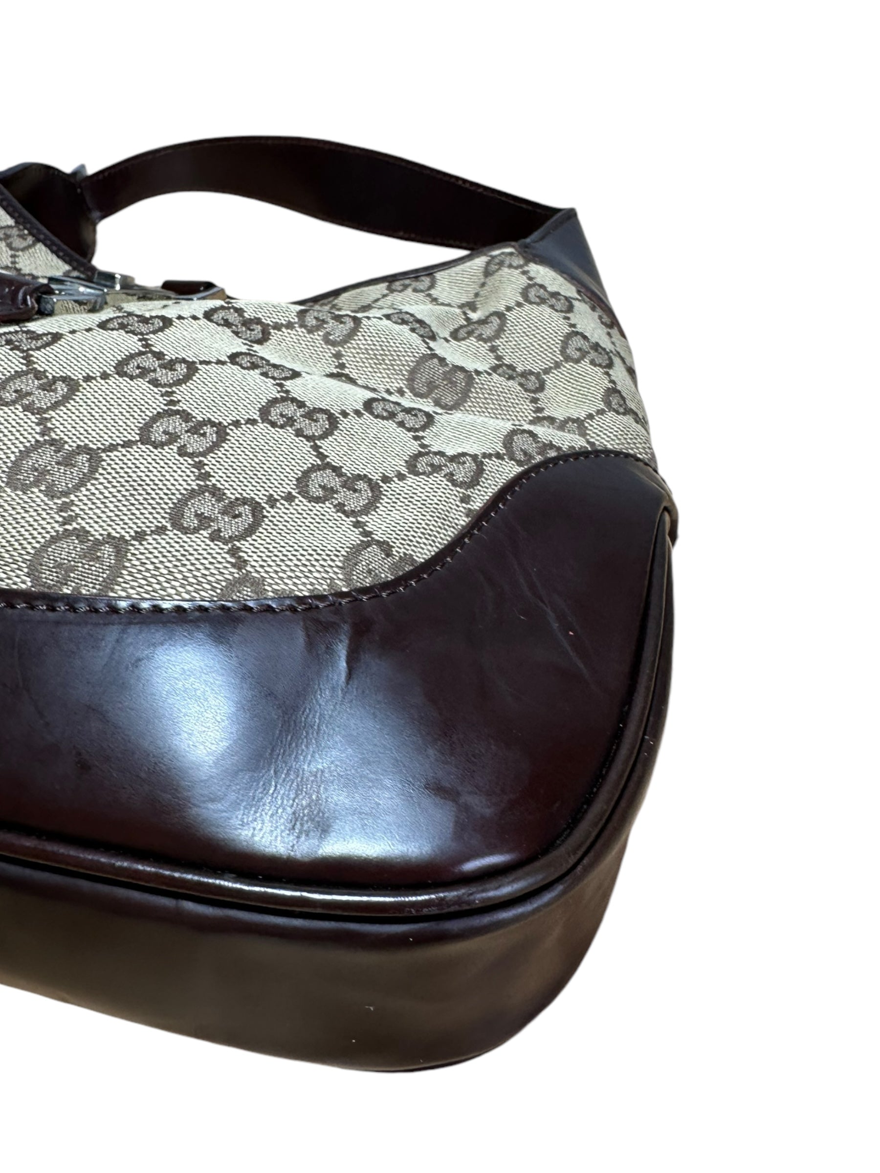 Gucci borsa Jackie vintage in tela monogram beige con manico e profili in pelle color testa di moro. Hardware in metallo e chiusura con gancio automatico, interno foderato con taschino. Presenta delle piccole grinze su un angolo e un micro segno sulla pelle (vedi foto). Viene spedita con dust bag.