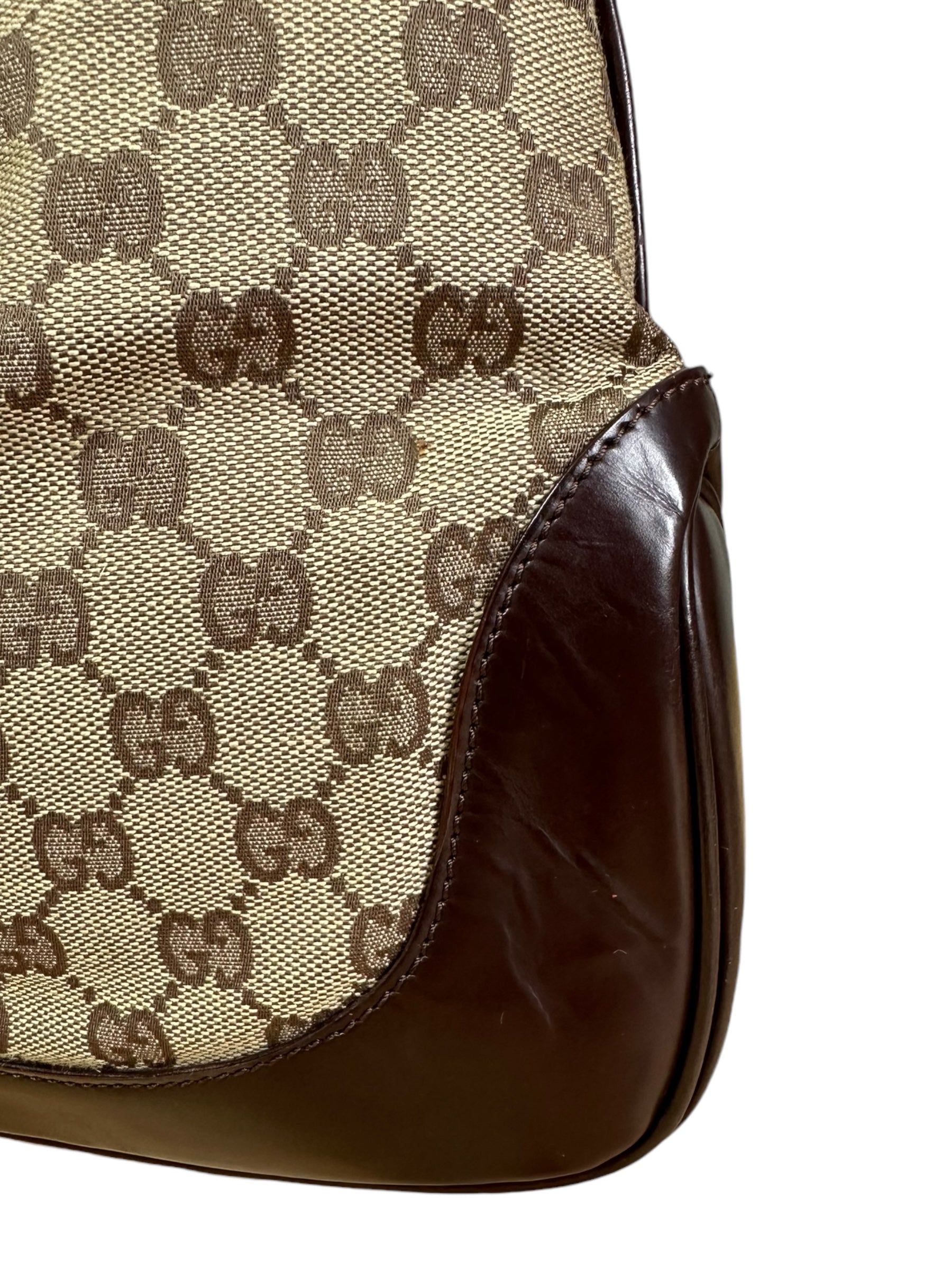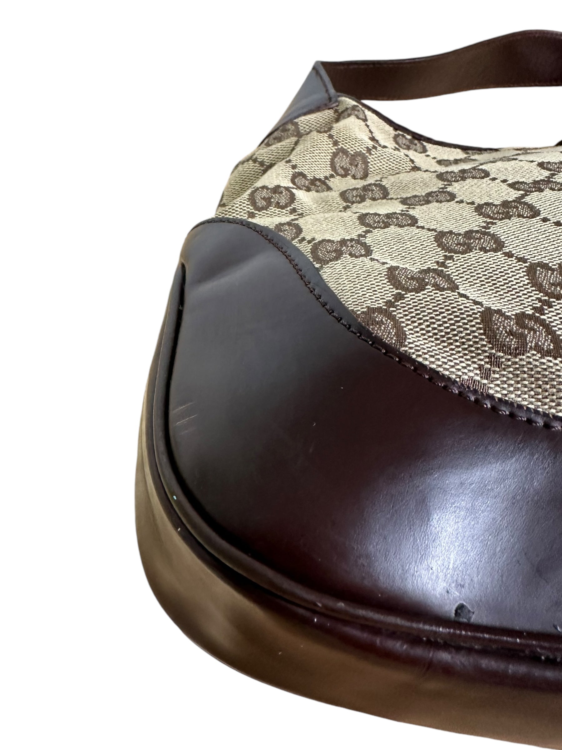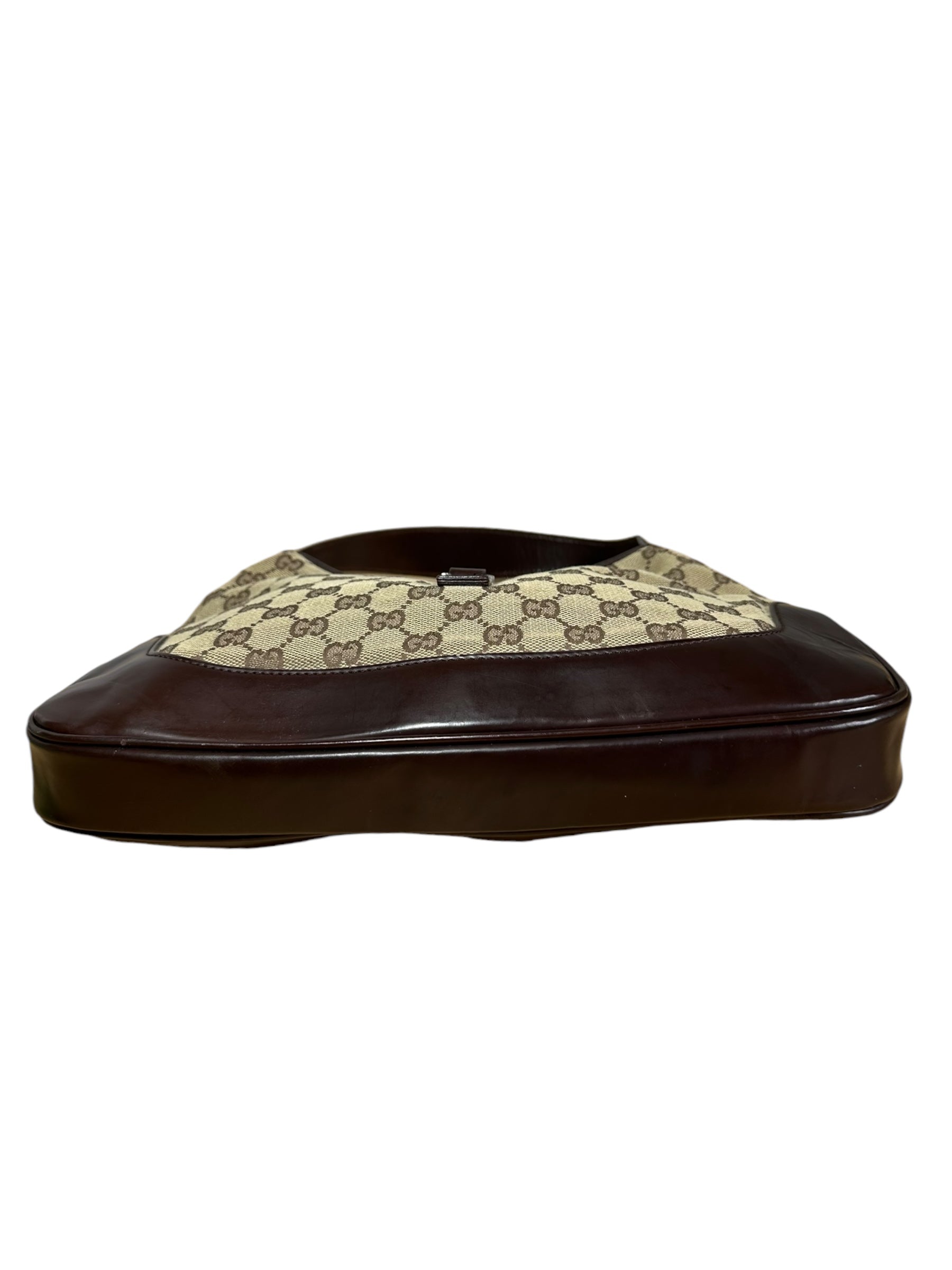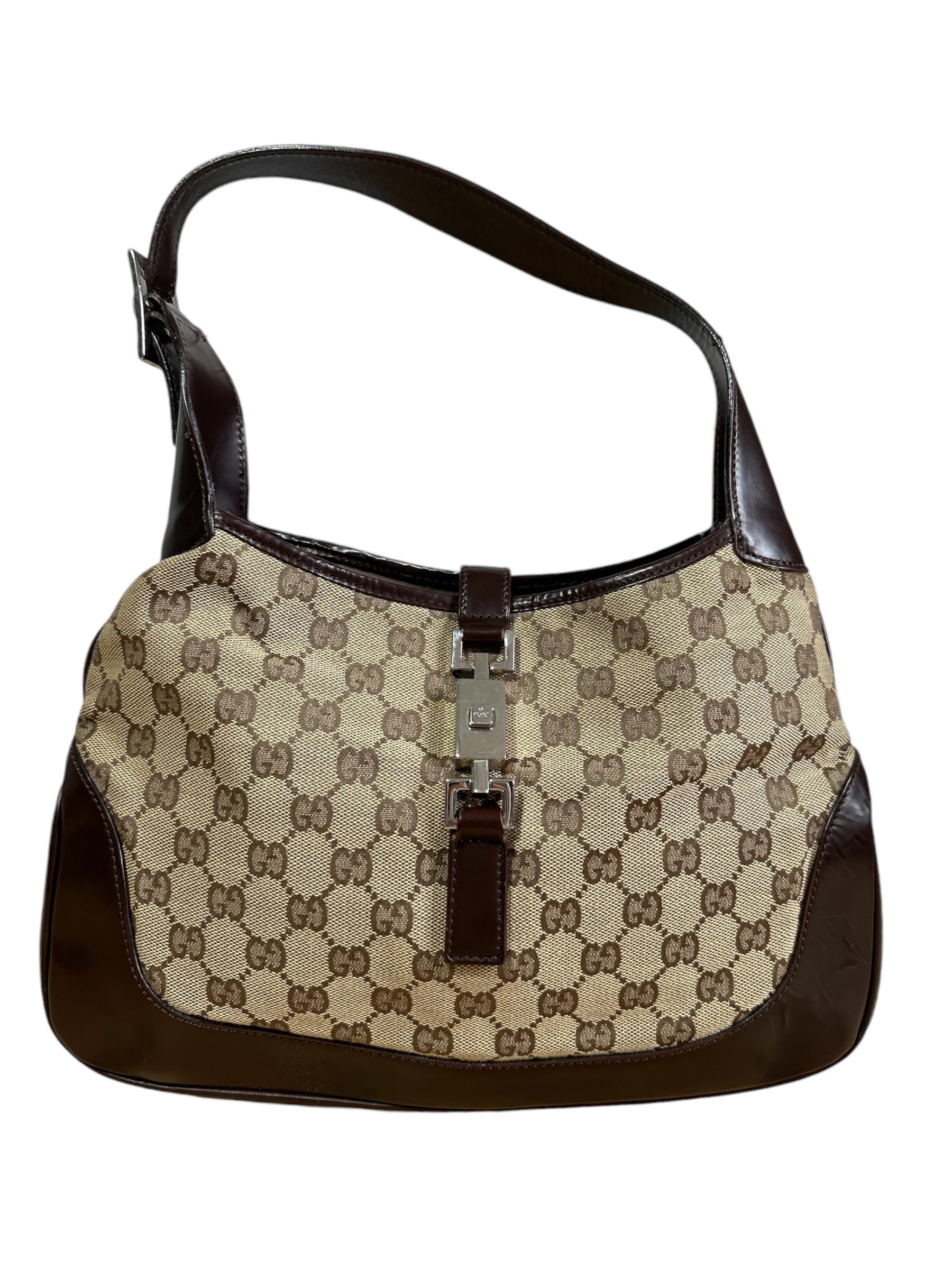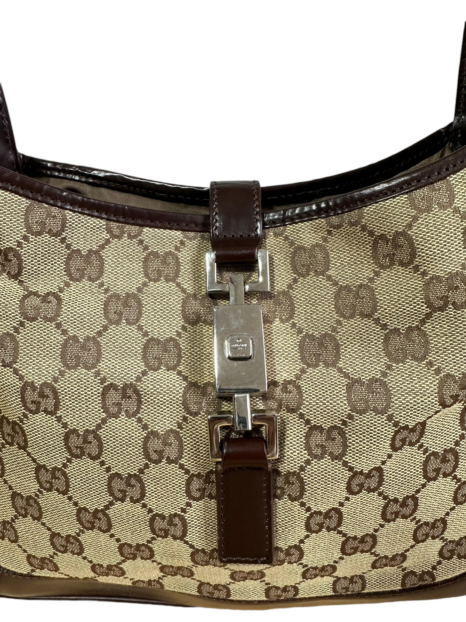 Gucci borsa Jackie vintage in tela monogram beige con manico e profili in pelle color testa di moro. Hardware in metallo e chiusura con gancio automatico, interno foderato con taschino. Presenta delle piccole grinze su un angolo e un micro segno sulla pelle (vedi foto). Viene spedita con dust bag.