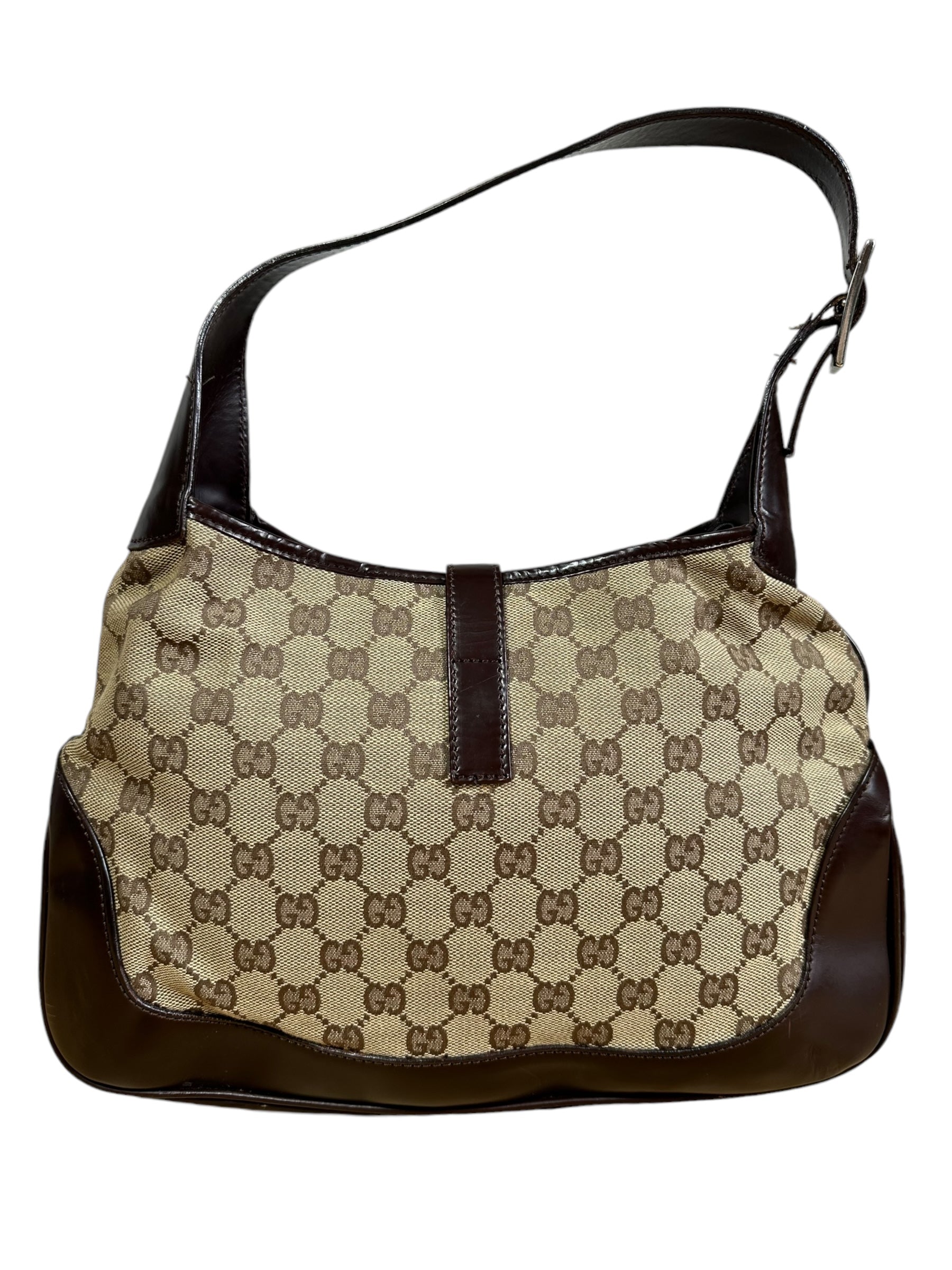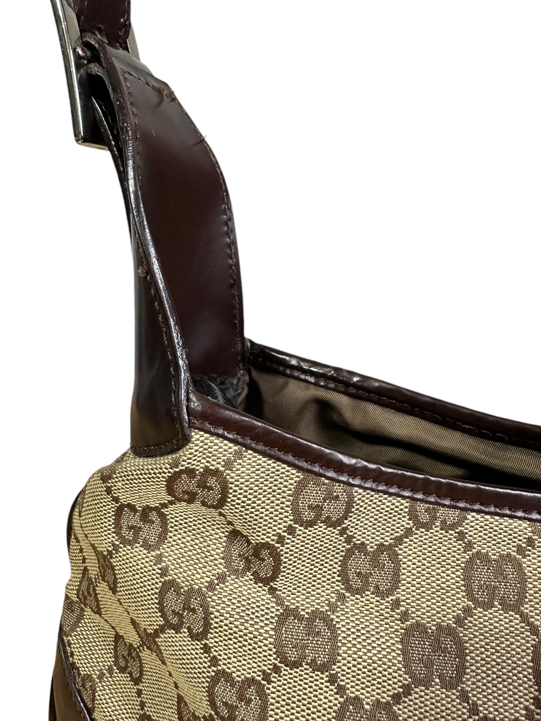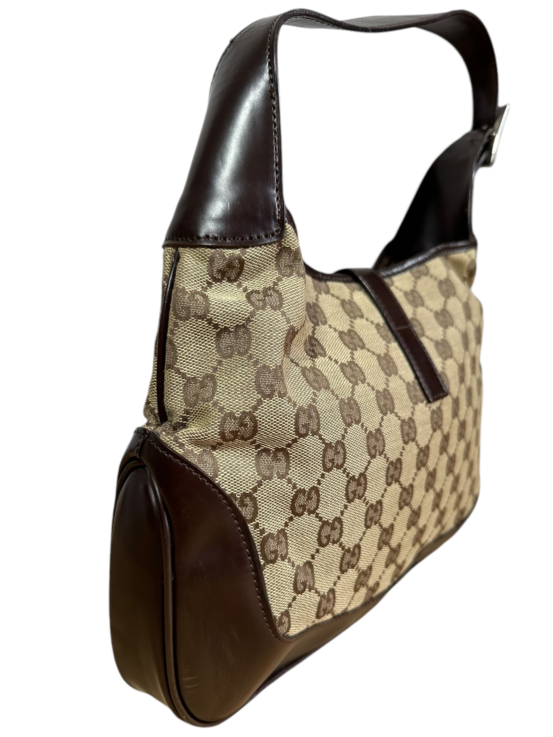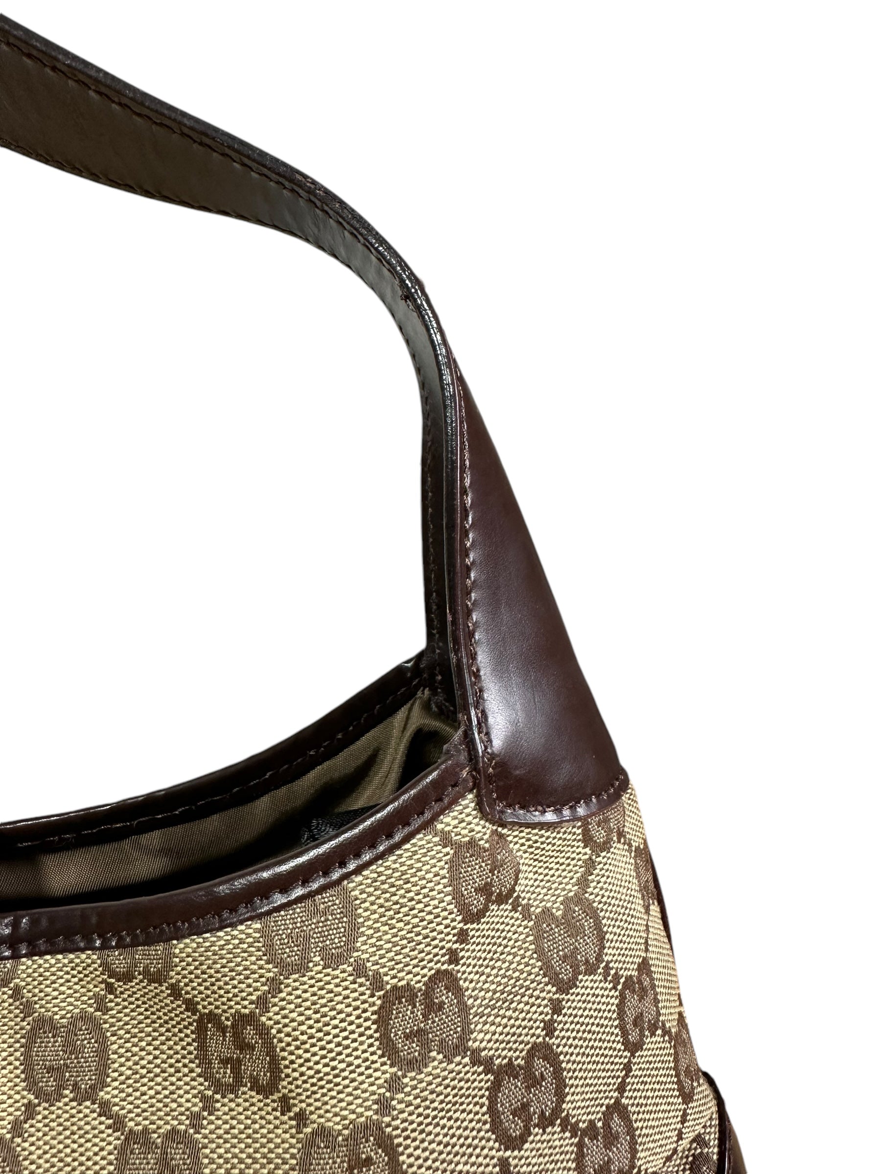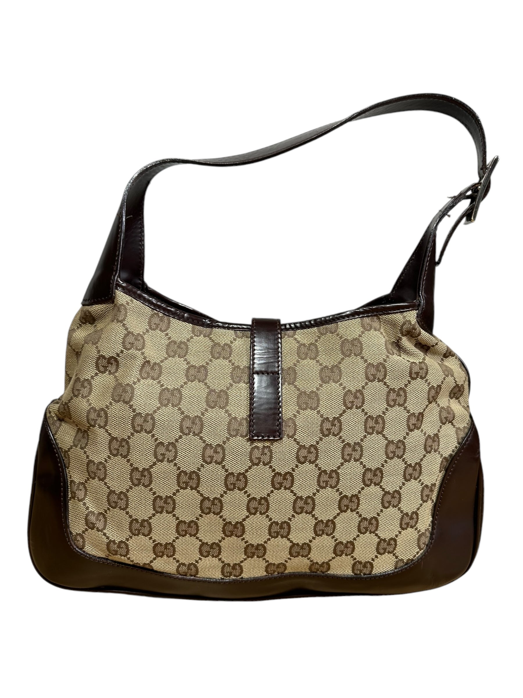 Gucci borsa Jackie vintage in tela monogram beige con manico e profili in pelle color testa di moro. Hardware in metallo e chiusura con gancio automatico, interno foderato con taschino. Presenta delle piccole grinze su un angolo e un micro segno sulla pelle (vedi foto). Viene spedita con dust bag.