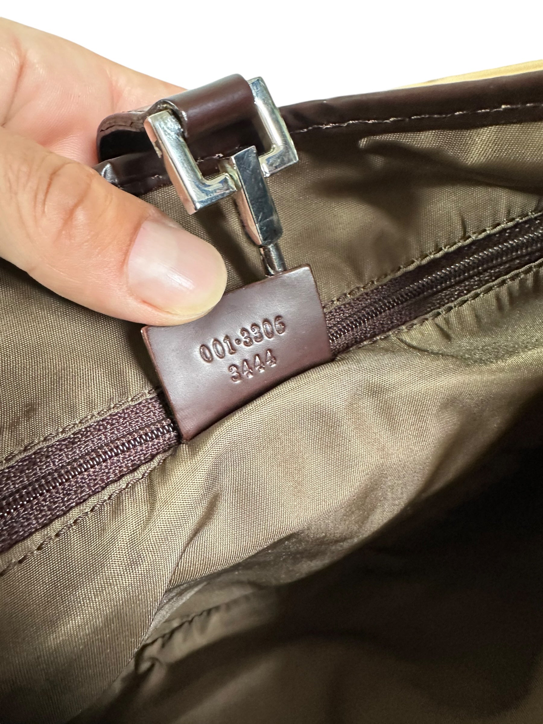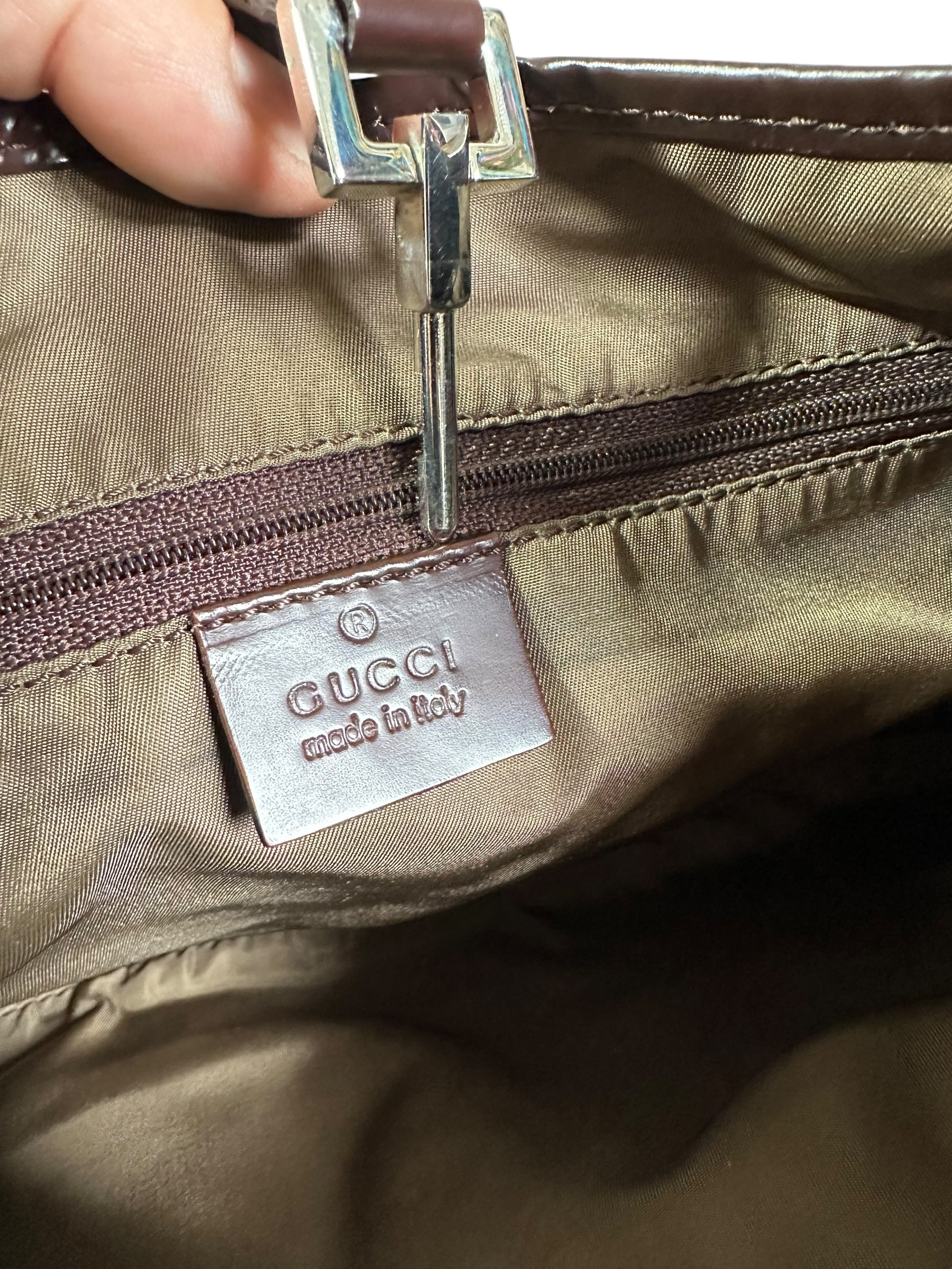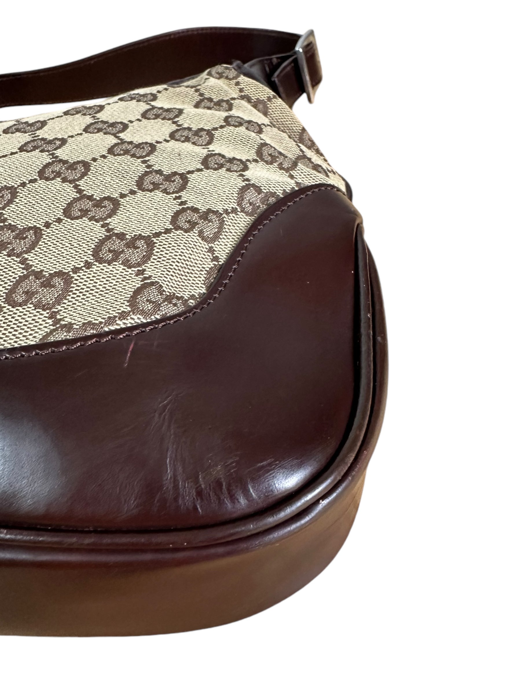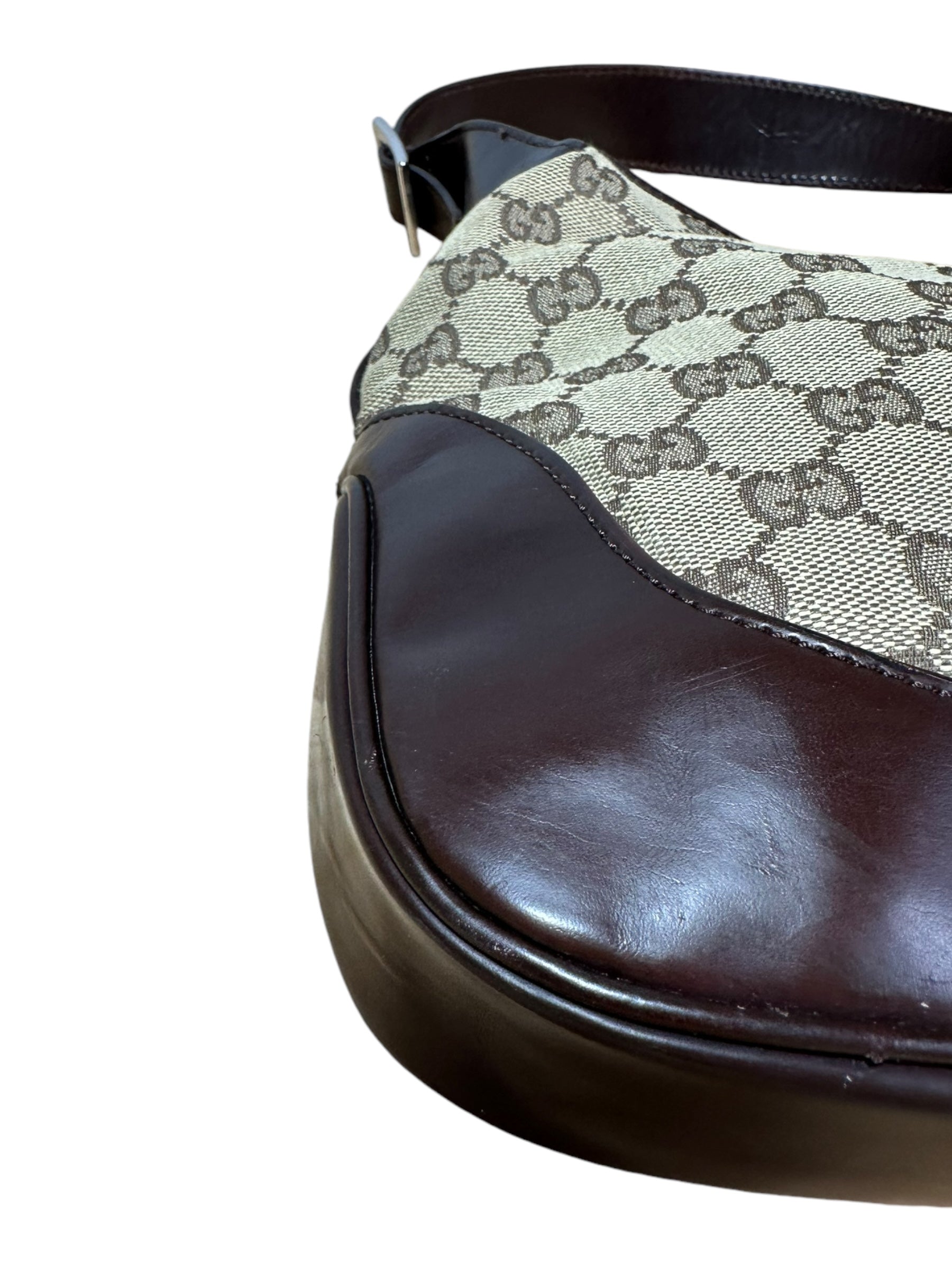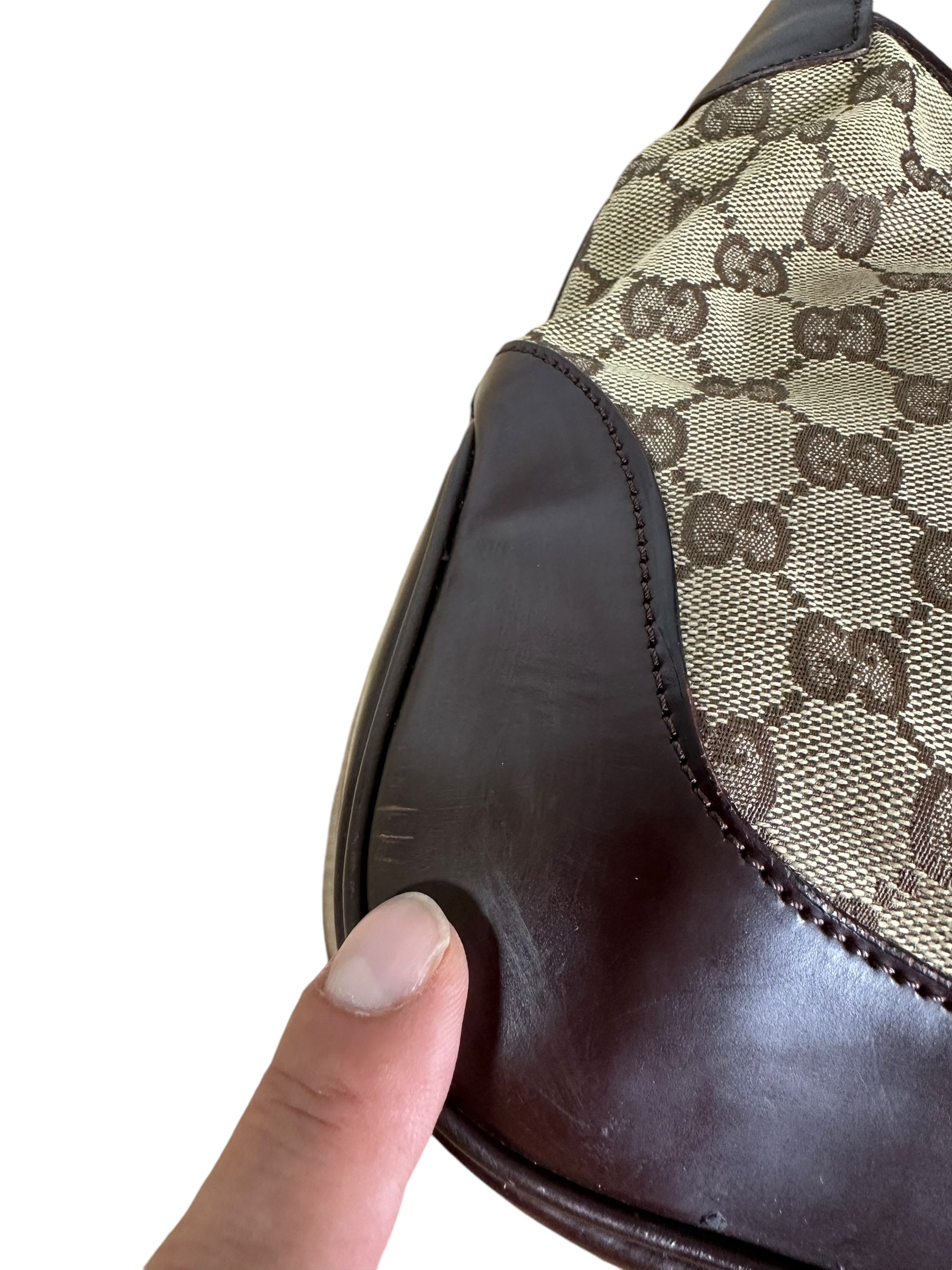 Gucci borsa Jackie vintage in tela monogram beige con manico e profili in pelle color testa di moro. Hardware in metallo e chiusura con gancio automatico, interno foderato con taschino. Presenta delle piccole grinze su un angolo e un micro segno sulla pelle (vedi foto). Viene spedita con dust bag.
