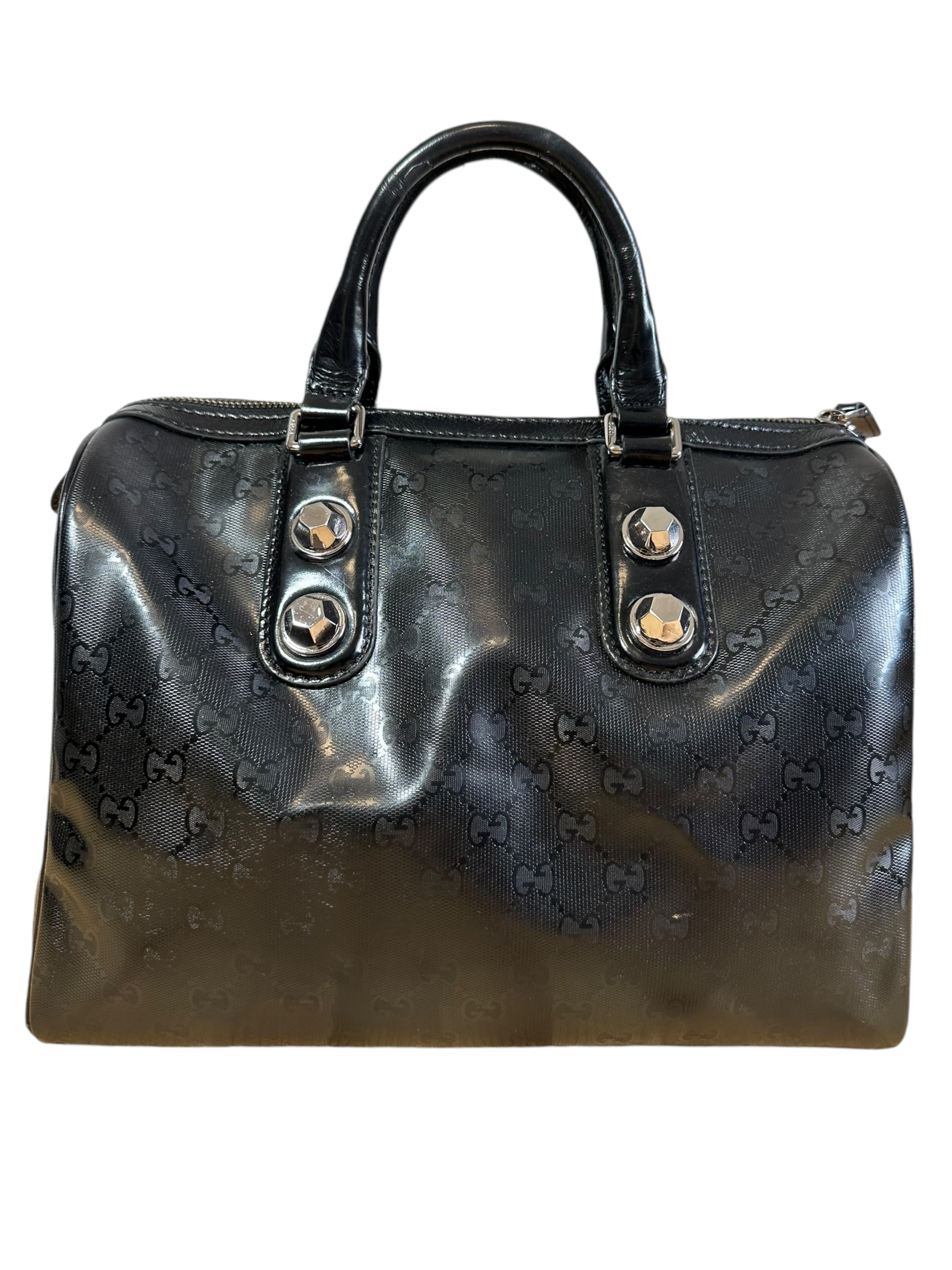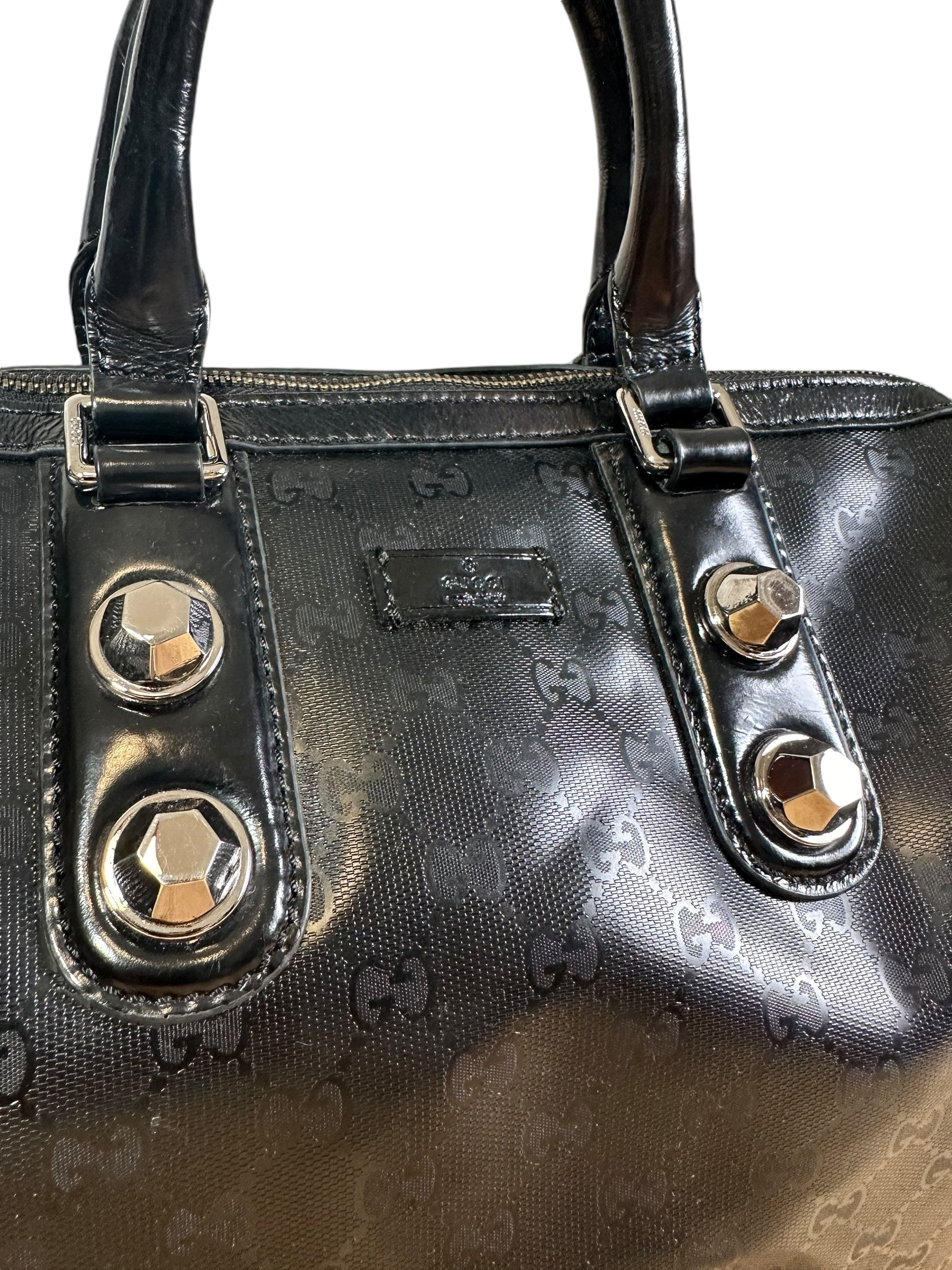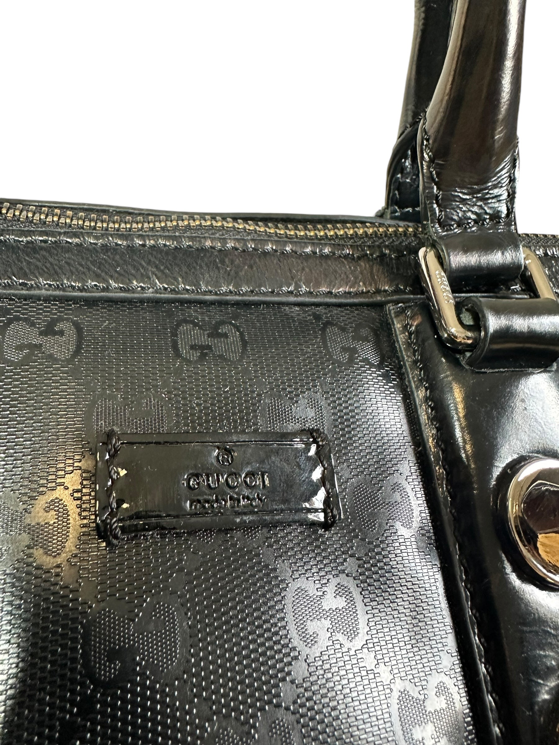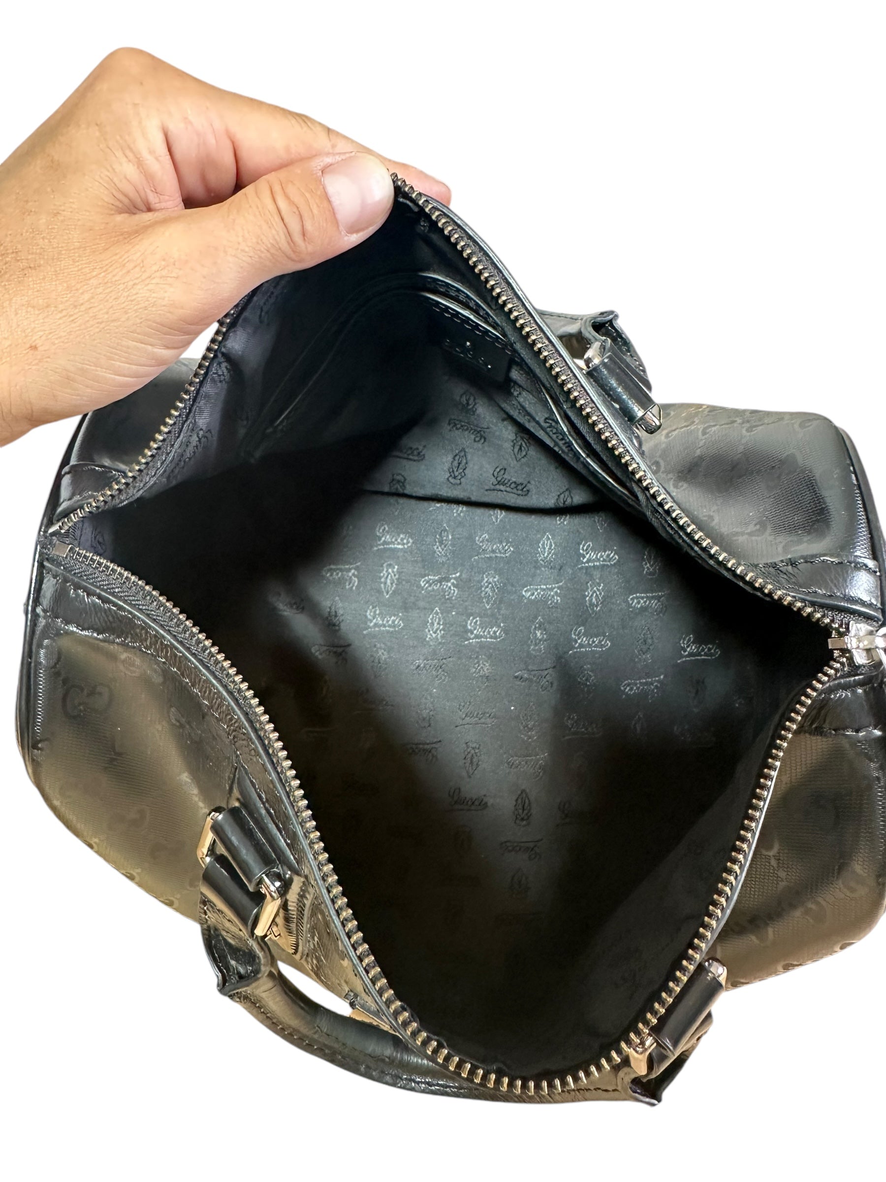 Gicci borsa vintage a bauletto in pelle verniciata nera con loghi monogram tono su tono, hardware in acciaio e manici rigidi. Chiusura a zip e interno molto spazioso con taschino.