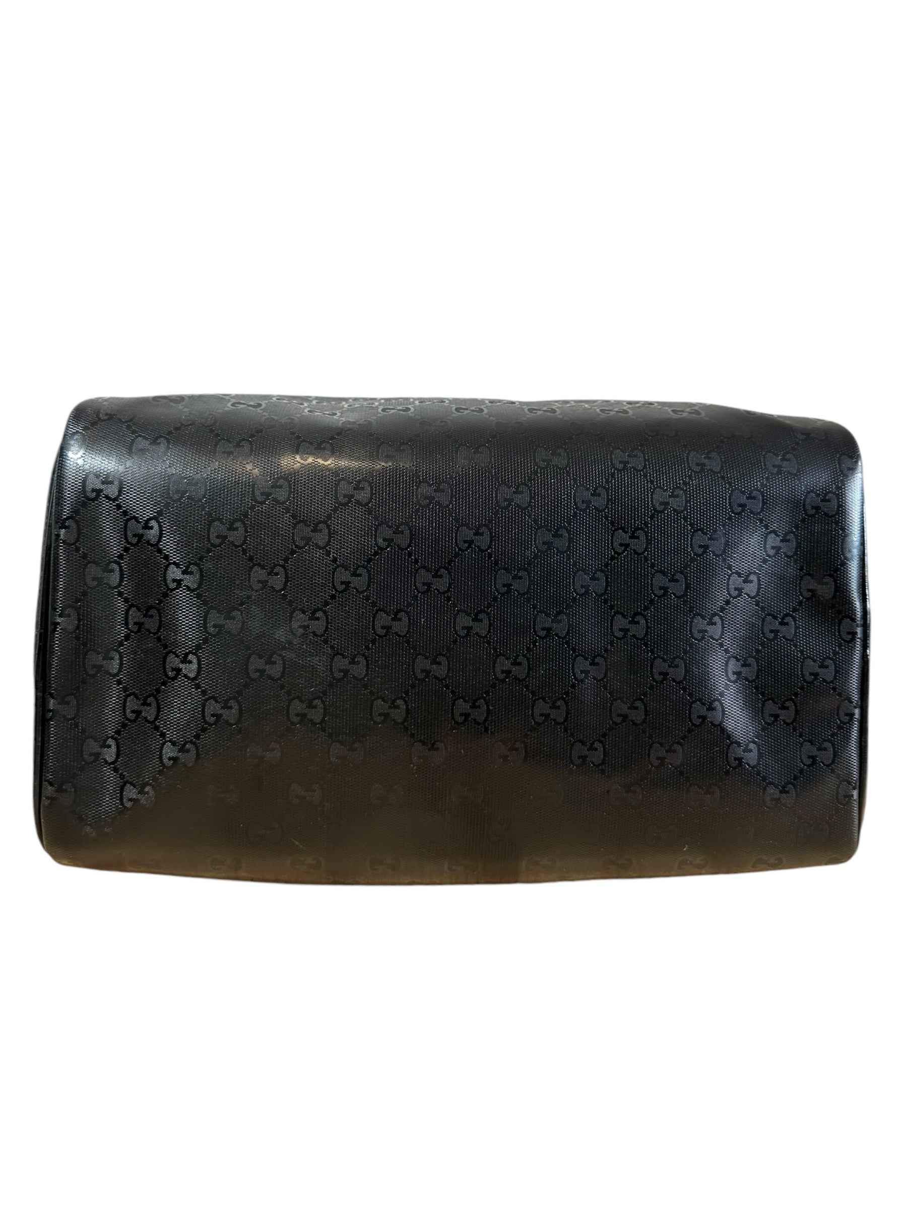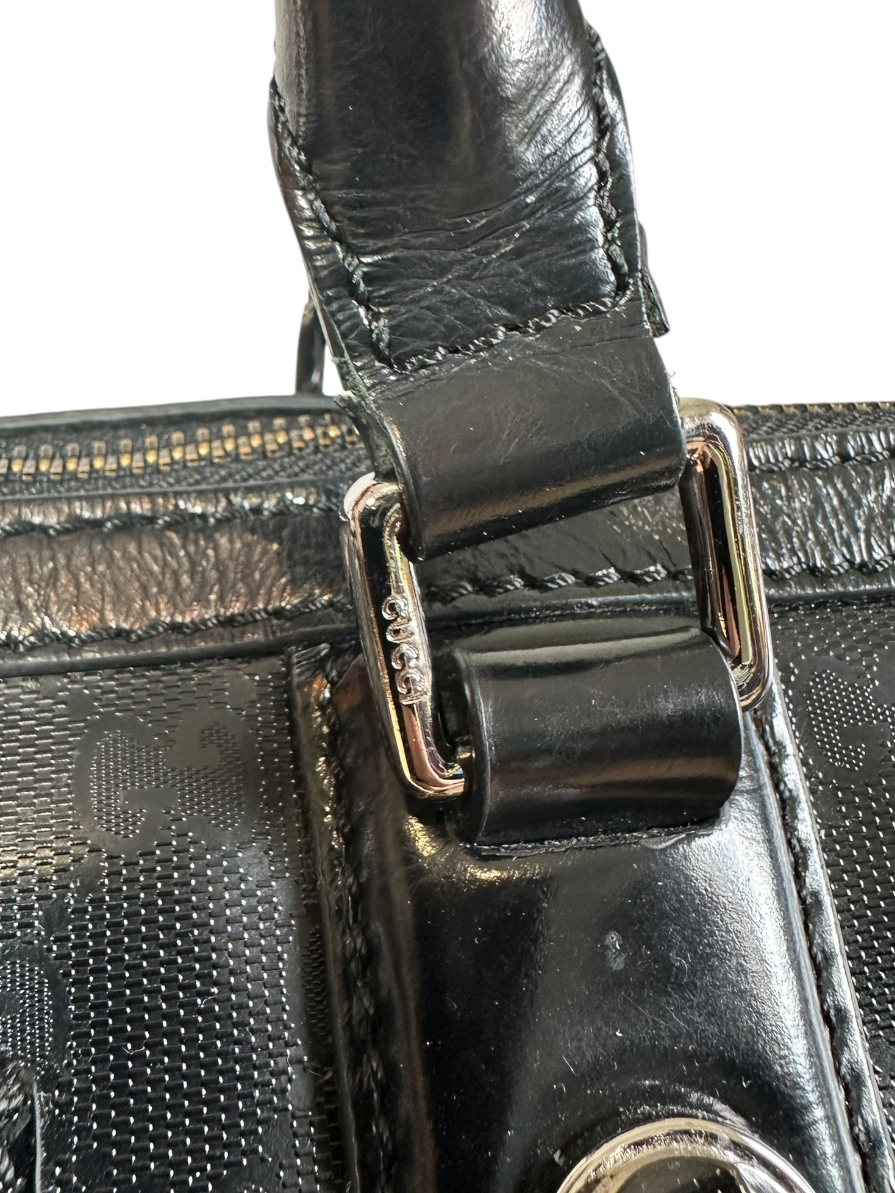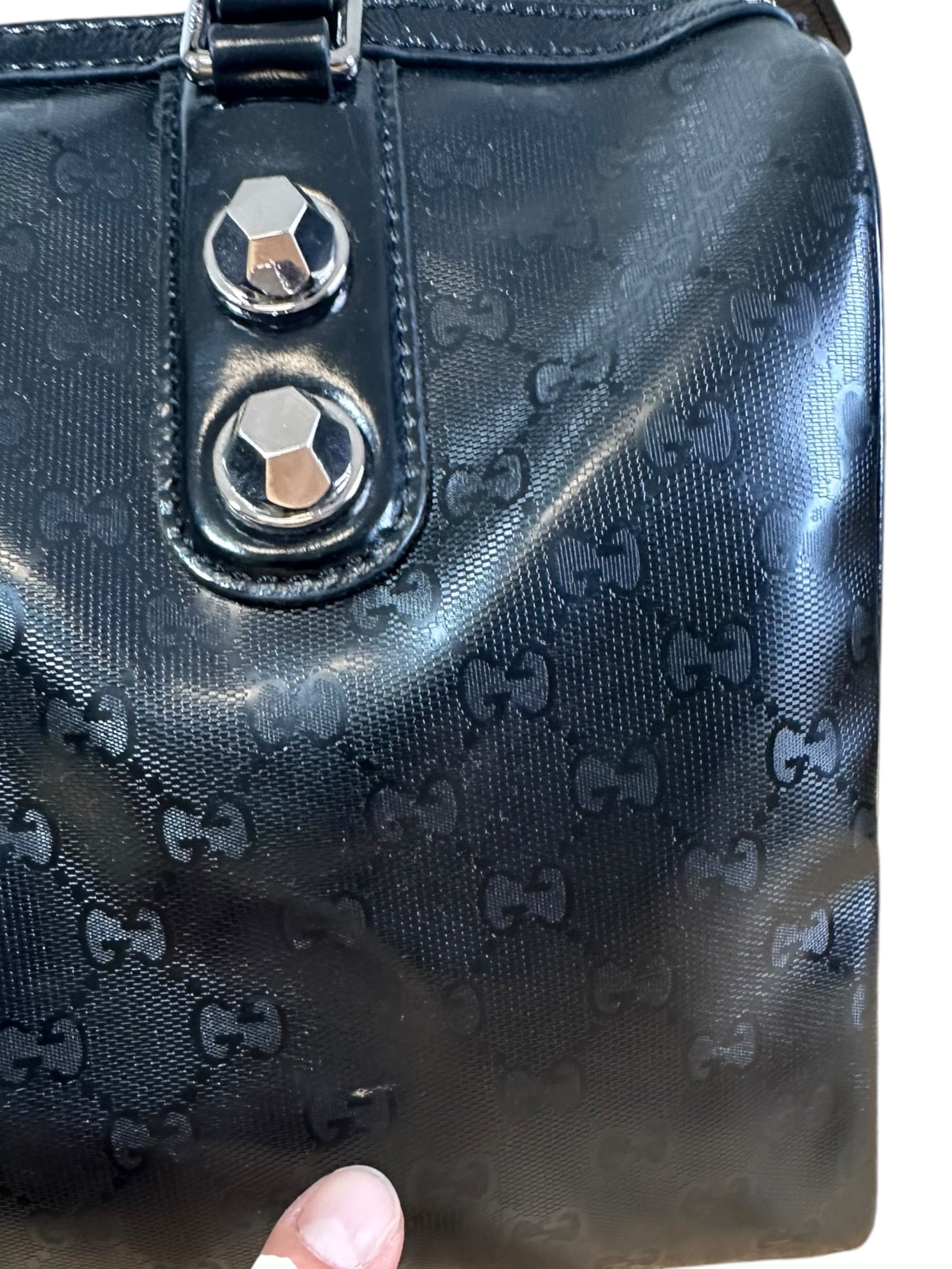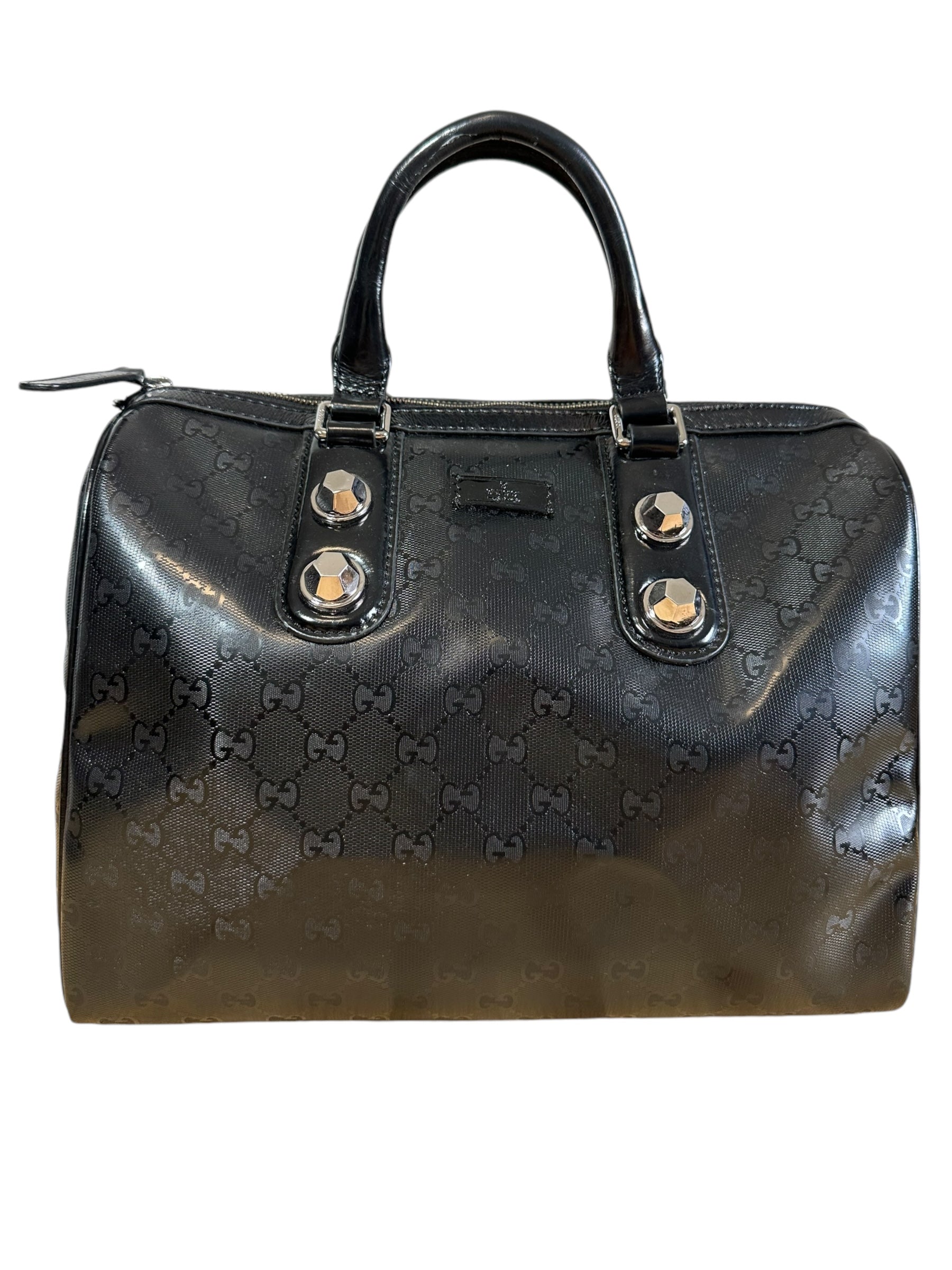 Gicci borsa vintage a bauletto in pelle verniciata nera con loghi monogram tono su tono, hardware in acciaio e manici rigidi. Chiusura a zip e interno molto spazioso con taschino.