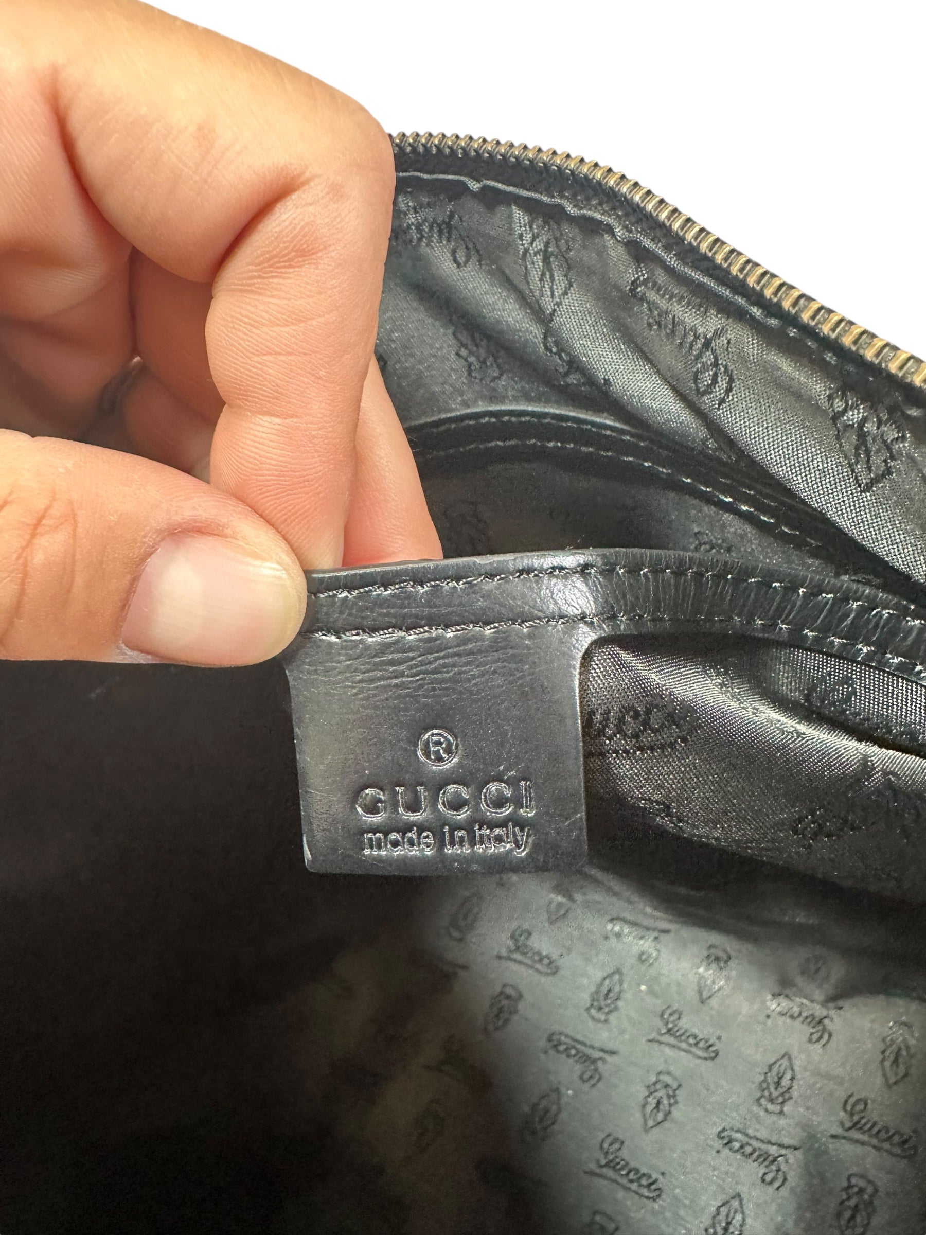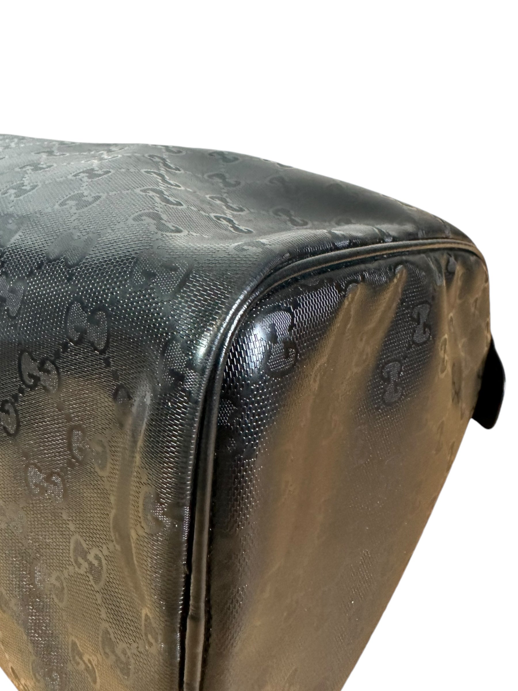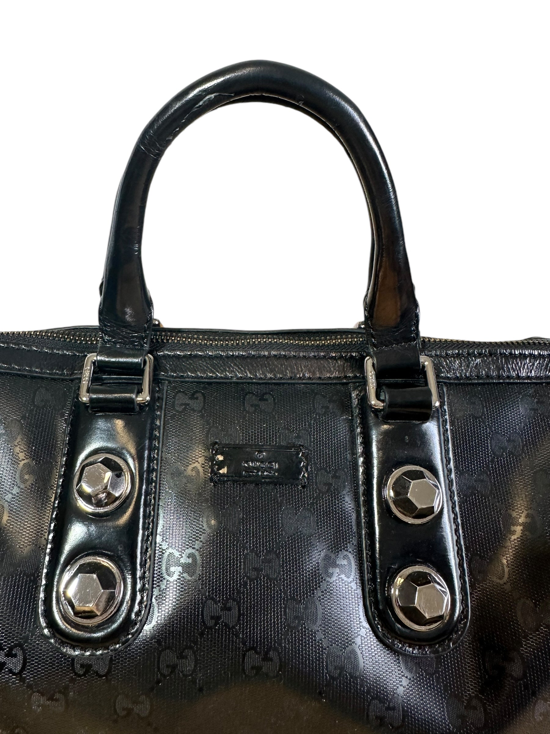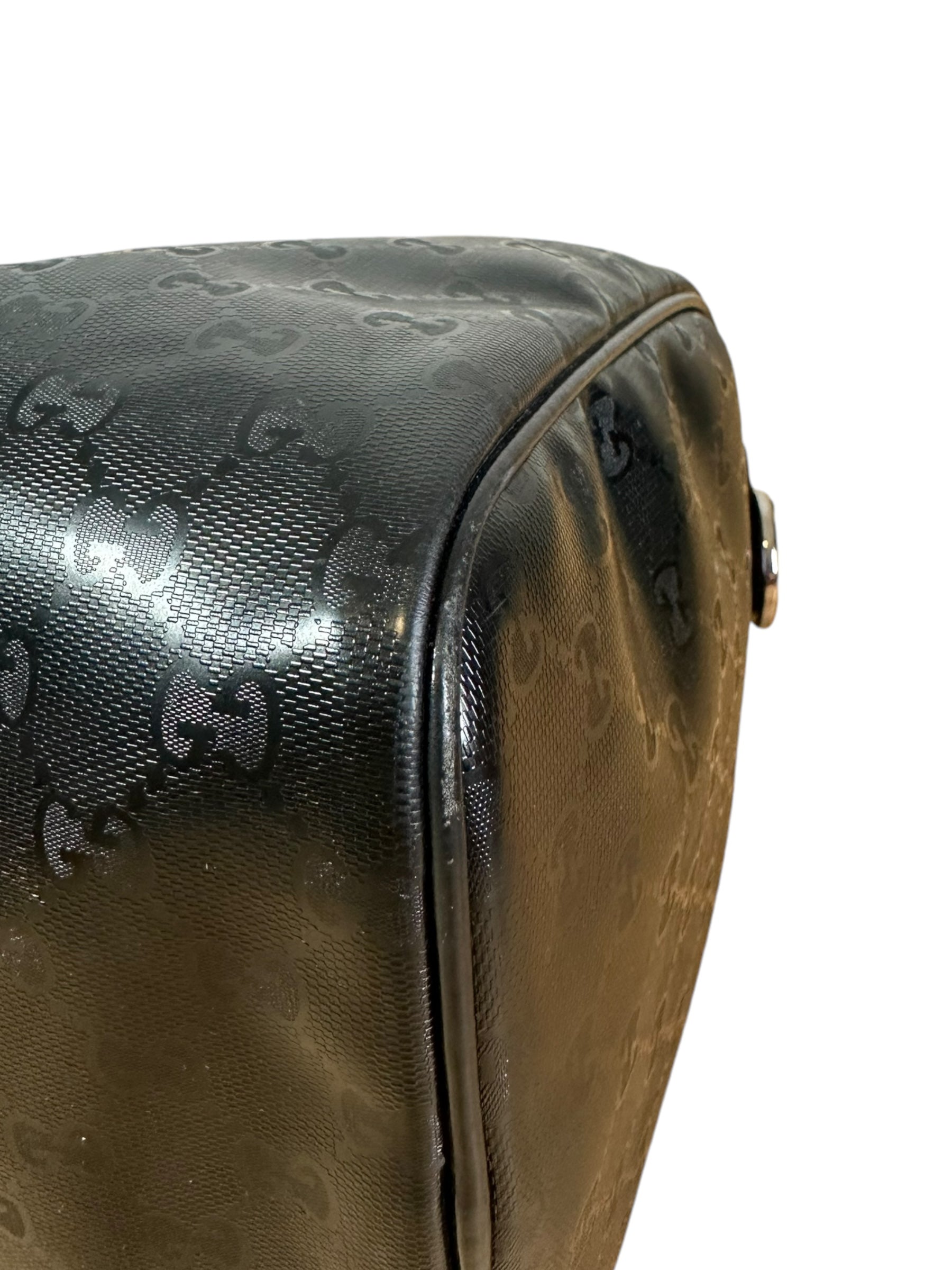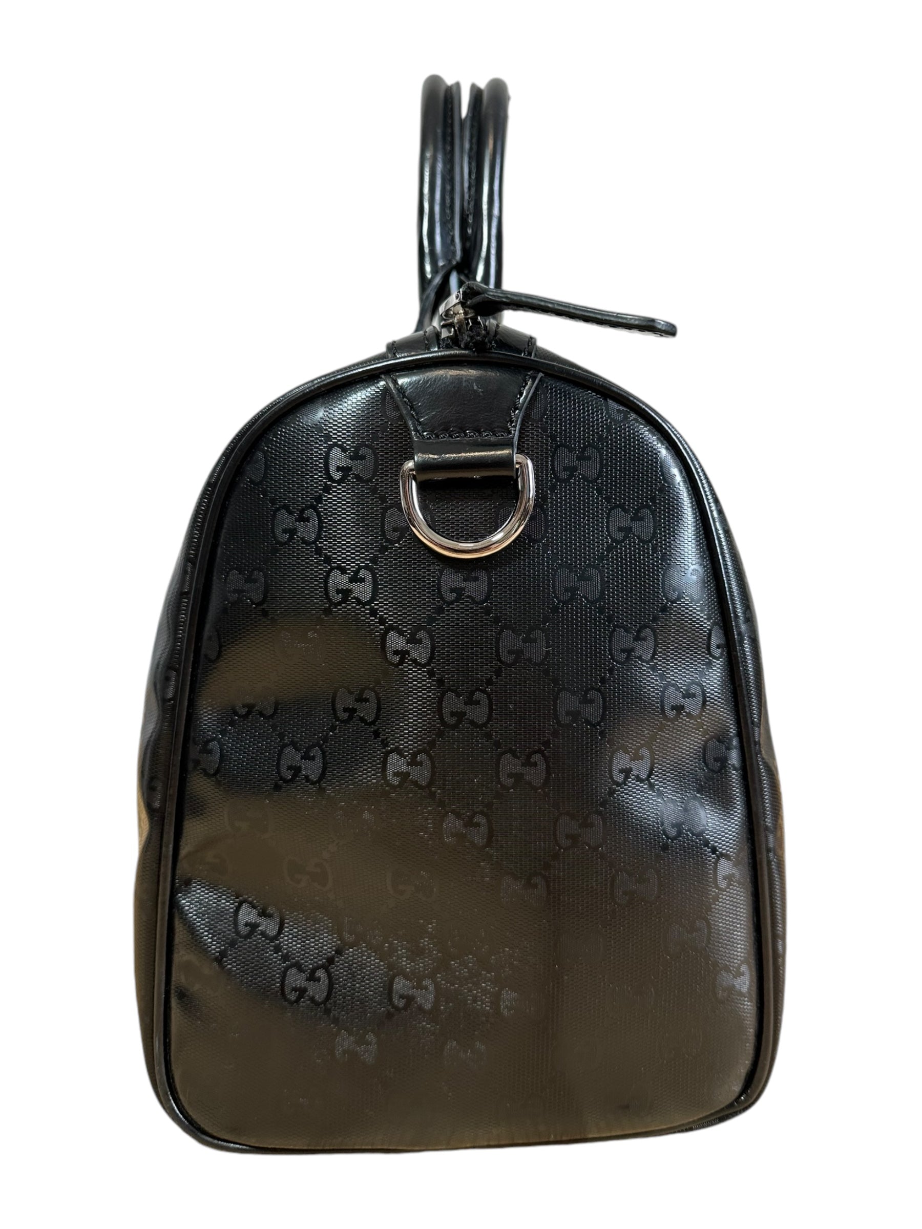 Gicci borsa vintage a bauletto in pelle verniciata nera con loghi monogram tono su tono, hardware in acciaio e manici rigidi. Chiusura a zip e interno molto spazioso con taschino.