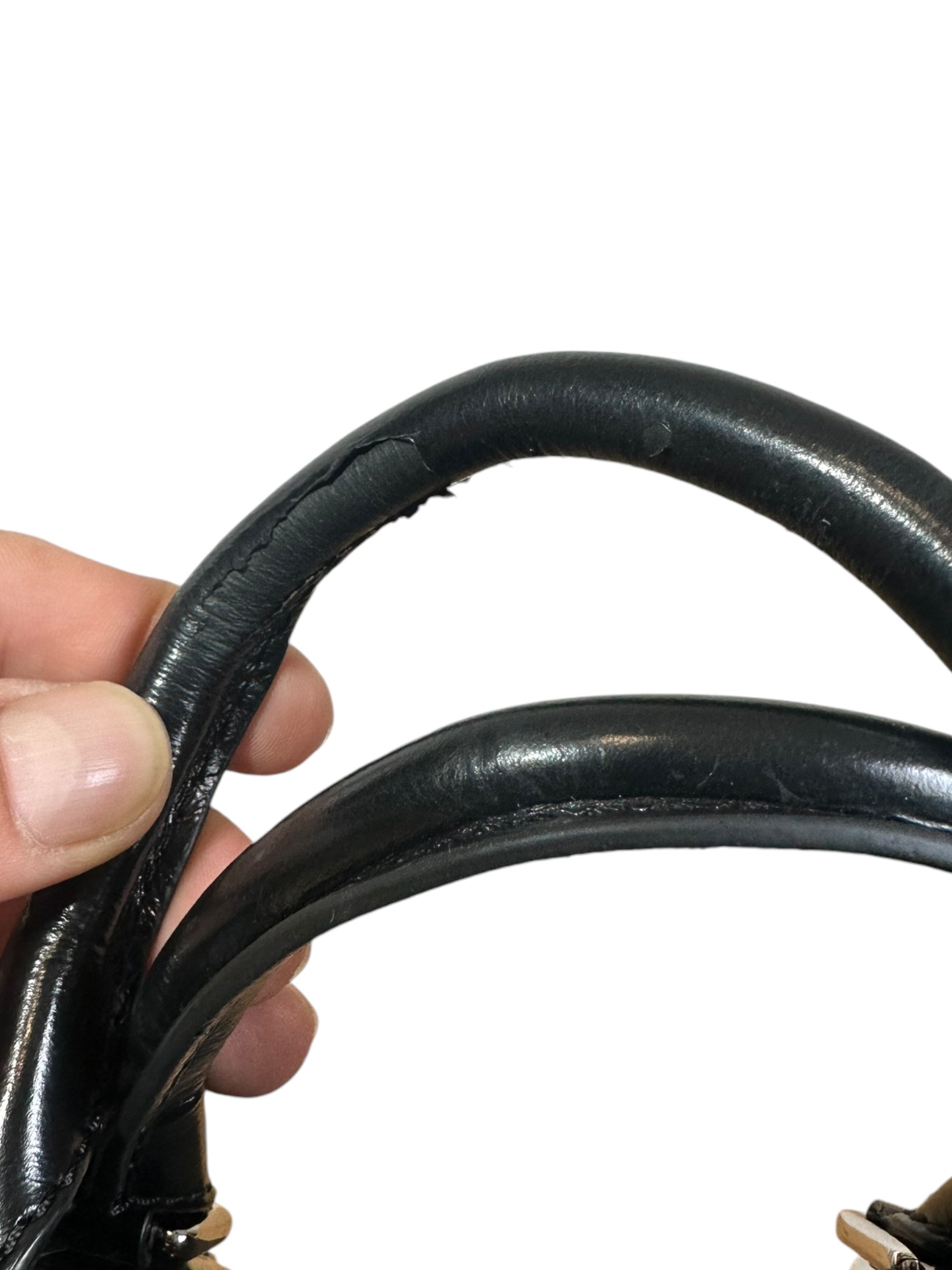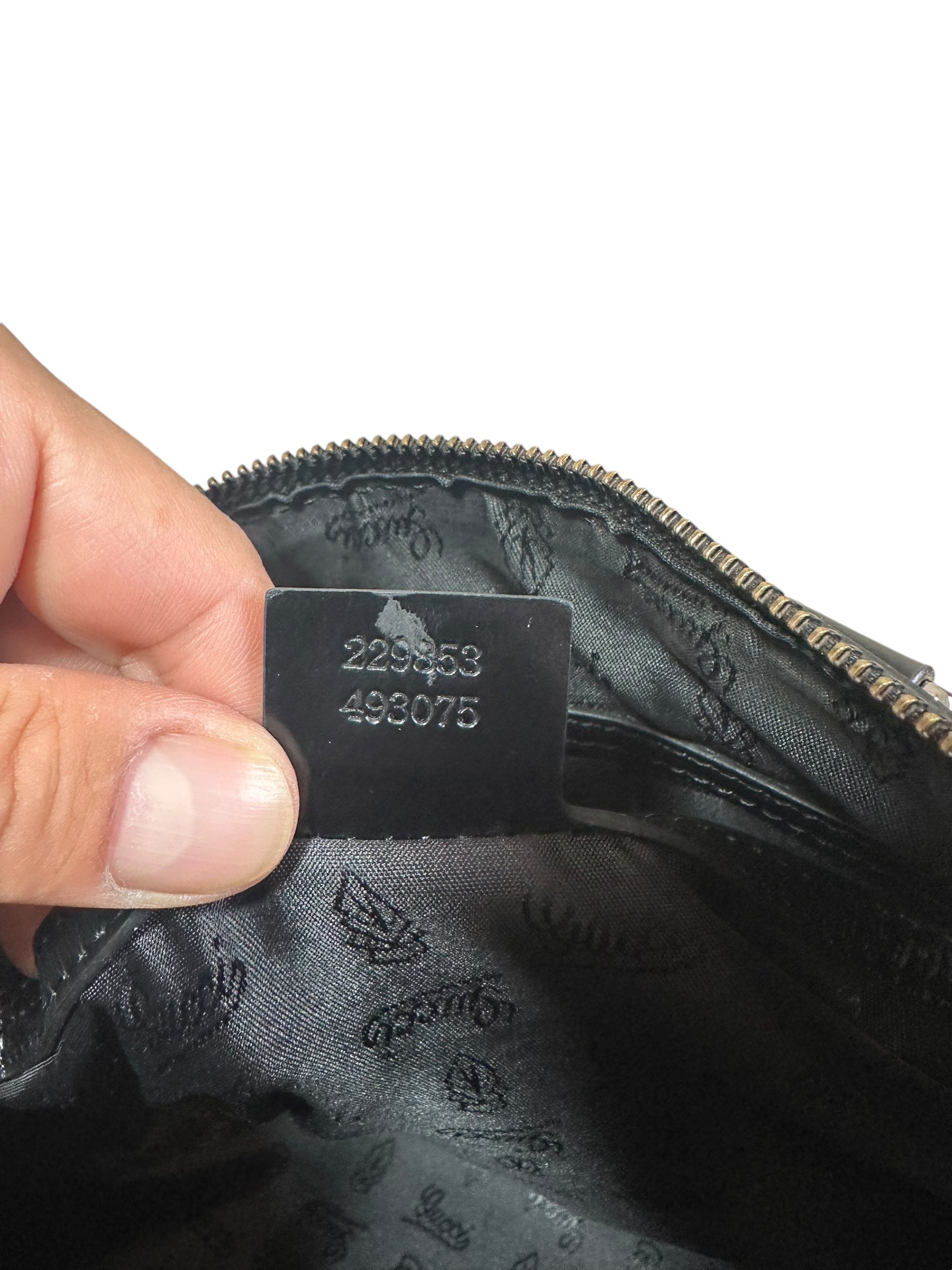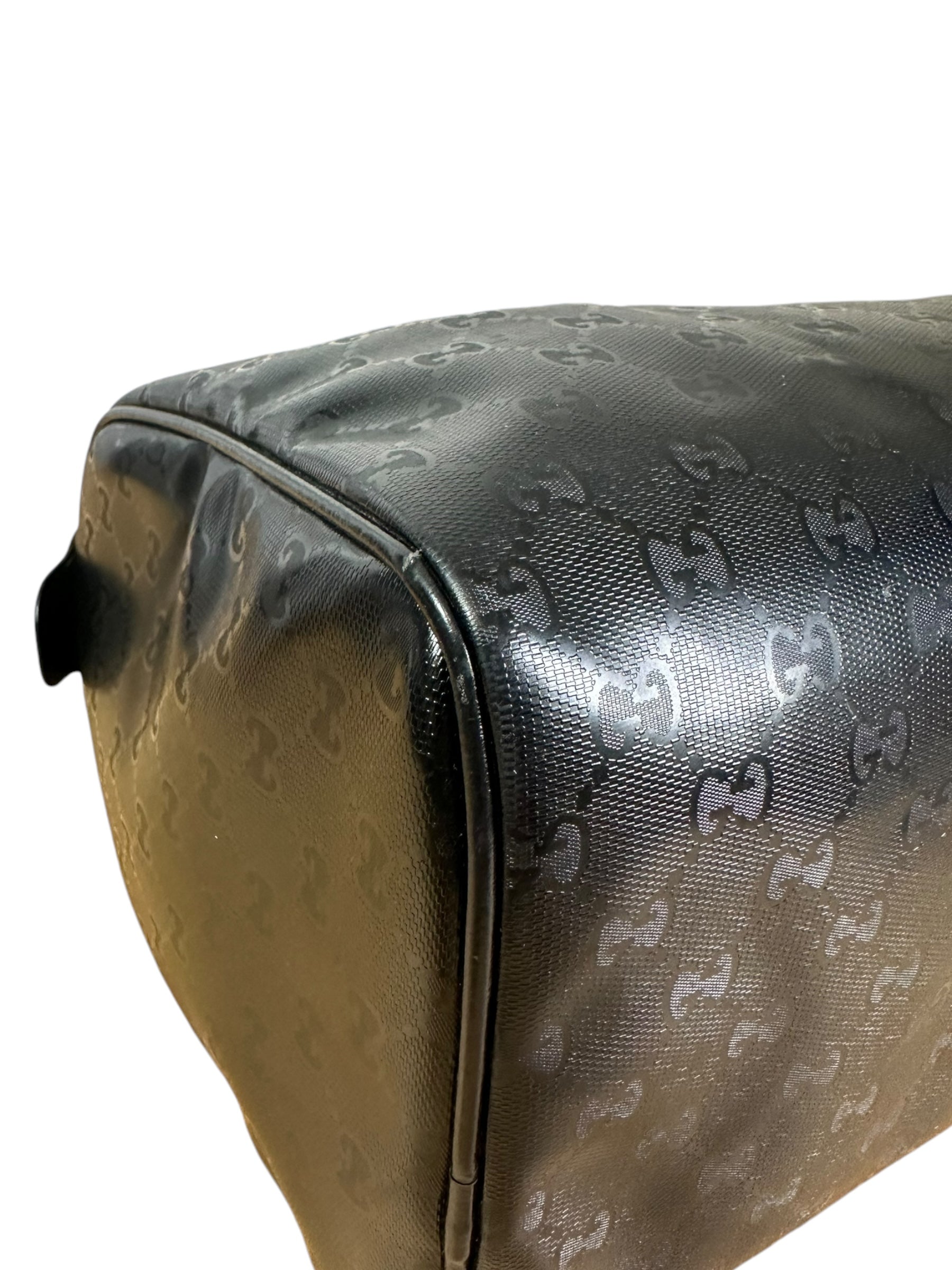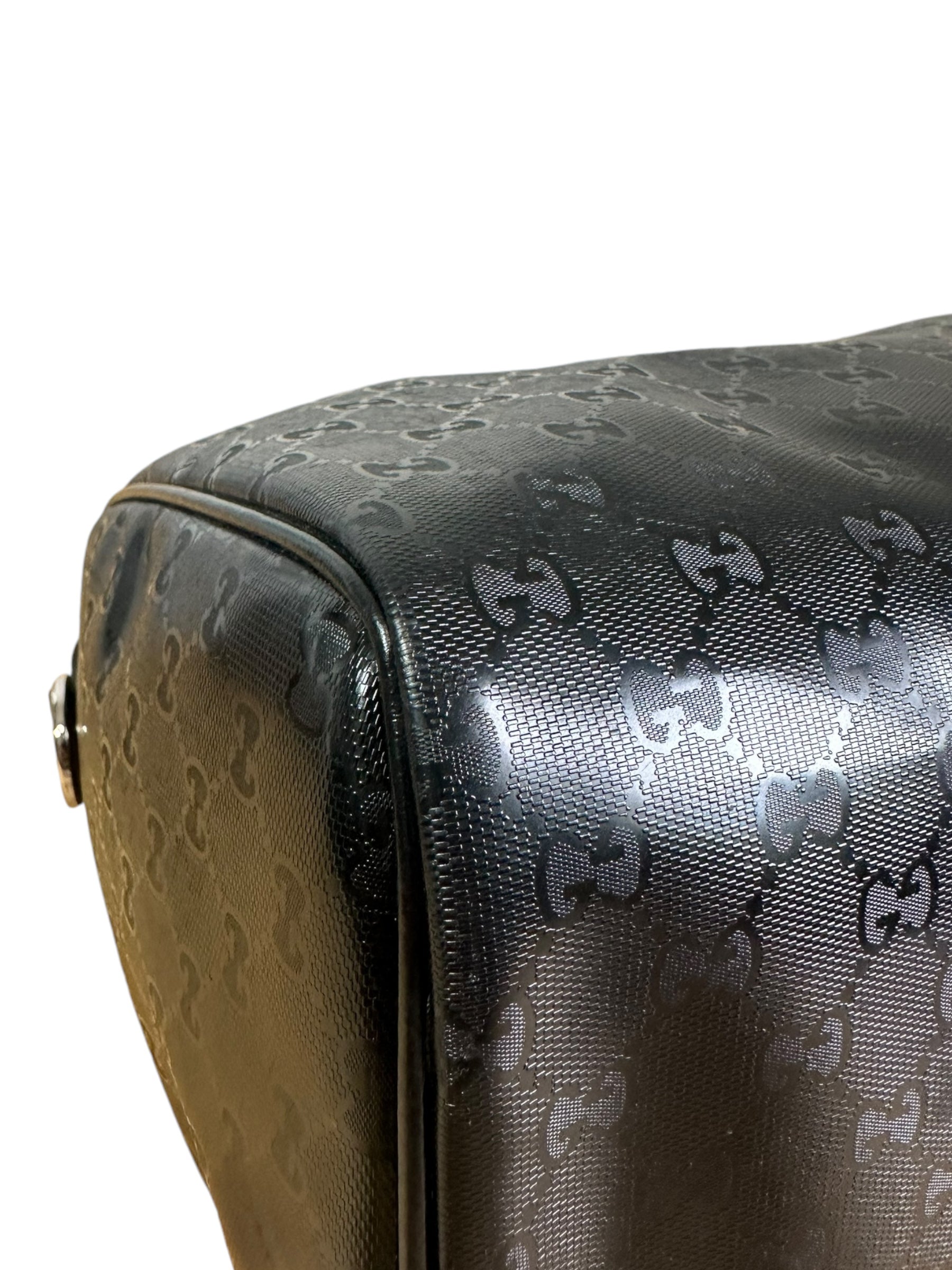 Gicci borsa vintage a bauletto in pelle verniciata nera con loghi monogram tono su tono, hardware in acciaio e manici rigidi. Chiusura a zip e interno molto spazioso con taschino.