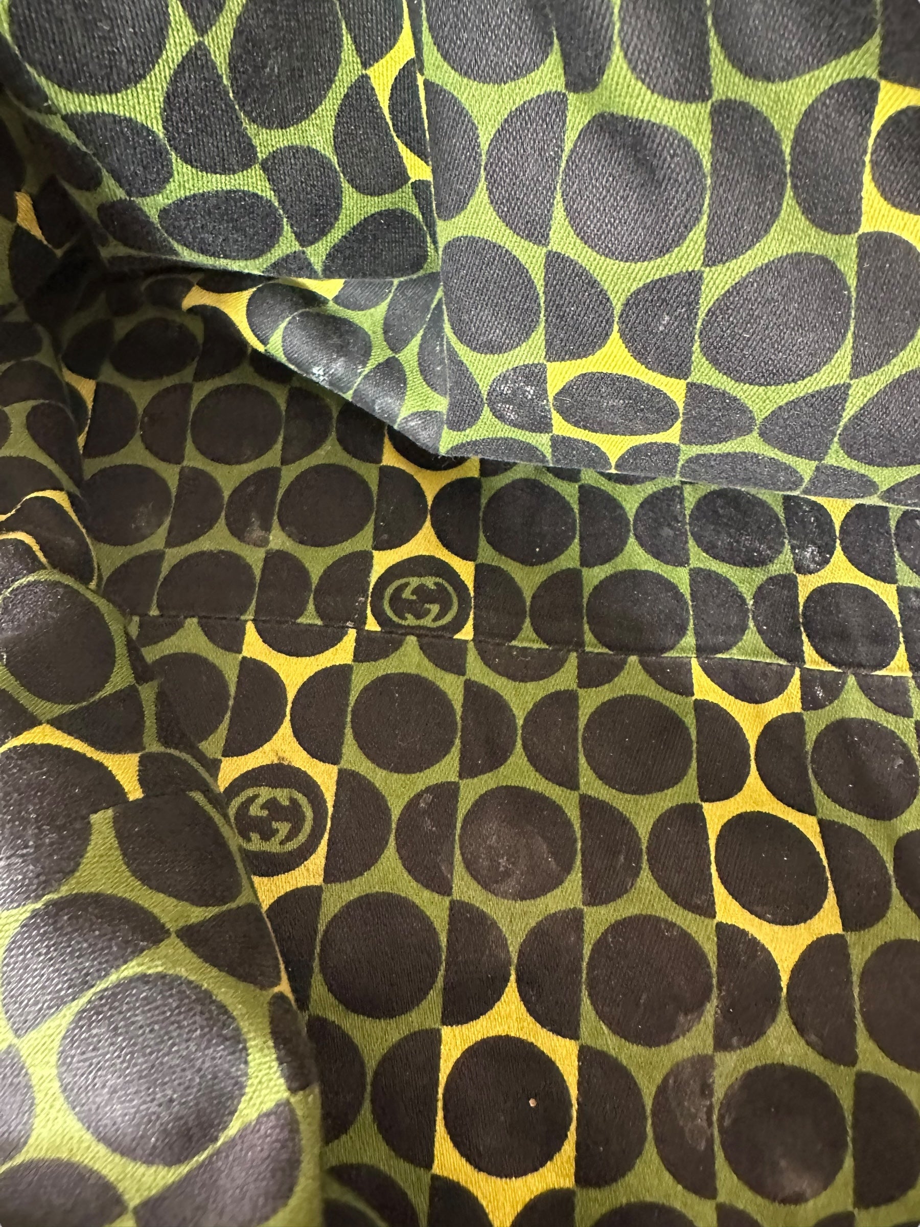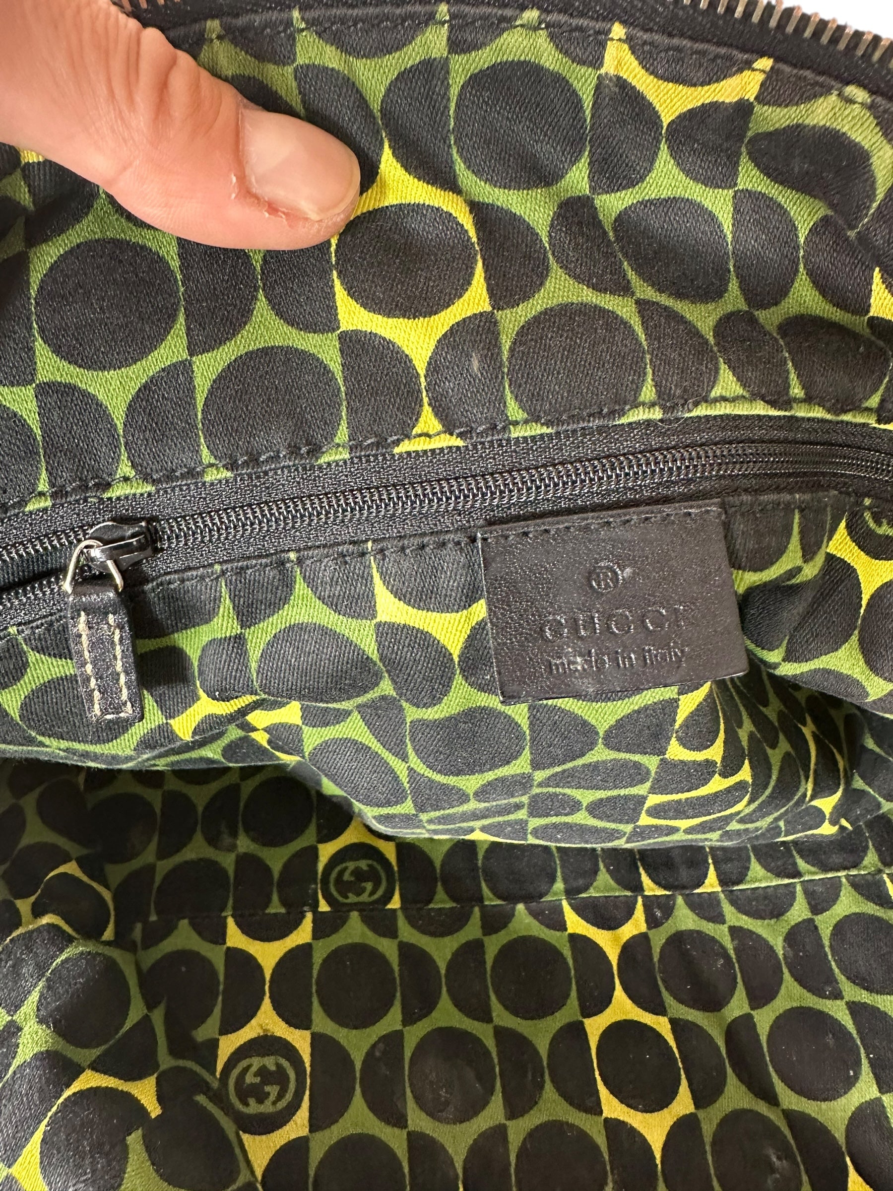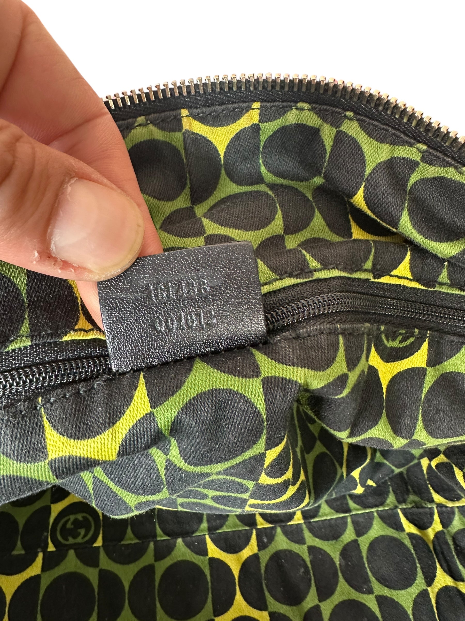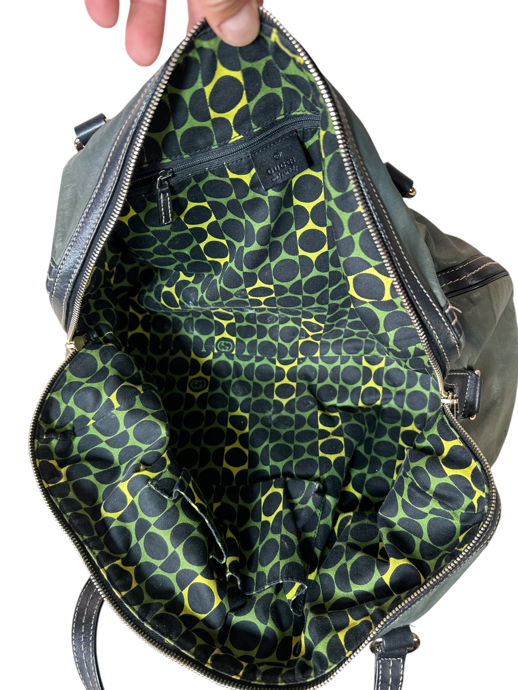 Borsa capiente in pelle firmata Gucci, dal design morbido e sportivo, impreziosita da cuciture a contrasto e doppio manico. Il modello è rifinito con charm logo in pelle e metalleria dorata, e presenta un interno sorprendente in tessuto a motivo geometrico nei toni del verde, giallo e nero con logo GG ripetuto.