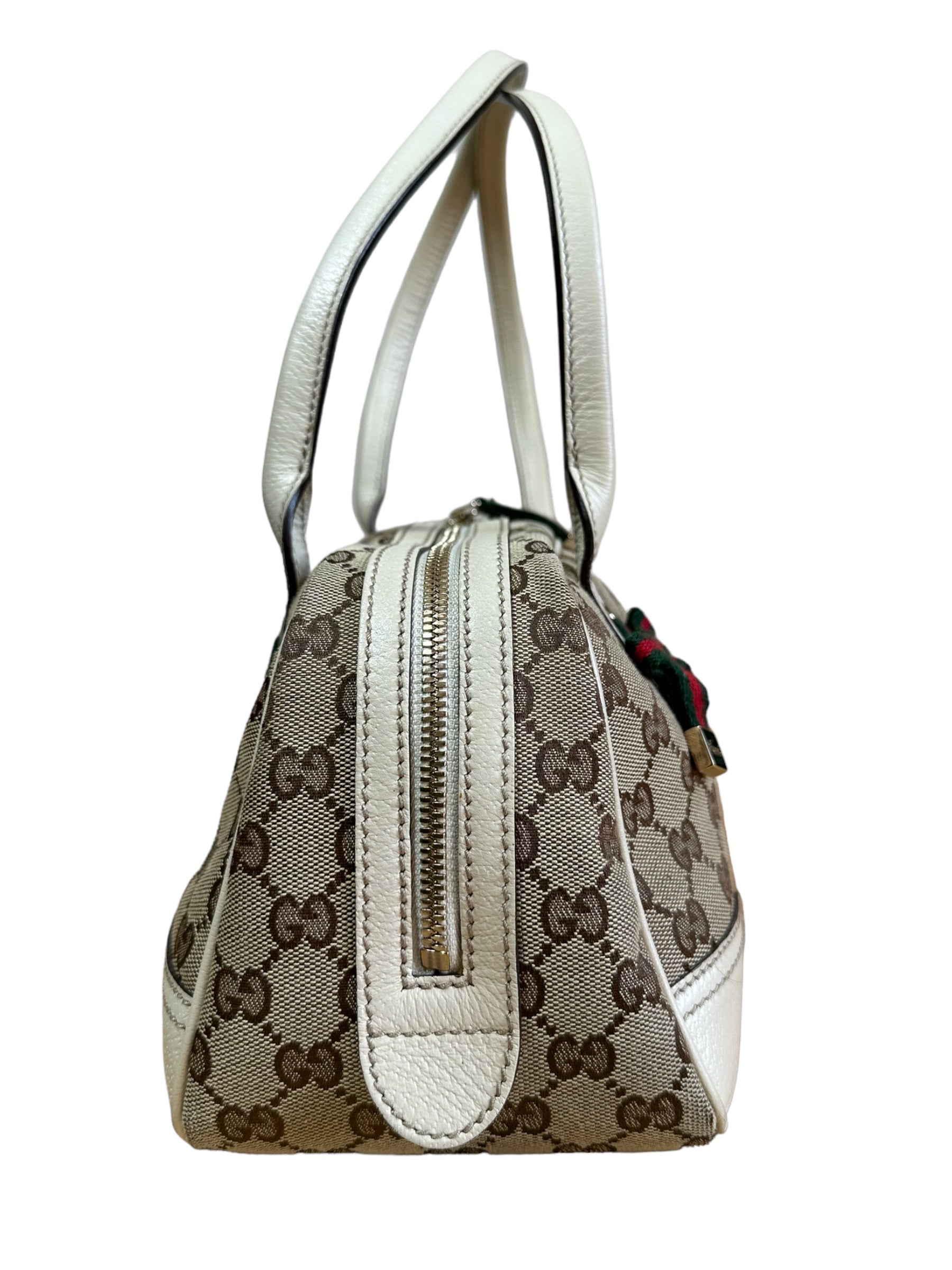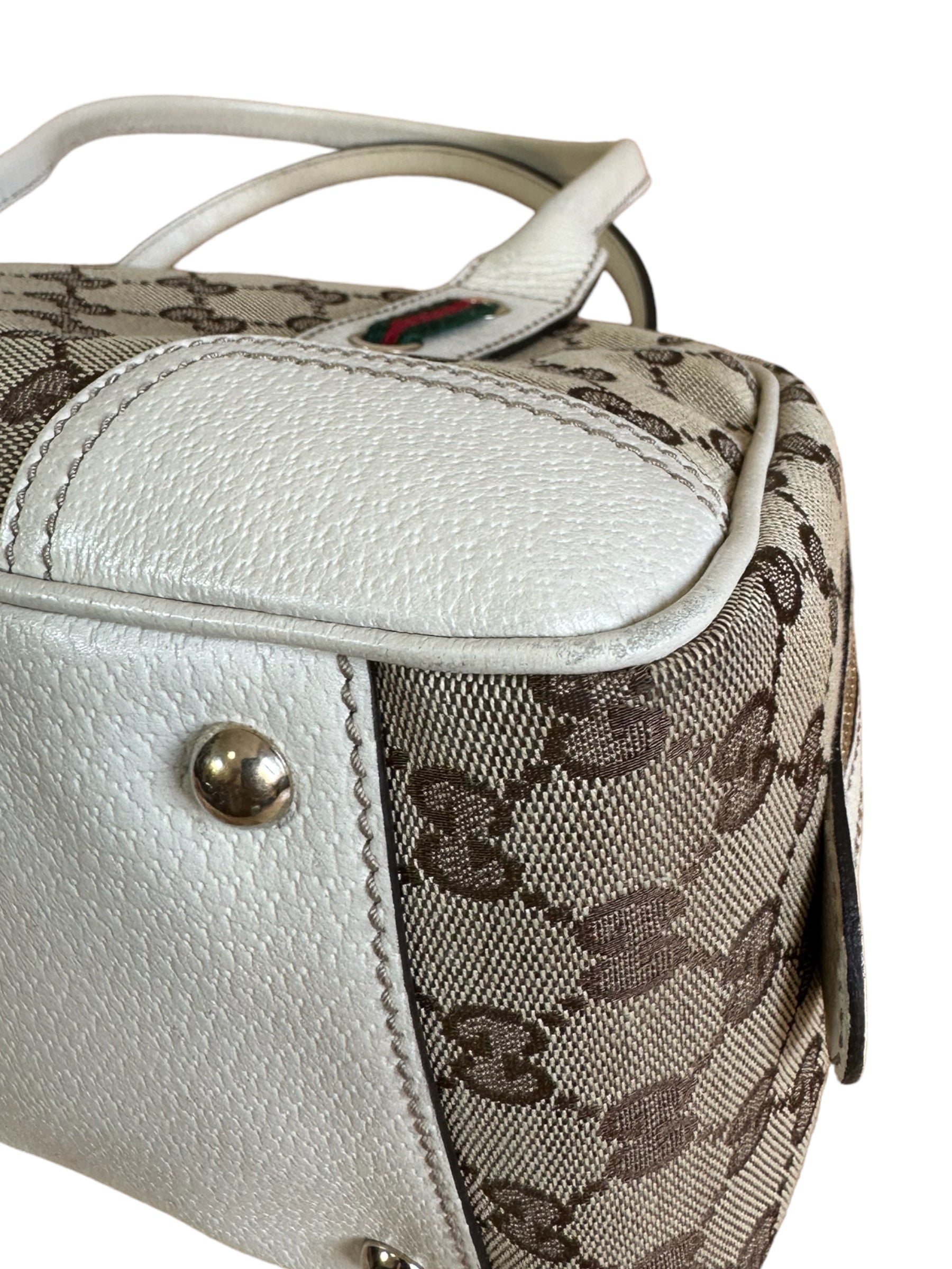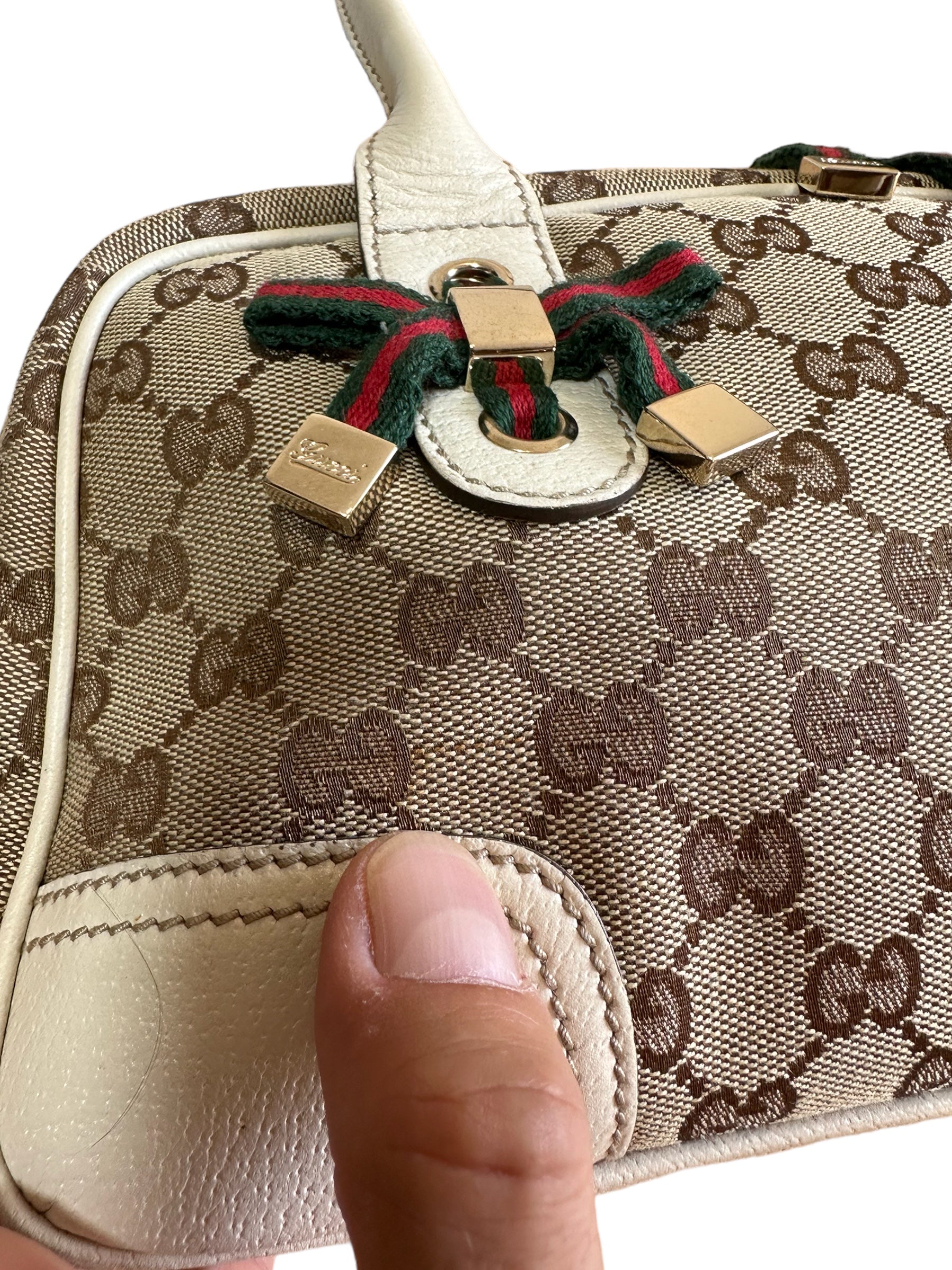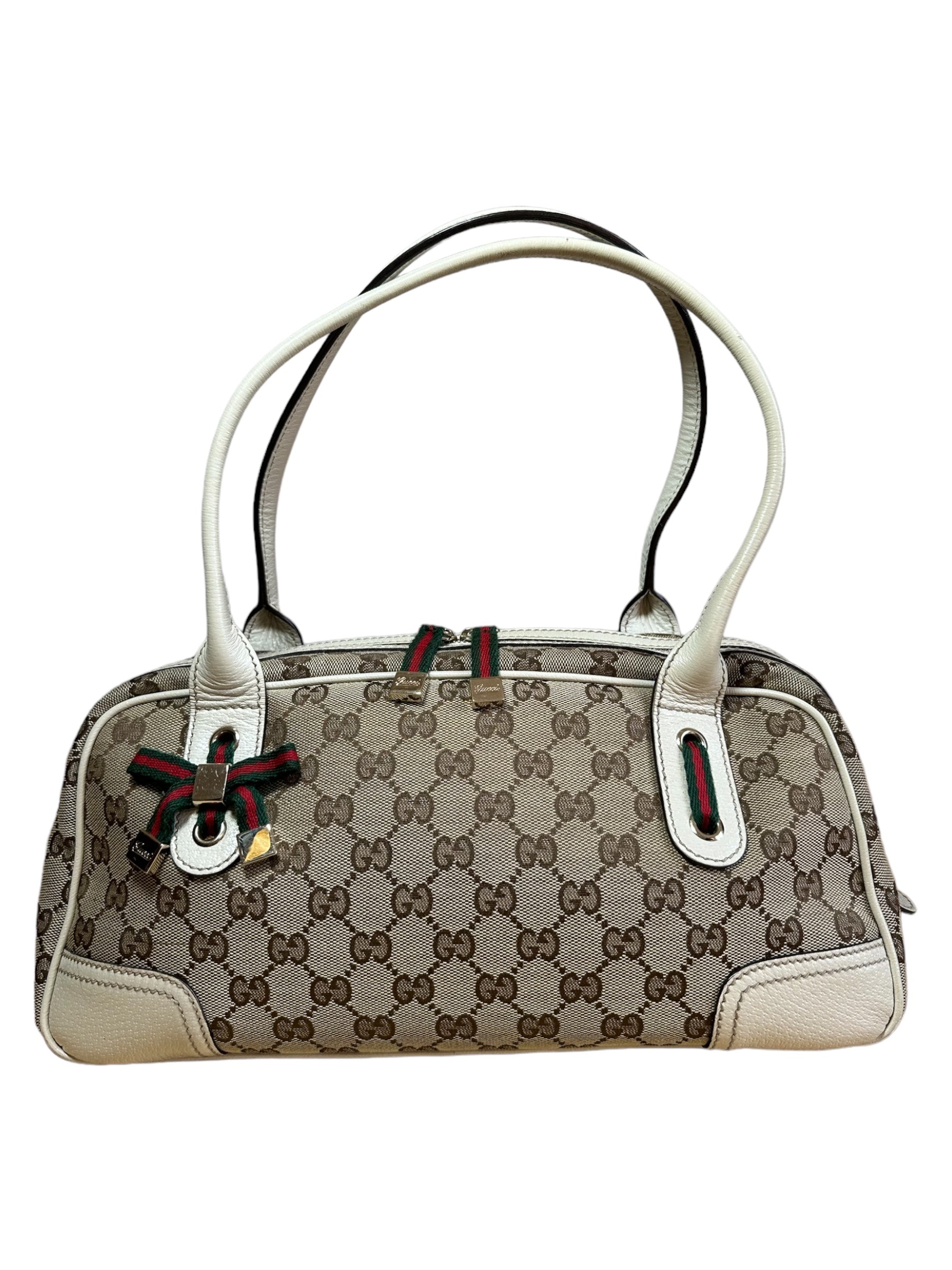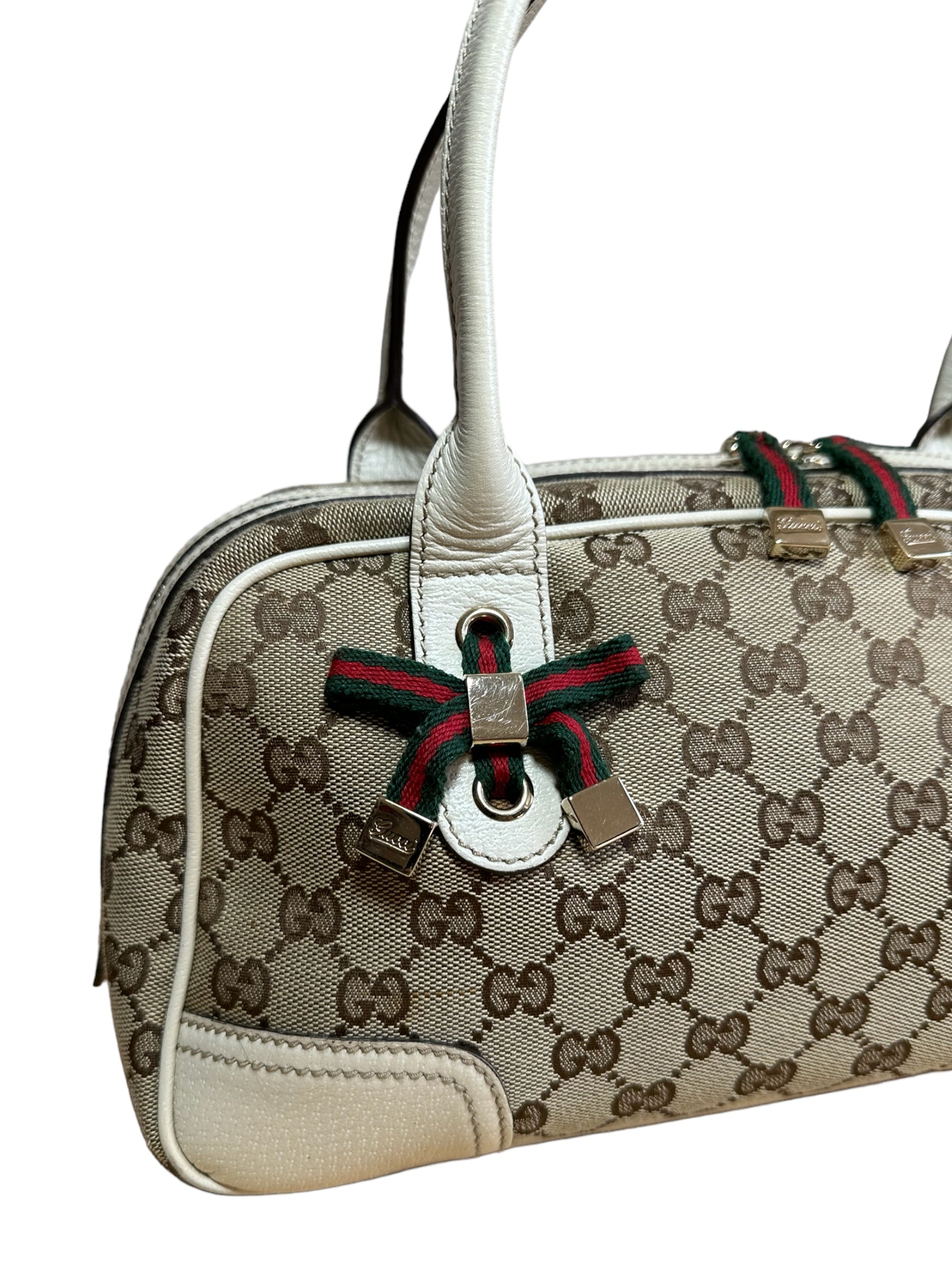 Gucci borsa vintage modello Princy a bauletto in tela monogram con manici e profili in pelle color testa di moro. Fiocco web in nylon sul davanti e doppia chiusura con zip in metallo. Interno foderato con taschino. Lieve seg o di usura quasi impercettibile sul davanti e angoli lievemente usurati.