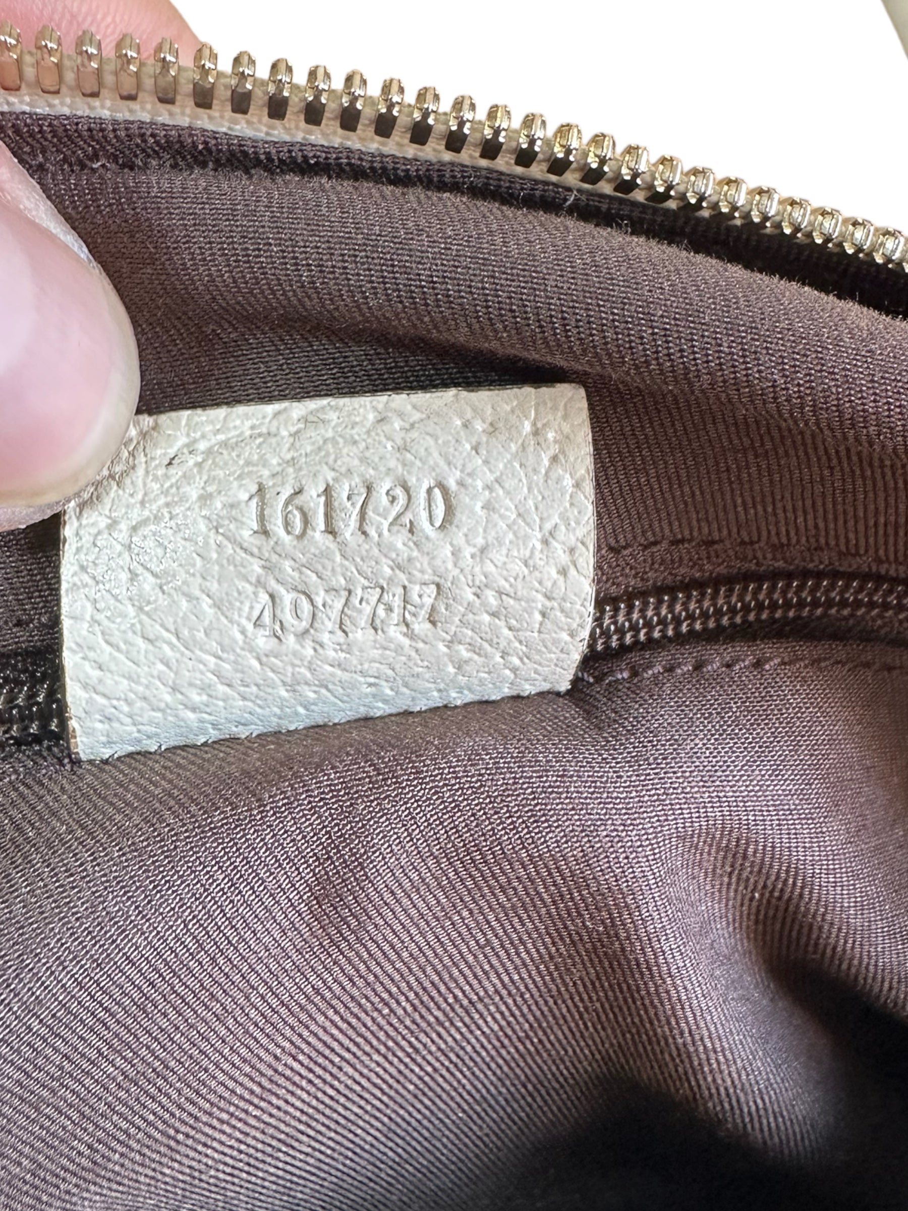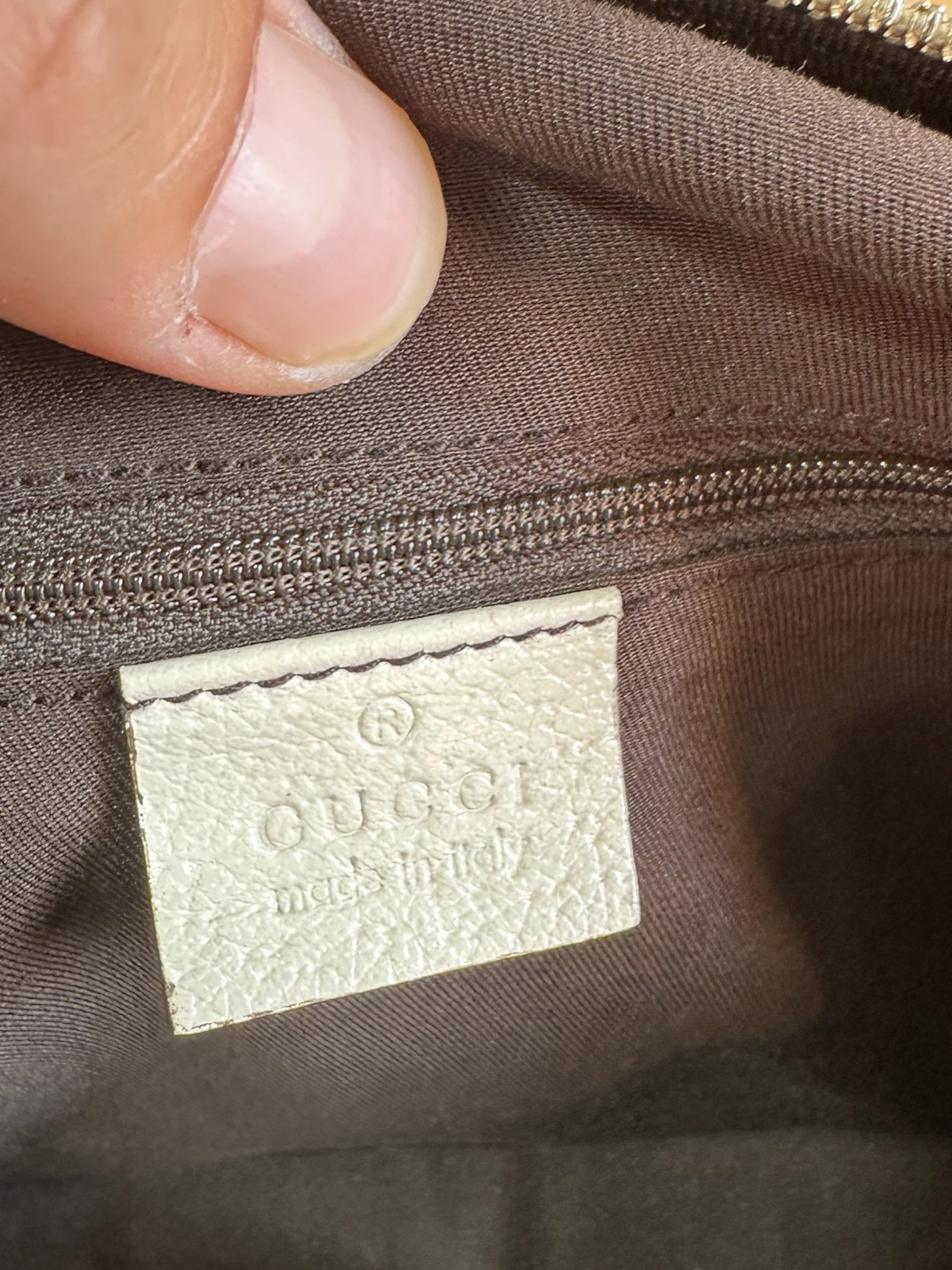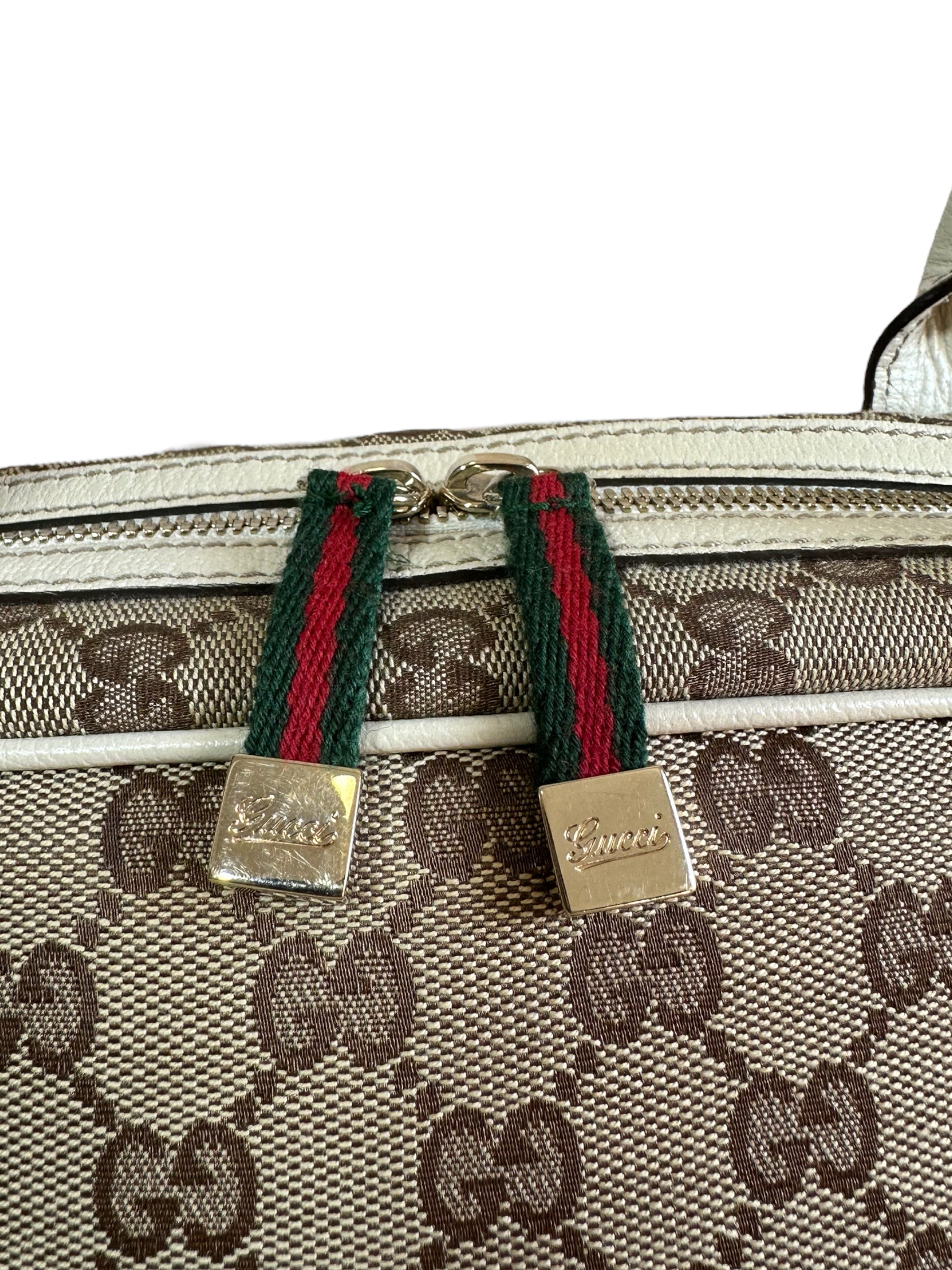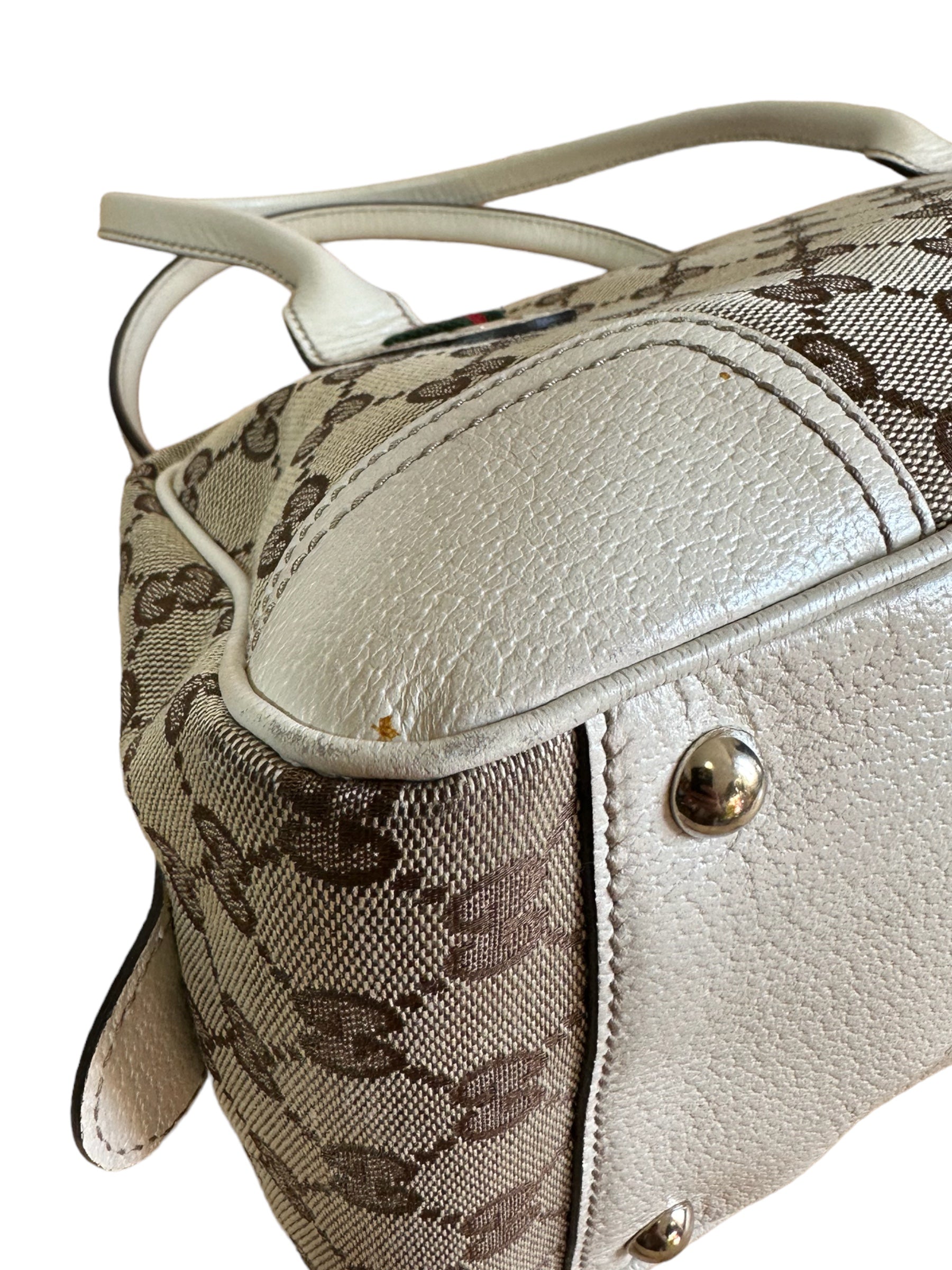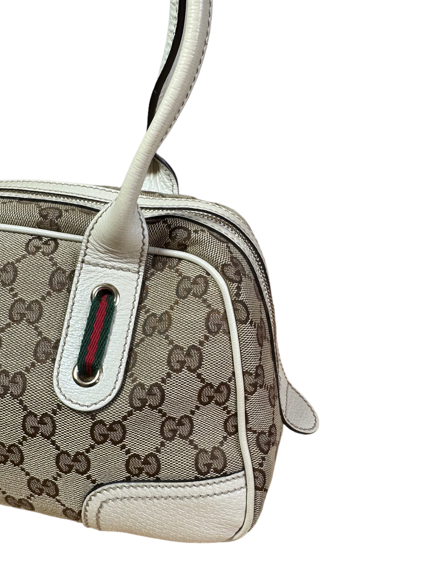 Gucci borsa vintage modello Princy a bauletto in tela monogram con manici e profili in pelle color testa di moro. Fiocco web in nylon sul davanti e doppia chiusura con zip in metallo. Interno foderato con taschino. Lieve seg o di usura quasi impercettibile sul davanti e angoli lievemente usurati.