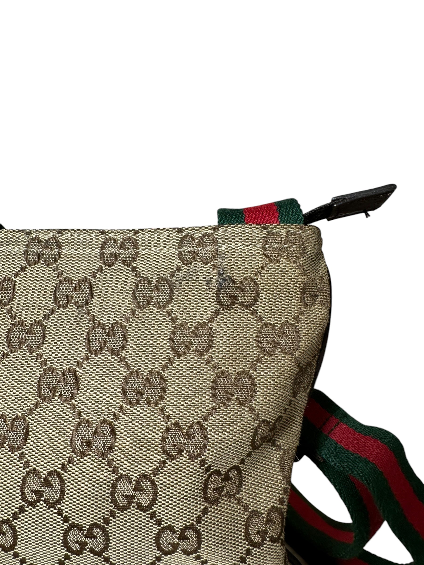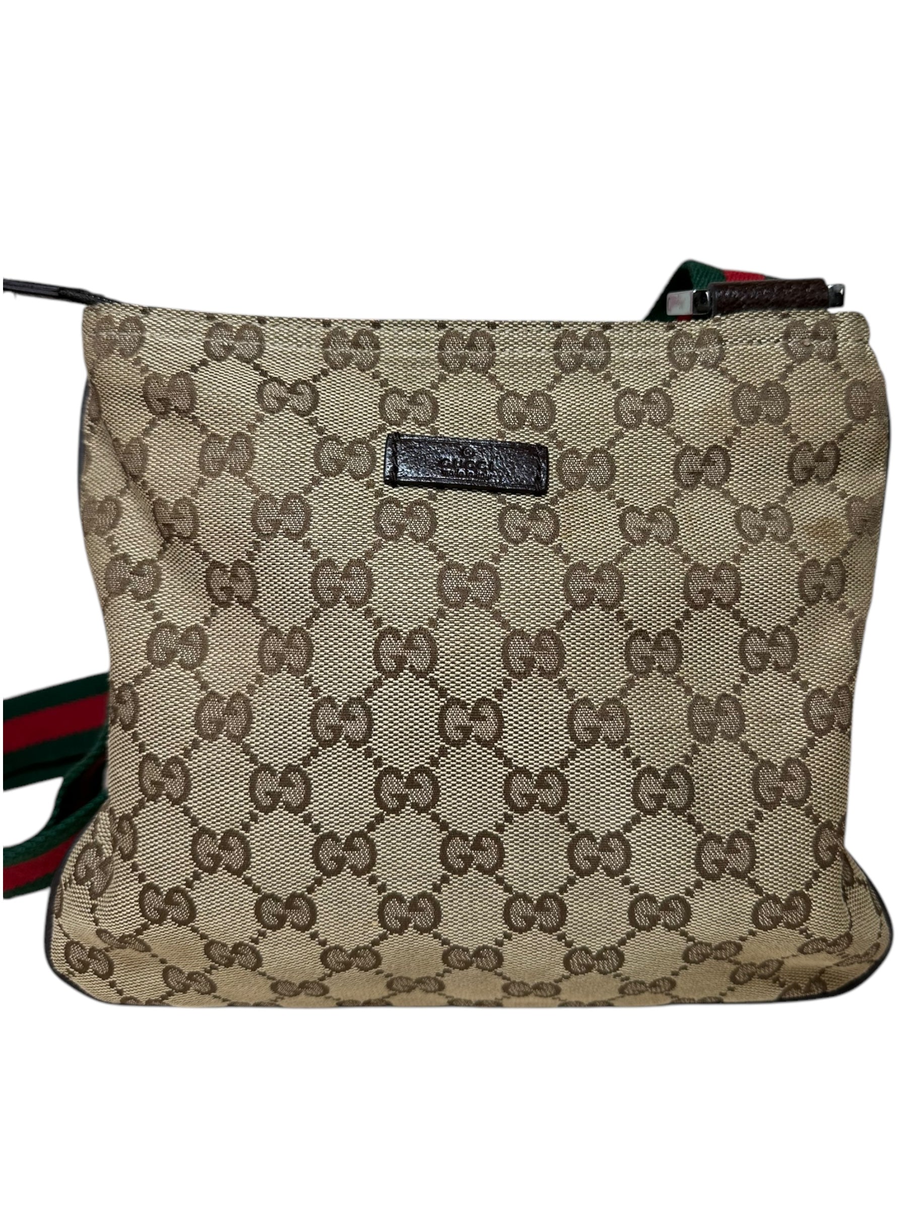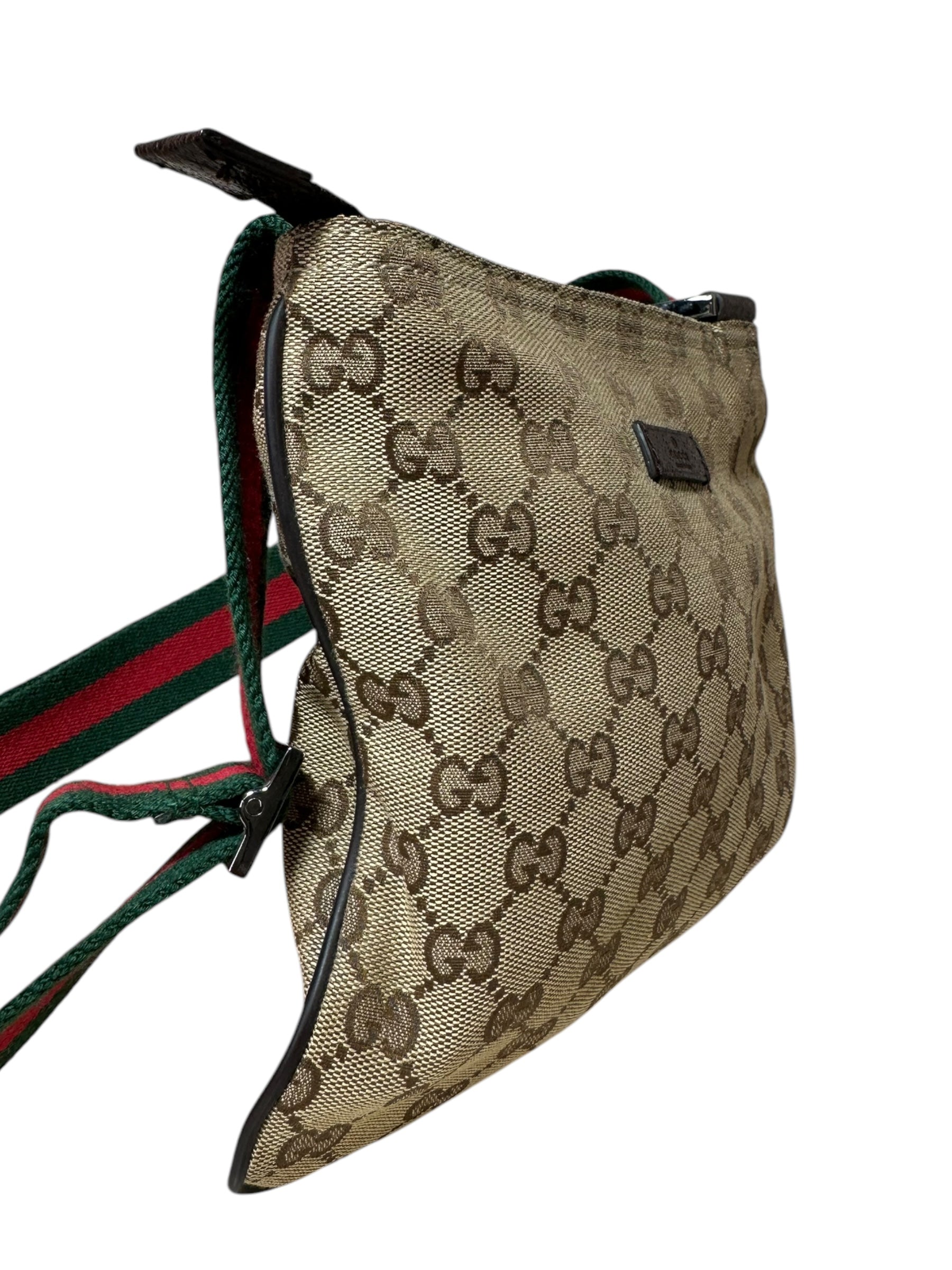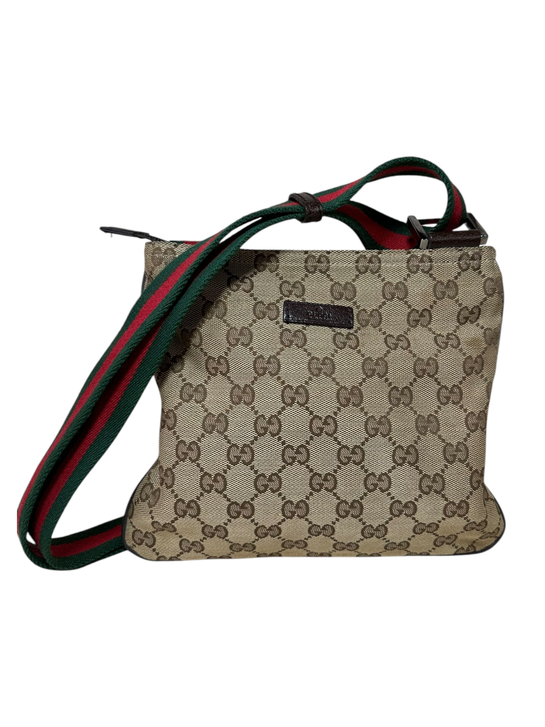 Iconica borsa a tracolla Gucci in tela GG Supreme beige/ebano, con dettagli in pelle marrone scuro e caratteristico nastro Web verde e rosso. Questo modello unisex, leggero e pratico, è ideale per l’uso quotidiano grazie alla sua struttura piatta e alla comoda chiusura con zip.