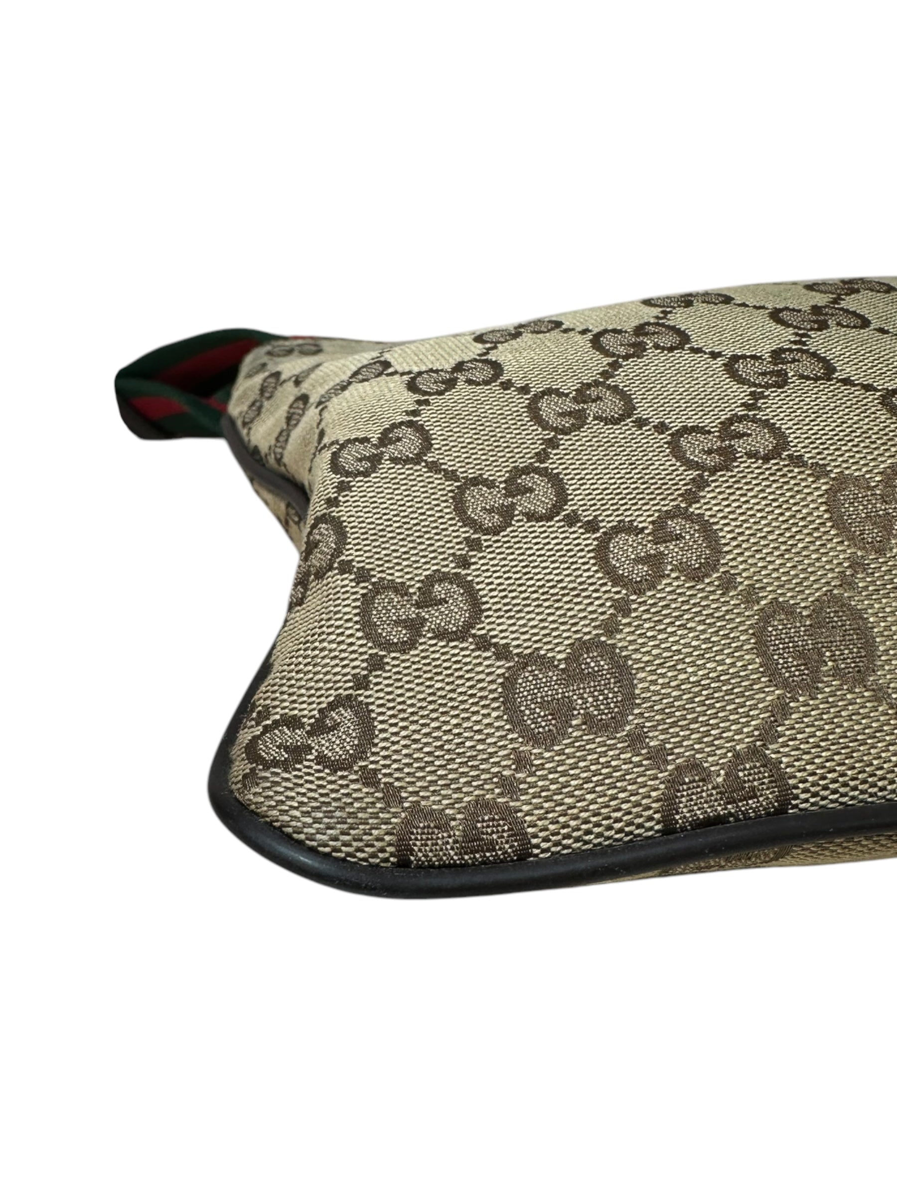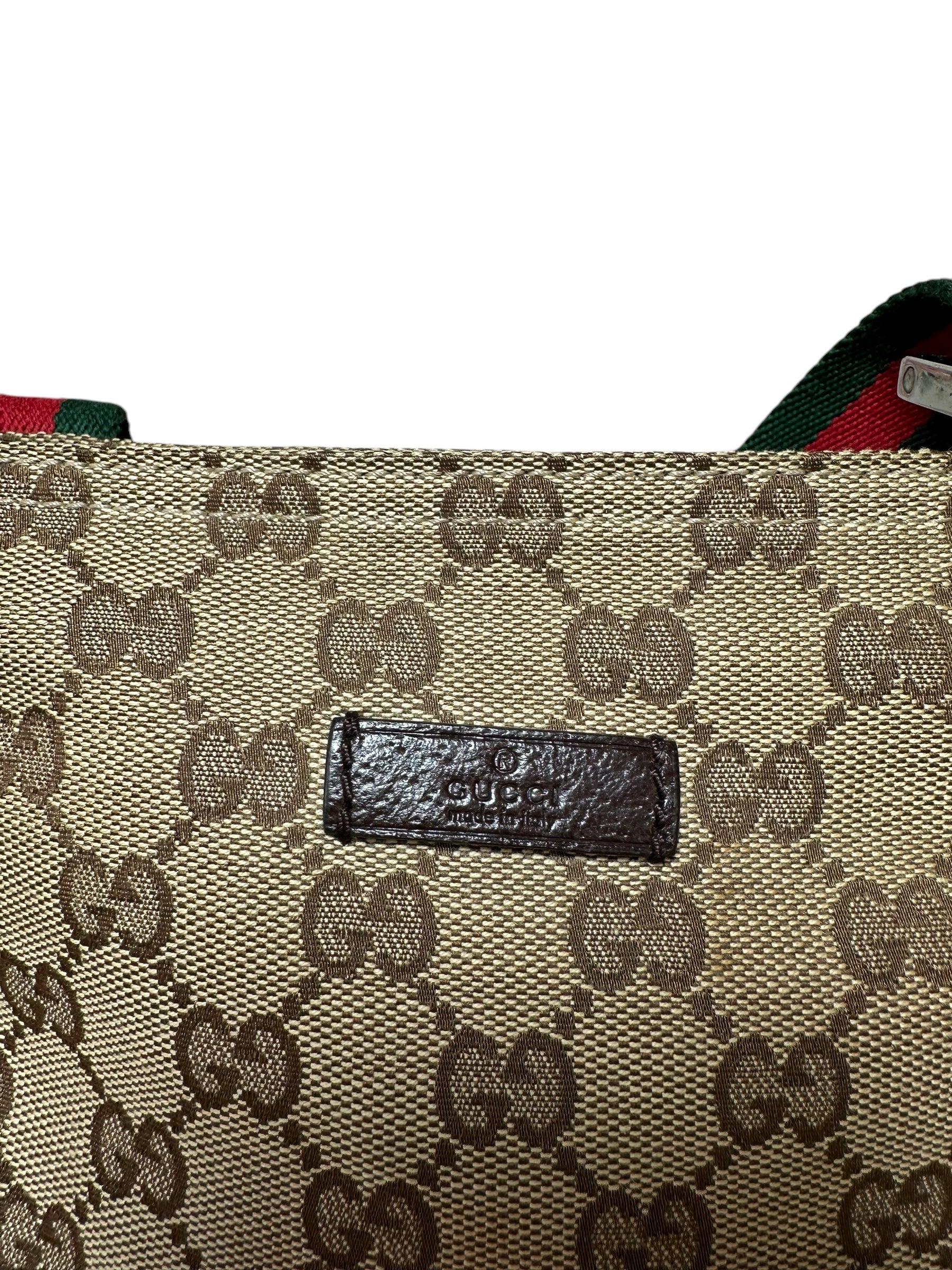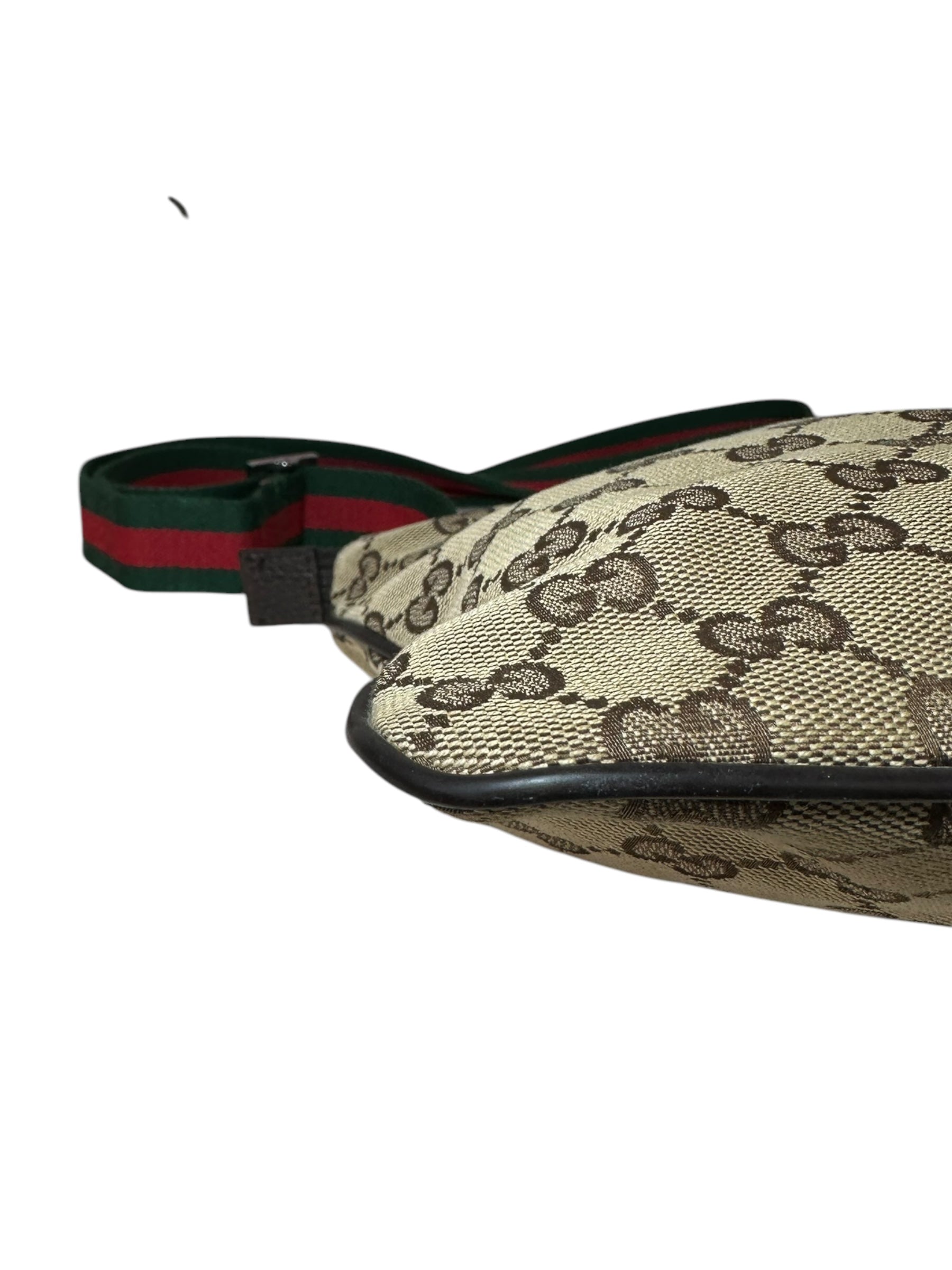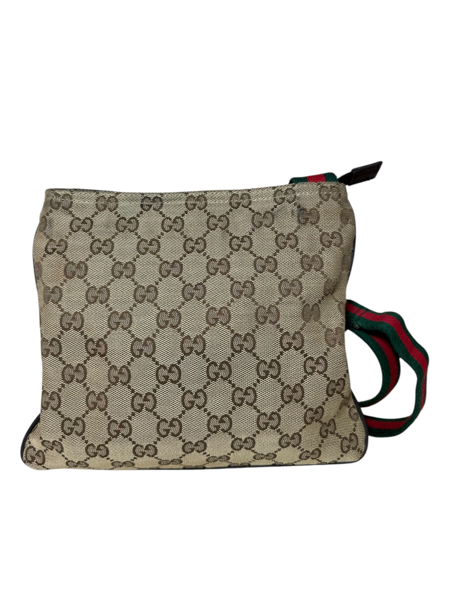Iconica borsa a tracolla Gucci in tela GG Supreme beige/ebano, con dettagli in pelle marrone scuro e caratteristico nastro Web verde e rosso. Questo modello unisex, leggero e pratico, è ideale per l’uso quotidiano grazie alla sua struttura piatta e alla comoda chiusura con zip.