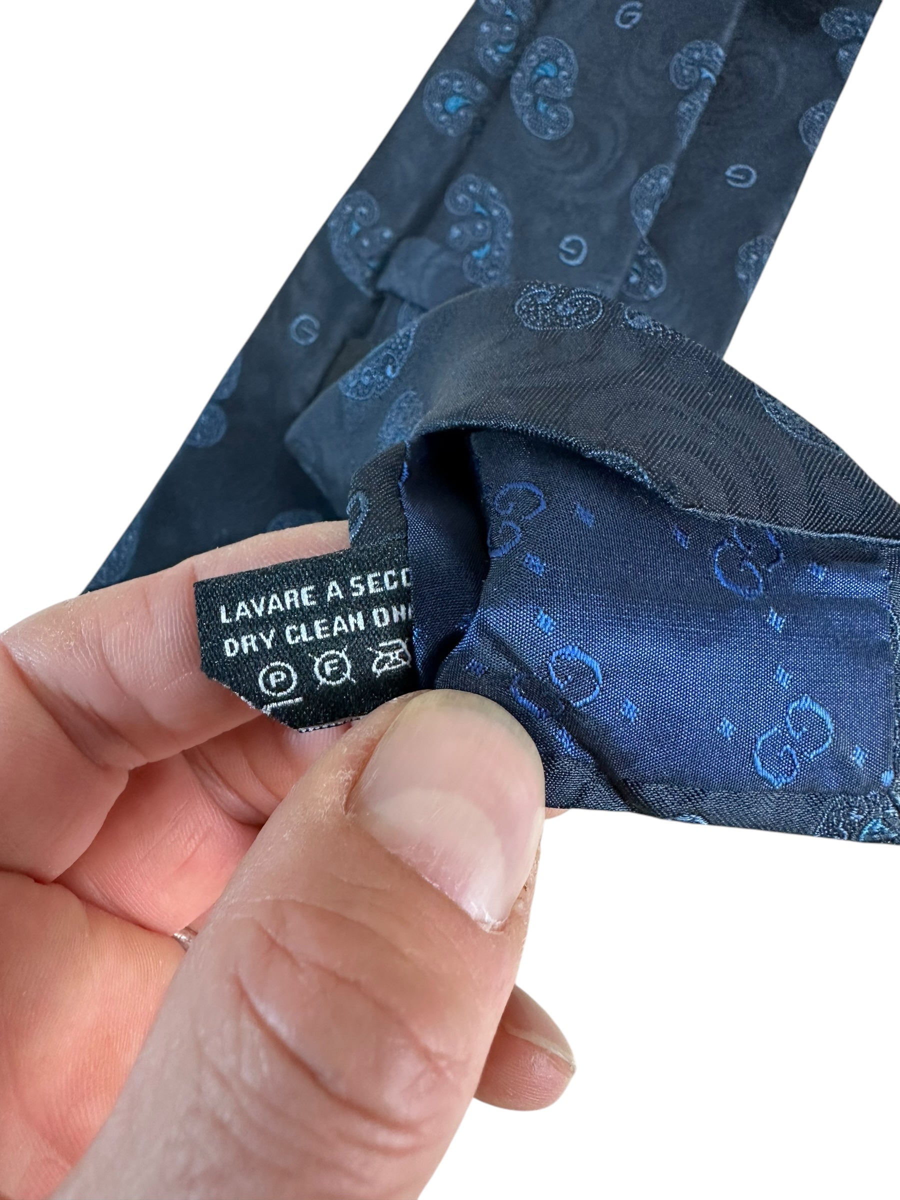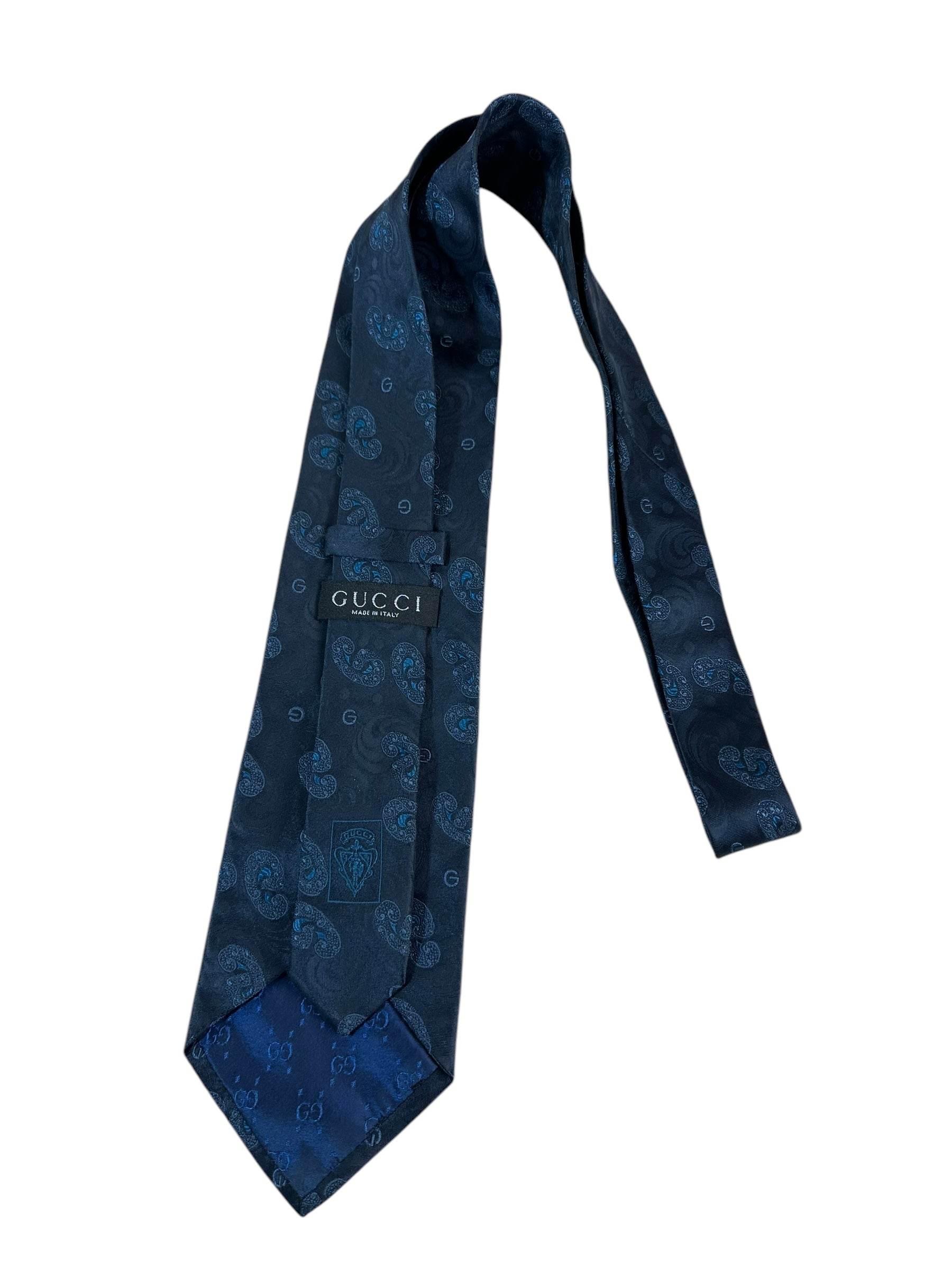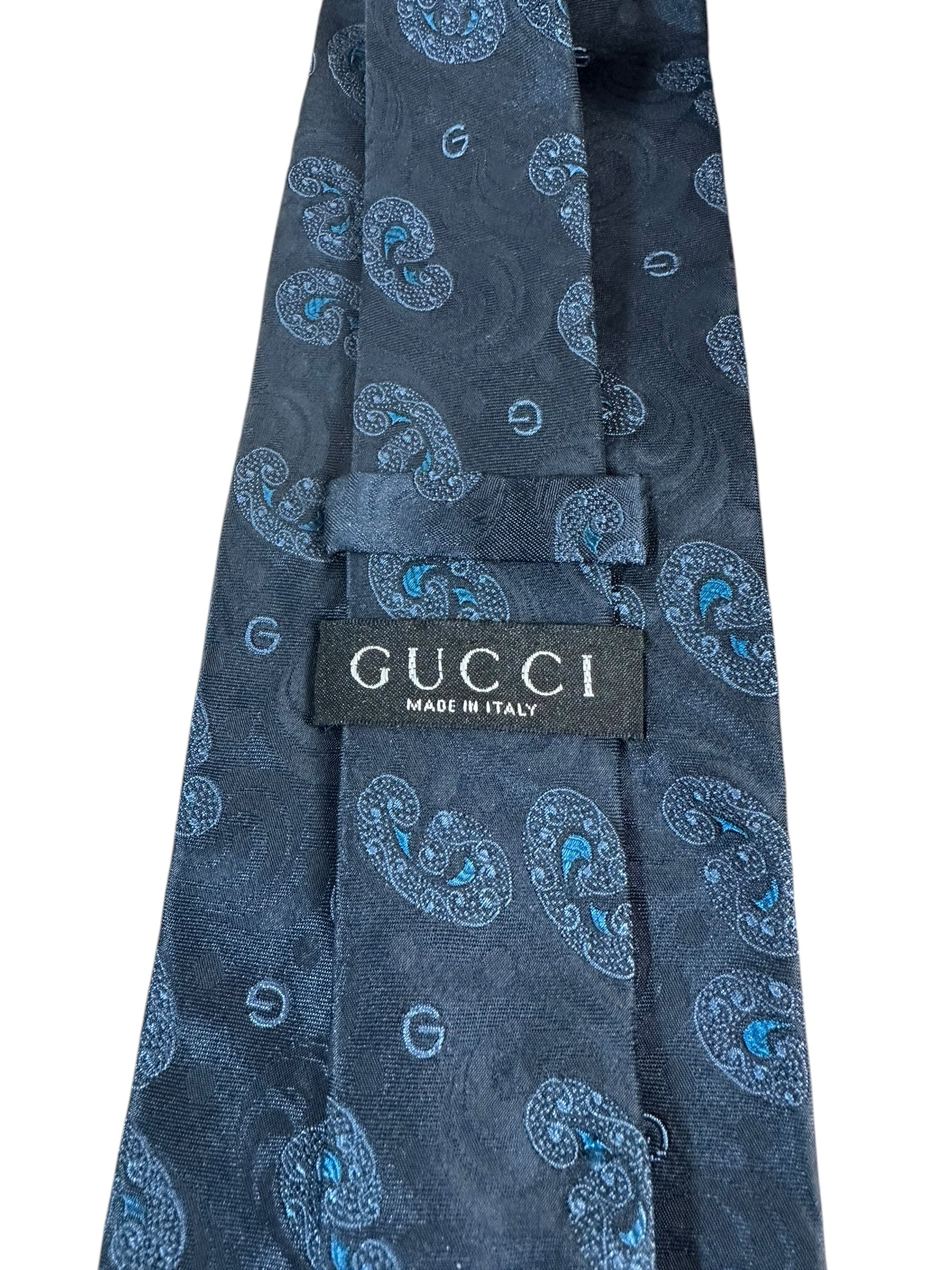 Gucci cravatta in seta con un design elegante e sofisticato. È realizzata icon un motivo jacquard decorativo caratterizzato da un pattern paisley stilizzato in tonalità blu. La base della cravatta è di colore blu scuro (quasi nero), che esalta il contrasto con i dettagli più chiari e lucidi. Il motivo presenta un effetto leggermente tridimensionale, tipico delle lavorazioni di alta qualità.