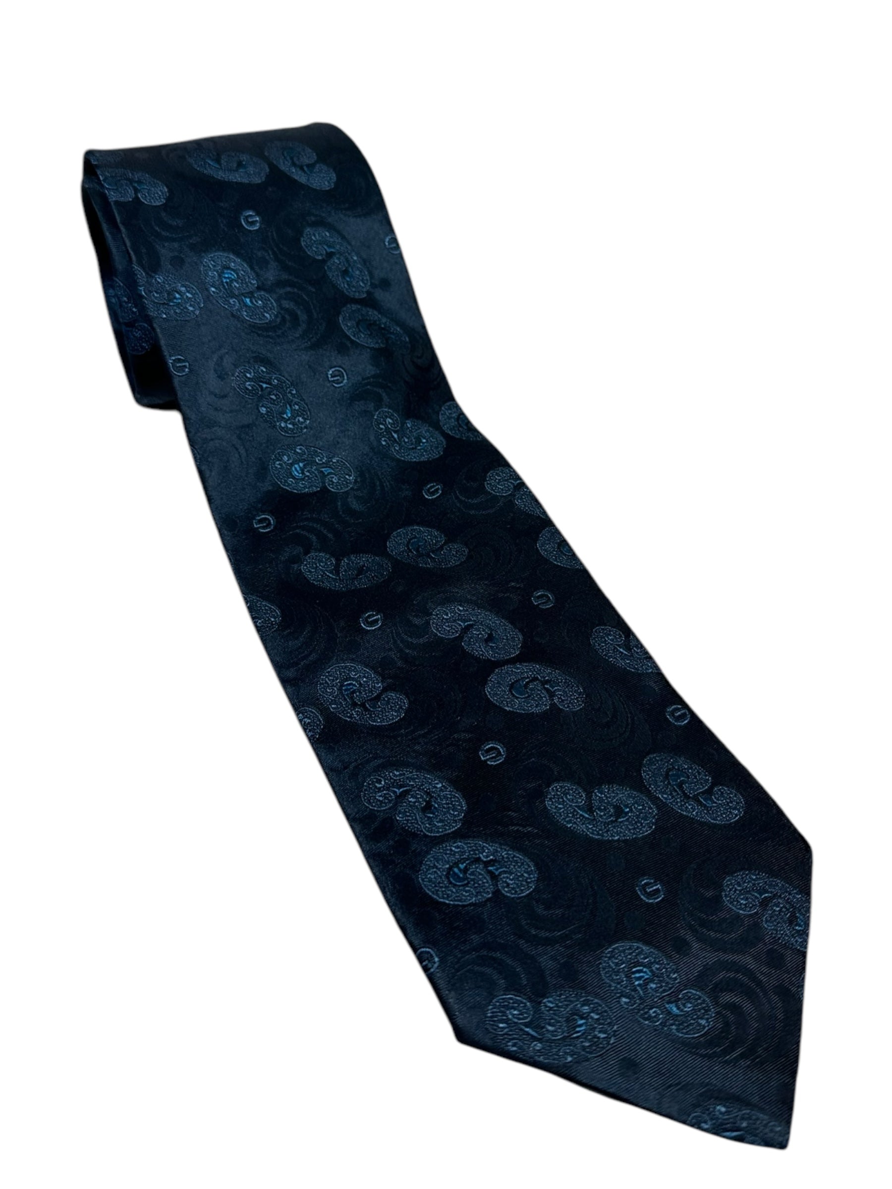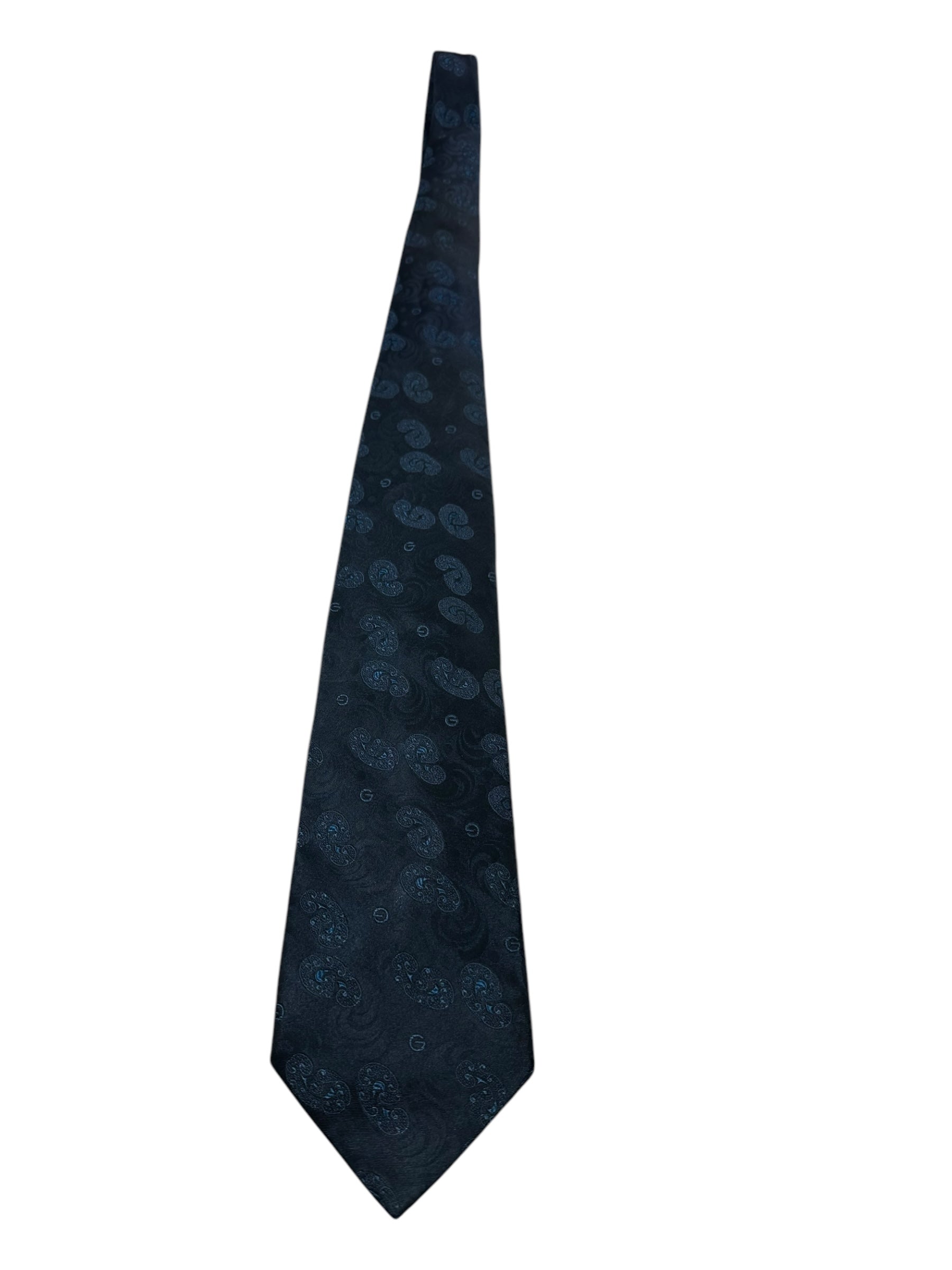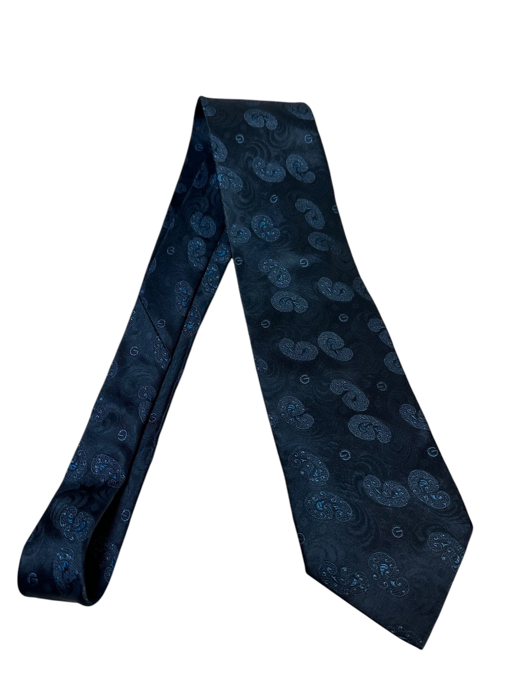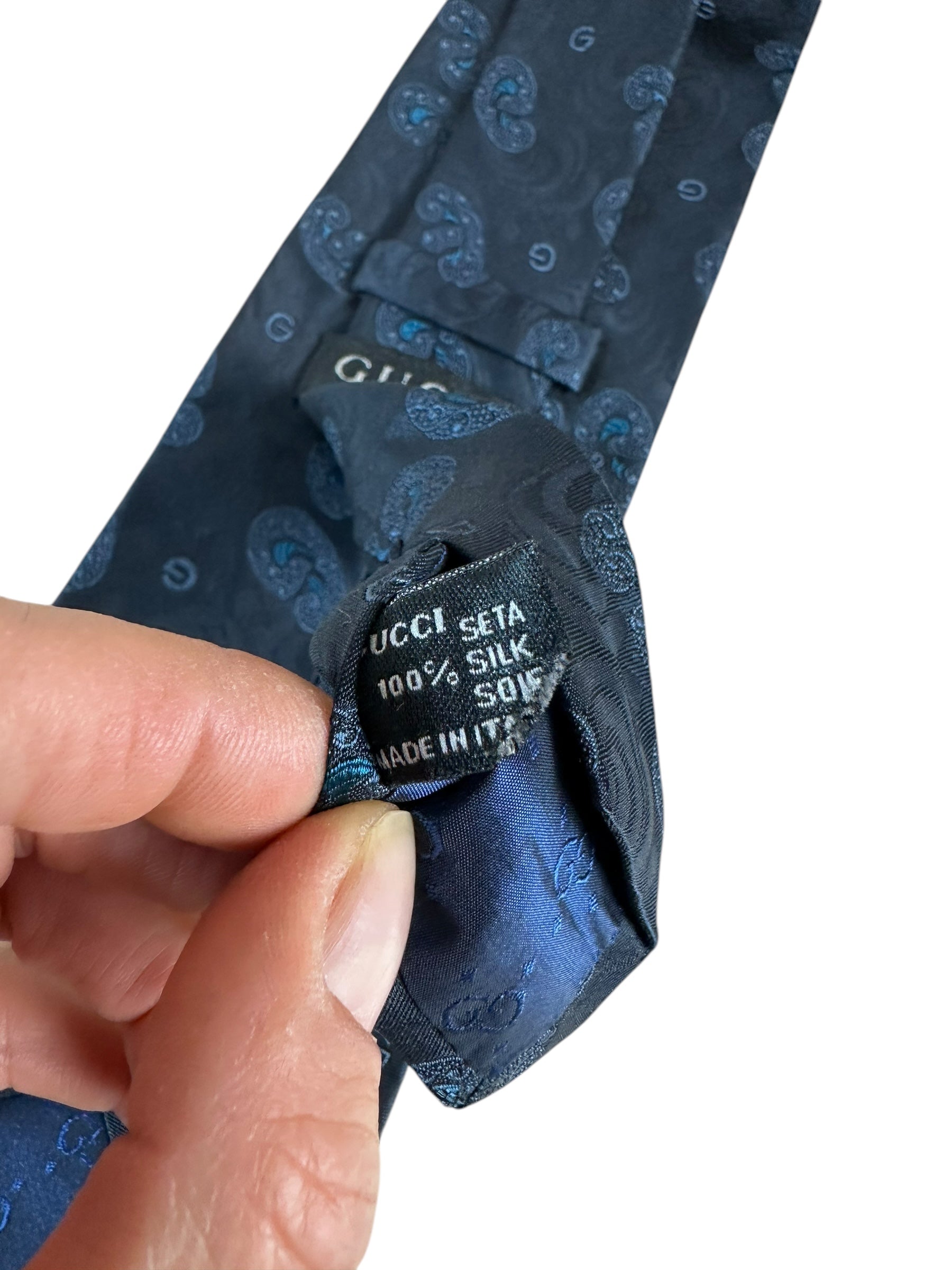 Gucci cravatta in seta con un design elegante e sofisticato. È realizzata icon un motivo jacquard decorativo caratterizzato da un pattern paisley stilizzato in tonalità blu. La base della cravatta è di colore blu scuro (quasi nero), che esalta il contrasto con i dettagli più chiari e lucidi. Il motivo presenta un effetto leggermente tridimensionale, tipico delle lavorazioni di alta qualità.