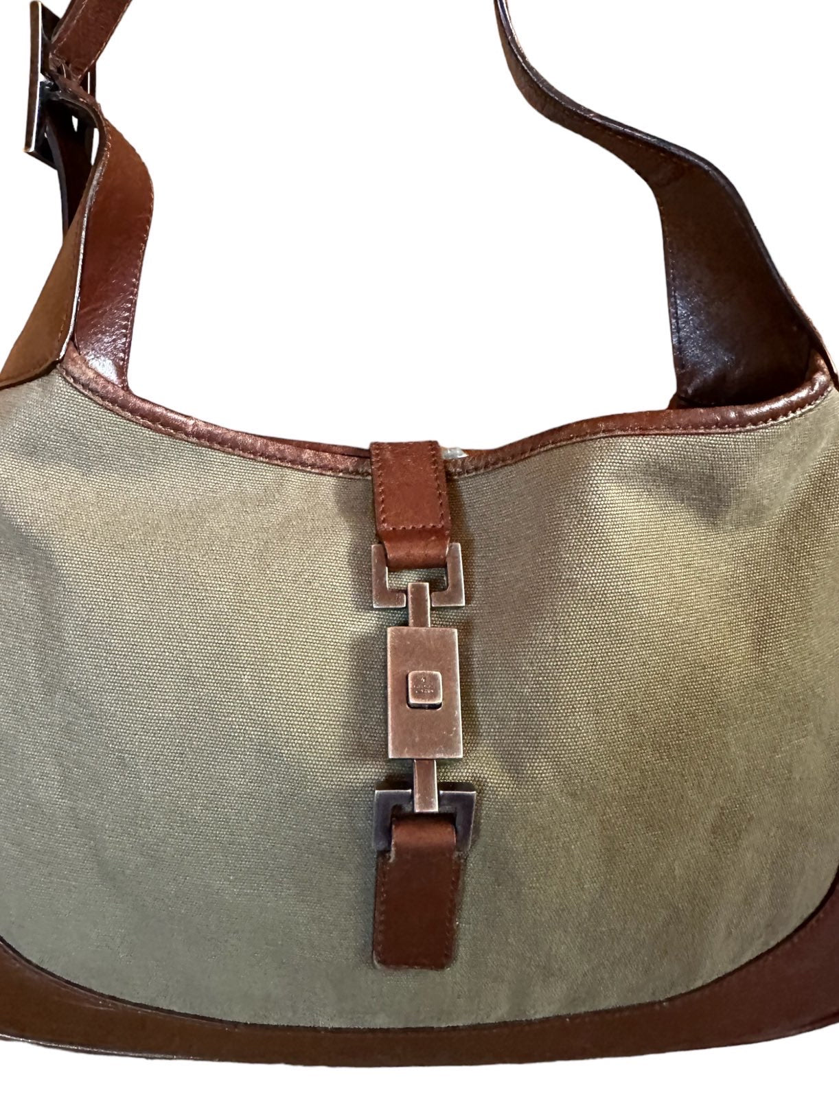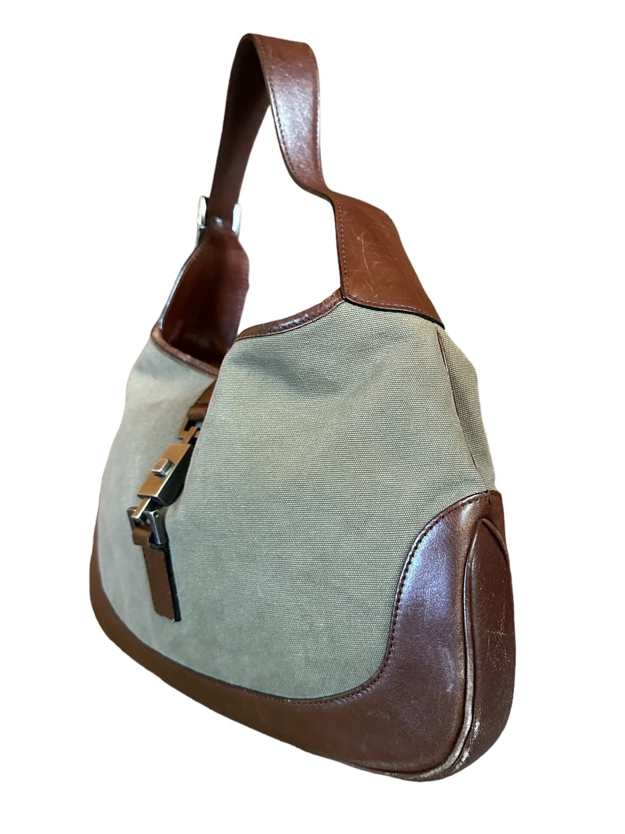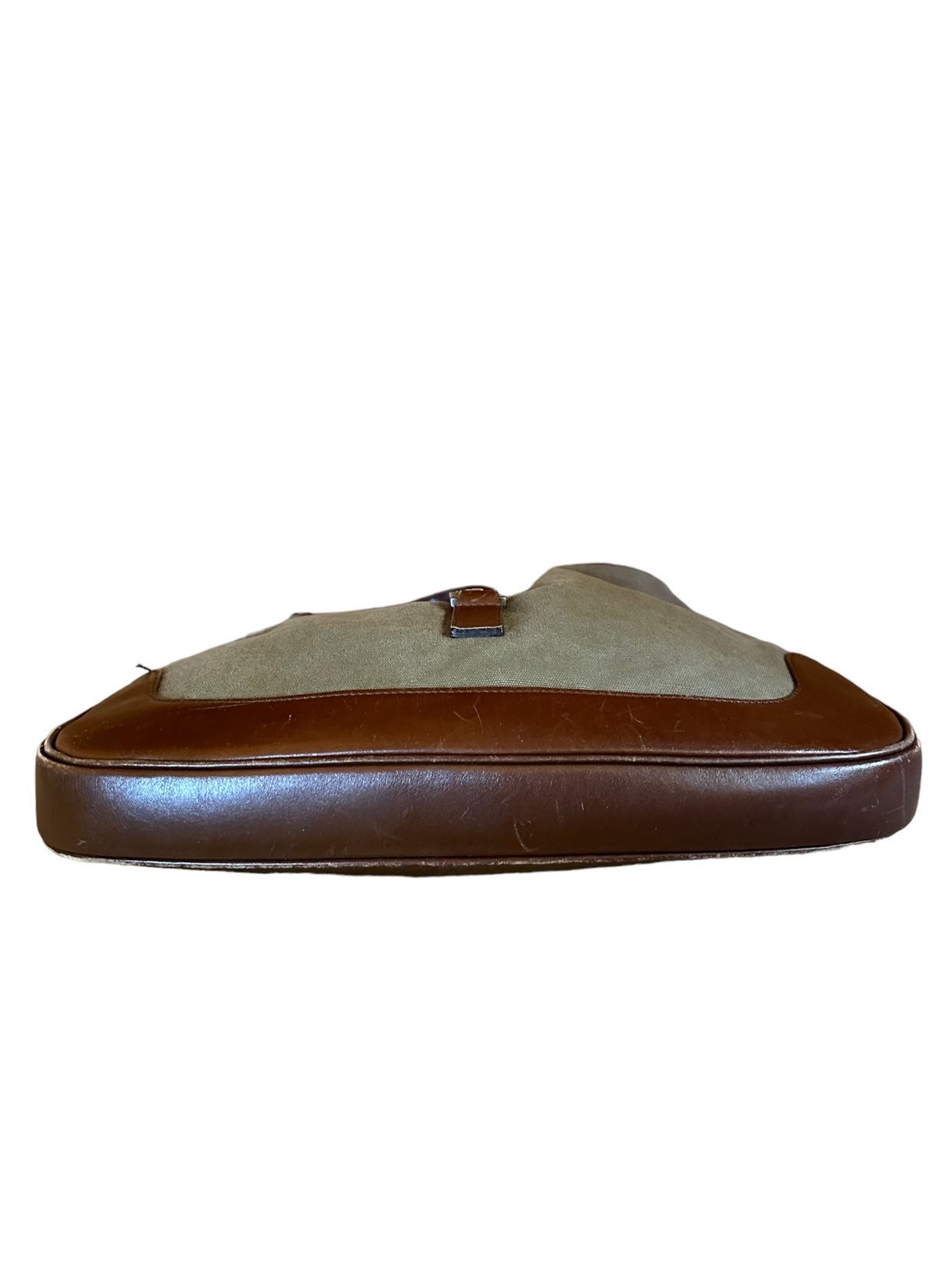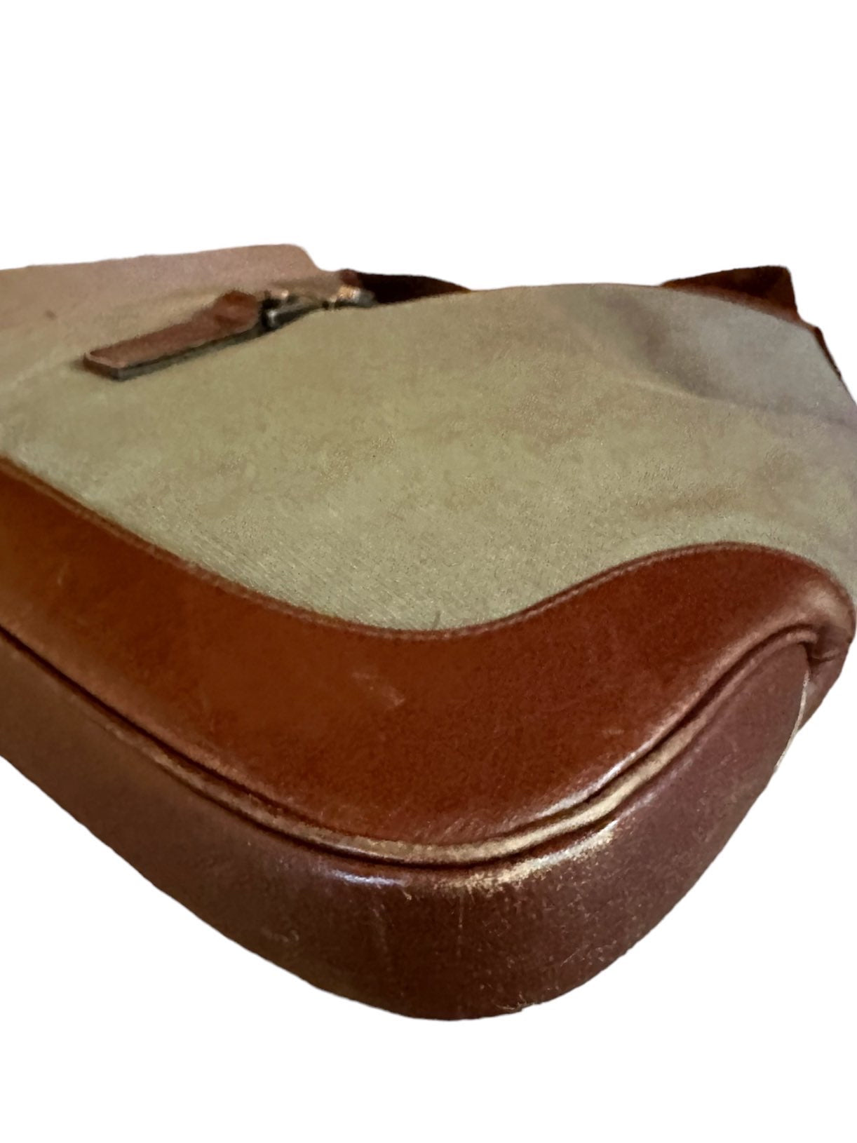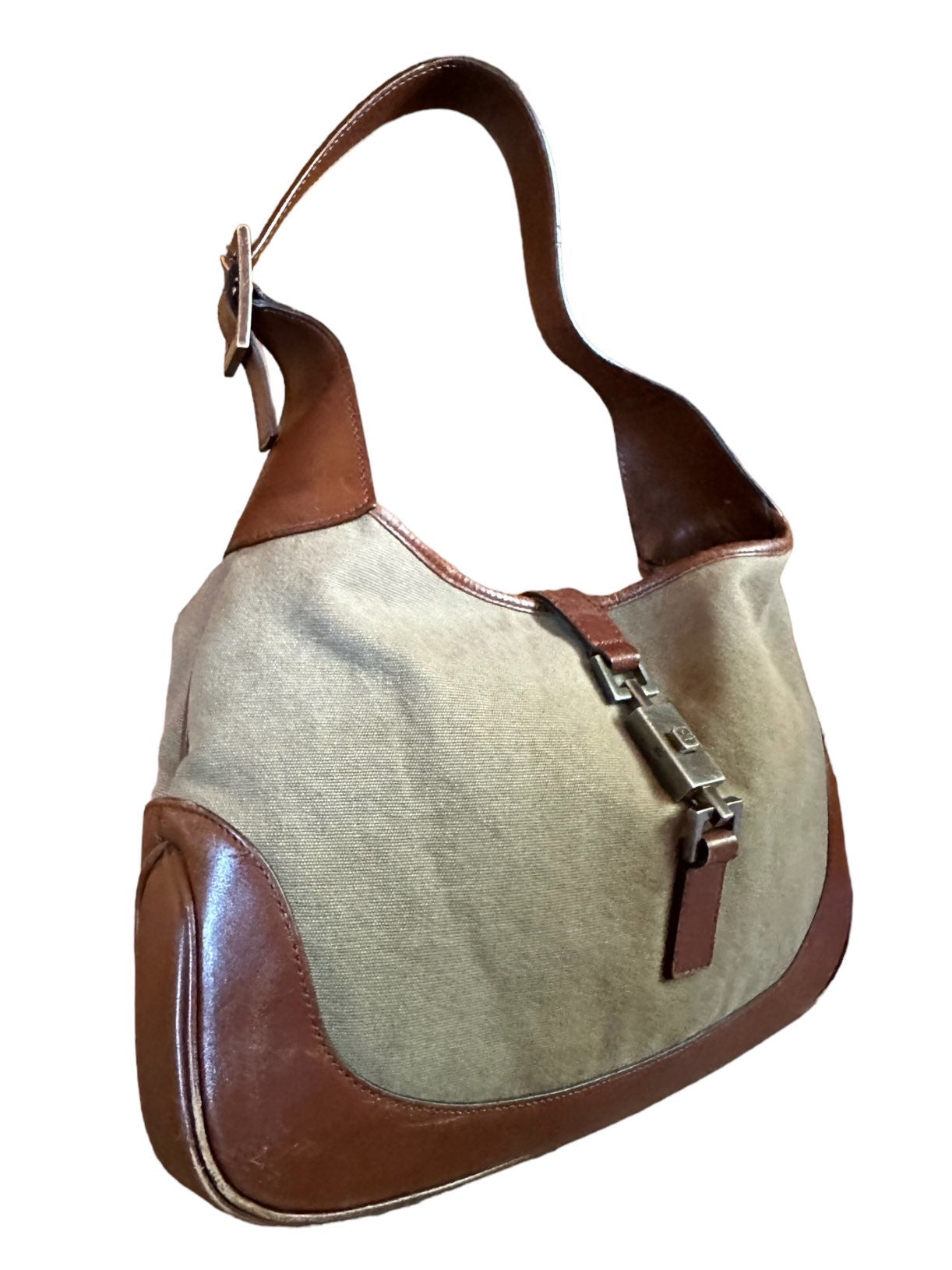 Gucci jackie borsa vintage in tela color sabbia, profili e manico in pelle marrone con chiusura a gancio automatico. Dispone di uno spazio ampio all’interno con taschino a zip. Segni di usura sugli angoli. Misura media. Buono stato.
