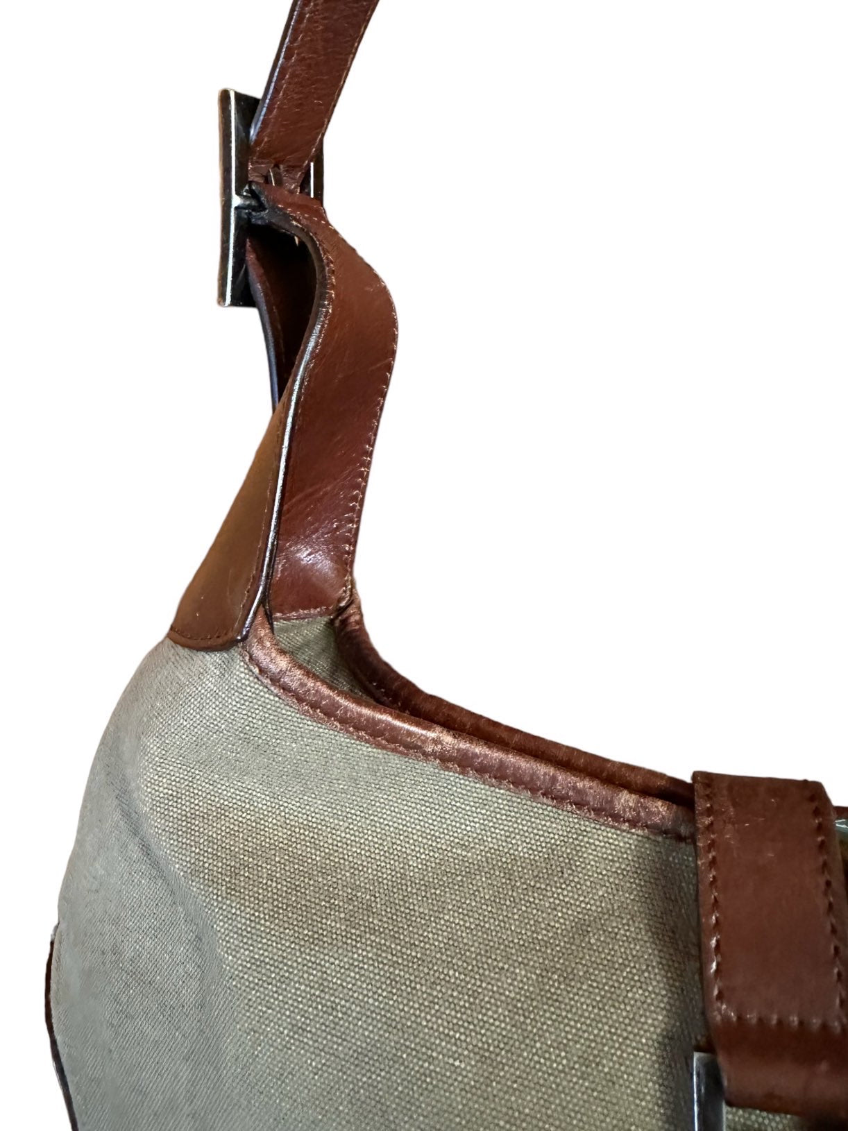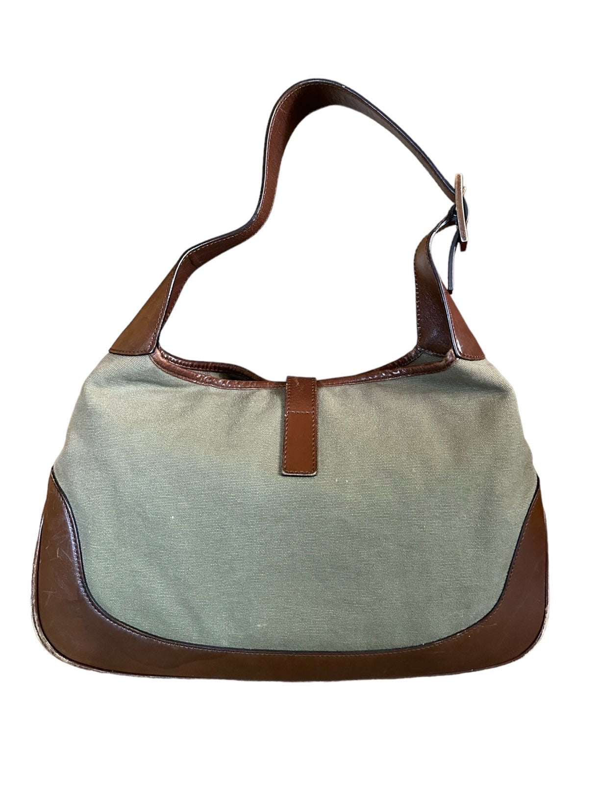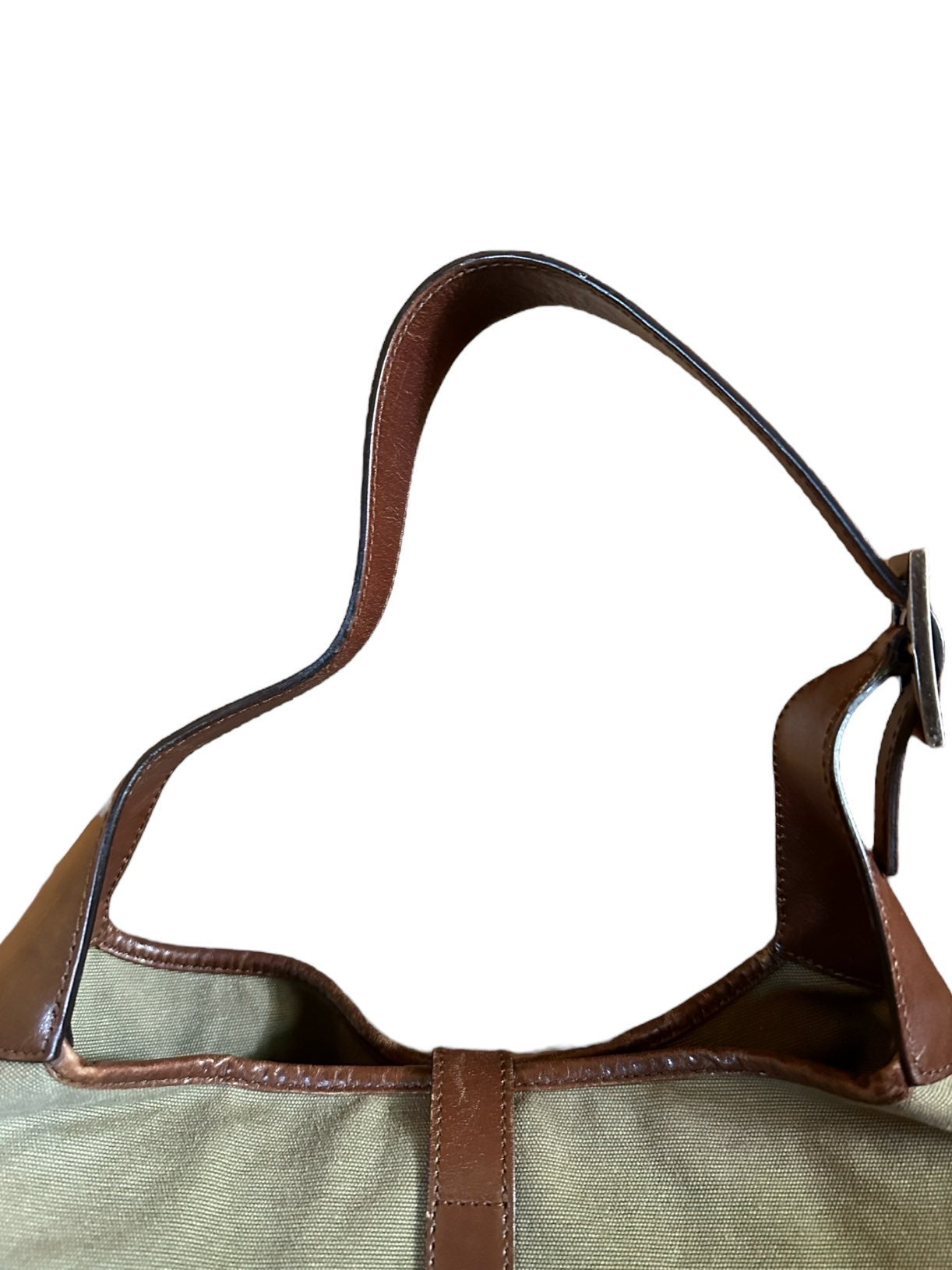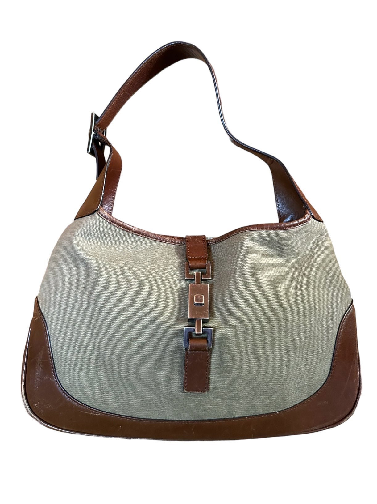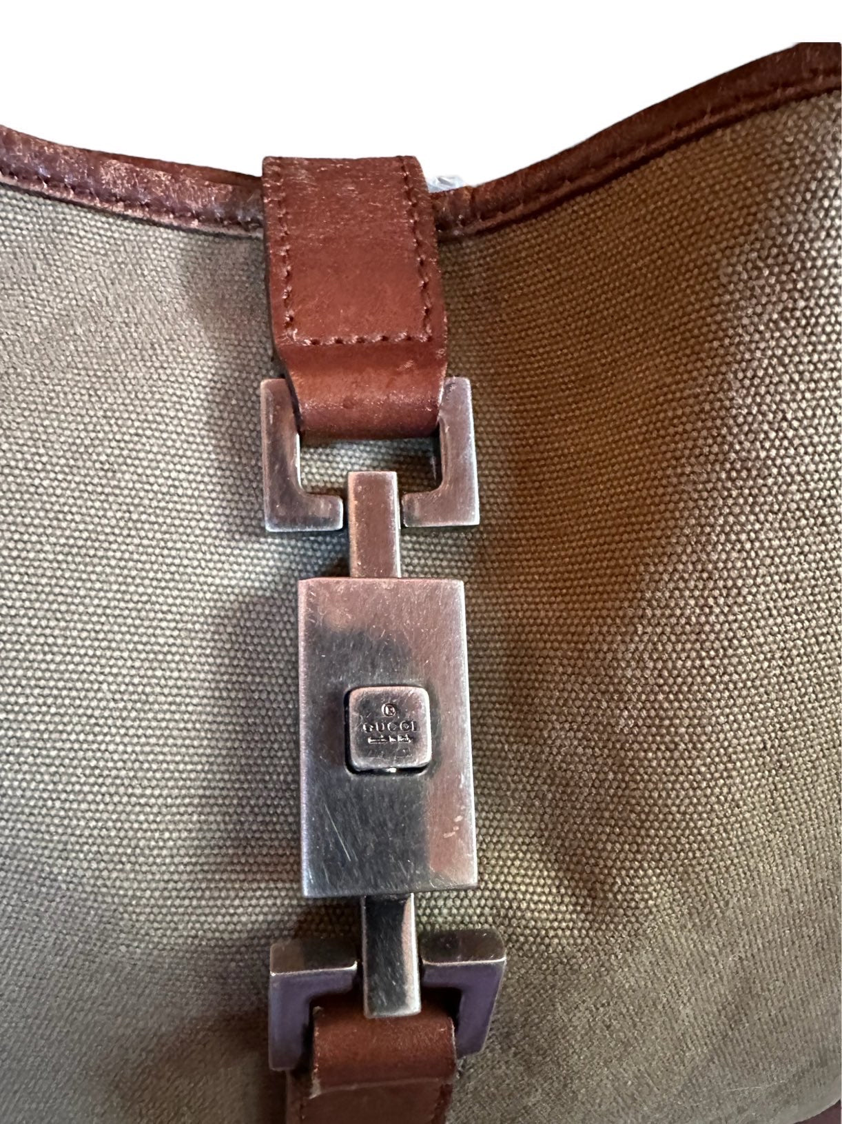 Gucci jackie borsa vintage in tela color sabbia, profili e manico in pelle marrone con chiusura a gancio automatico. Dispone di uno spazio ampio all’interno con taschino a zip. Segni di usura sugli angoli. Misura media. Buono stato.