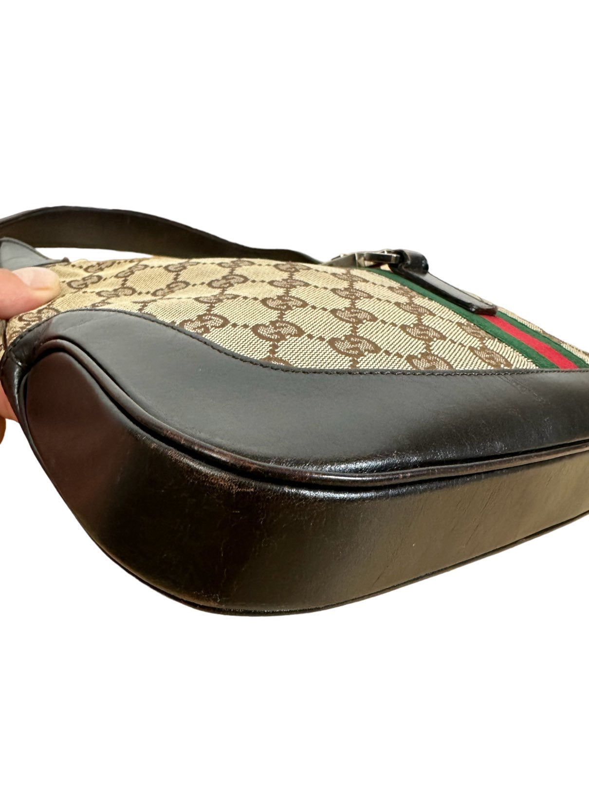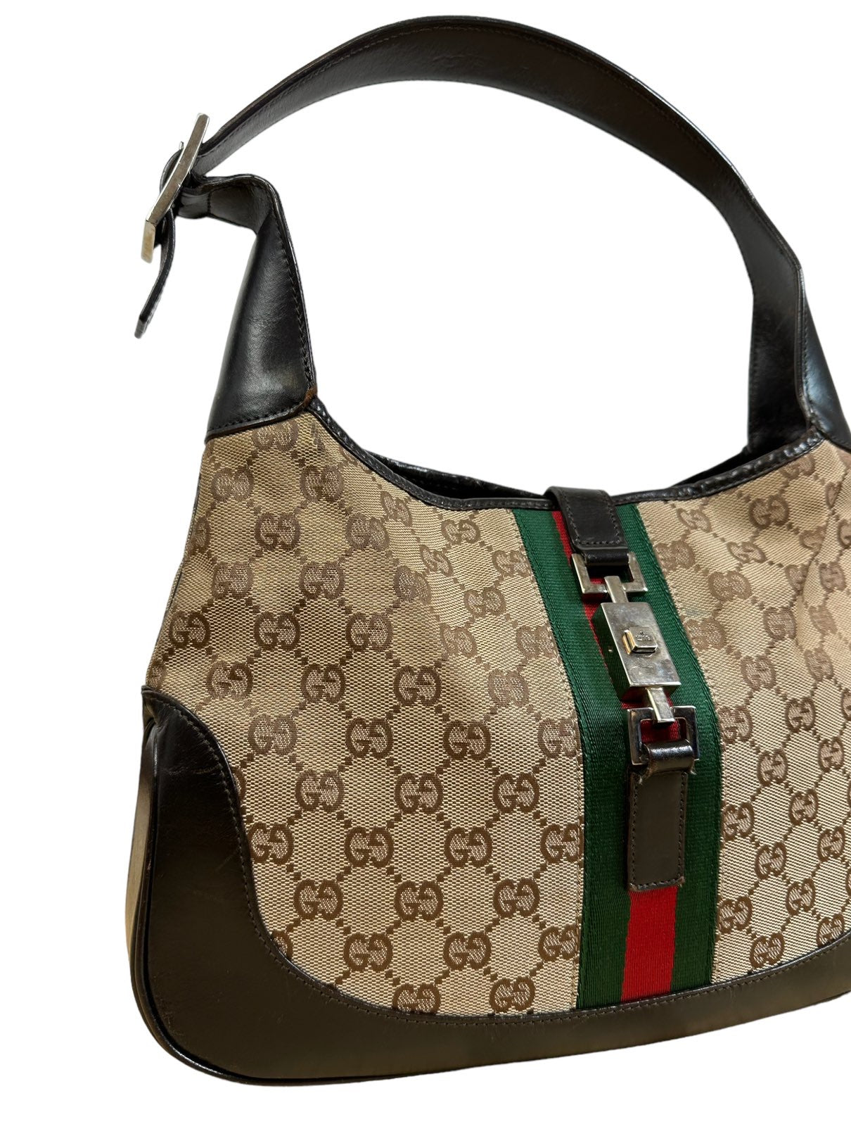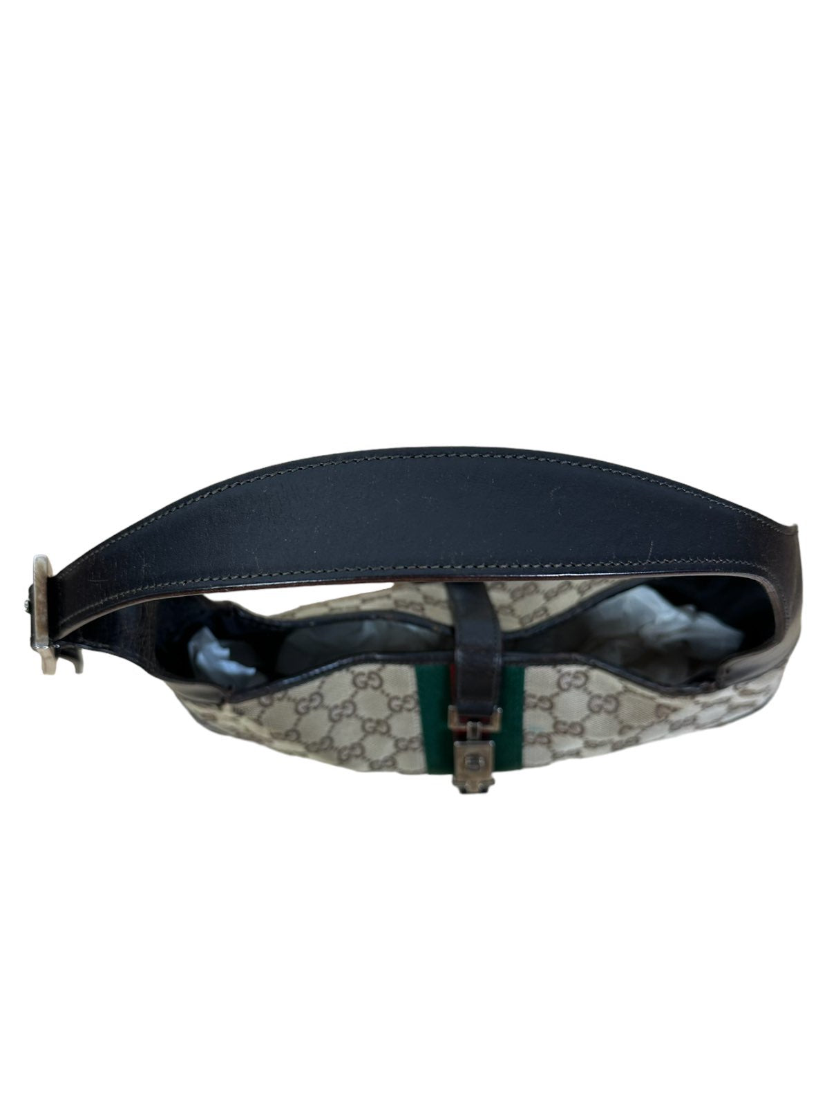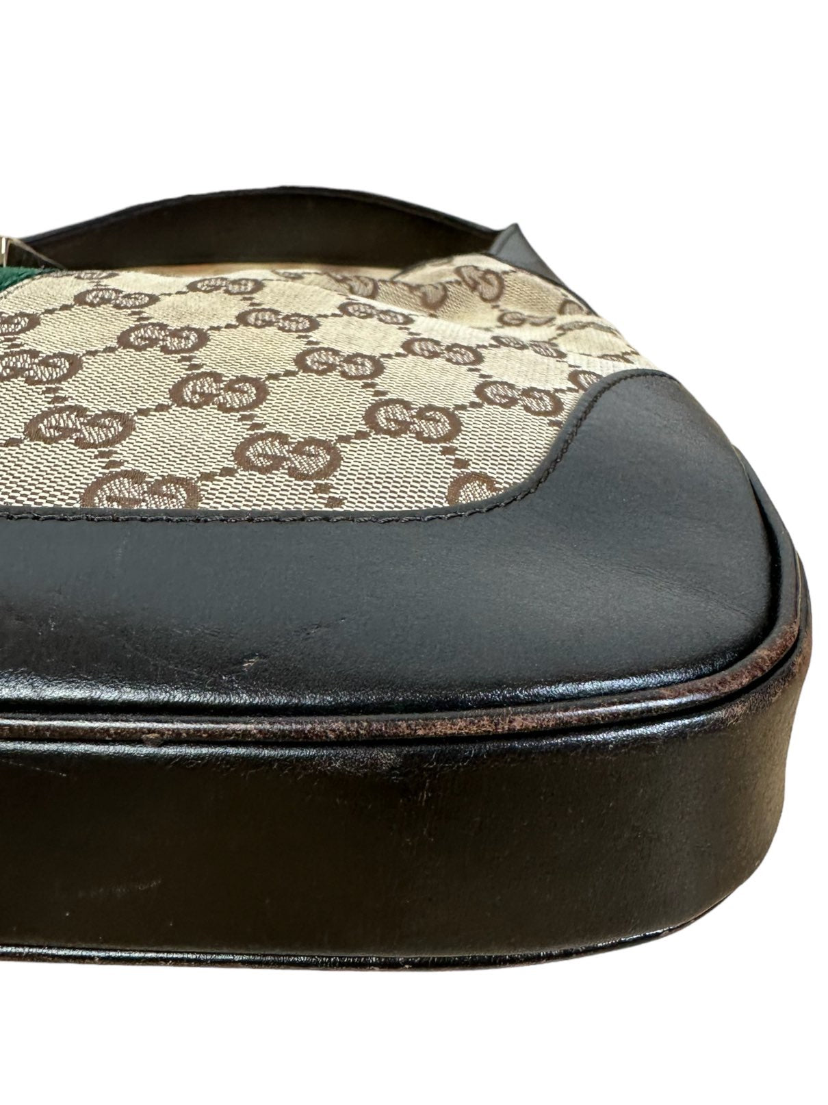 Gucci Jackie vintage in tela GG con profili e manico in pelle, banda verde e rossa sul davanti con chiusura automatica in metallo. Presenta un piccolo macchiolina poco visibile sul davanti e un piccolo segno di usura sul tela. Interno con taschino a zip. Angoli in pelle con lievi segni di usura.