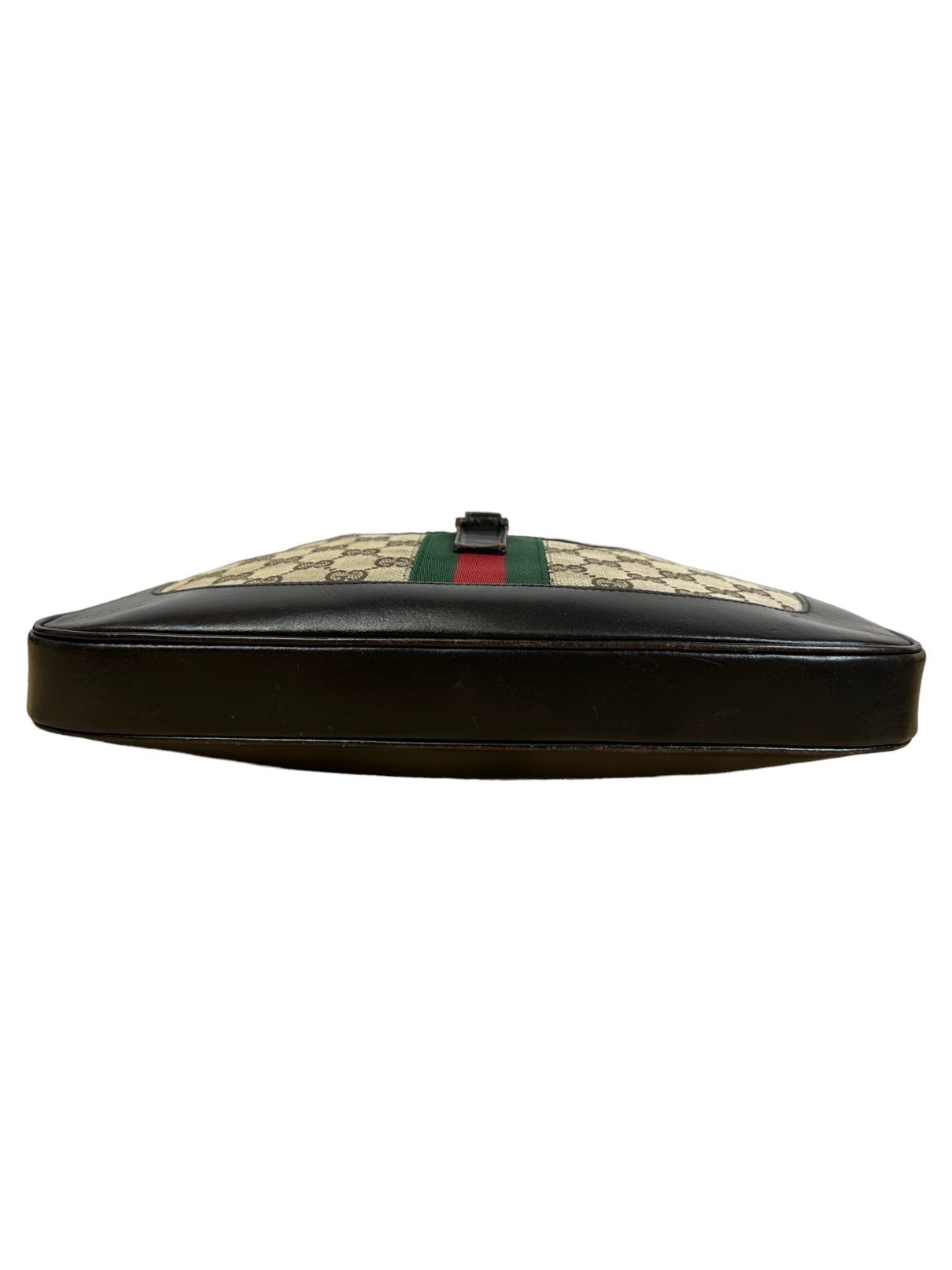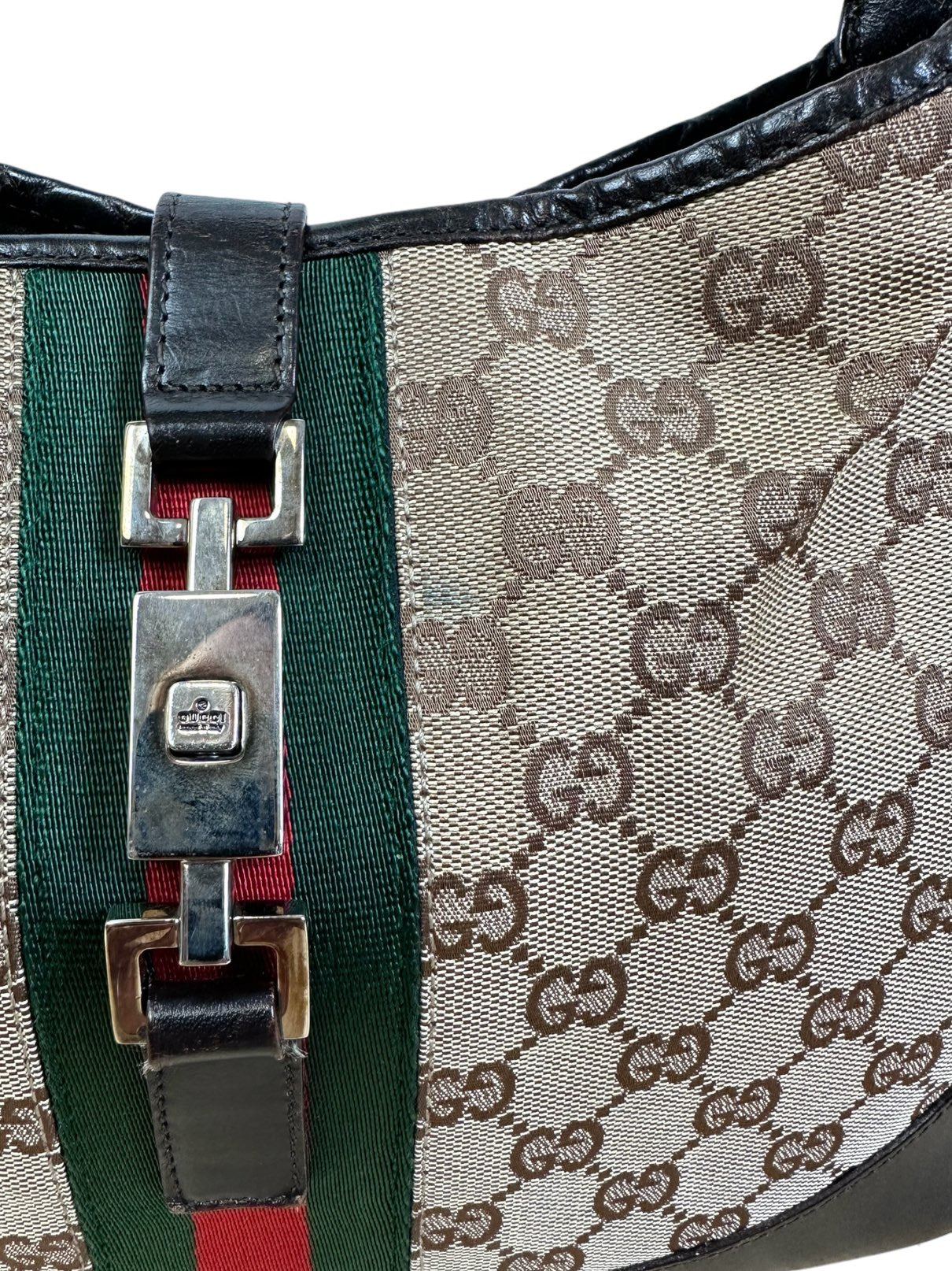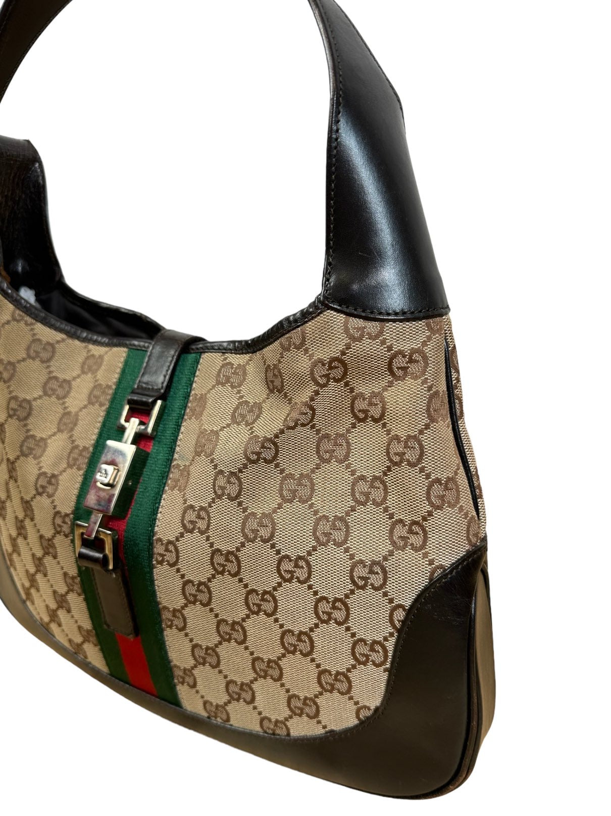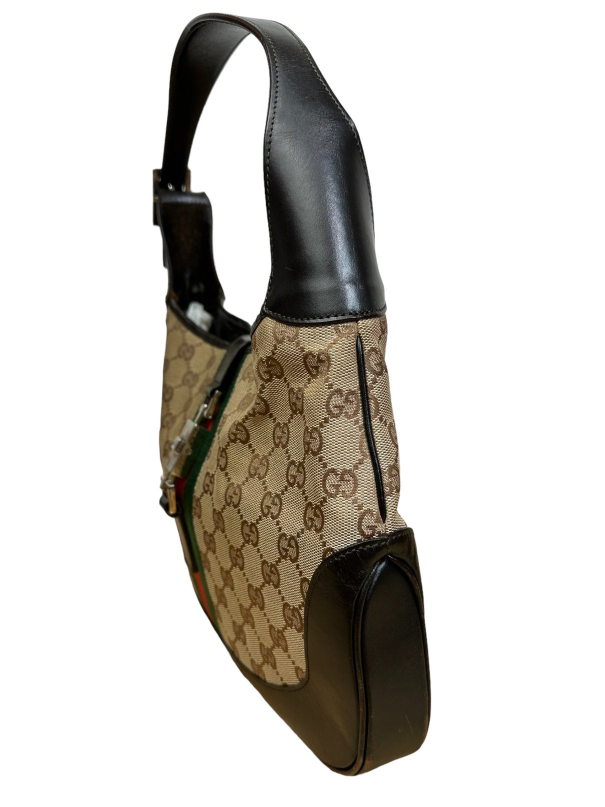 Gucci Jackie vintage in tela GG con profili e manico in pelle, banda verde e rossa sul davanti con chiusura automatica in metallo. Presenta un piccolo macchiolina poco visibile sul davanti e un piccolo segno di usura sul tela. Interno con taschino a zip. Angoli in pelle con lievi segni di usura.