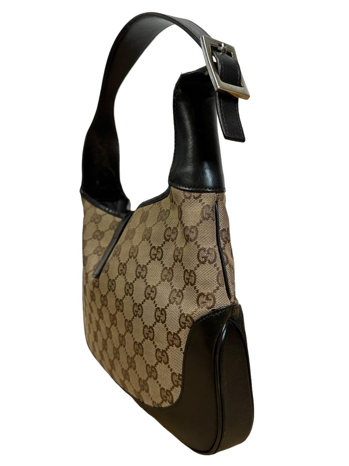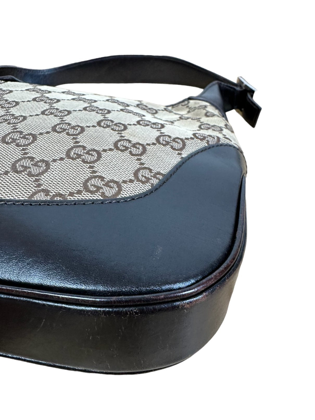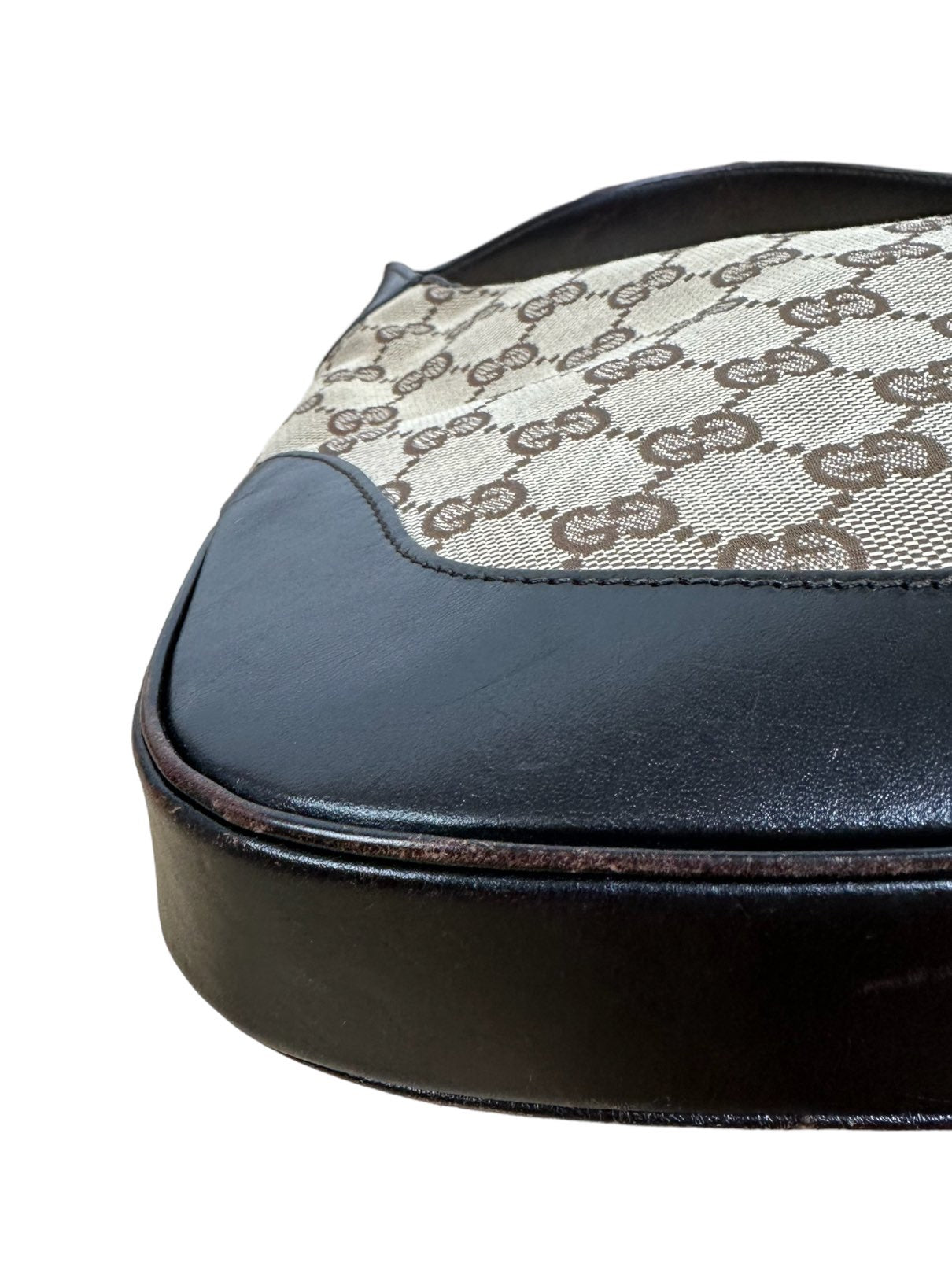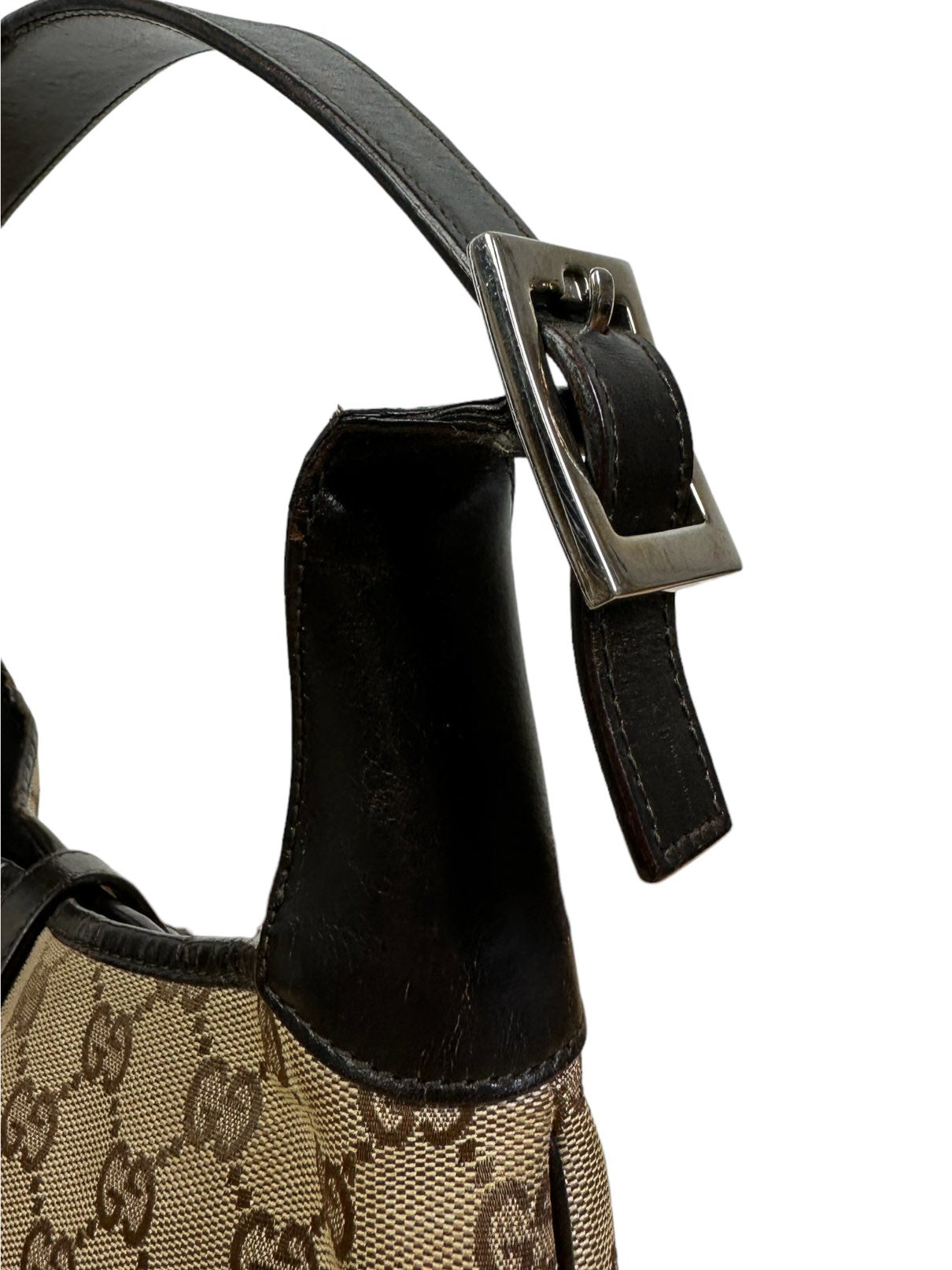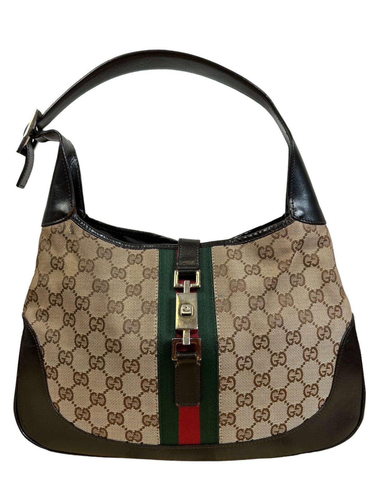 Gucci Jackie vintage in tela GG con profili e manico in pelle, banda verde e rossa sul davanti con chiusura automatica in metallo. Presenta un piccolo macchiolina poco visibile sul davanti e un piccolo segno di usura sul tela. Interno con taschino a zip. Angoli in pelle con lievi segni di usura.