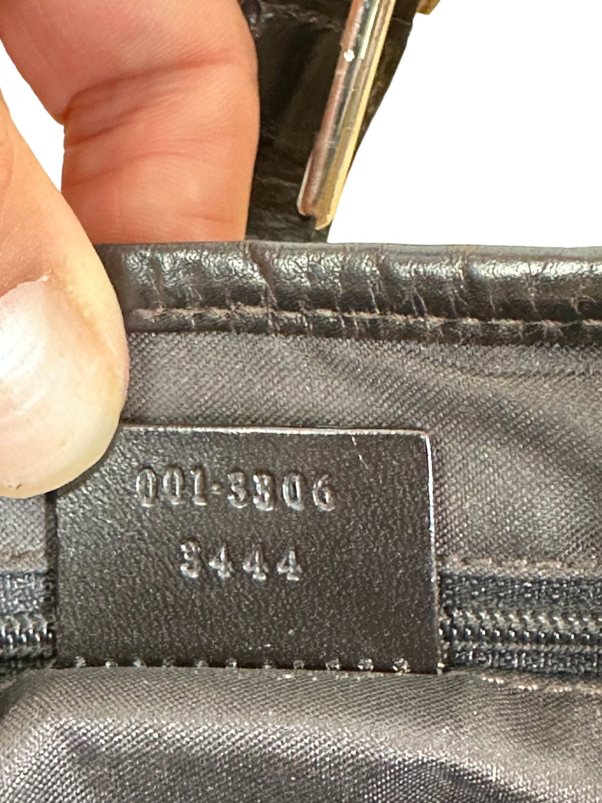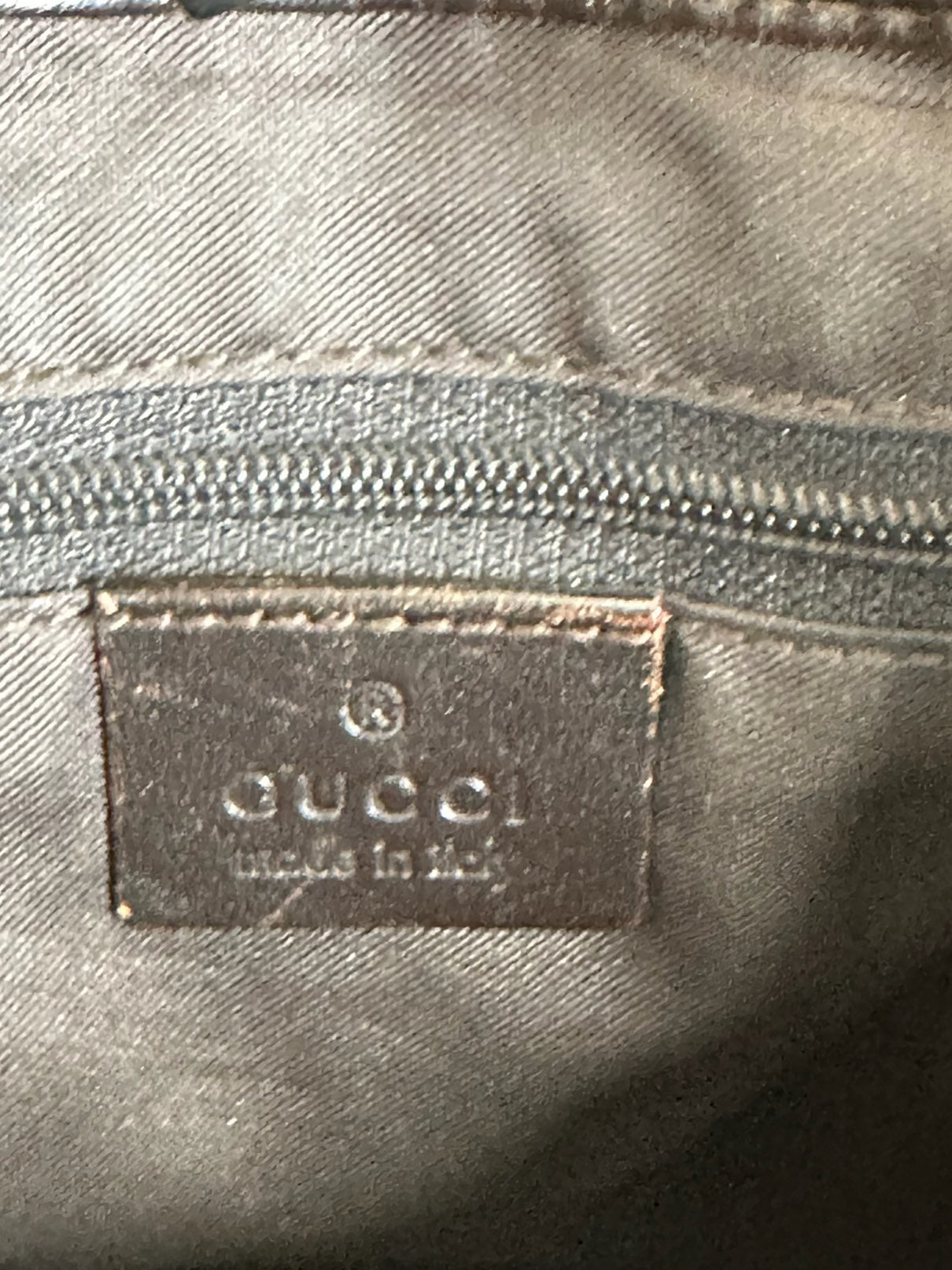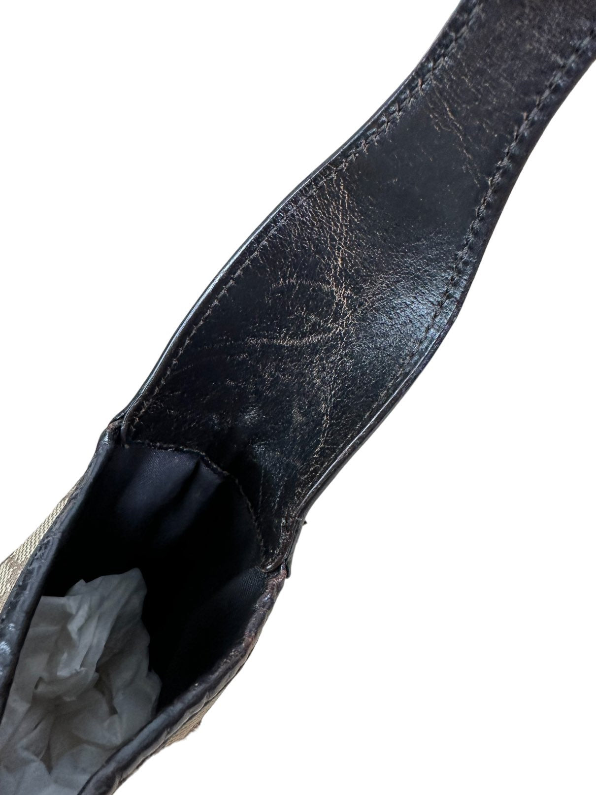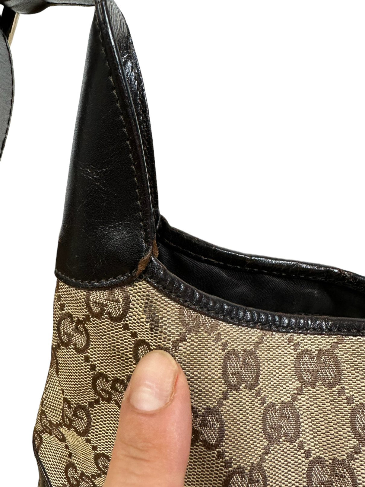 Gucci Jackie vintage in tela GG con profili e manico in pelle, banda verde e rossa sul davanti con chiusura automatica in metallo. Presenta un piccolo macchiolina poco visibile sul davanti e un piccolo segno di usura sul tela. Interno con taschino a zip. Angoli in pelle con lievi segni di usura.