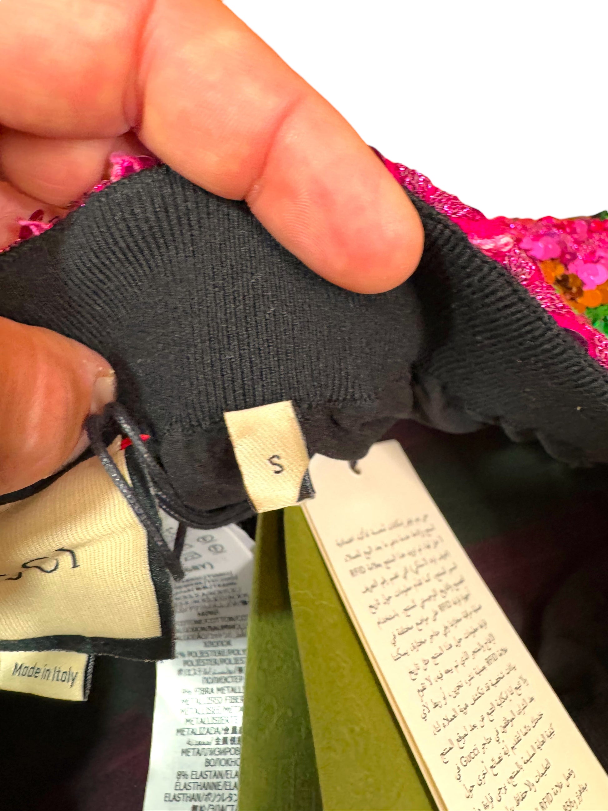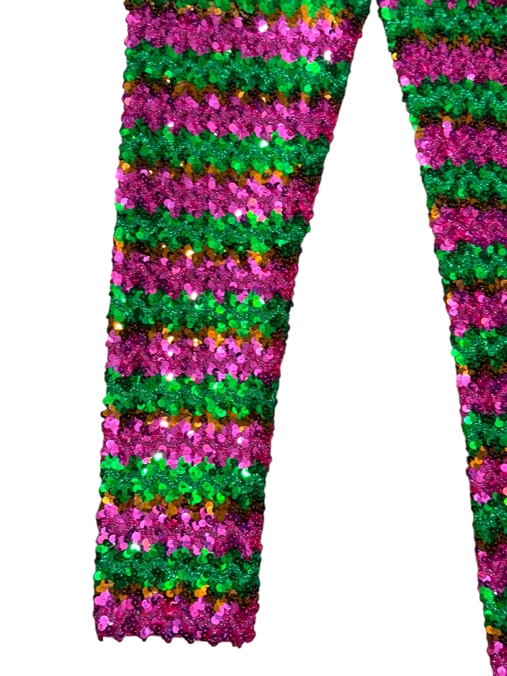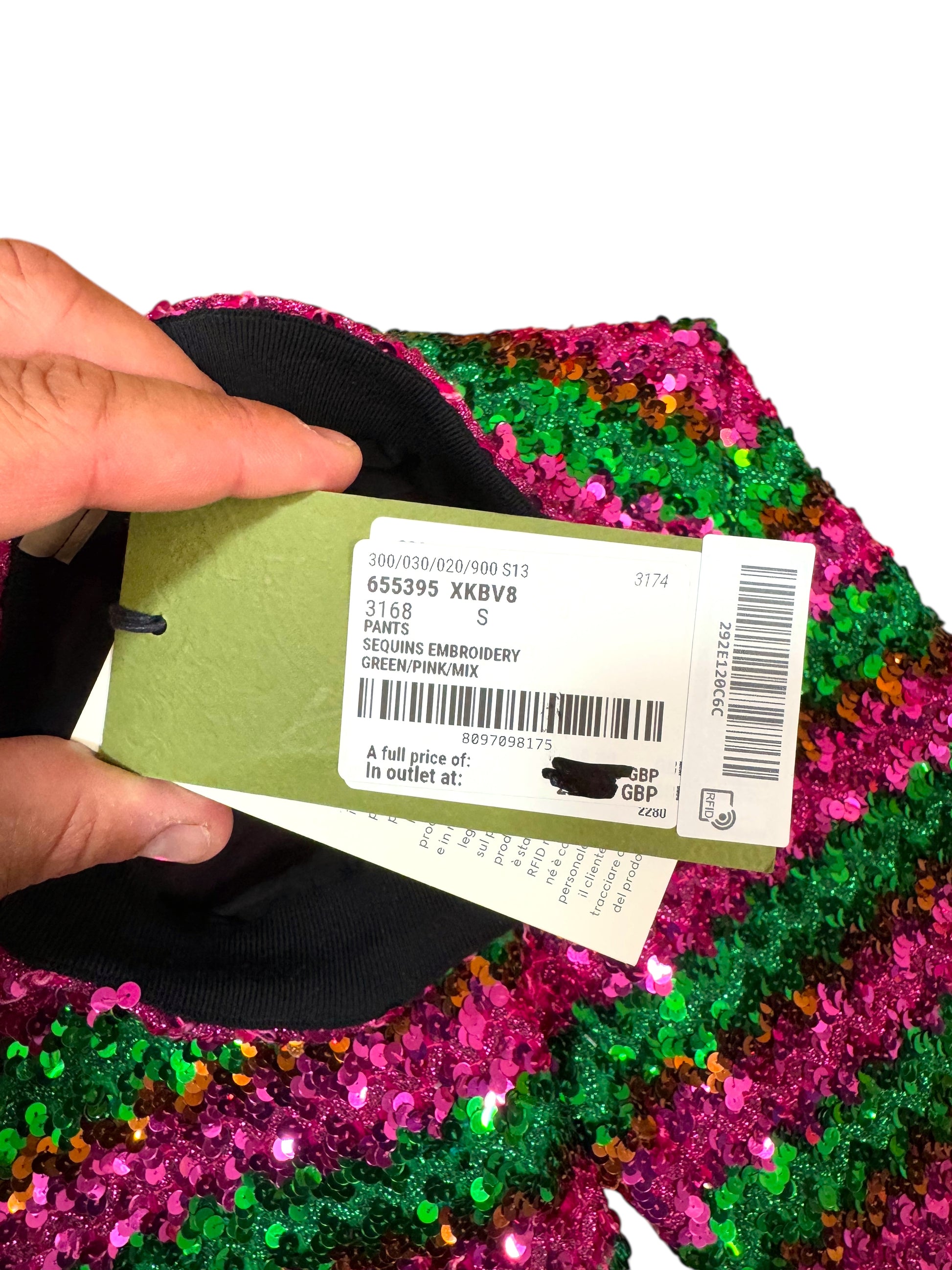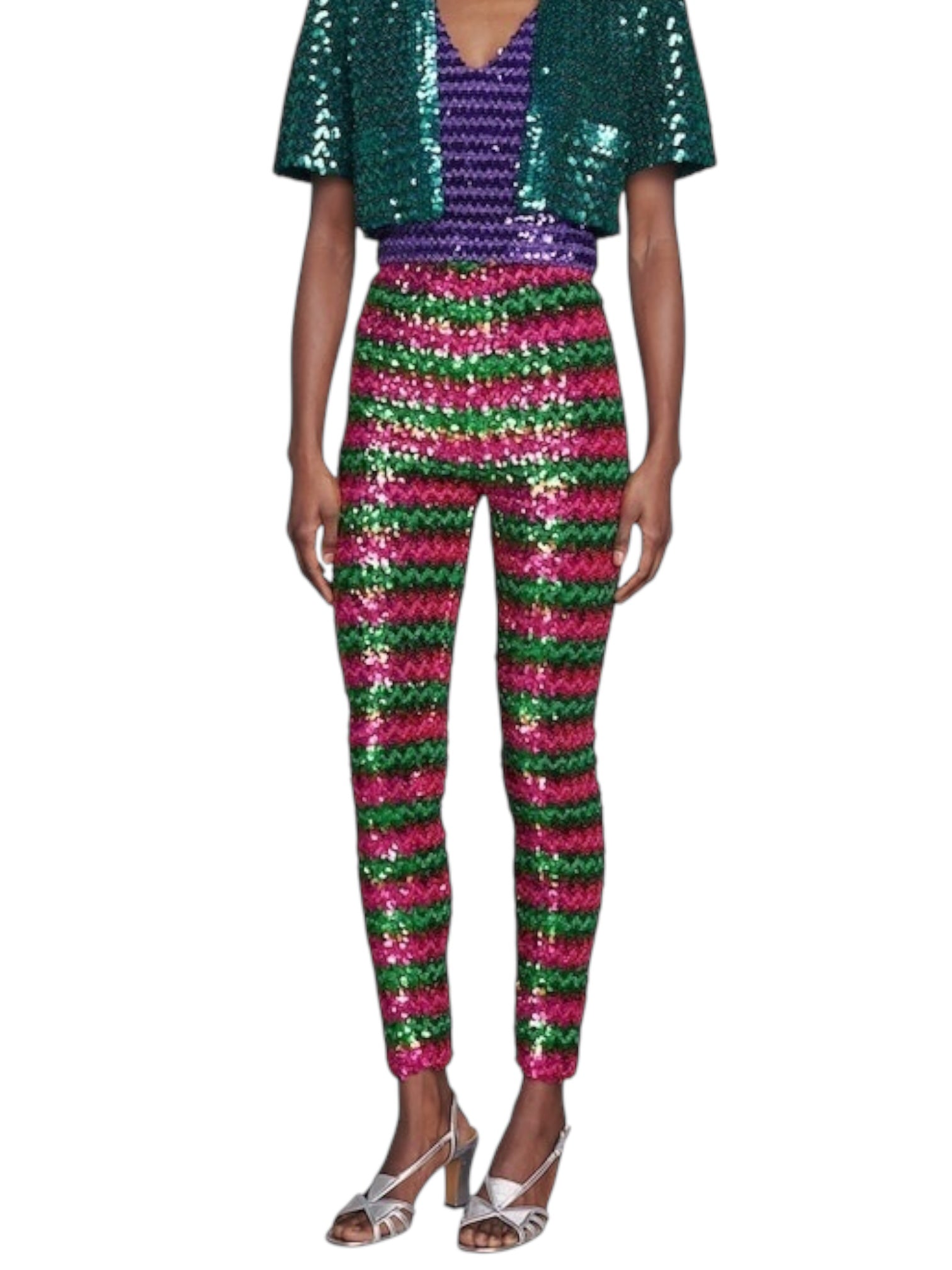Pantaloni donna firmati Gucci, taglia S, realizzati in Italia. Il capo è interamente ricamato con paillettes rosa e verde disposte a righe orizzontali, su base elasticizzata nera. Design aderente, perfetto per look da sera o outfit da palcoscenico. Vita alta con fascia elasticizzata, molto confortevoli.