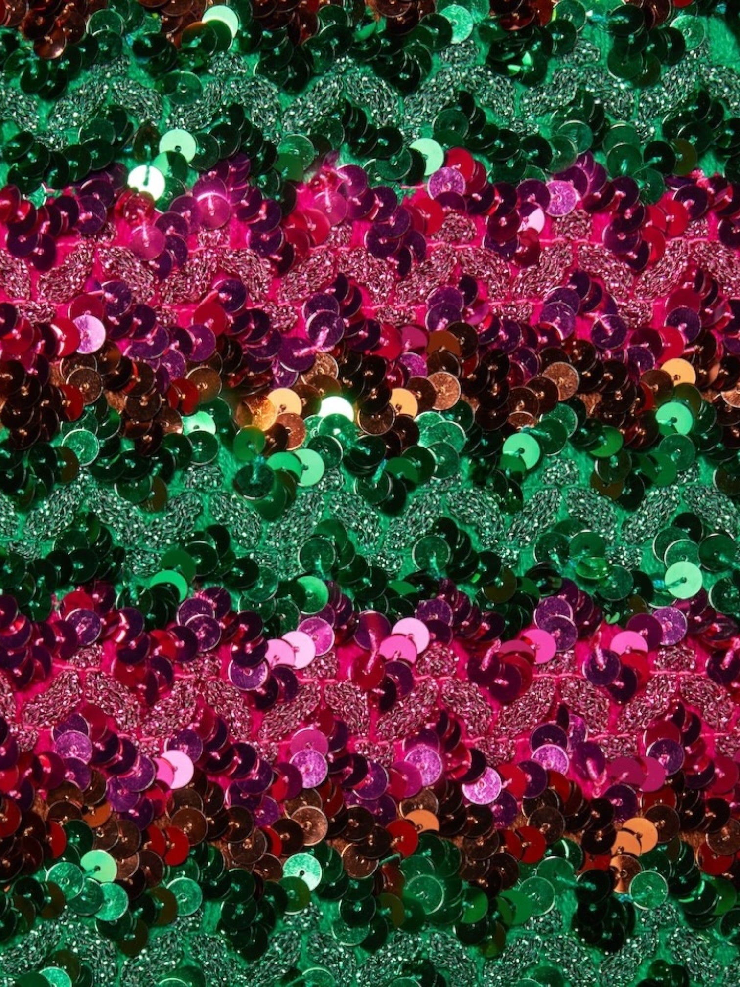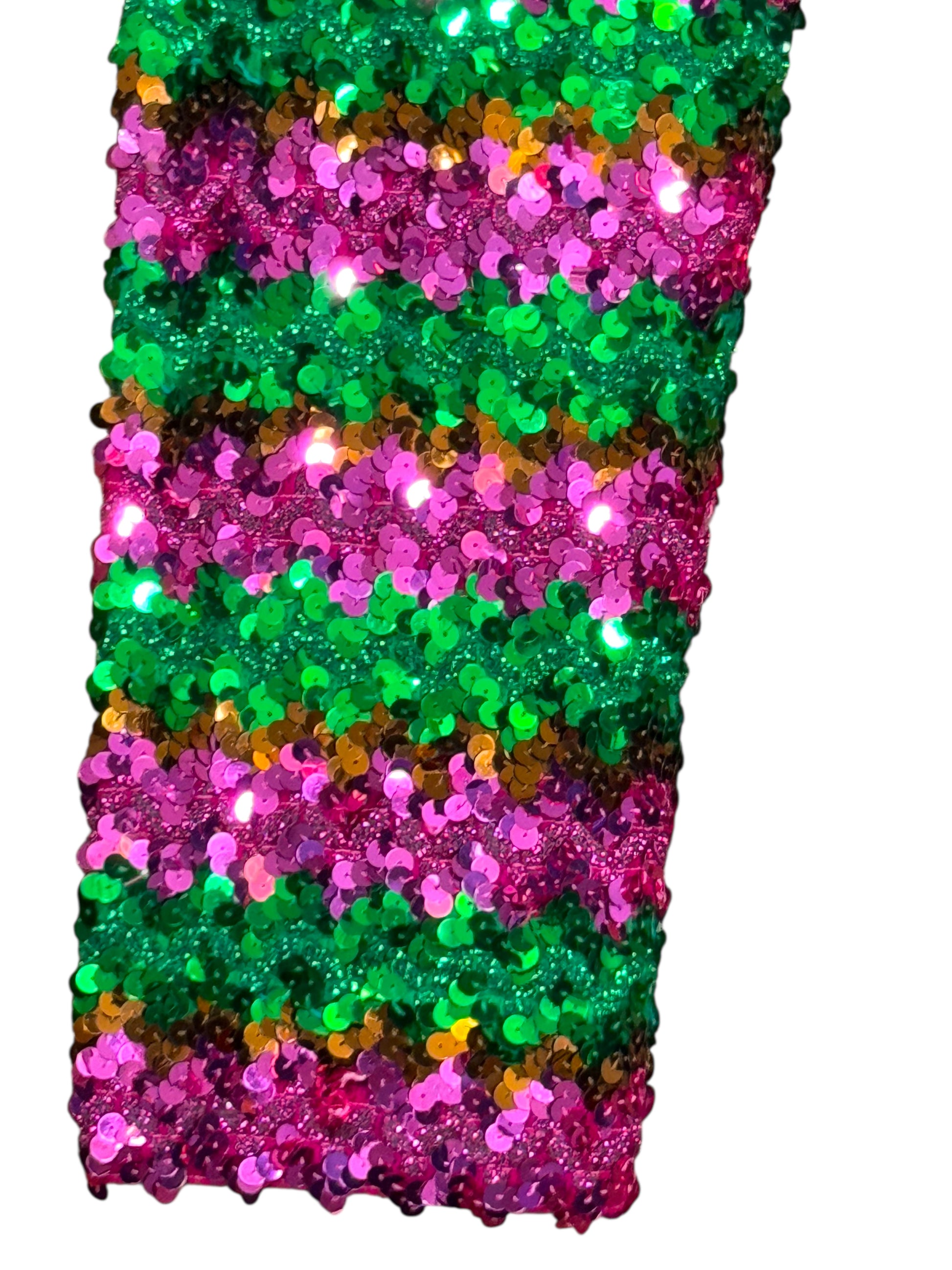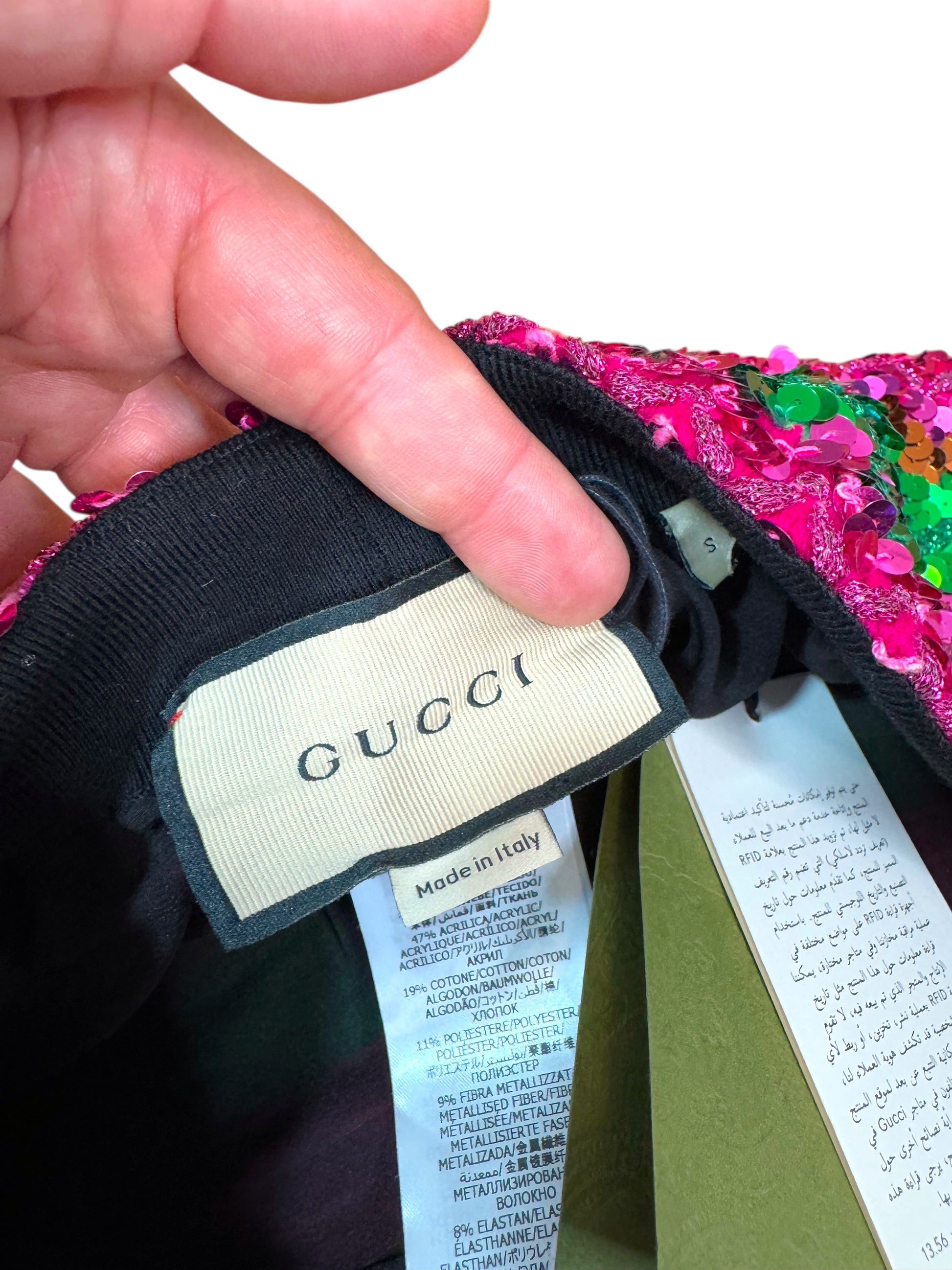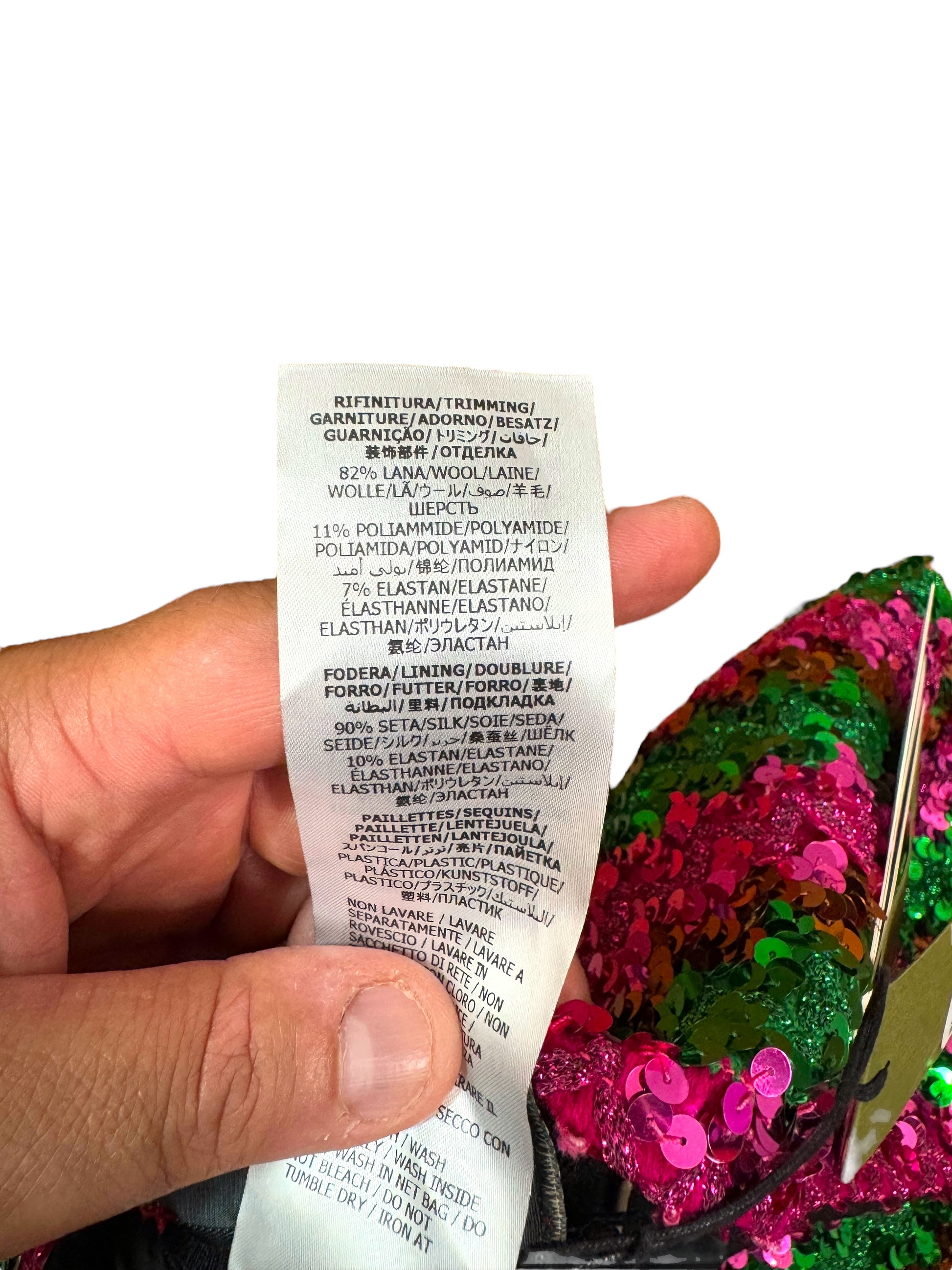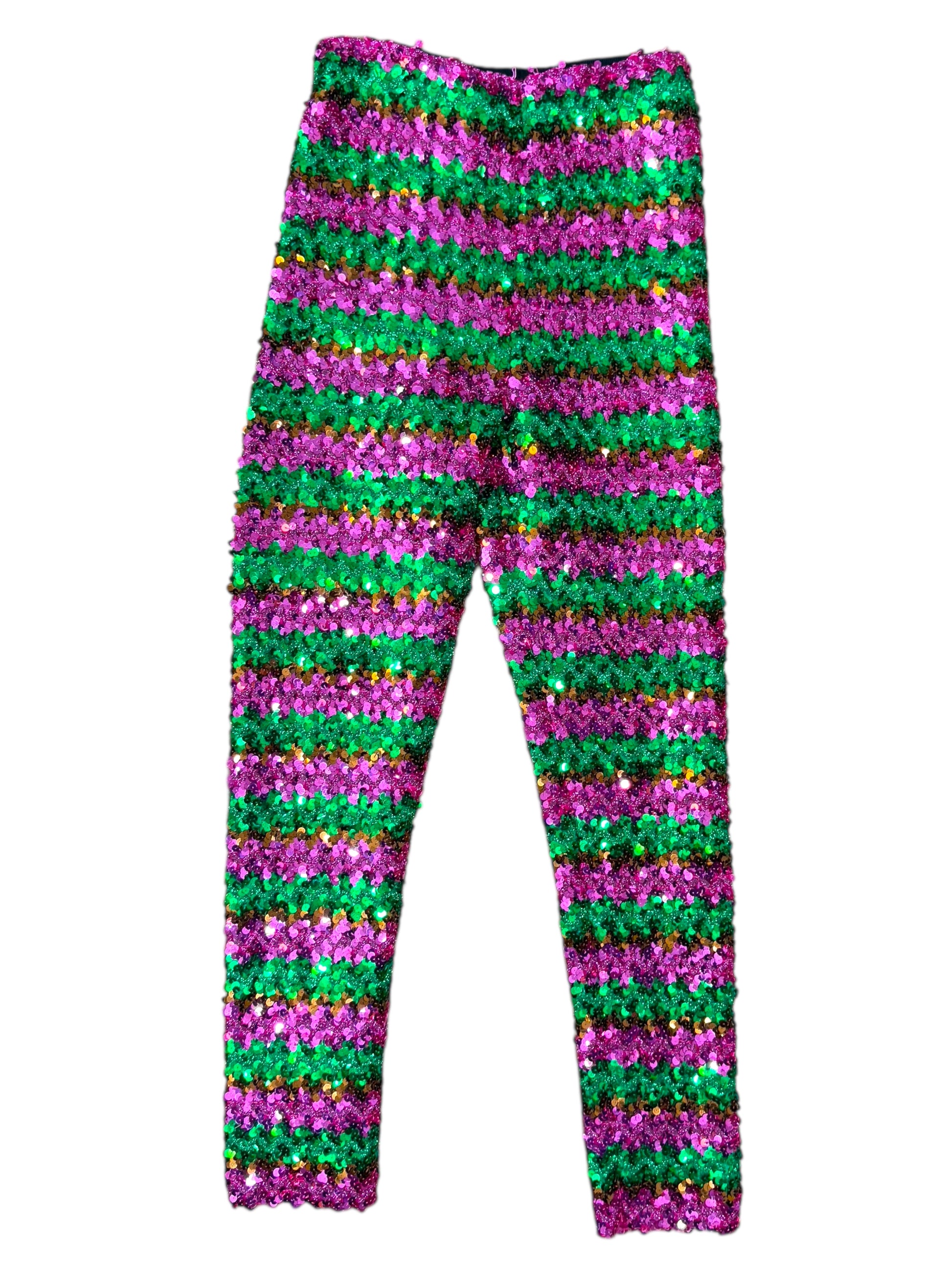 Pantaloni donna firmati Gucci, taglia S, realizzati in Italia. Il capo è interamente ricamato con paillettes rosa e verde disposte a righe orizzontali, su base elasticizzata nera. Design aderente, perfetto per look da sera o outfit da palcoscenico. Vita alta con fascia elasticizzata, molto confortevoli.