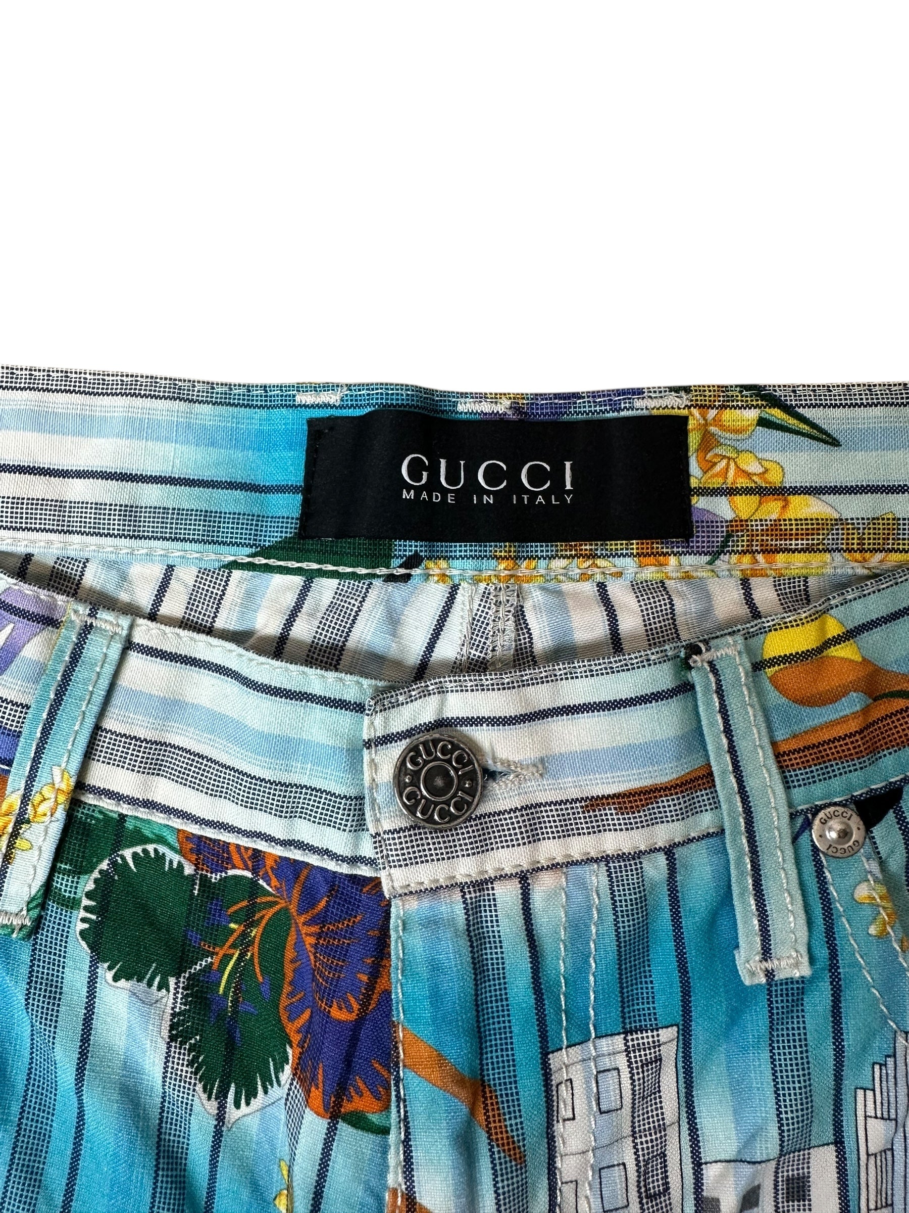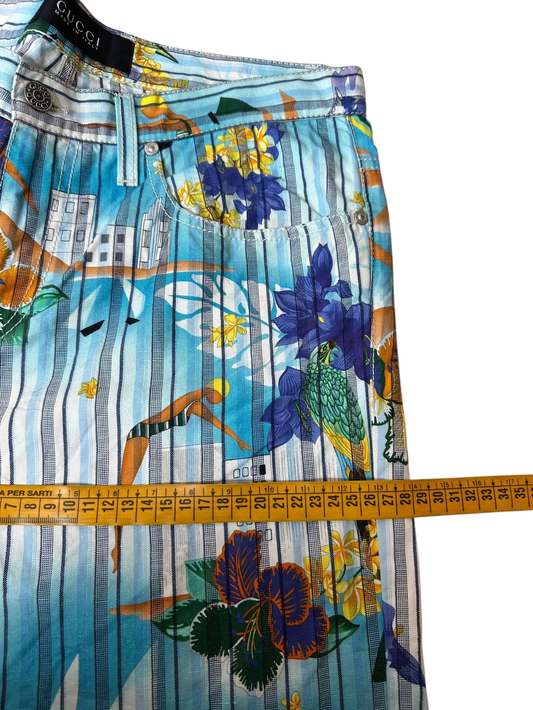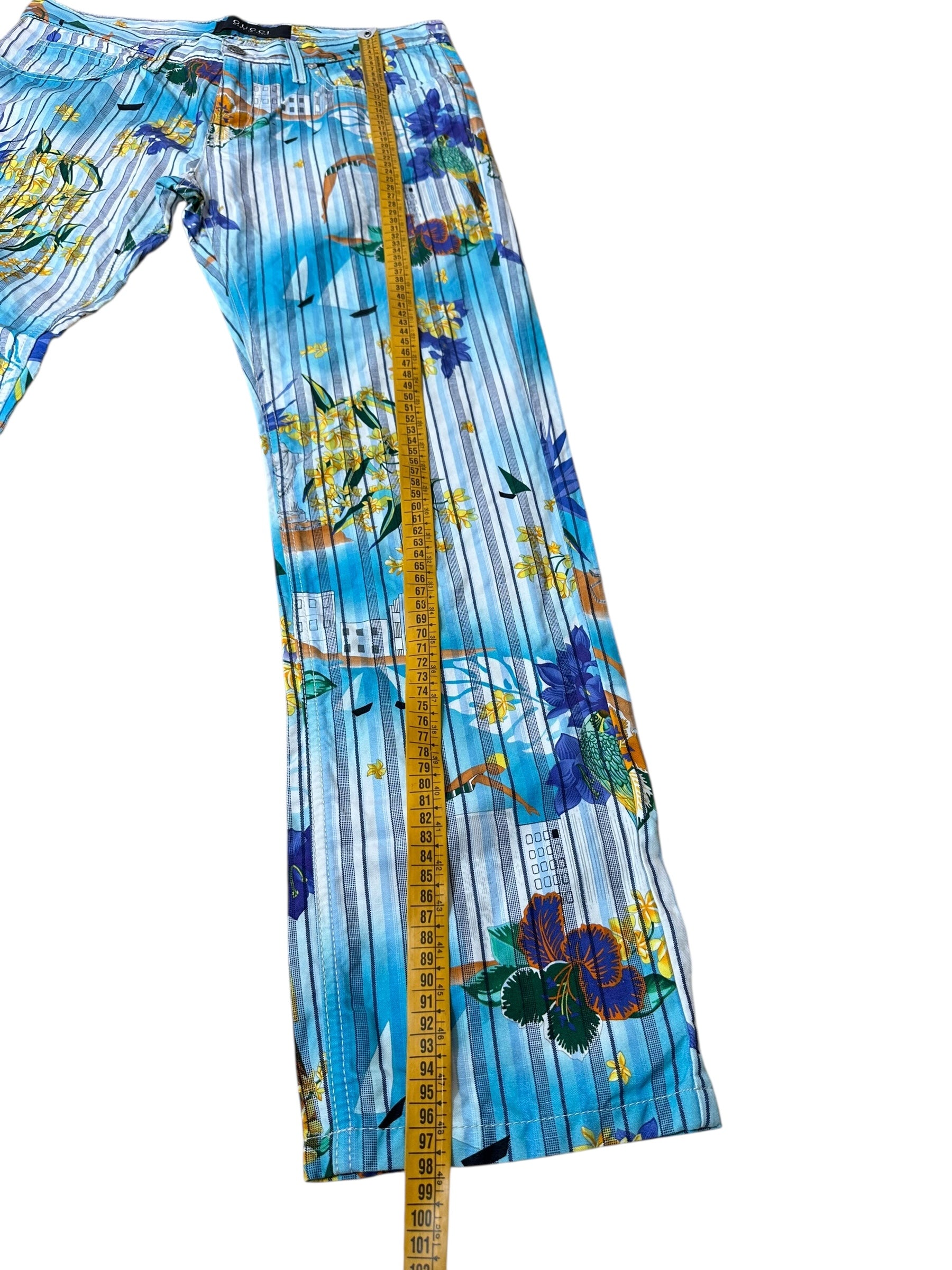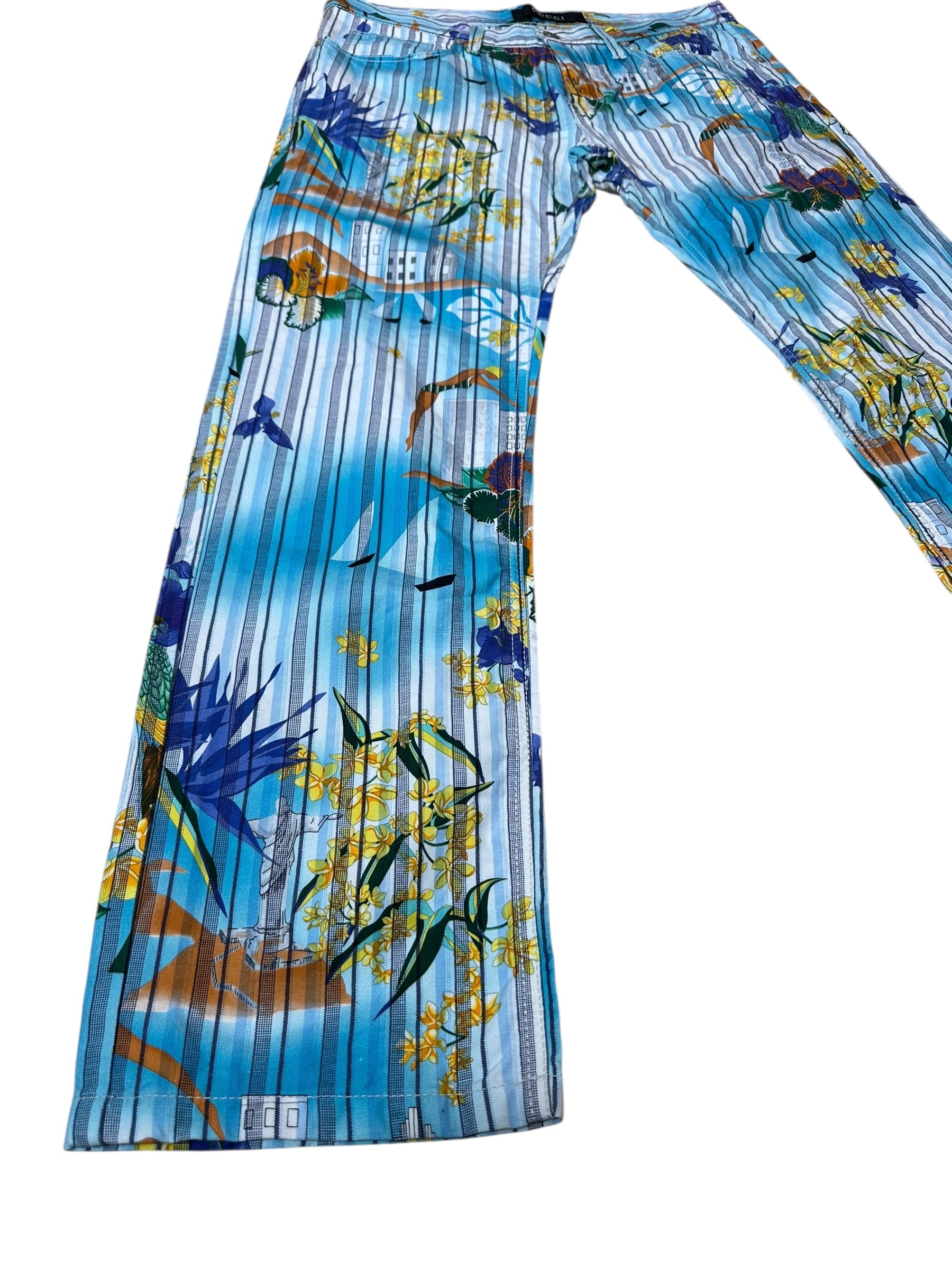Pantaloni vintage Gucci in cotone e canapa con iconica fantasia tropicale a righe verticali azzurre, intervallate da fiori gialli e viola, palme, edifici modernisti e figure stilizzate. Il modello è un “skinny a gamba dritta”, con vita media, cinque tasche e chiusura con zip e bottone logato.