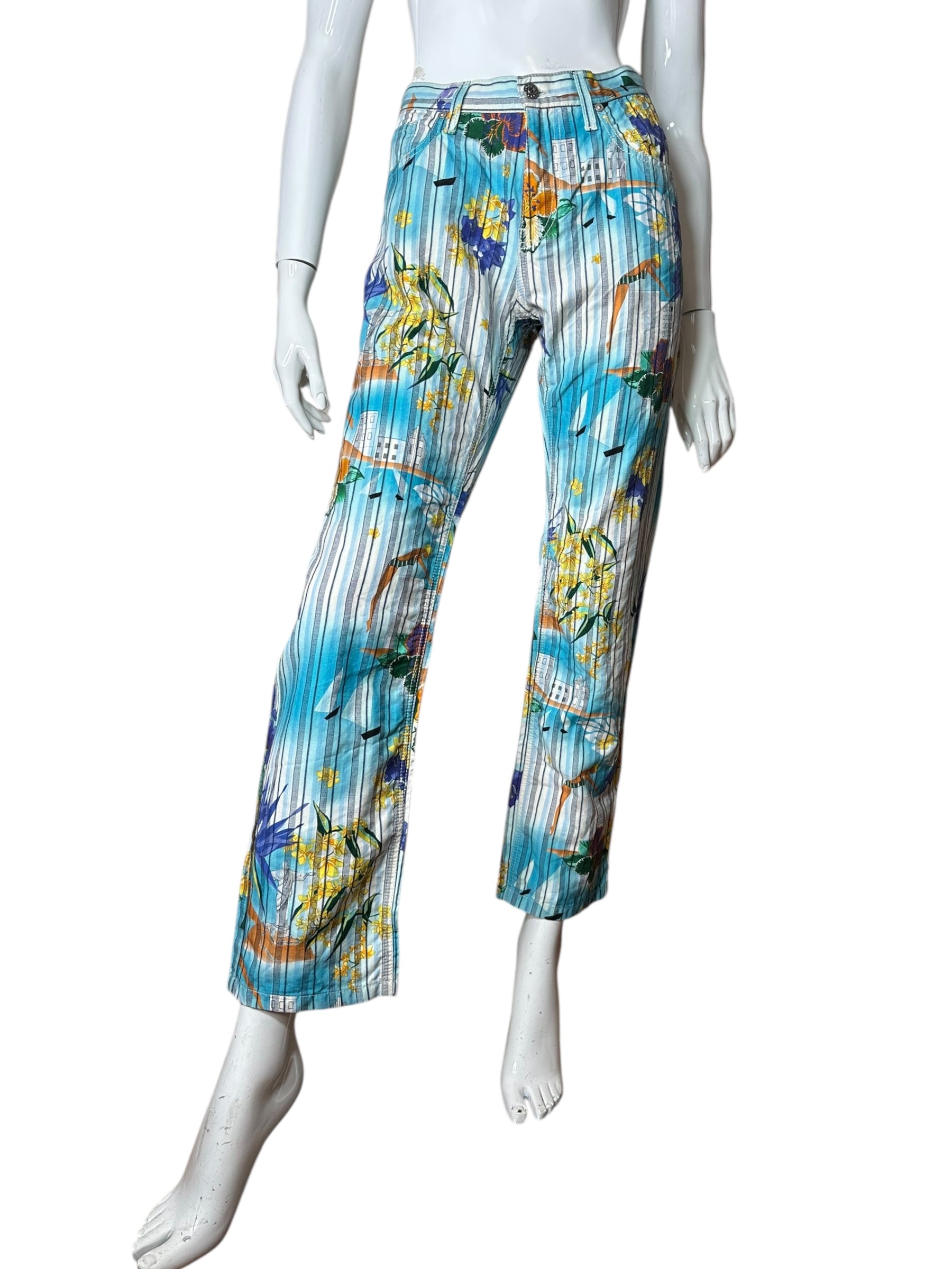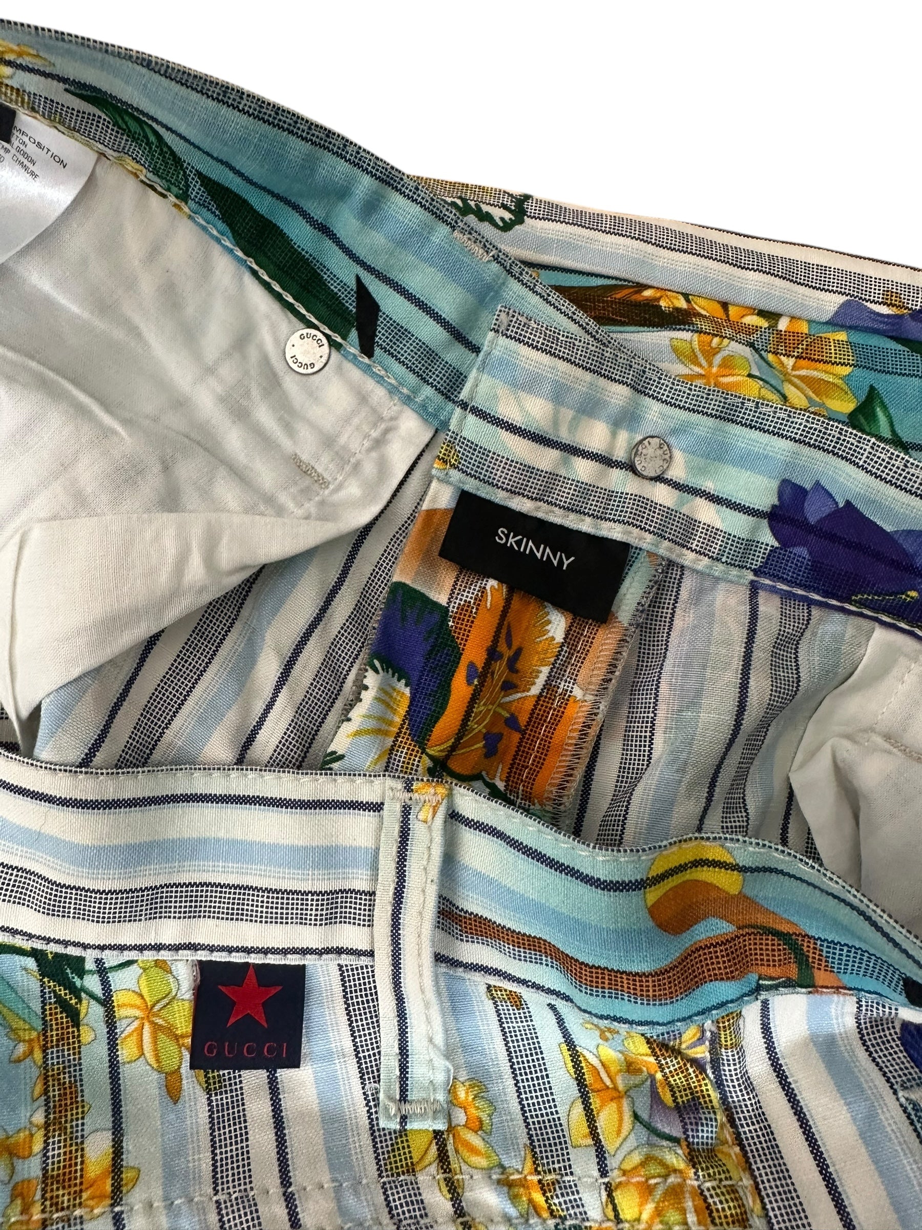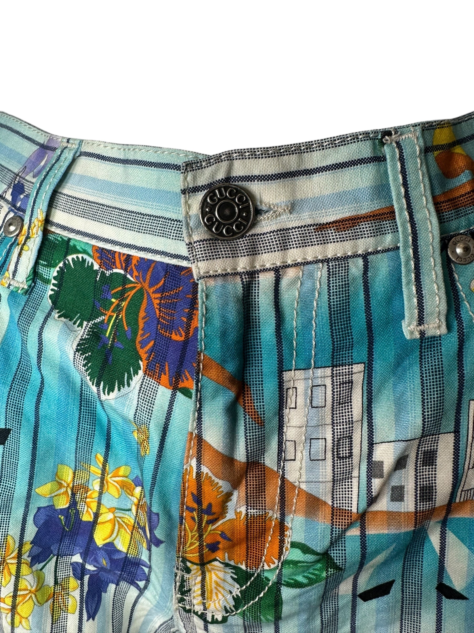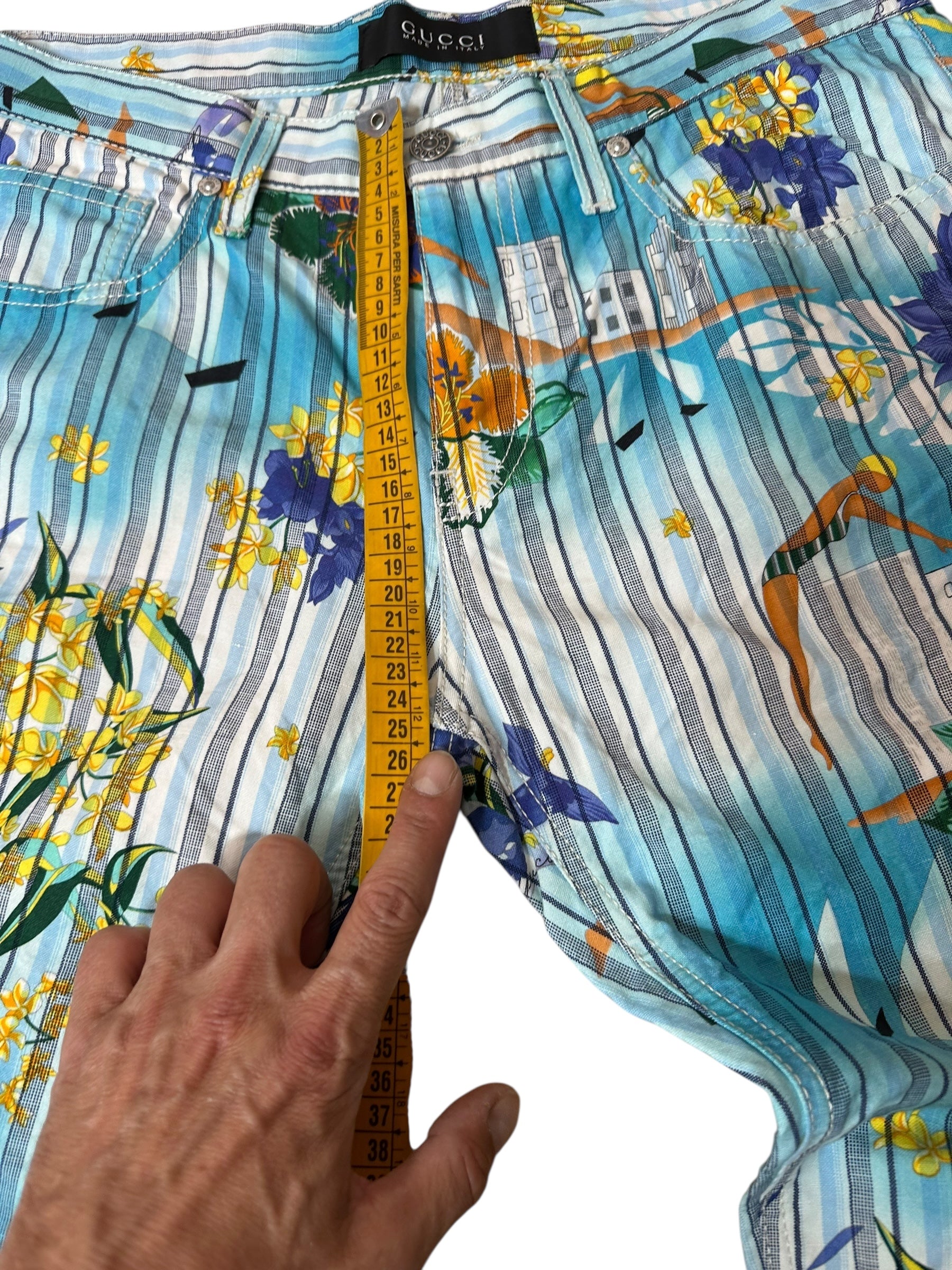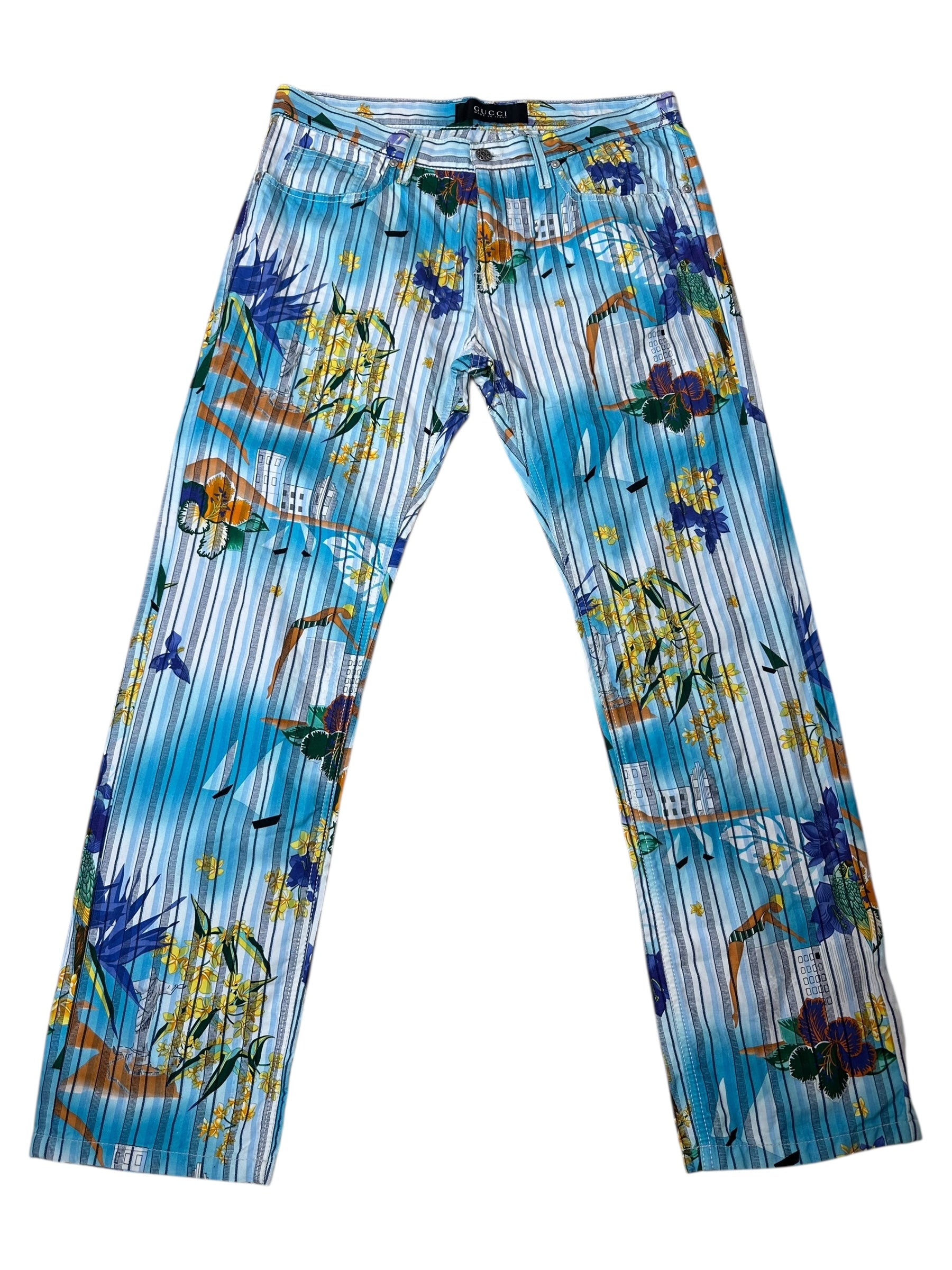 Pantaloni vintage Gucci in cotone e canapa con iconica fantasia tropicale a righe verticali azzurre, intervallate da fiori gialli e viola, palme, edifici modernisti e figure stilizzate. Il modello è un “skinny a gamba dritta”, con vita media, cinque tasche e chiusura con zip e bottone logato.
