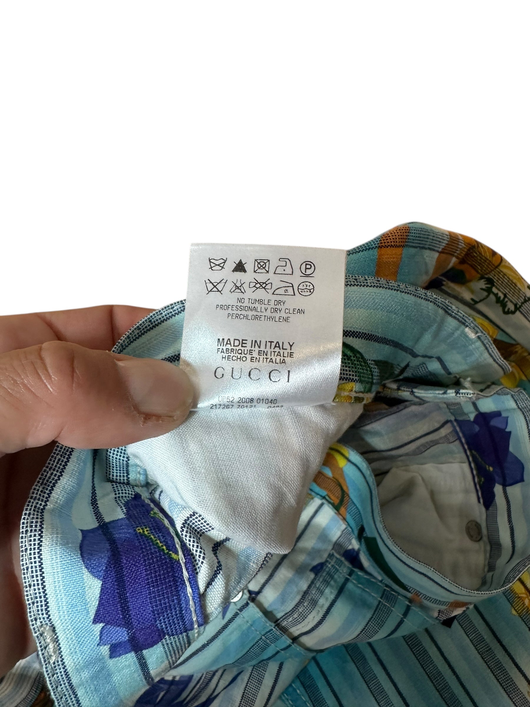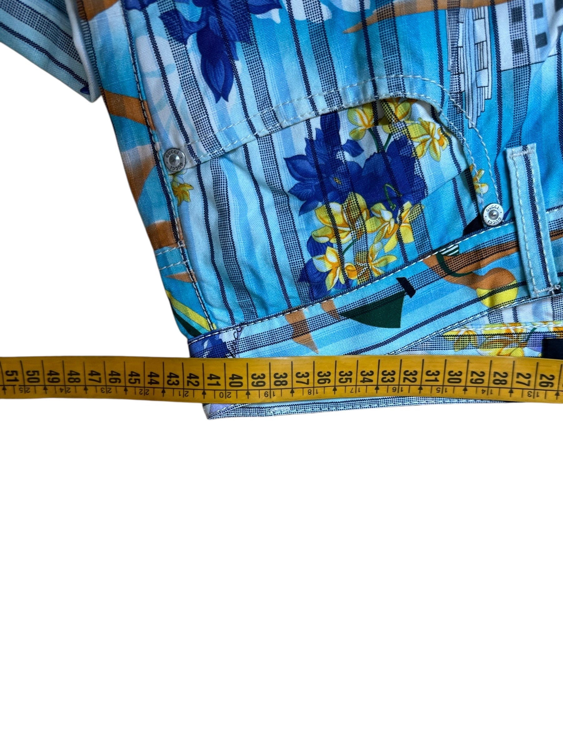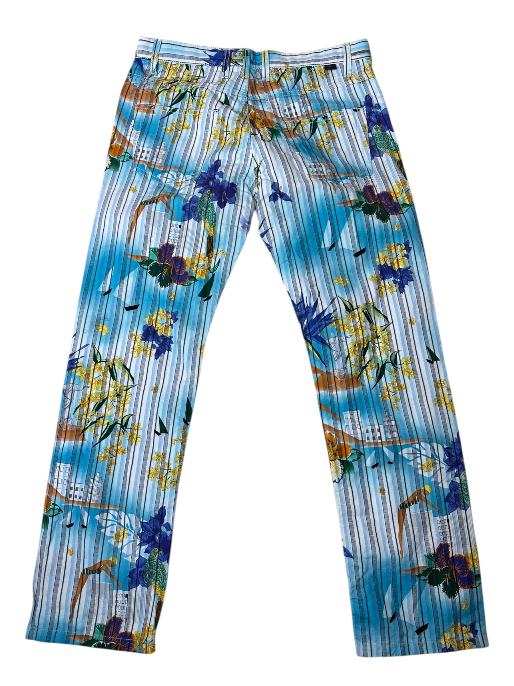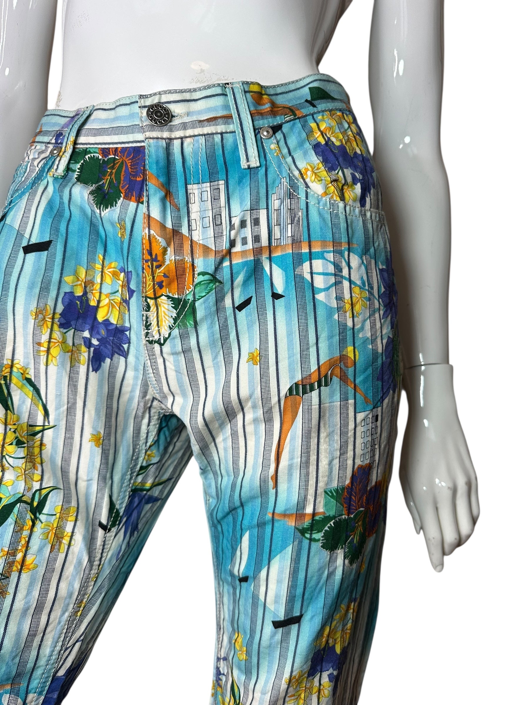 Pantaloni vintage Gucci in cotone e canapa con iconica fantasia tropicale a righe verticali azzurre, intervallate da fiori gialli e viola, palme, edifici modernisti e figure stilizzate. Il modello è un “skinny a gamba dritta”, con vita media, cinque tasche e chiusura con zip e bottone logato.