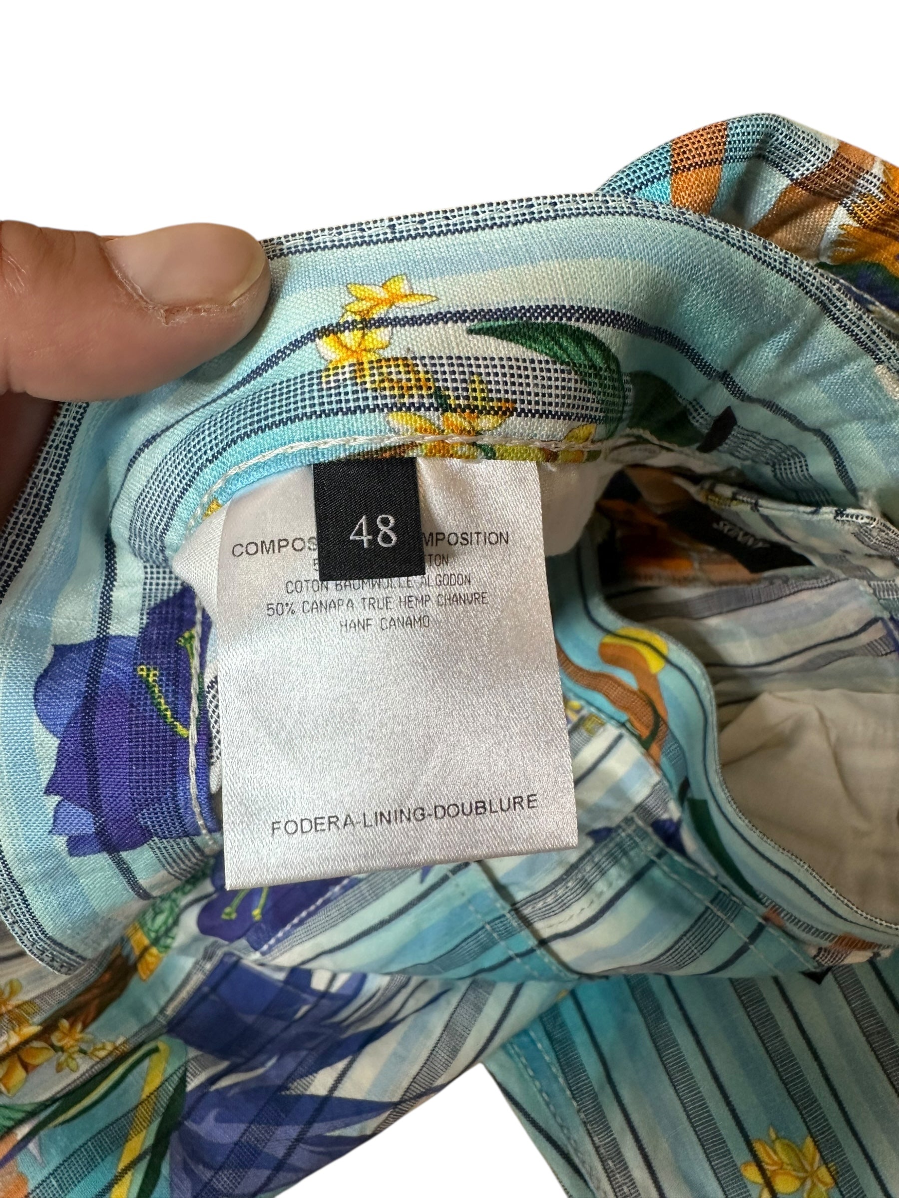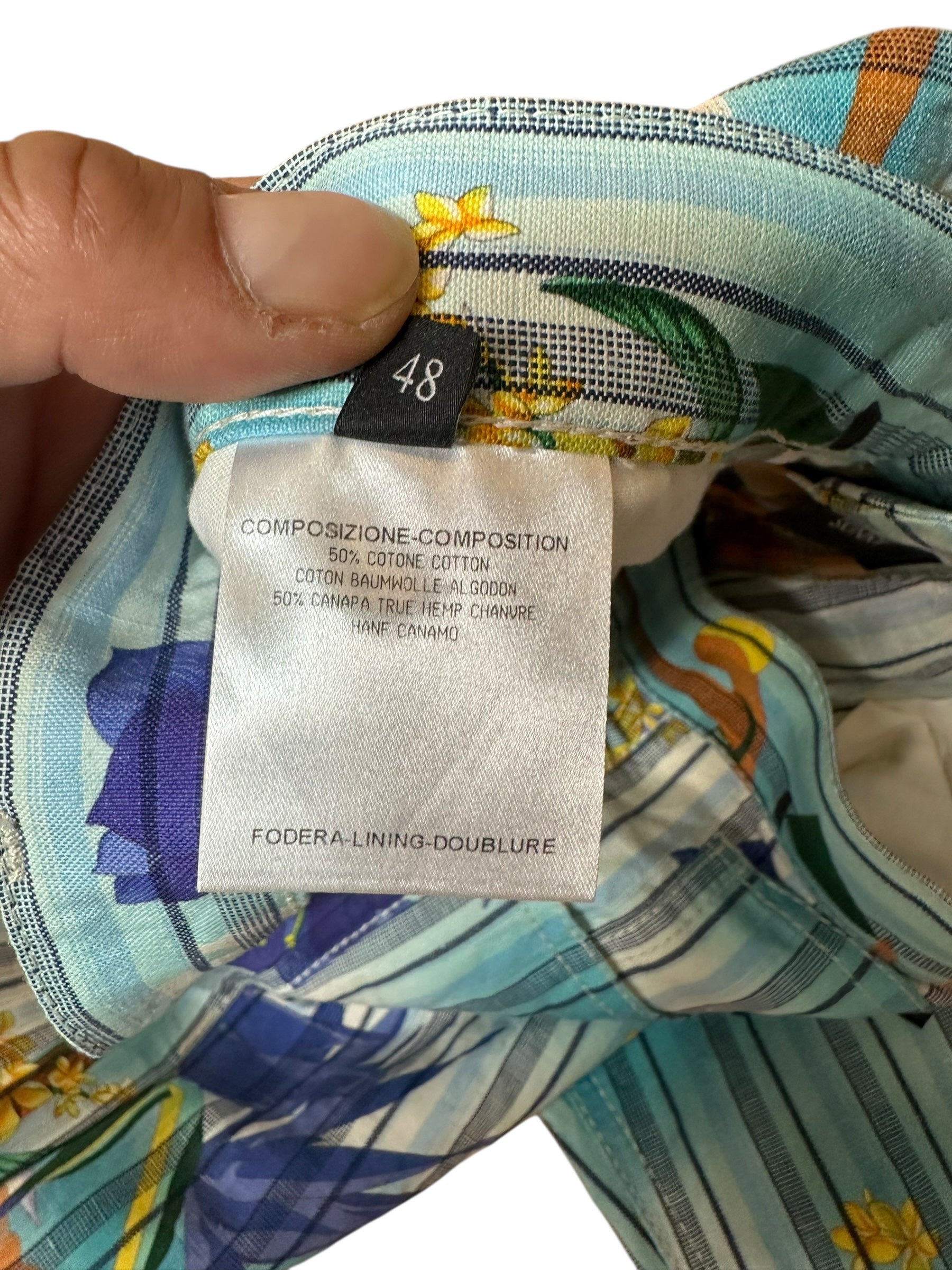 Realizzati in 50% cotone e 50% canapa (true hemp, fibra naturale derivata dalla pianta di Cannabis sativa), risultano freschi e traspiranti, ideali per la stagione calda. Etichetta interna “GUCCI Made in Italy”, taglia 48.