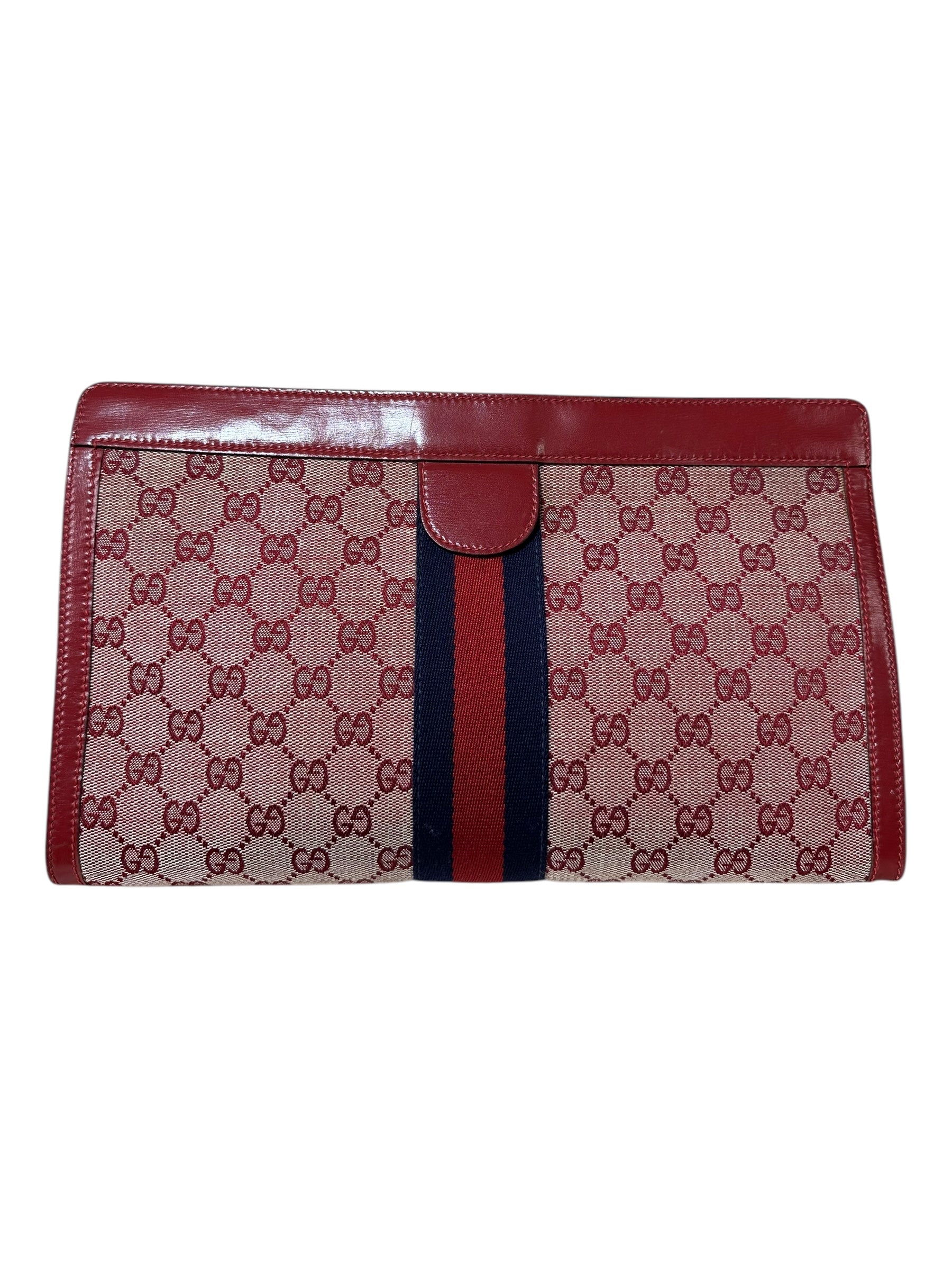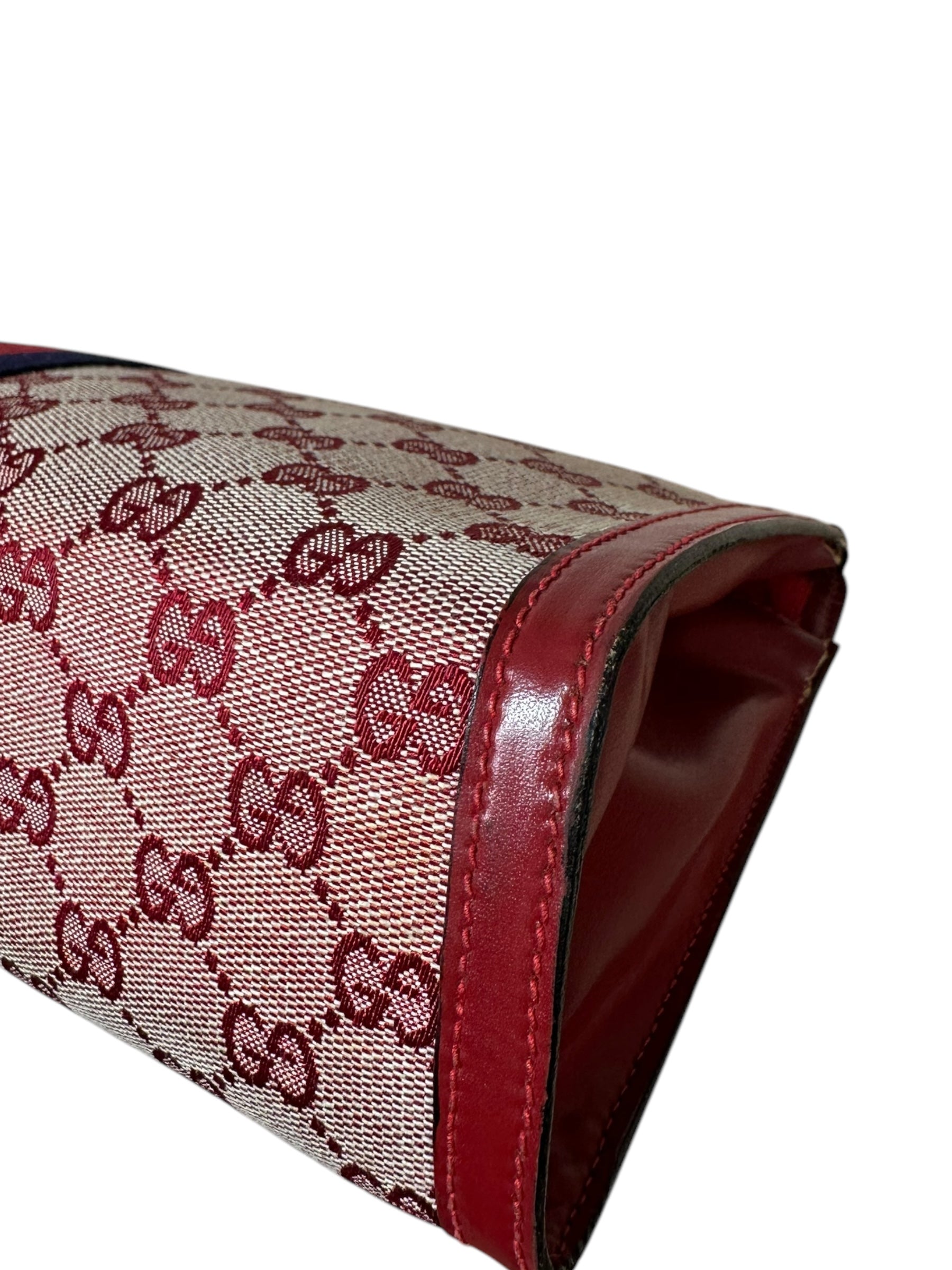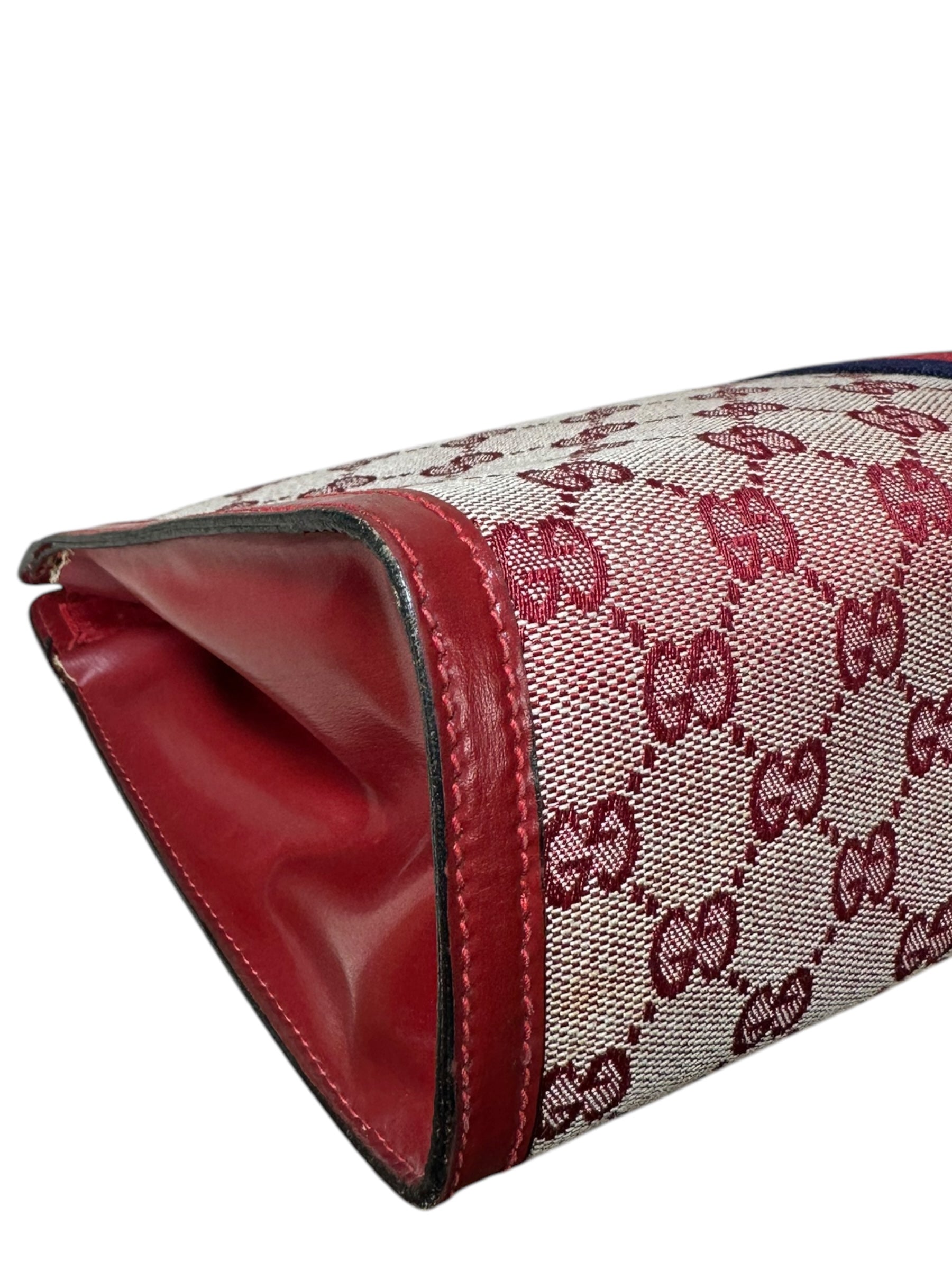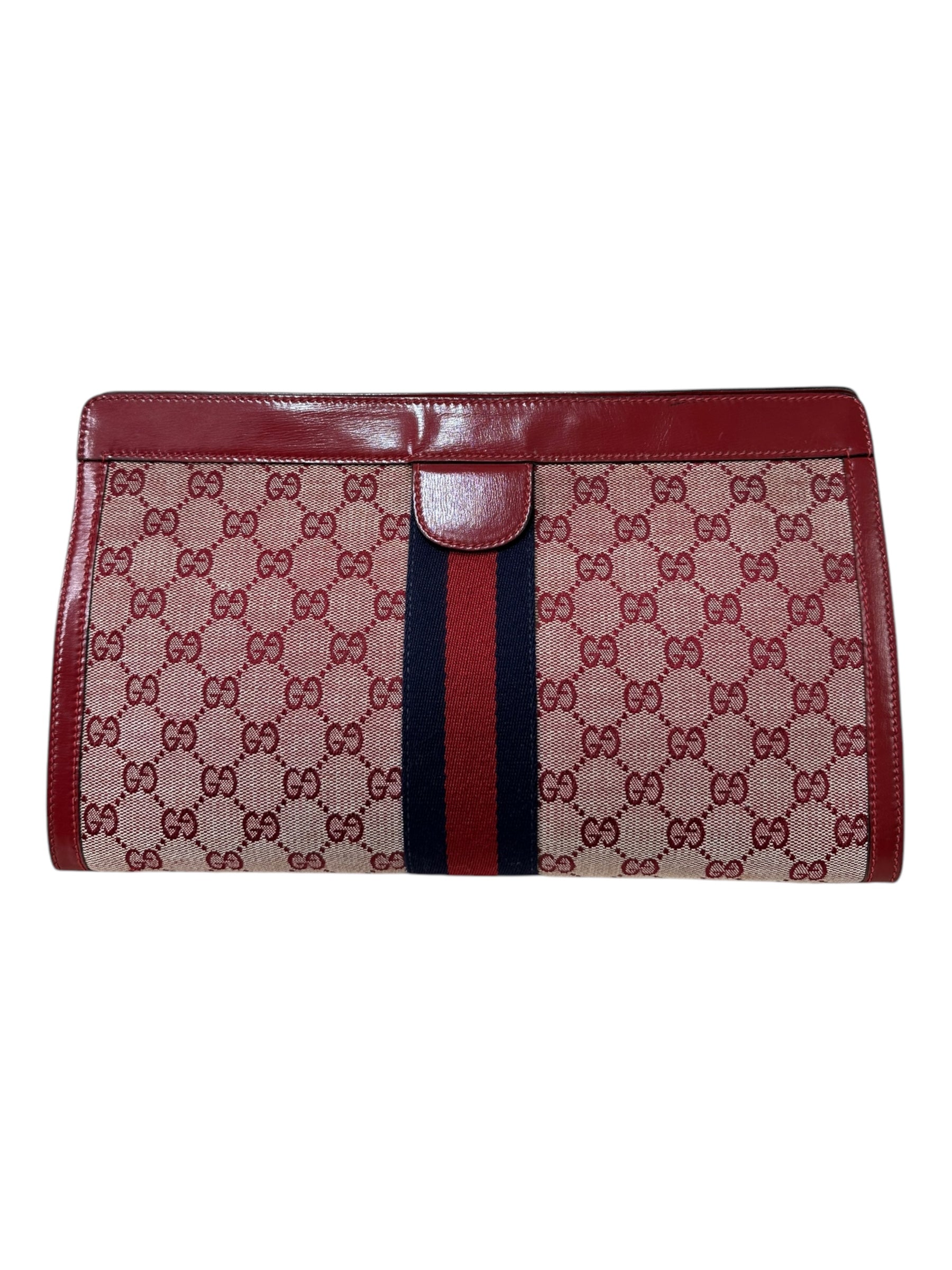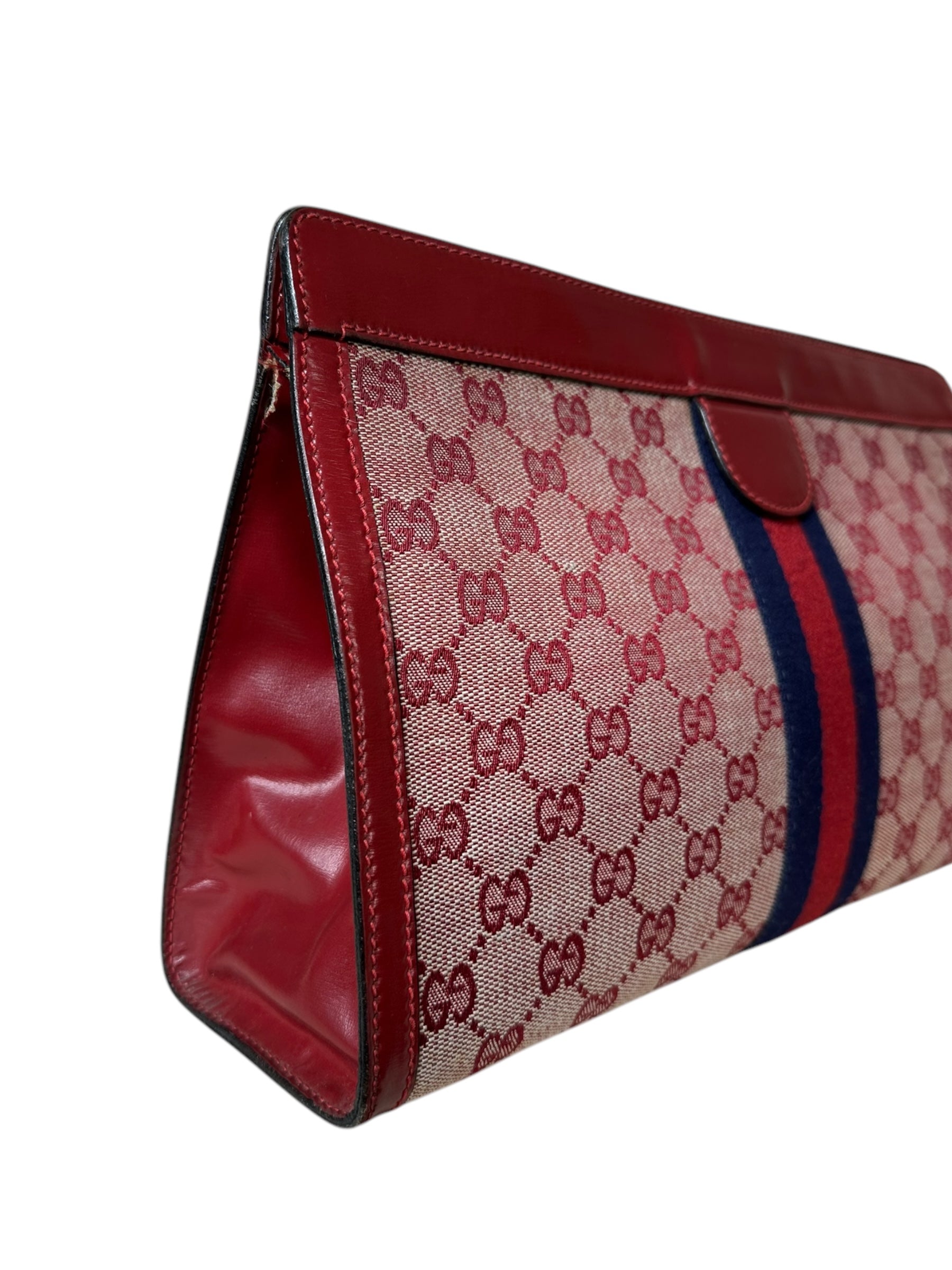 Iconica e fuori produzione, questa pochette firmata Gucci Parfums è realizzata in canvas GG Supreme con un particolare effetto sfumato rosso ciliegia, rifinita in pelle lucida tono su tono e arricchita dalla classica banda web nei toni blu e rosso. Il logo dorato “GUCCI PARFUMS ITALY 921” è presente all’interno, a confermare l’autenticità e l’epoca dell’articolo.