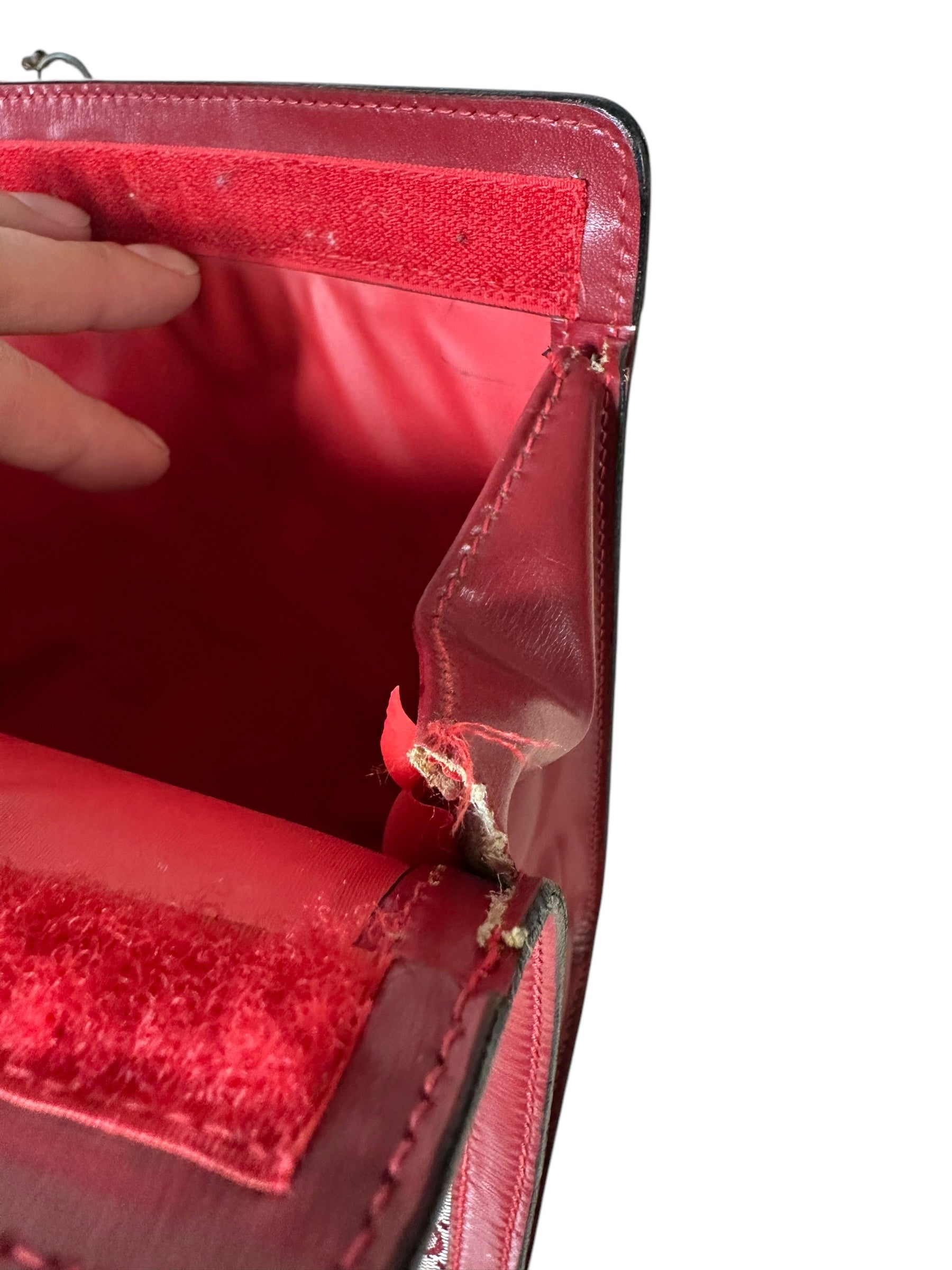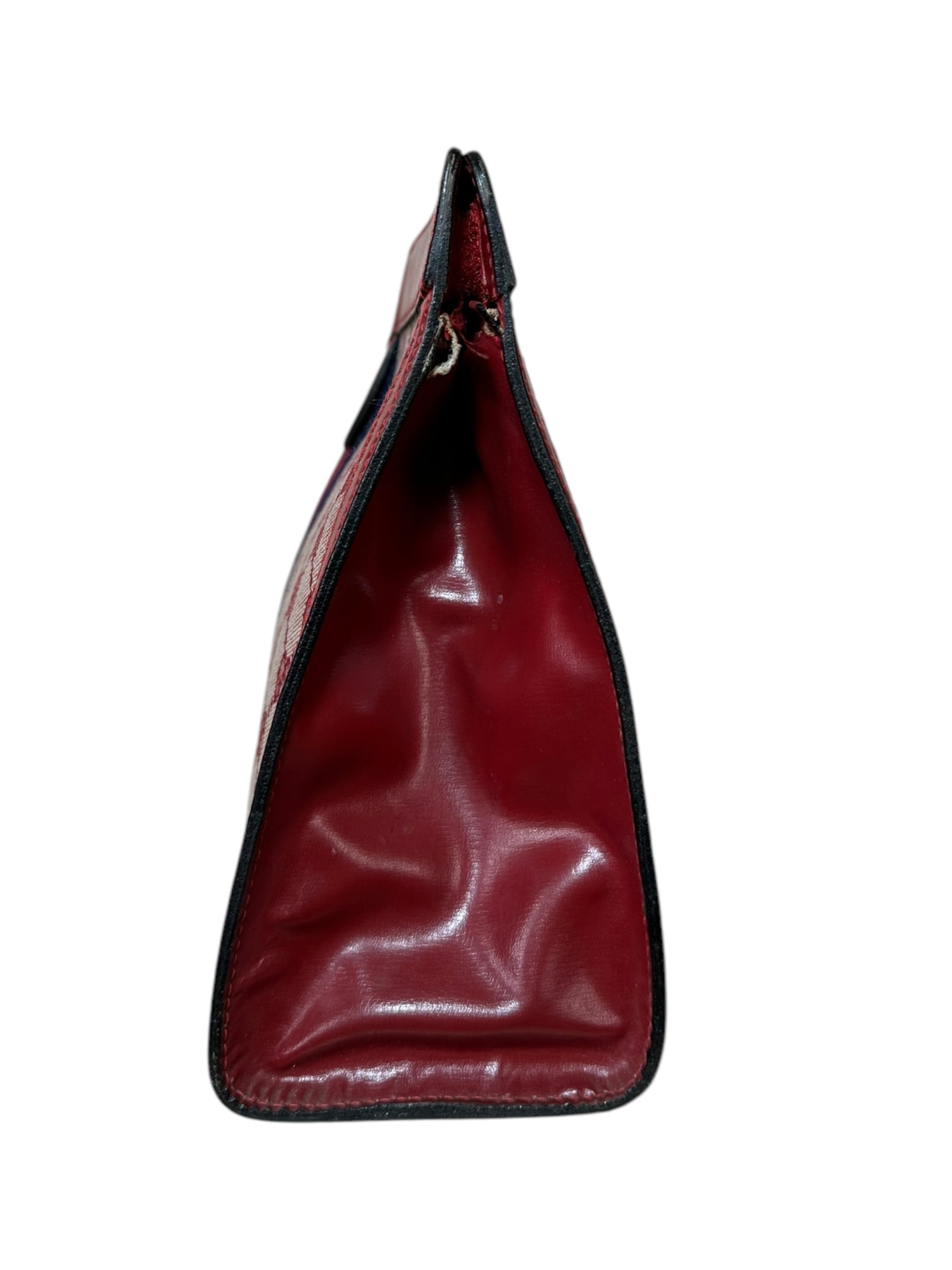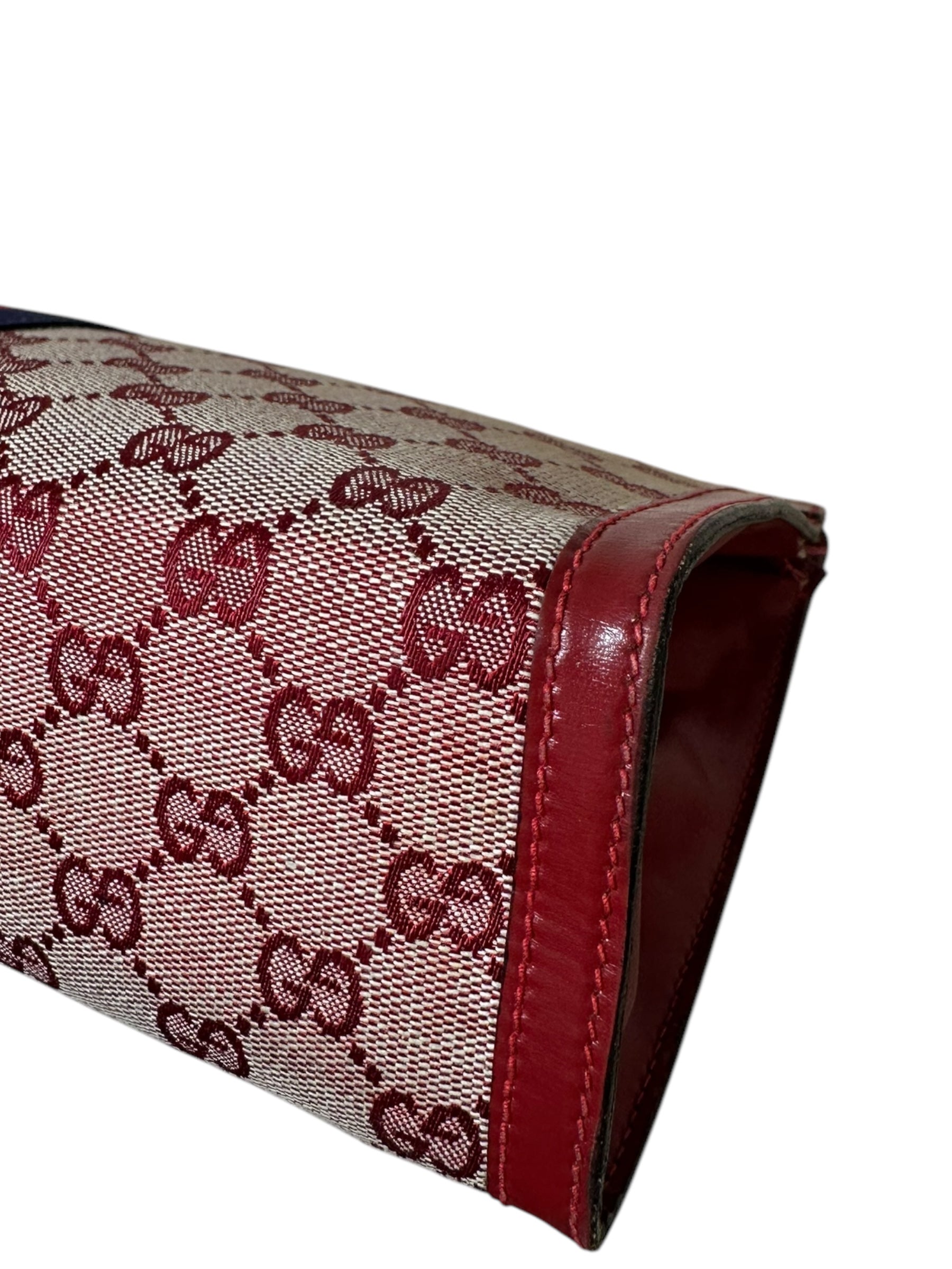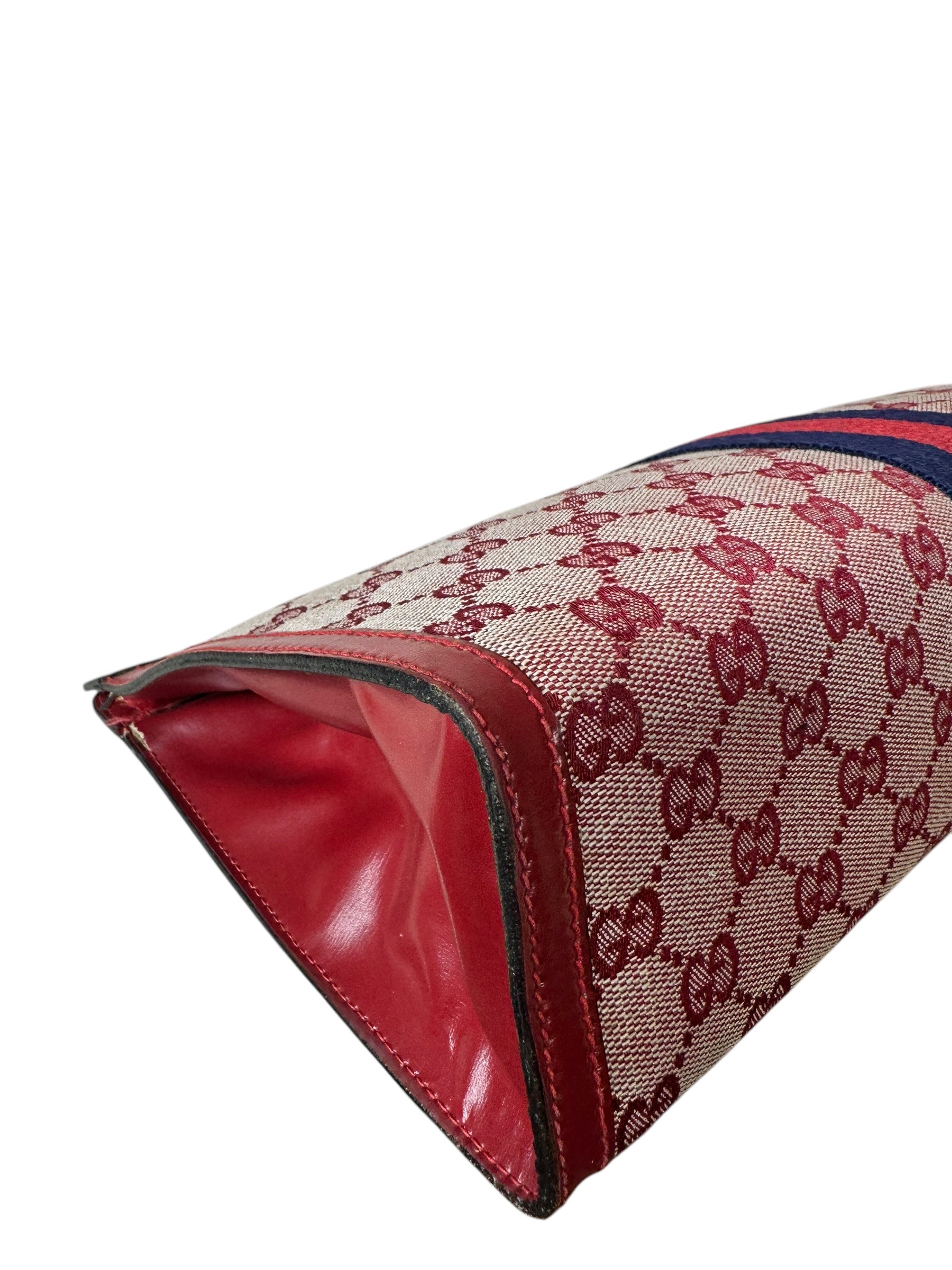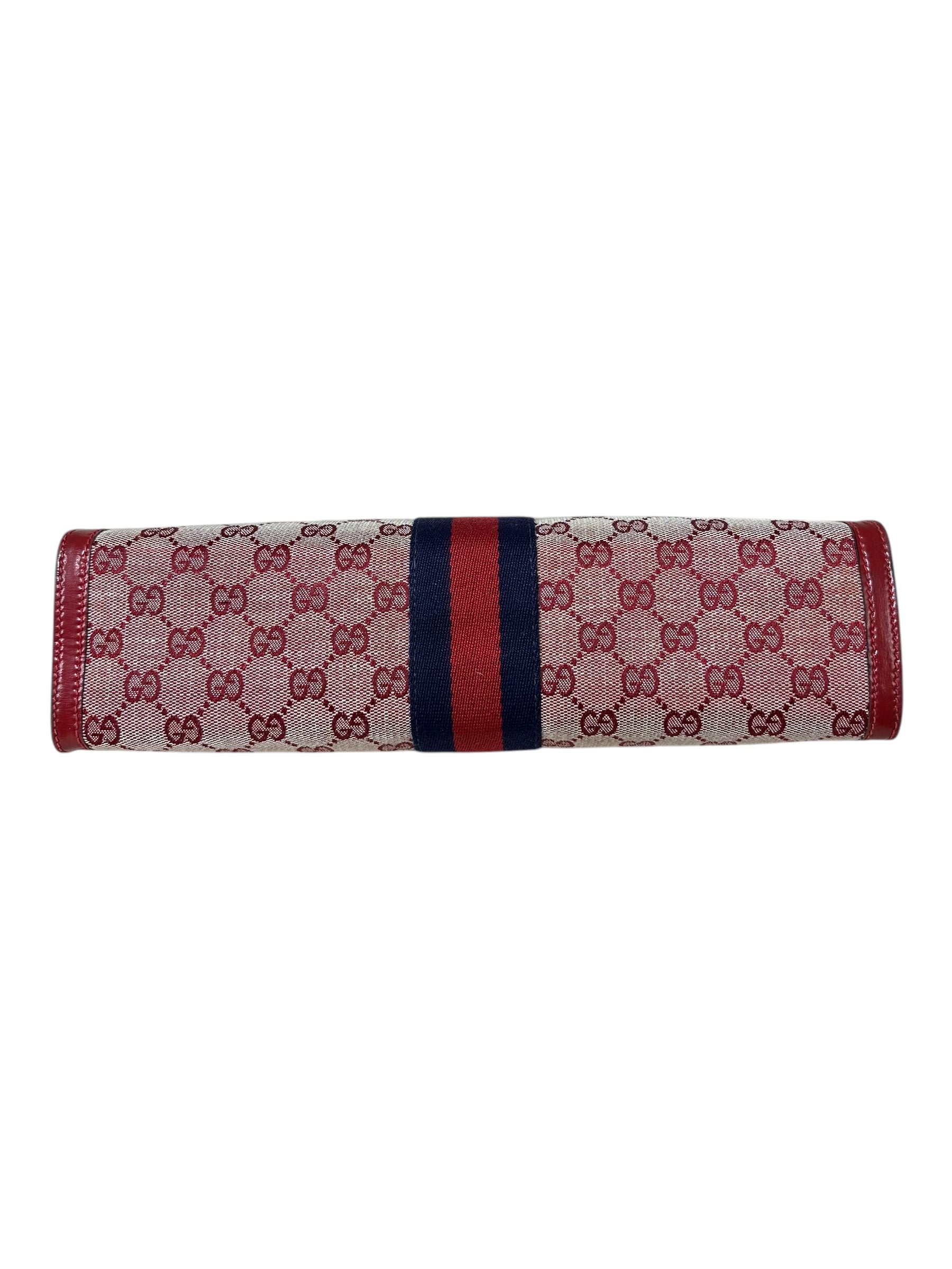 Iconica e fuori produzione, questa pochette firmata Gucci Parfums è realizzata in canvas GG Supreme con un particolare effetto sfumato rosso ciliegia, rifinita in pelle lucida tono su tono e arricchita dalla classica banda web nei toni blu e rosso. Il logo dorato “GUCCI PARFUMS ITALY 921” è presente all’interno, a confermare l’autenticità e l’epoca dell’articolo.