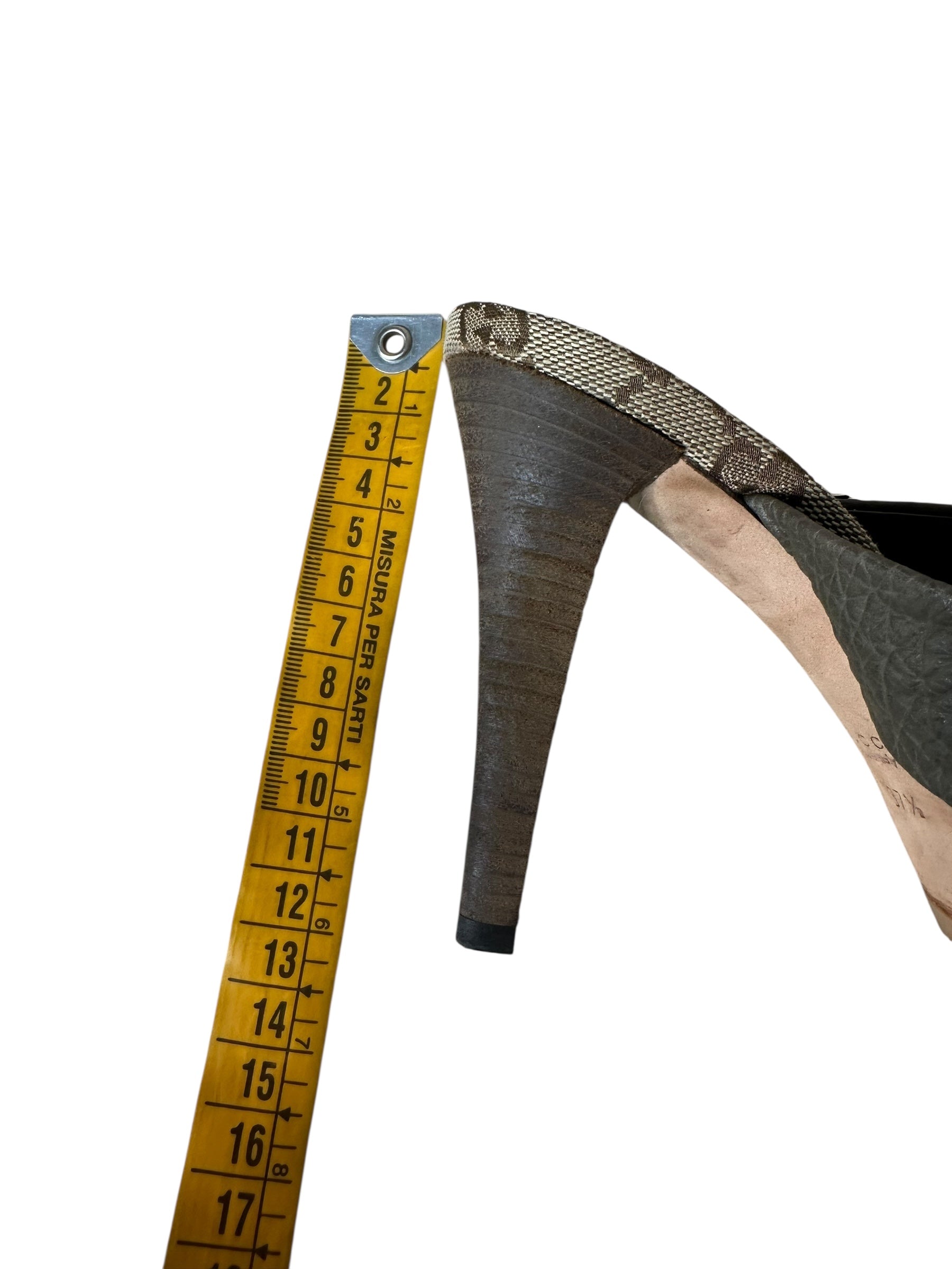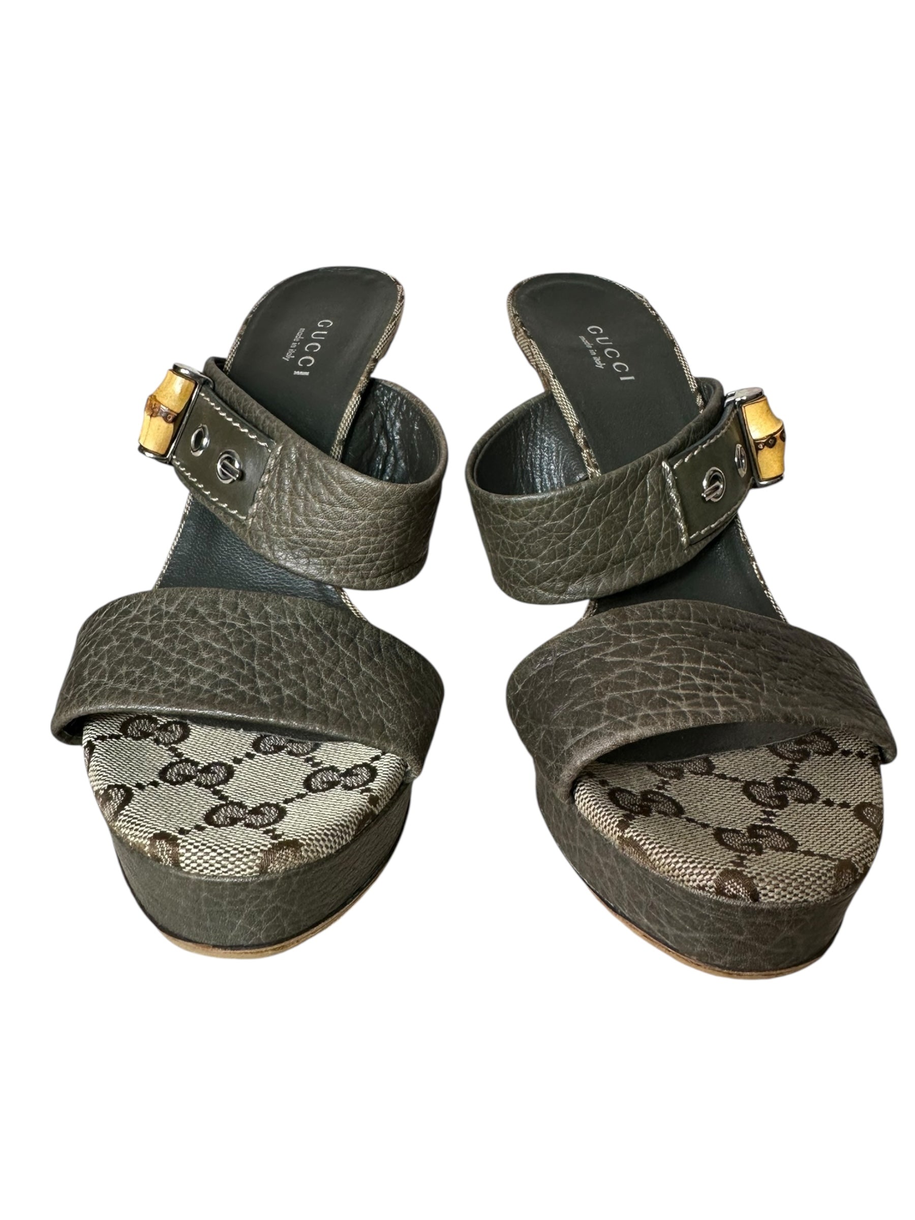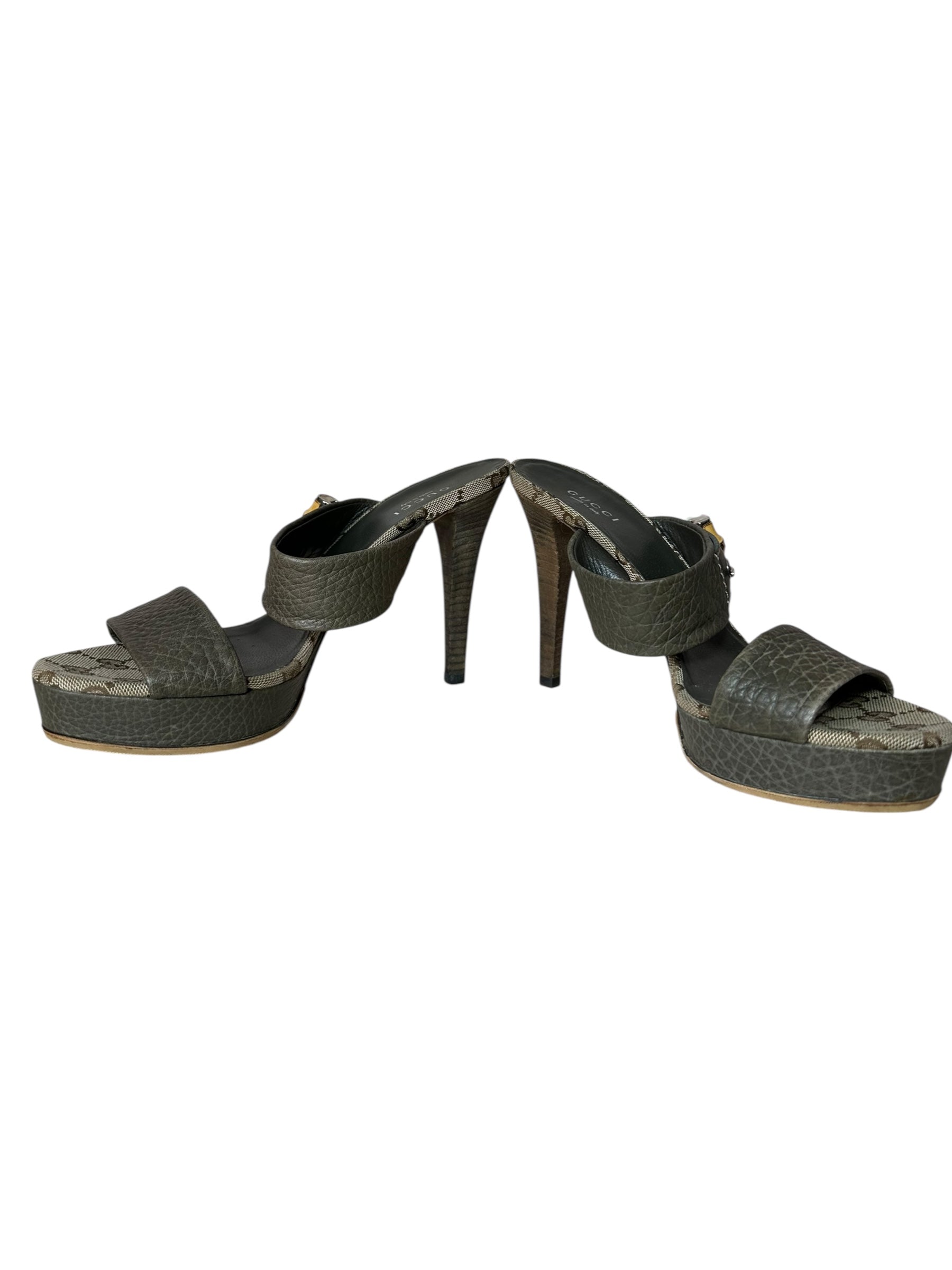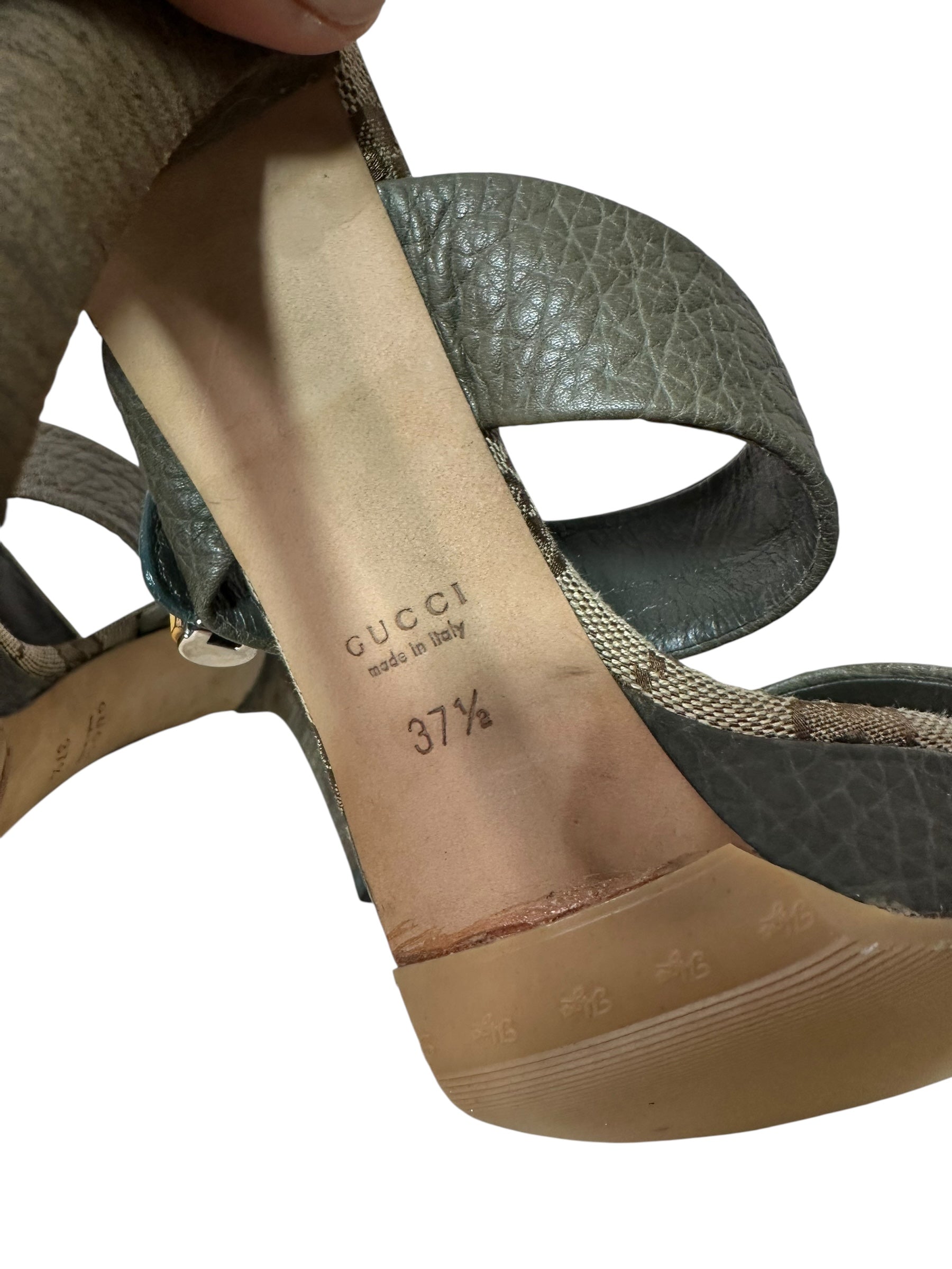 Raffinati sandali vintage Gucci, realizzati in pelle martellata verde-grigio scuro con sottopiede in tela logata GG. Caratterizzati da linee eleganti e struttura solida, presentano un tacco alto in legno naturale dalla forma geometrica, che dona slancio alla silhouette senza rinunciare alla stabilità.