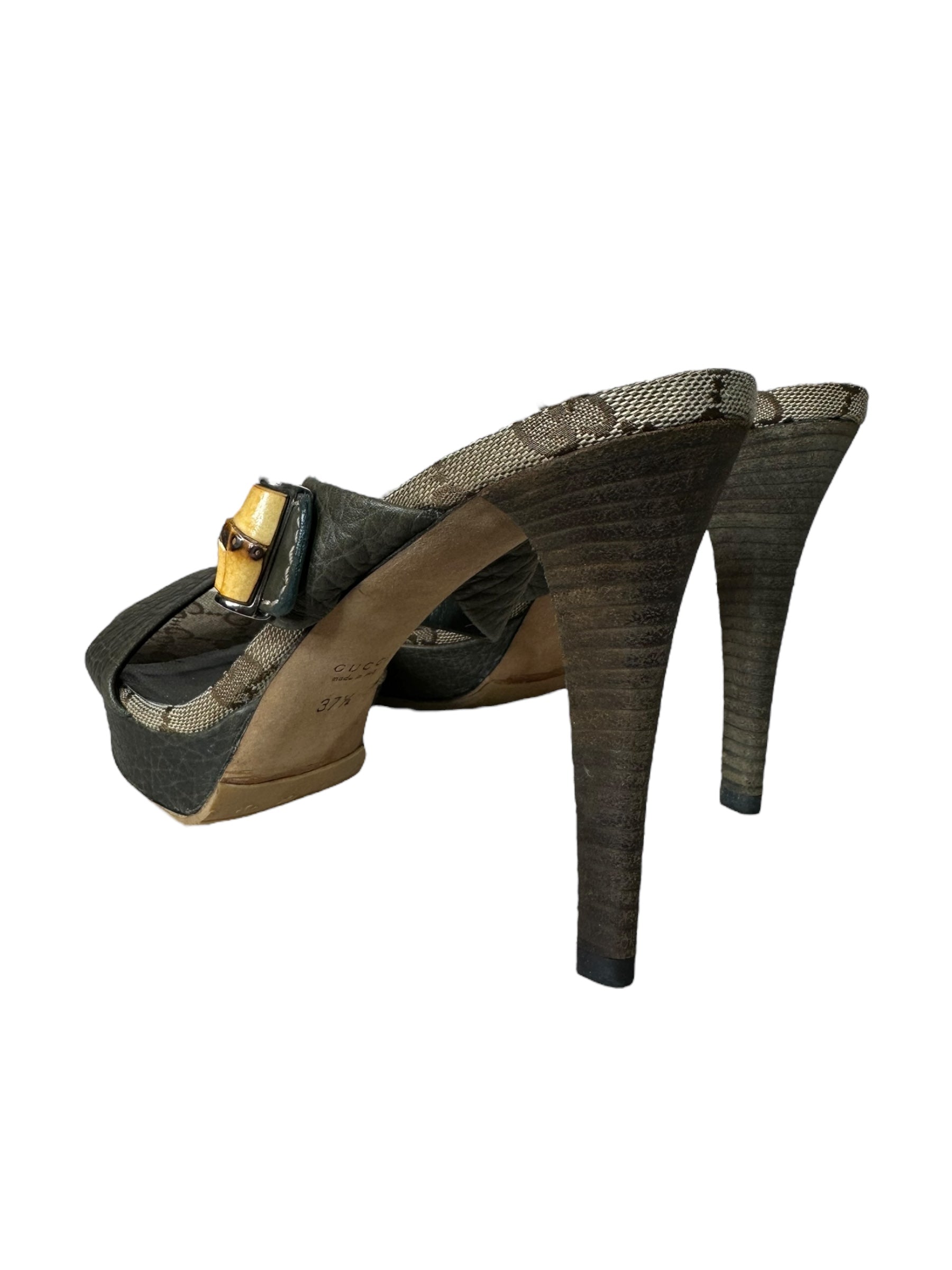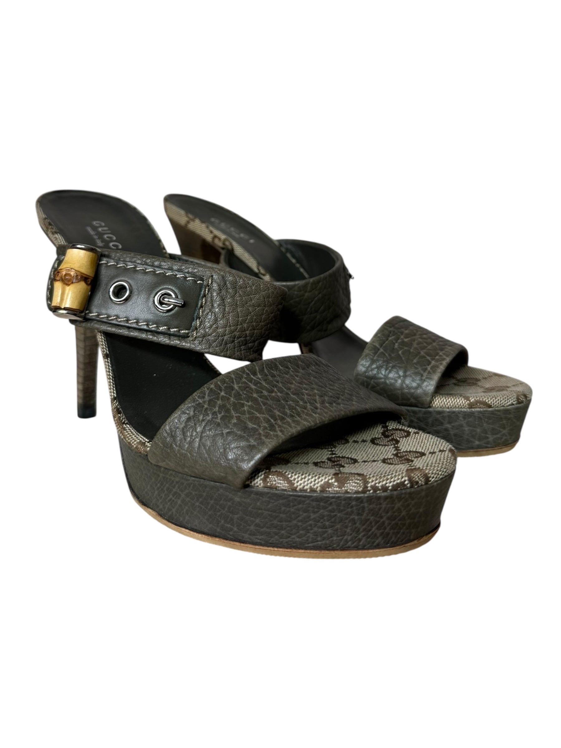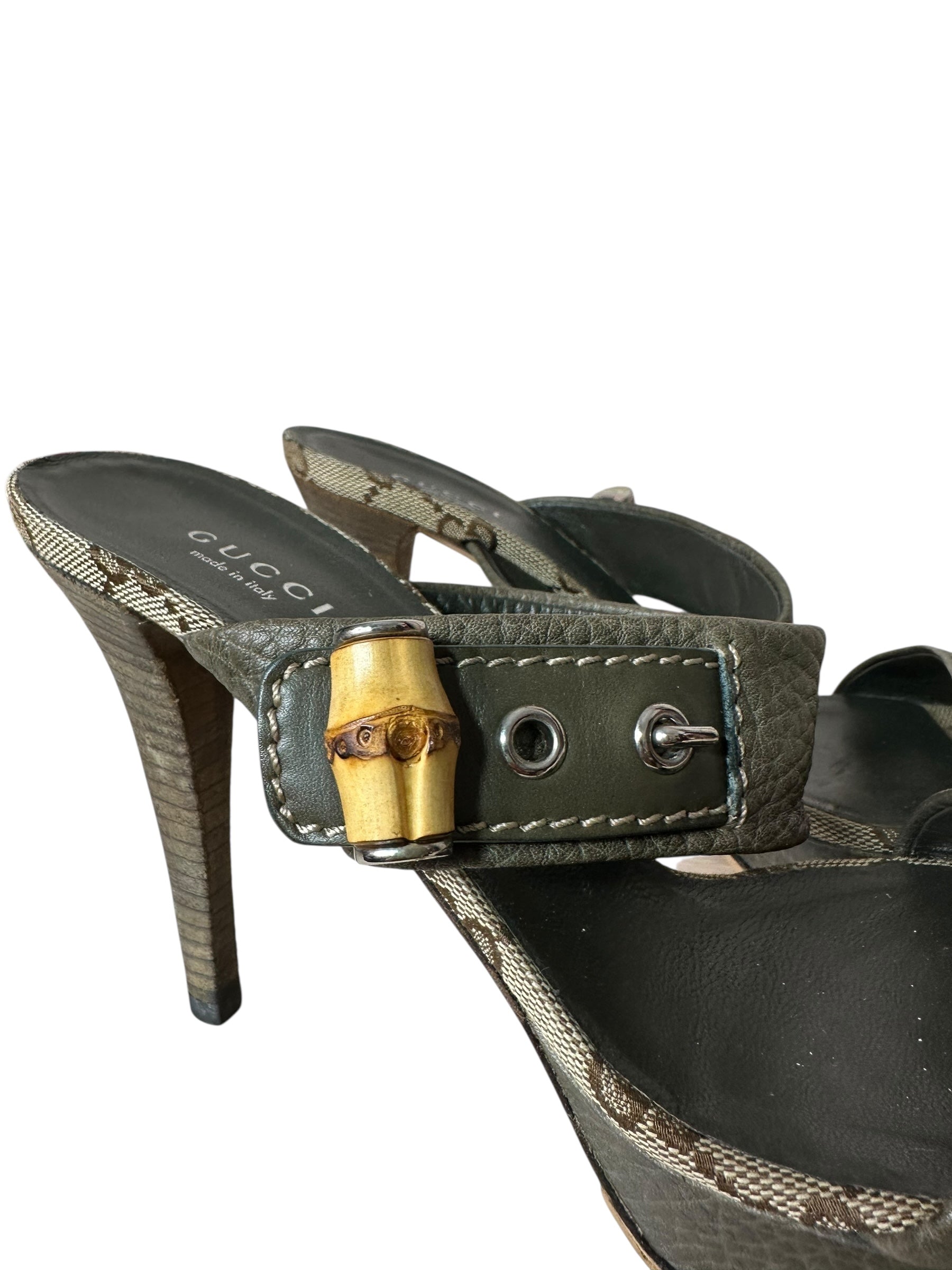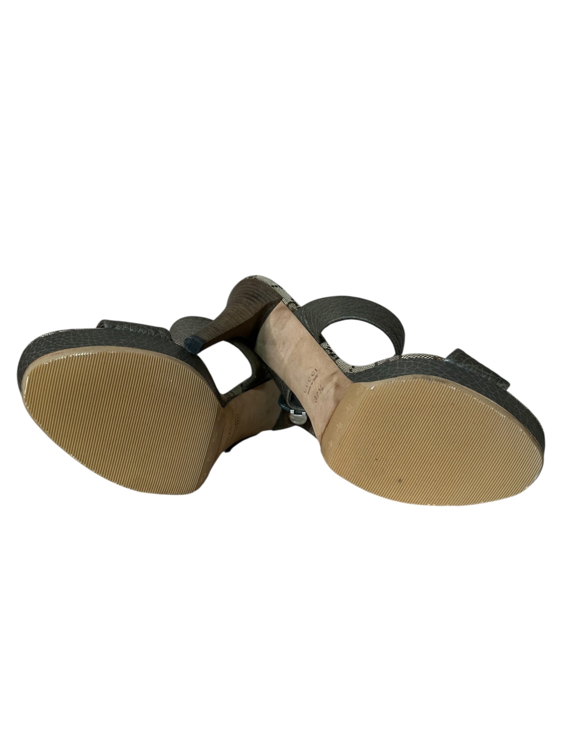 Raffinati sandali vintage Gucci, realizzati in pelle martellata verde-grigio scuro con sottopiede in tela logata GG. Caratterizzati da linee eleganti e struttura solida, presentano un tacco alto in legno naturale dalla forma geometrica, che dona slancio alla silhouette senza rinunciare alla stabilità.