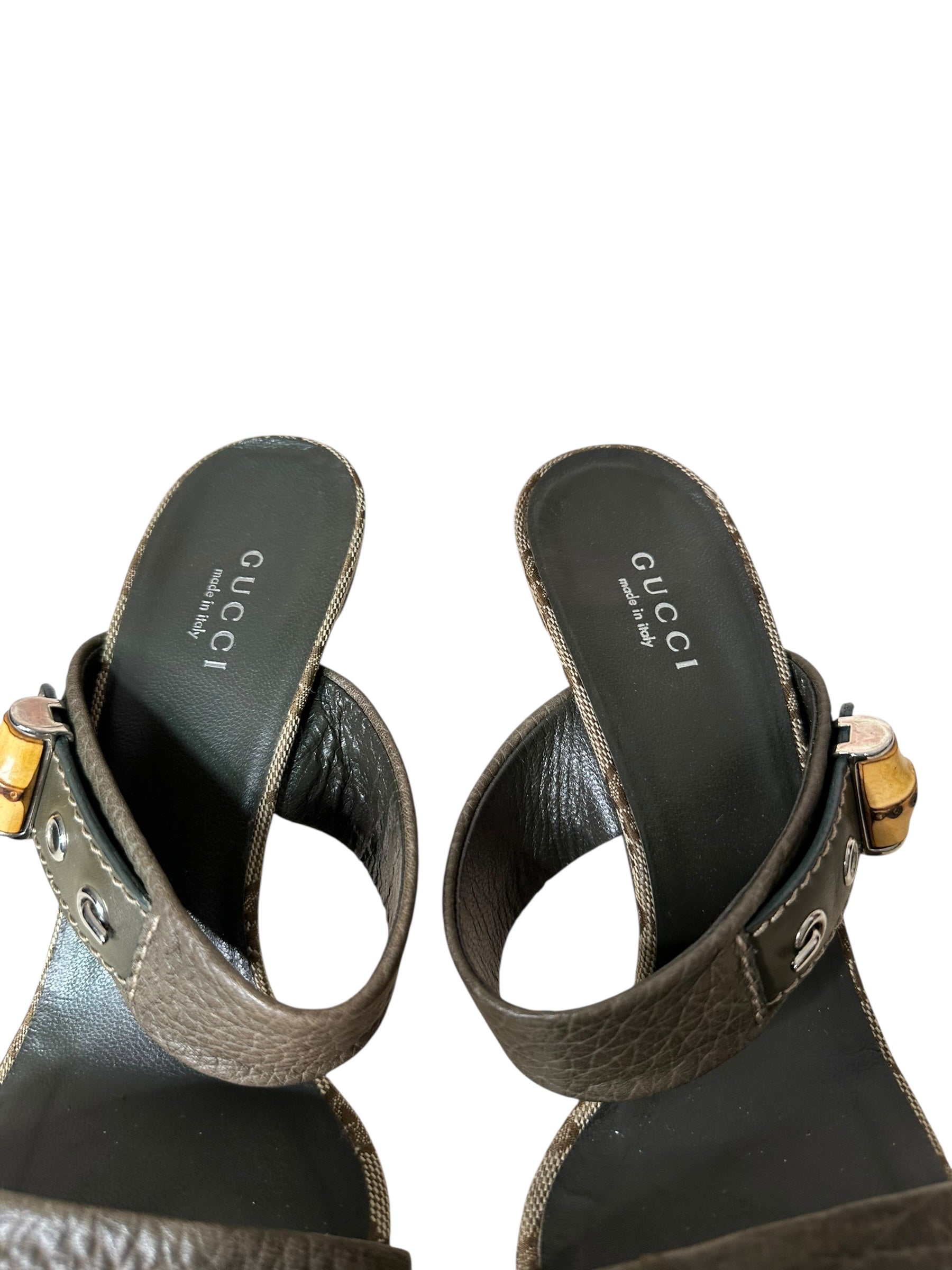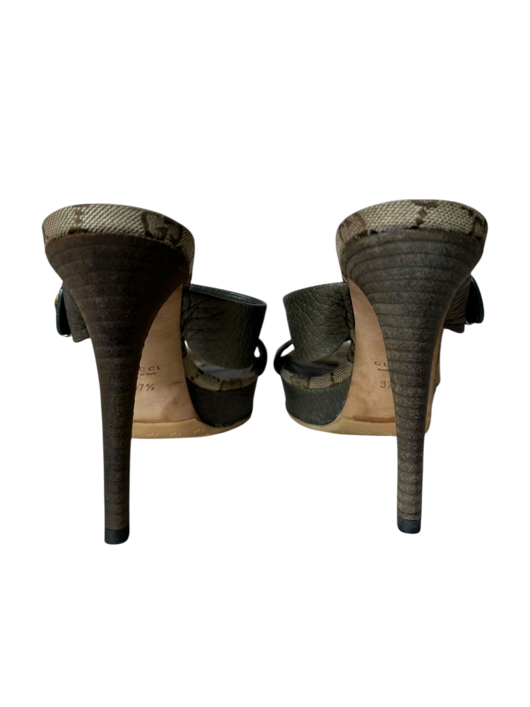 Sandali Gucci in pelle martellata con logo e tacco in legno (Vintage)