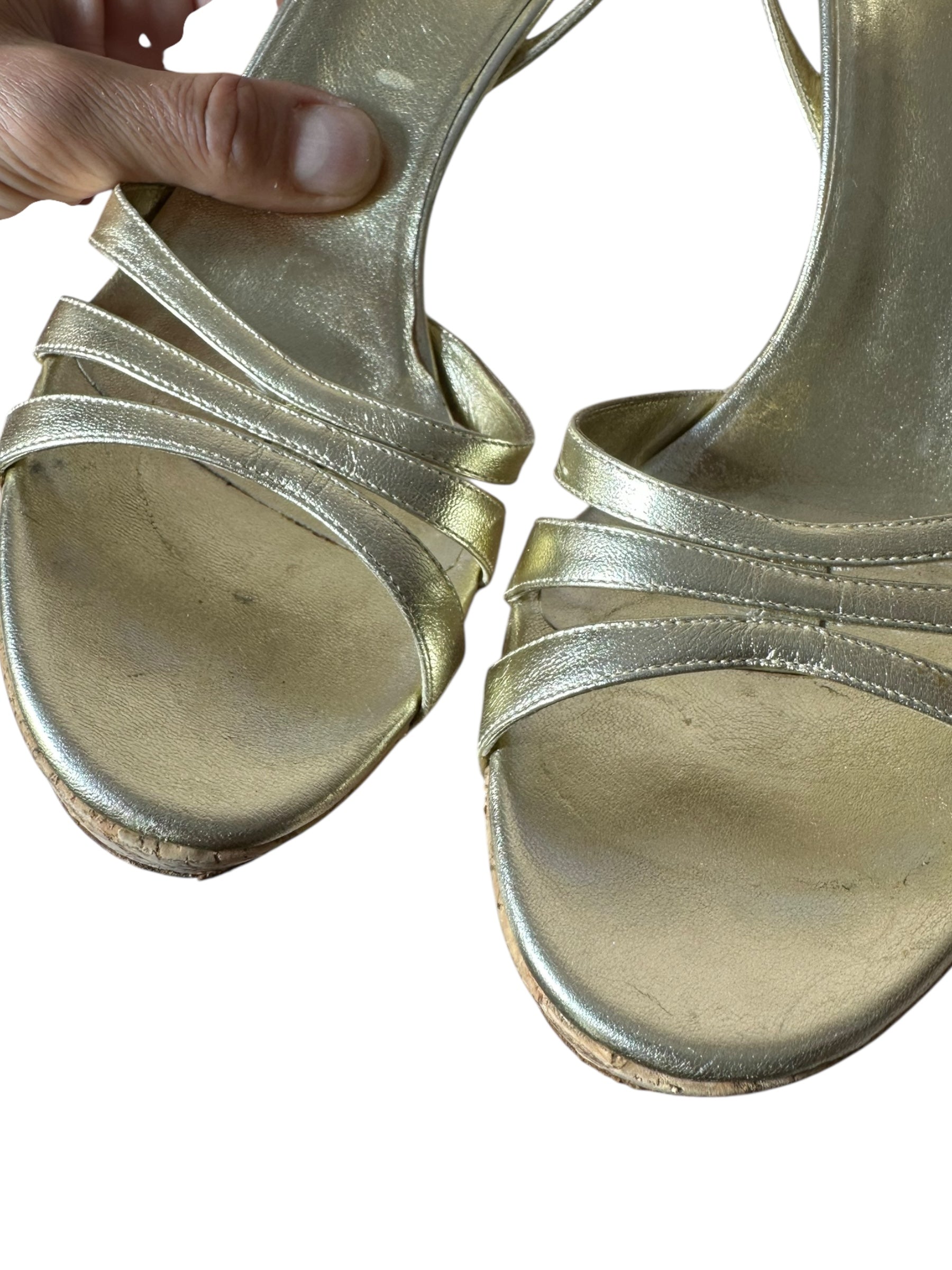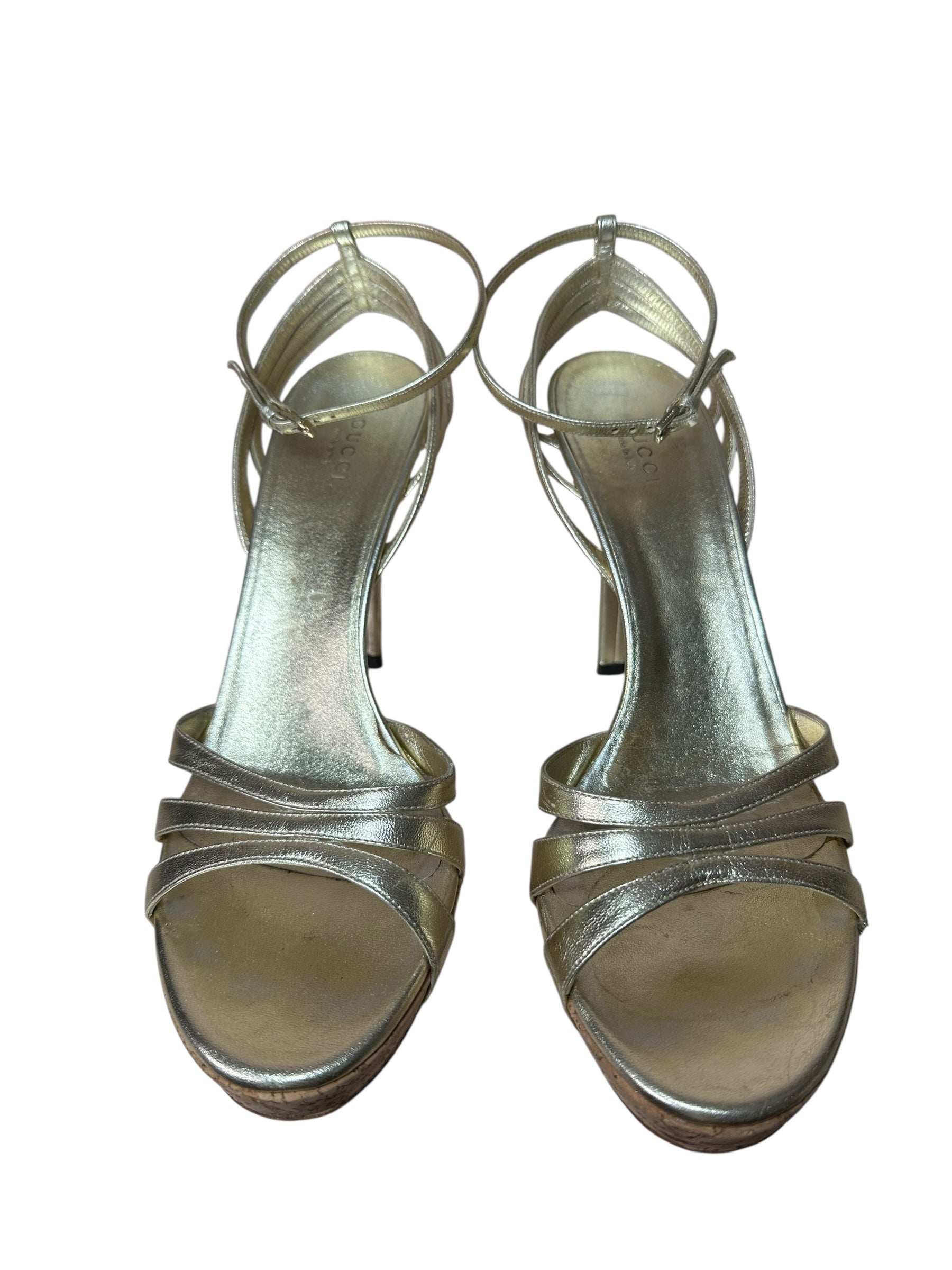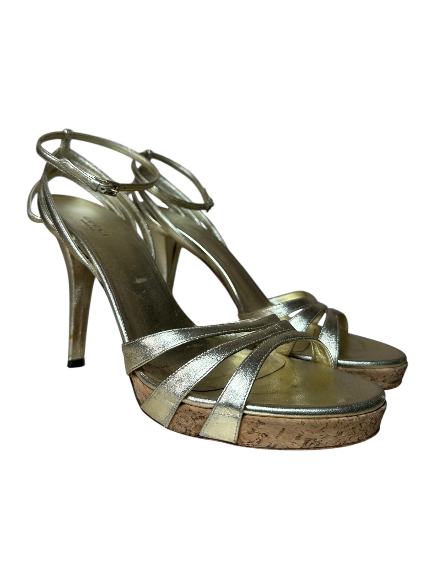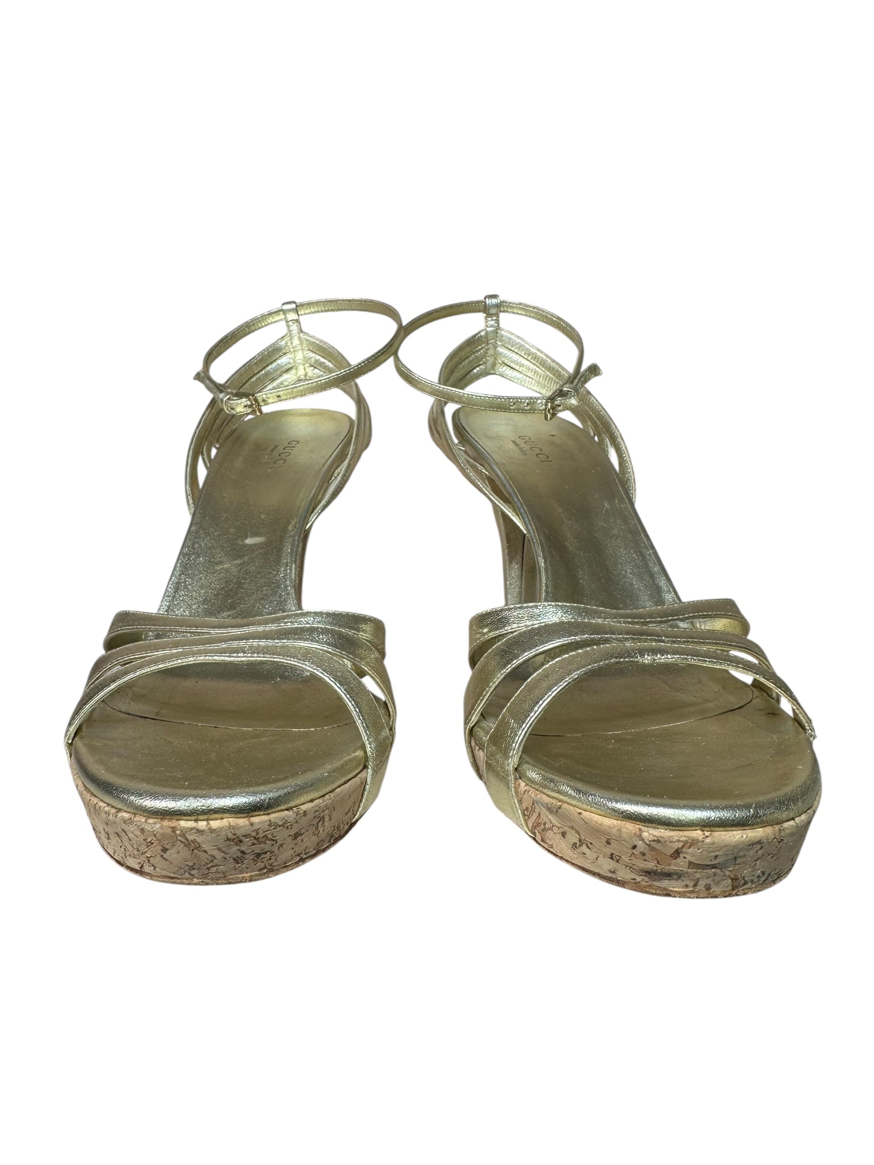Gucci – Sandali vintage in pelle dorata con tacco a spillo e plateau in sughero