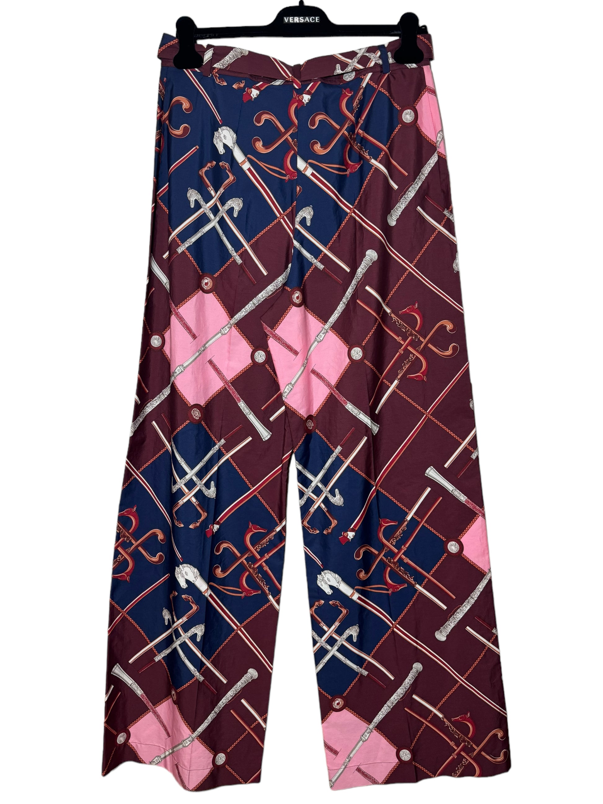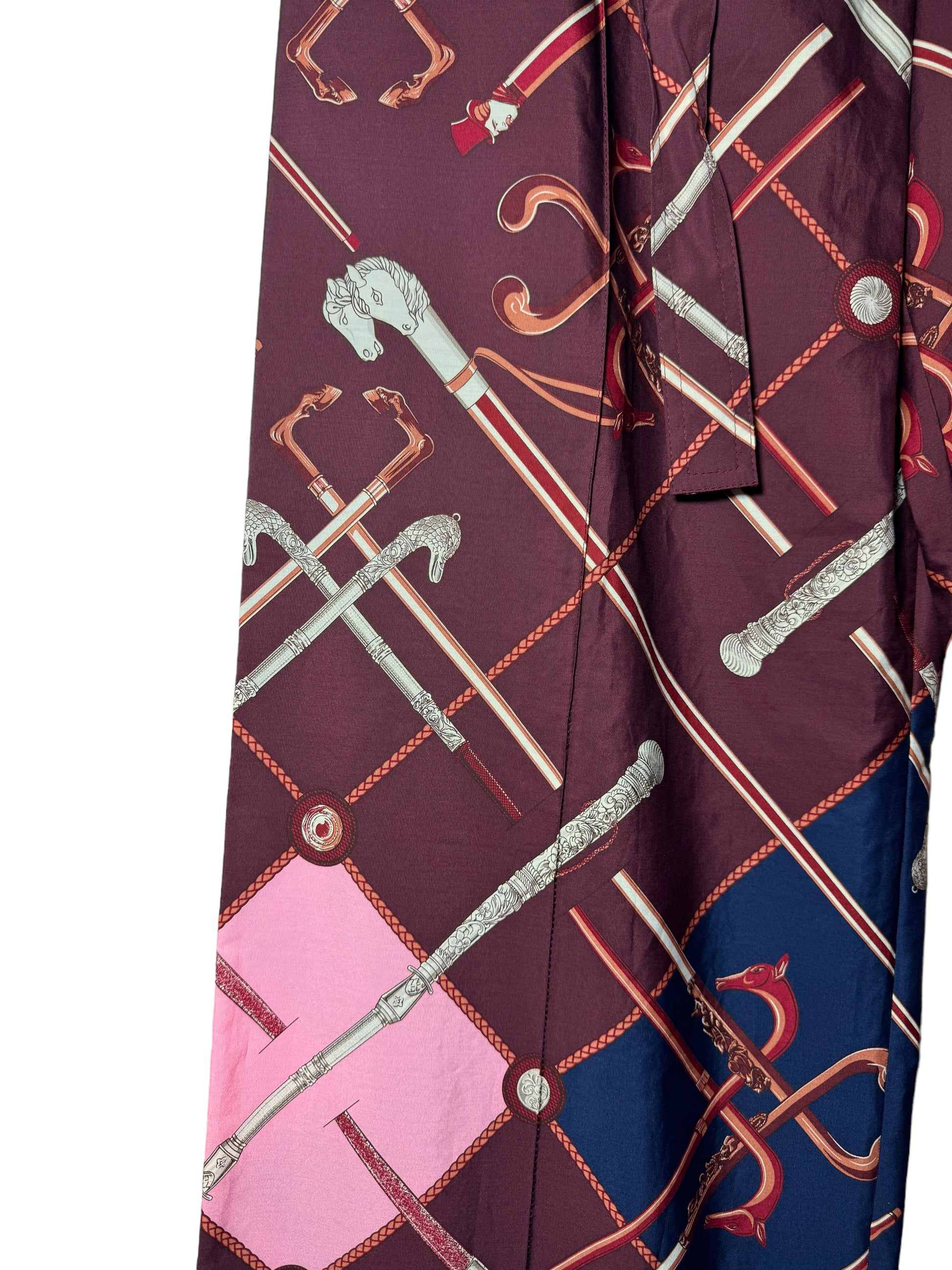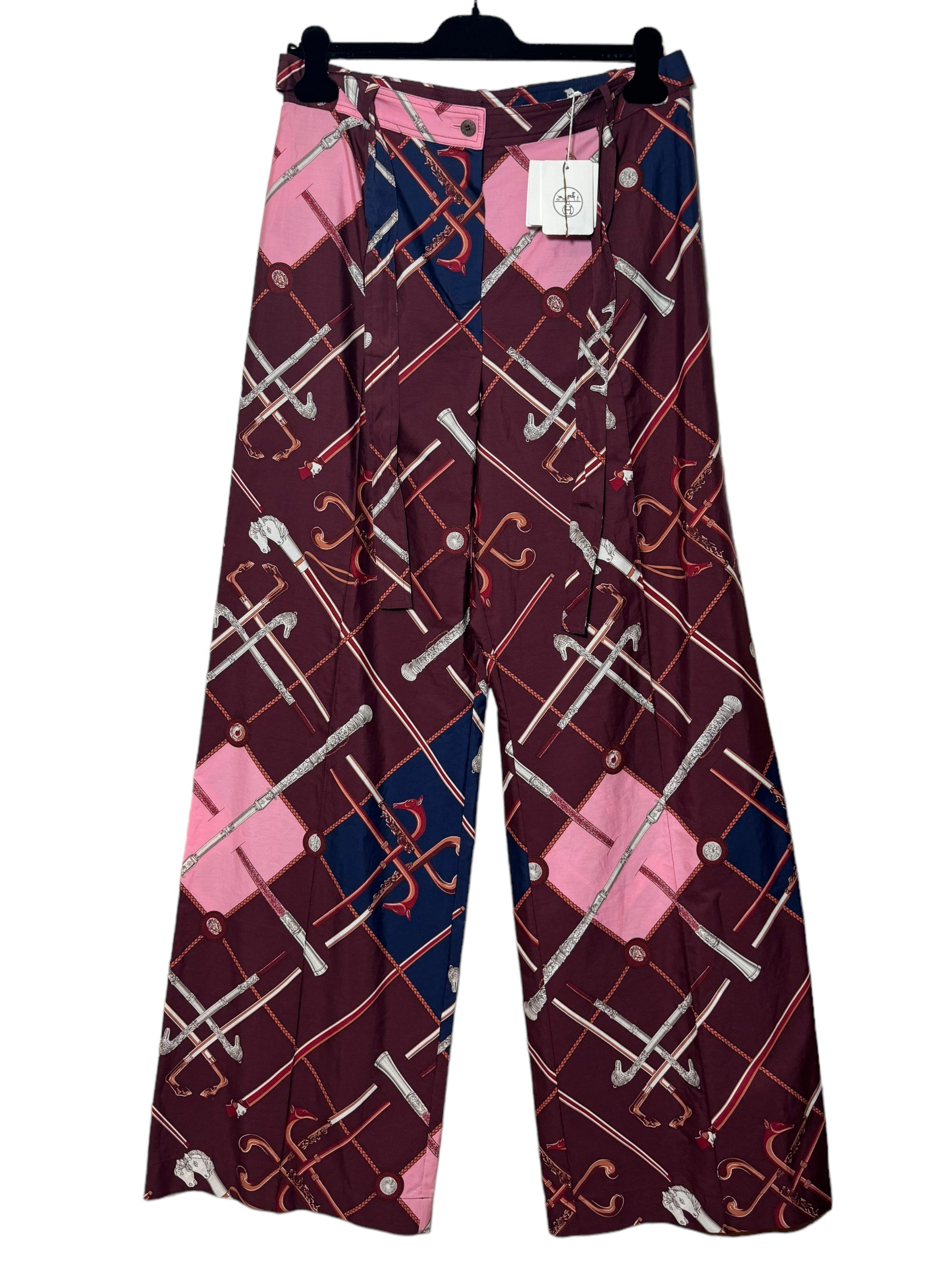 Hermès pantaloni a gamba larga in cotone con iconica stampa. Cintura in vita, bottone in madreperla. Taglia 40 francese, 44 italiana.