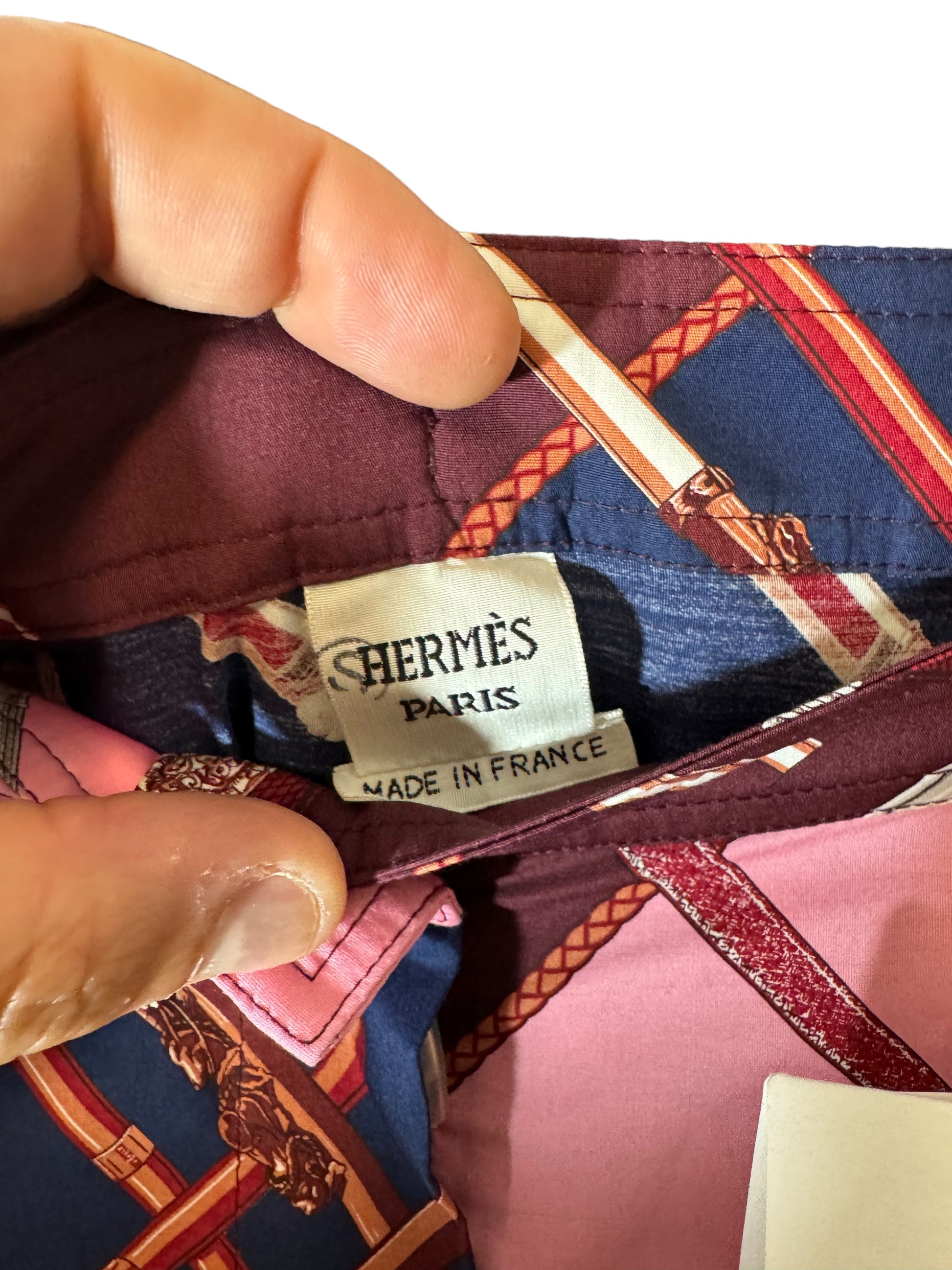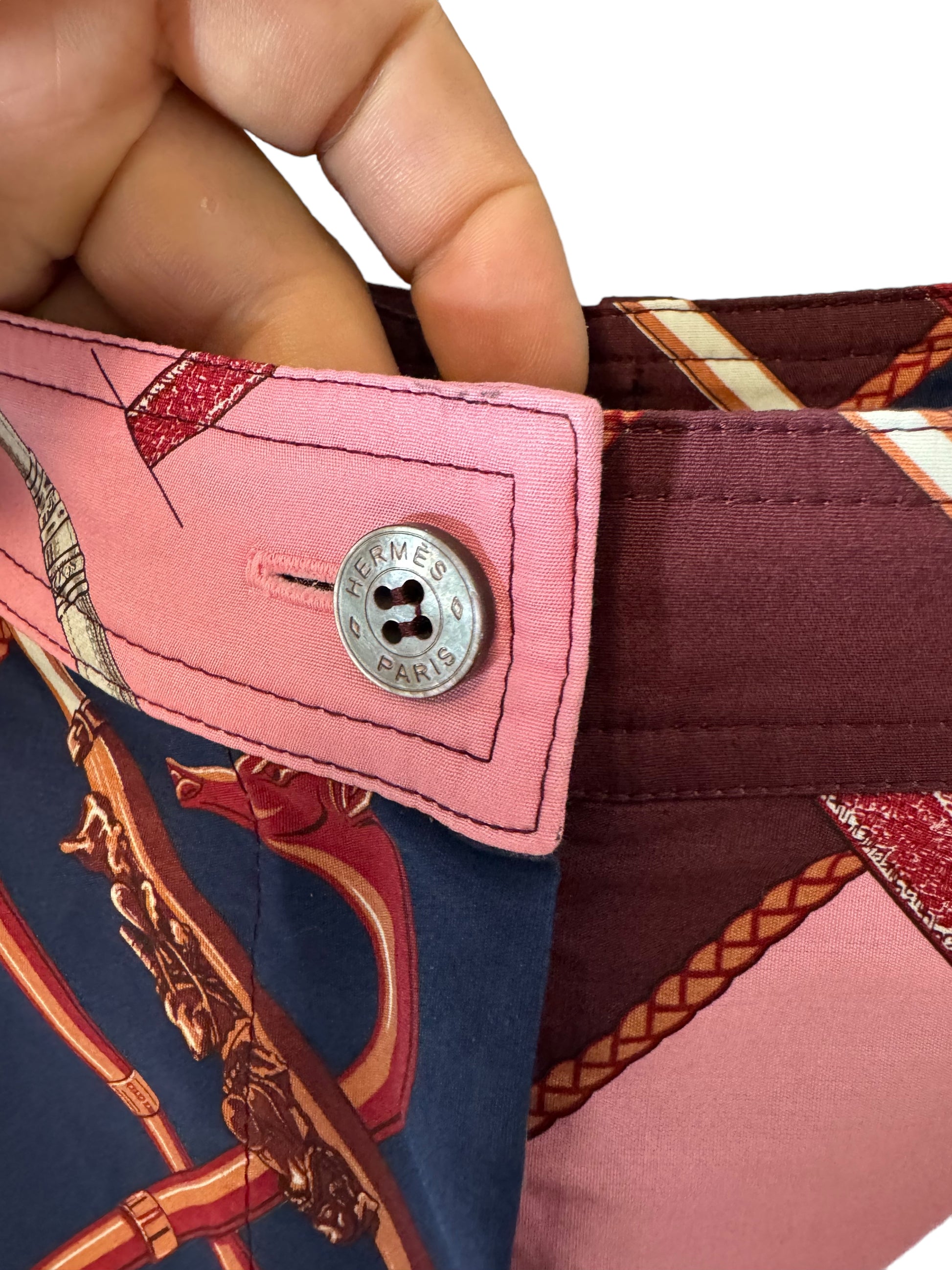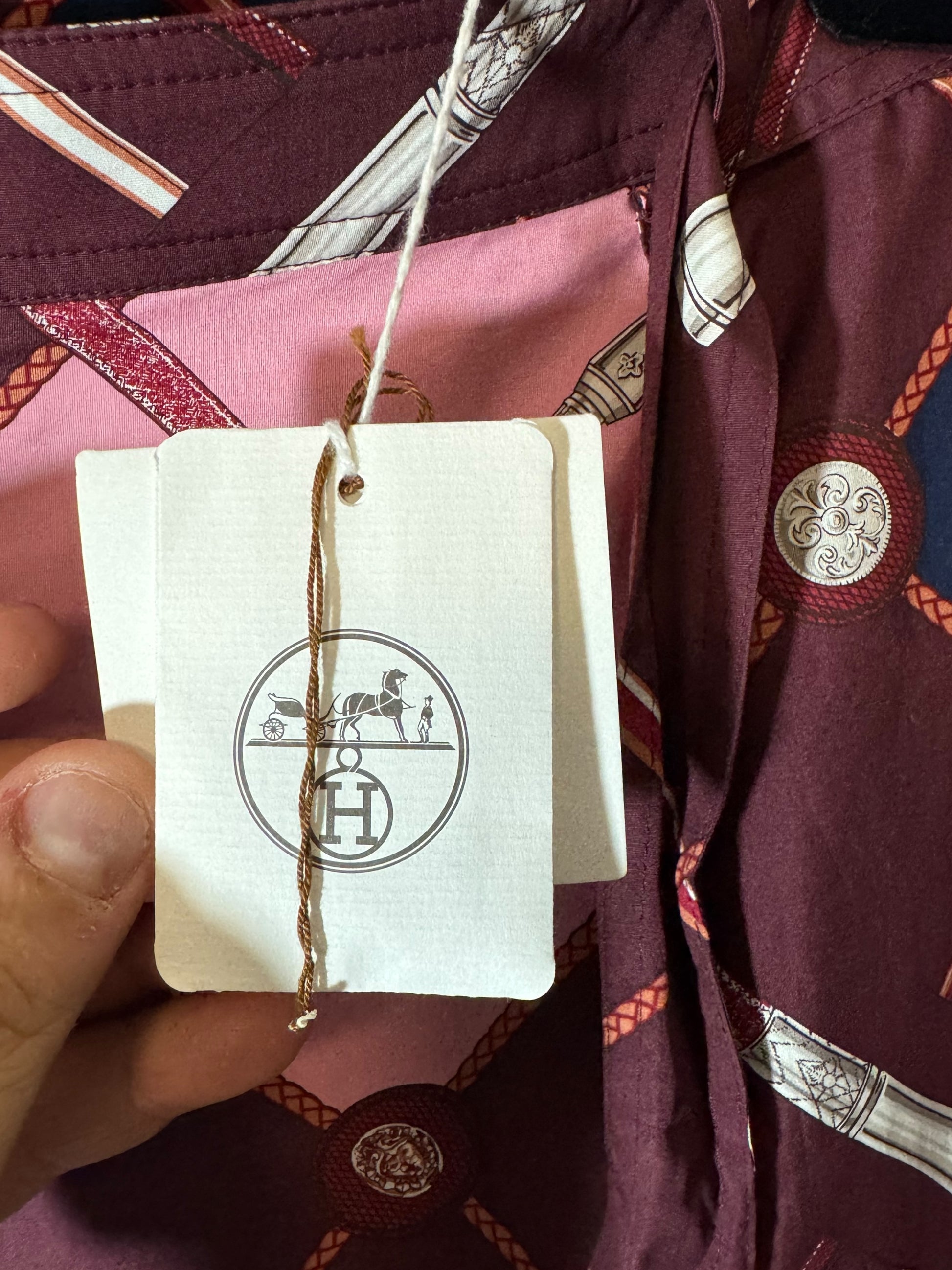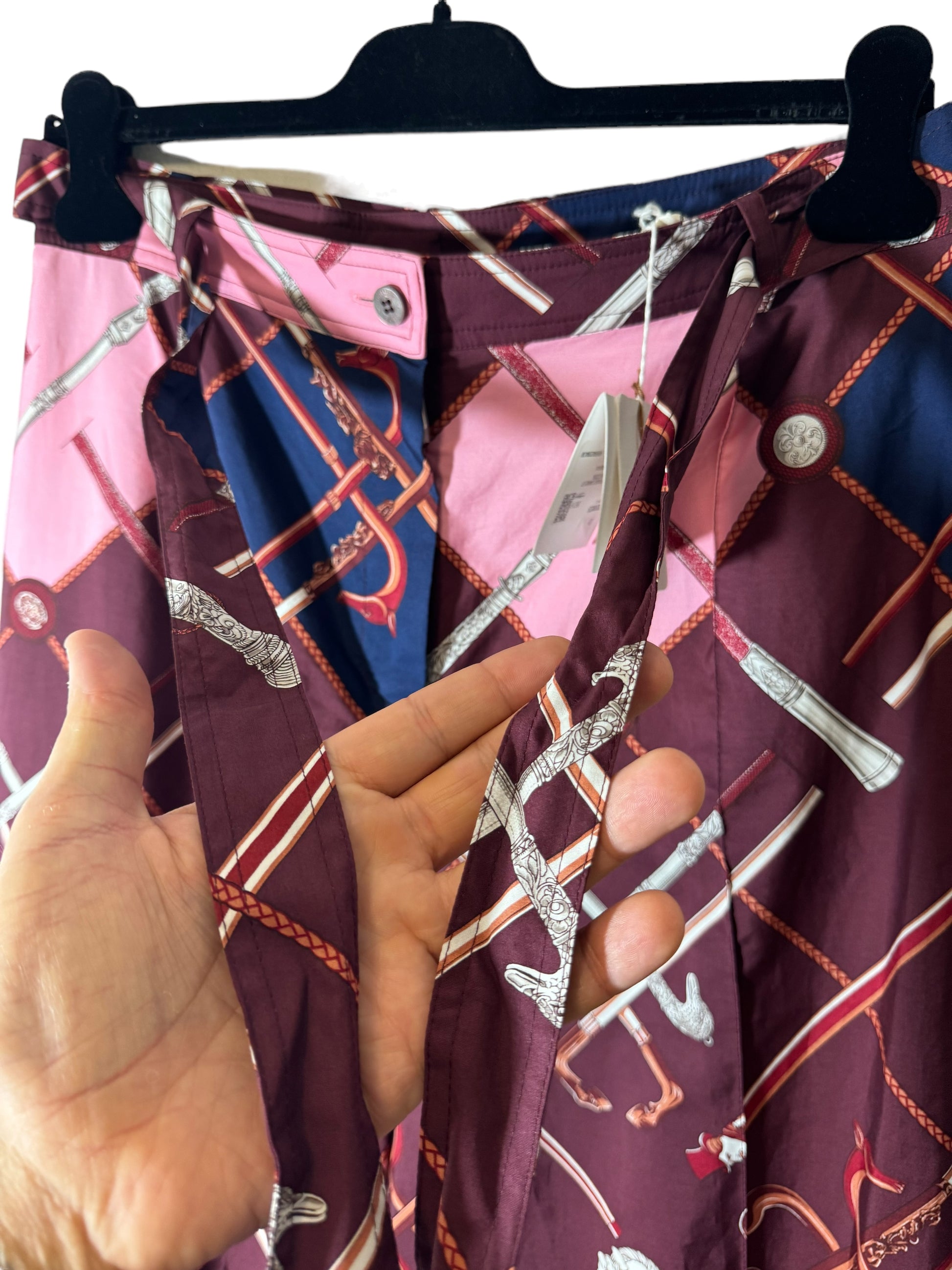 Hermès pantaloni a gamba larga in cotone con iconica stampa. Cintura in vita, bottone in madreperla. Taglia 40 francese, 44 italiana.