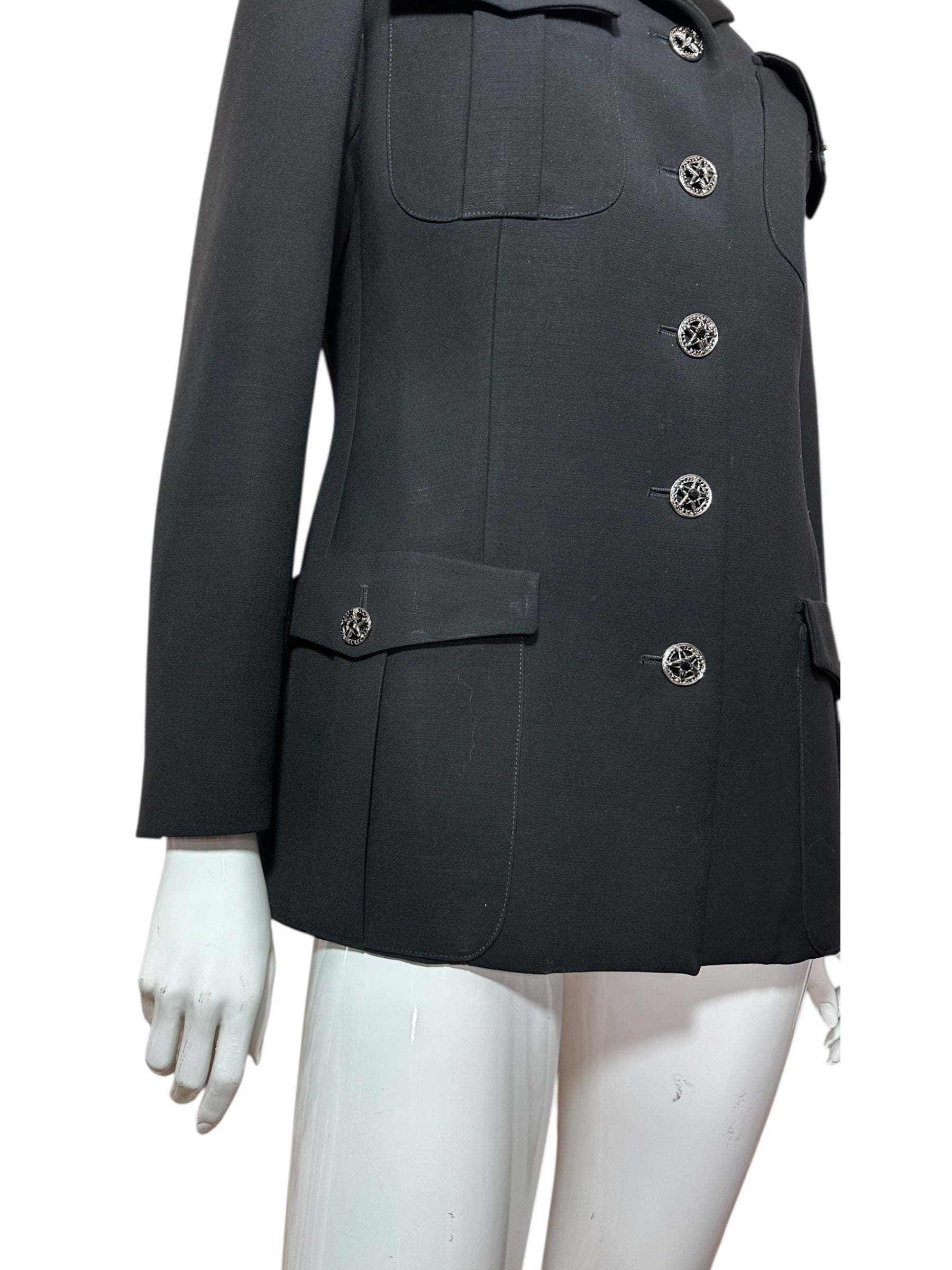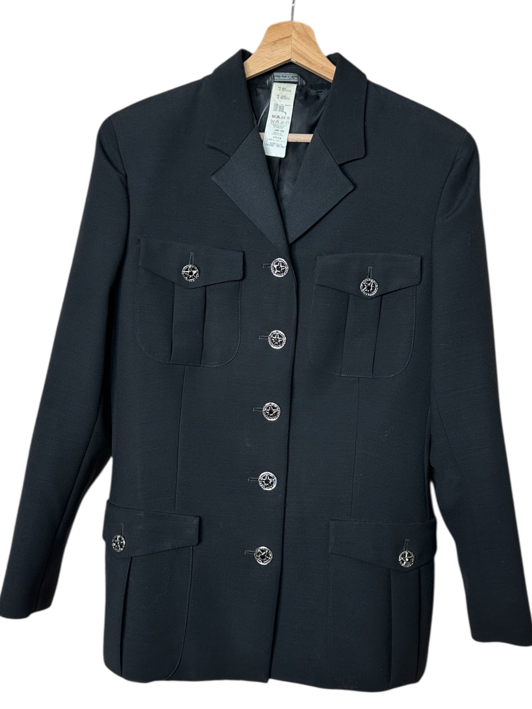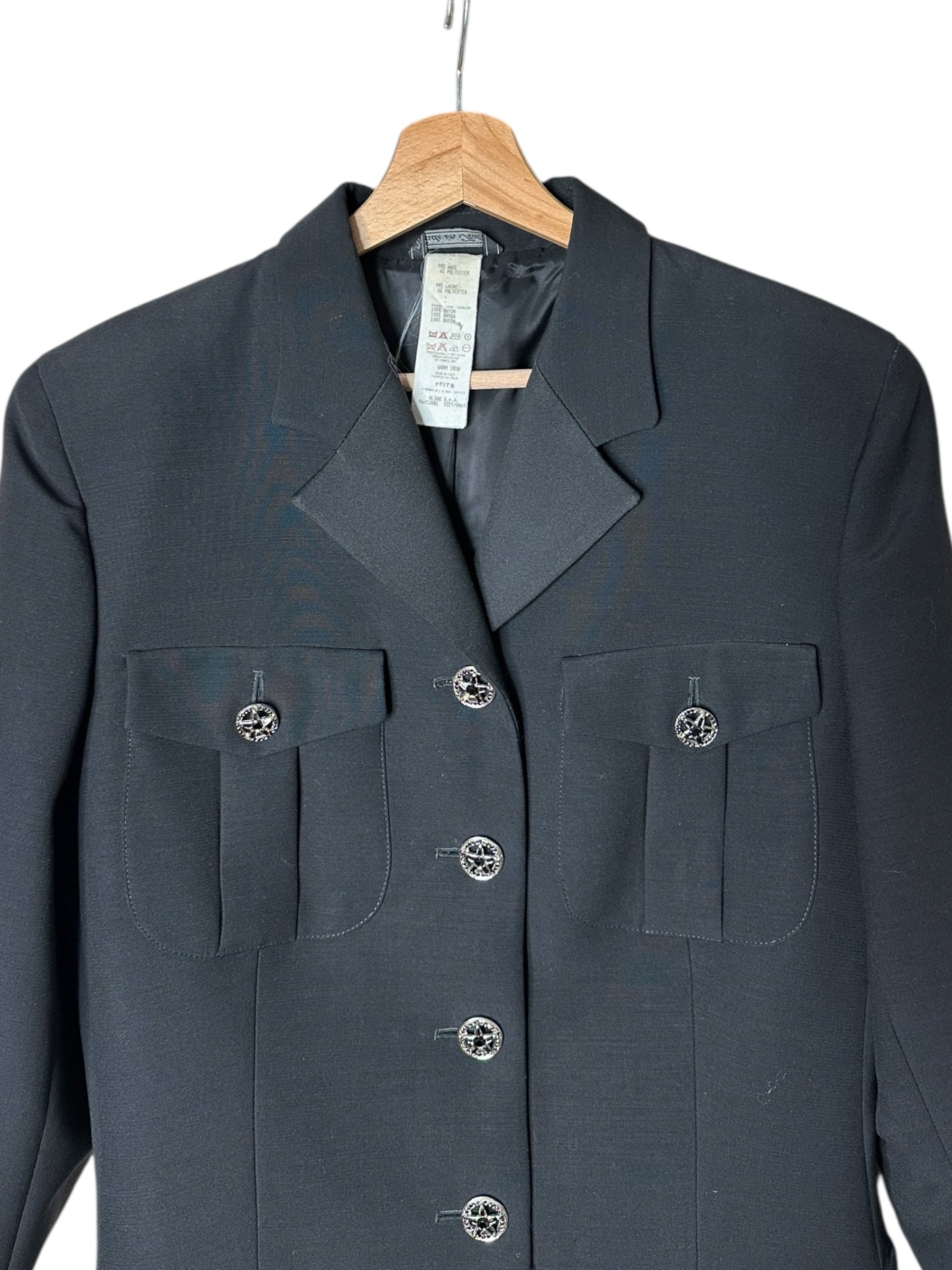 Blazer vintage firmato Istante, linea di Gianni Versace, realizzato in lana nera con struttura sartoriale ed eleganza pulita. Il modello presenta chiusura frontale con bottoni gioiello in metallo a stella, tasche applicate con patta e revers classico. Un capo iconico della produzione Versace d’epoca, dal design raffinato e senza tempo.