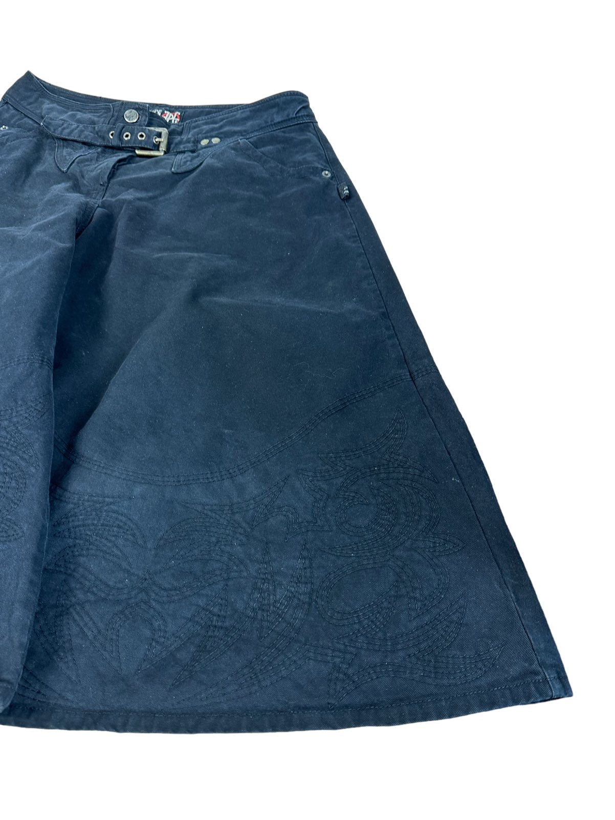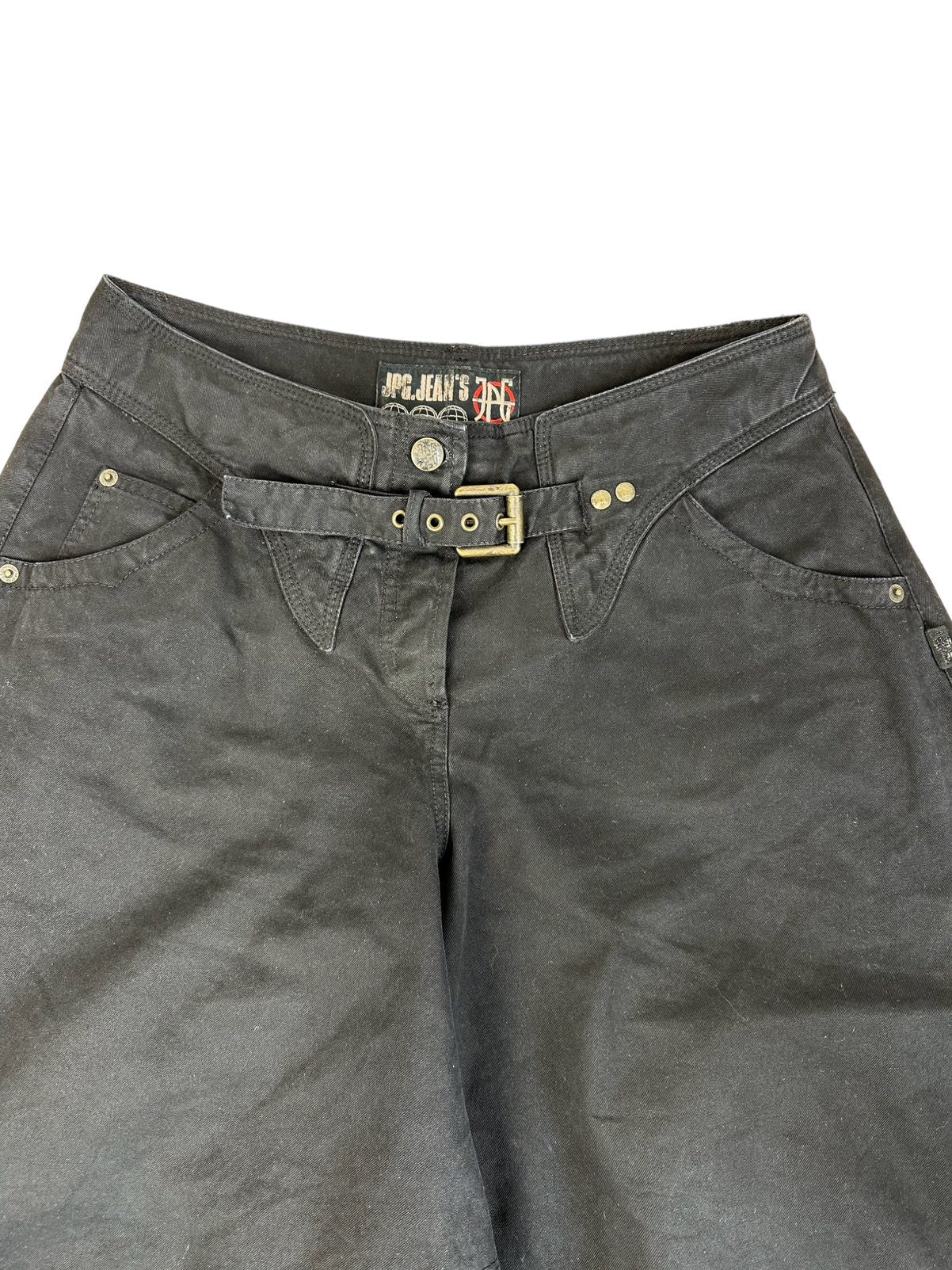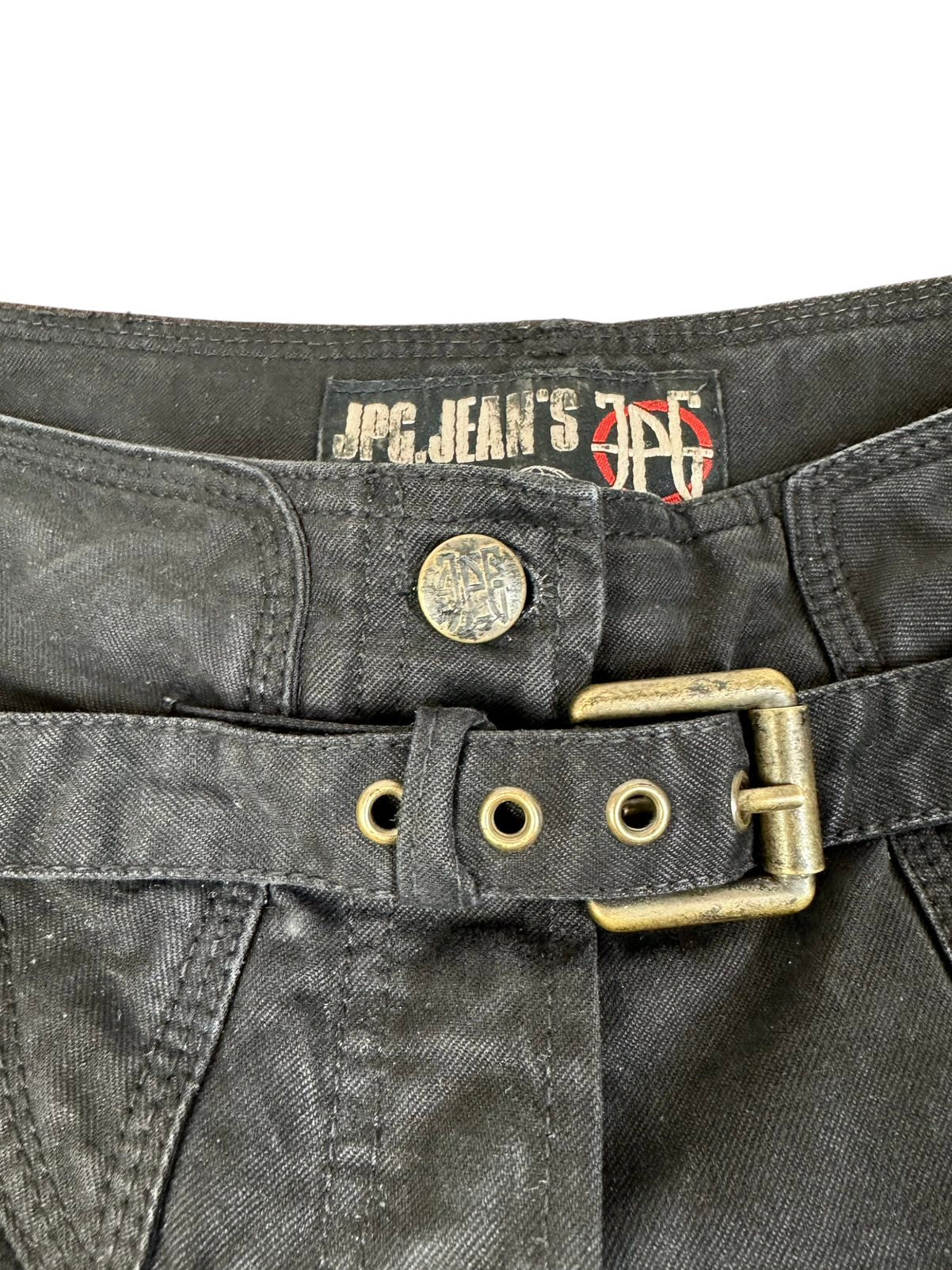 Jean Paul Gaultier jeans gonna pantalone vintage in denim nero a vita bassa con chiusura a bottoni in metallo sul davanti e fibbia applicata. Ricamo tono su tono sulla larghezza del profilo finale. Tg.44